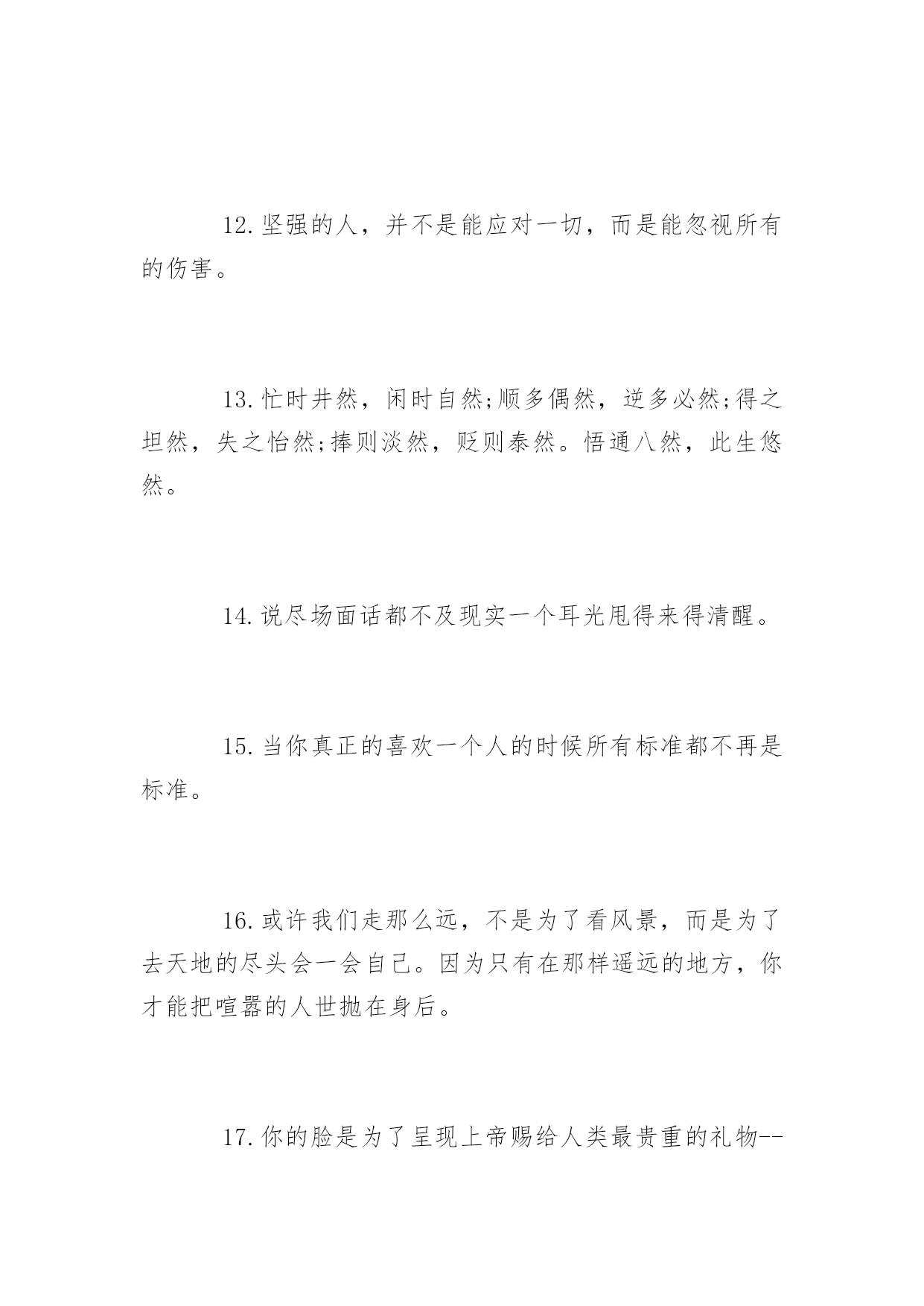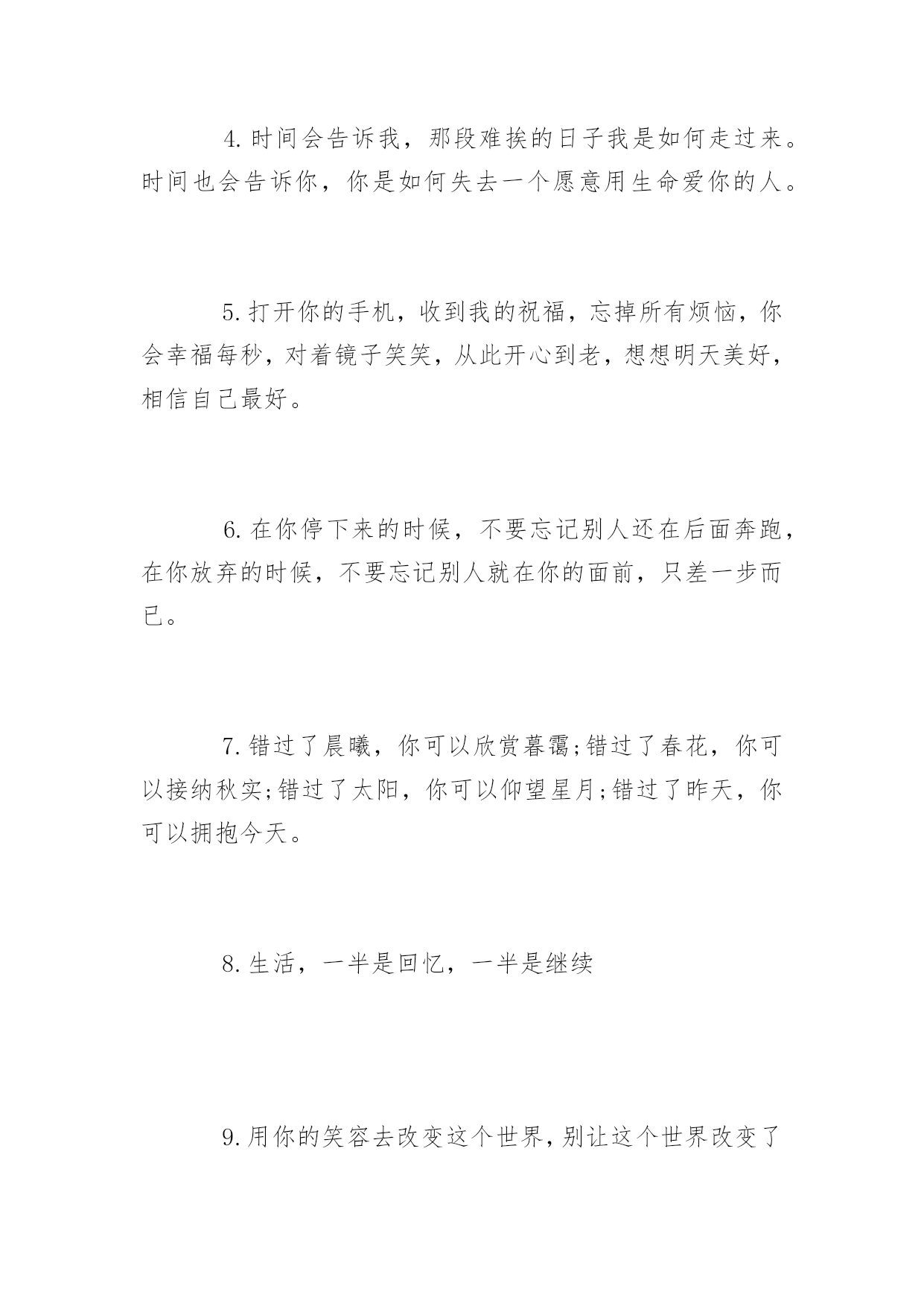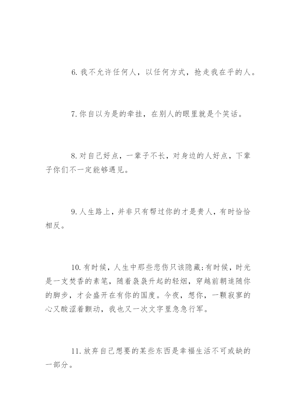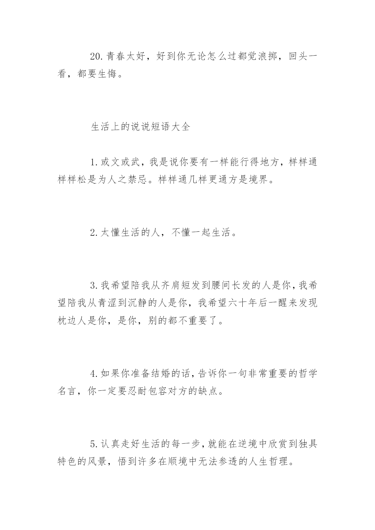 生活上的说说短语再苦再累,只要坚持往前走,属于你的风景终会出现。下面是小编整理的生活上的说说短语,希望你会喜欢。生活上的说说短语精选1.每个人一生都有很多次遇见,不是每次遇见都有故事,可每一个遇见的故事都有充斥灵魂柔软的暖,眼角的柔波,眉间的浅笑,对彼此的欣赏,都心甘情愿地为彼此停留,走过一程山水,携一份美好与感动,记录那一段故事,那一路风景。2.原谅我盛装出席却只为还当年你扇我的那一耳光。3.生活就是一种积累,你若储存的温暖越多,你的生活就会越阳光明媚,你若储存太多寒凉,你的生活就会阴云密布。4.时间会告诉我,那段难挨的日子我是如何走过来。时间也会告诉你,你是如何失去一个愿意用生命爱你的人。5.打开你的手机,收到我的祝福,忘掉所有烦恼,你会幸福每秒,对着镜子笑笑,从此开心到老,想想明天美好,相信自己最好。6.在你停下来的时候,不要忘记别人还在后面奔跑,在你放弃的时候,不要忘记别人就在你的面前,只差一步而已。7.错过了晨曦,你可以欣赏暮霭;错过了春花,你可以接纳秋实;错过了太阳,你可以仰望星月;错过了昨天,你可以拥抱今天。8.生活,一半是回忆,一半是继续9.用你的笑容去改变这个世界,别让这个世界改变了你的笑容!10.我就在繁星中的一颗上生活。我会站在其中的一颗星星上微笑。当你在夜间仰望天际时,就仿佛每一颗星星都在笑你——只有你——才能拥有会笑的星星11.亲爱的,请记住:上帝的恩赐随时都有可能变为祸根。12.经验是由痛苦中粹取出来的'。13.总有一份遇见,唯美了整个曾经;总会有一个人知你冷暖,懂你悲欢。14.贴向生活,贴向平凡,山林可以是公寓,电铃可以是诗,让我们且来从俗。15.我爱你,希望你能给陪我一直走下去。爱情不是交换。是一种快乐,只有爱得开心,才能继续爱下去。其他种种,都是浮云。那个或者那些爱过而离开的人,其实都会在我们心灵深处留下肚脐眼一般的记忆,那是抹不掉的。16.有多少人故意赌气关掉手机,忍不住打开后,发现什么也没有。自作多情以为自己在他心里有多重要,到最后才发现自己原来是个笑话。别在傻了,人家不在乎你。17.这个世界残忍冰冷,哪有这么多可以美梦成真的如果。18.死亡是真相,突破虚假繁荣。它终究会让你明白,别人怎么看你,或者你自己如何探测生活,都不重要。重要的是你必须要用一种真实的方式,度过在手指缝之间如雨水一样无法停止下落的时间。你要知道自己将会如何生活。19.重要的不是治愈,而是带着病痛活下去。20.青春太好,好到你无论怎么过都觉浪掷,回头一看,都要生悔。生活上的说说短语大全1.或文或武,我是说你要有一样能行得地方,样样通样样松是为人之禁忌。样样通几样更通方是境界。2.太懂生活的人,不懂一起生活。3.我希望陪我从齐肩短发到腰间长发的人是你,我希望陪我从青涩到沉静的人是你,我希望六十年后一醒来发现枕边人是你,是你,别的都不重要了。4.如果你准备结婚的话,告诉你一句非常重要的哲学名言,你一定要忍耐包容对方的缺点。5.认真走好生活的每一步,就能在逆境中欣赏到独具特色的风景,悟到许多在顺境中无法参透的人生哲理。6.我不允许任何人,以任何方式,抢走我在乎的人。7.你自以为是的牵挂,在别人的眼里就是个笑话。8.对自己好点,一辈子不长,对身边的人好点,下辈子你们不一定能够遇见。9.人生路上,并非只有帮过你的才是贵人,有时恰恰相反。10.有时候,人生中那些悲伤只该隐藏;有时候,时光是一支焚香的素笔,随着袅袅升起的轻烟,穿越前朝追随你的脚步,才会盛开在有你的国度。今夜,想你,一颗寂寥的心又酸涩着颤动,我也又一次文字里急急行军。11.放弃自己想要的某些东西是幸福生活不可或缺的一部分。12.坚强的人,并不是能应对一切,而是能忽视所有的伤害。13.忙时井然,闲时自然;顺多偶然,逆多必然;得之坦然,失之怡然;捧则淡然,贬则泰然。悟通八然,此生悠然。14.说尽场面话都不及现实一个耳光甩得来得清醒。15.当你真正的喜欢一个人的时候所有标准都不再是标准。16.或许我们走那么远,不是为了看风景,而是为了去天地的尽头会一会自己。因为只有在那样遥远的地方,你才能把喧嚣的人世抛在身后。17.你的脸是为了呈现上帝赐给人类最贵重的礼物--微笑,一定要成为你工作最大的资产。18.被深爱之人,刺痛的伤,是难以痊愈的。这种伤是喵喵所不会了解的,至少是现在无法体会的,她说:没有人会完全懂得自己未曾经历过的事情,为自己的爱情付出自己所能做的所有,那样争取了至少不会后悔,相信缘分但不会相信命运,幸福靠努力和偶尔的等待。缘分是注定的意外,梦一般的邂逅,本不可能发生的事情,命运就太泛了,大多和外在因素有关,是可以通过努力改变的。缘分只能靠