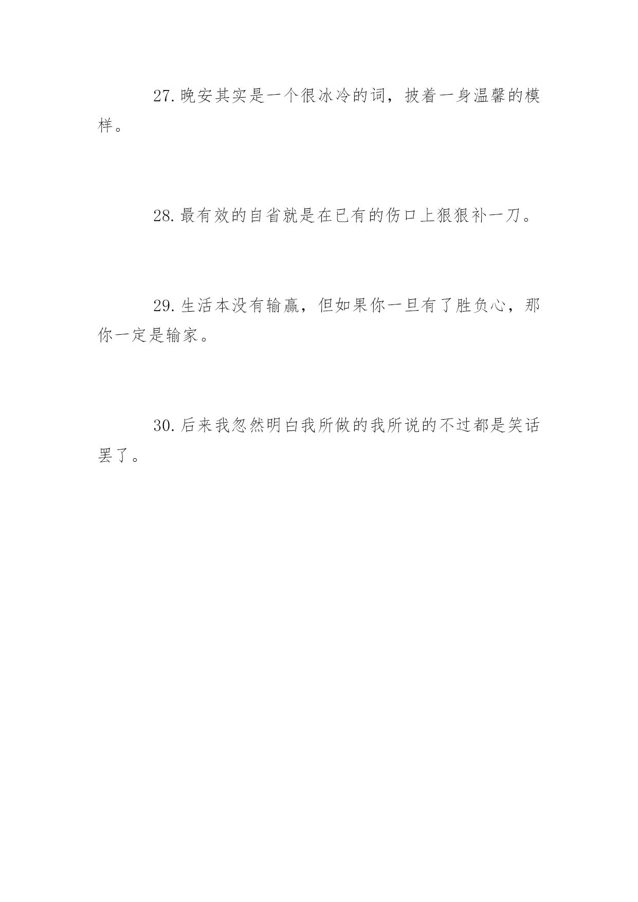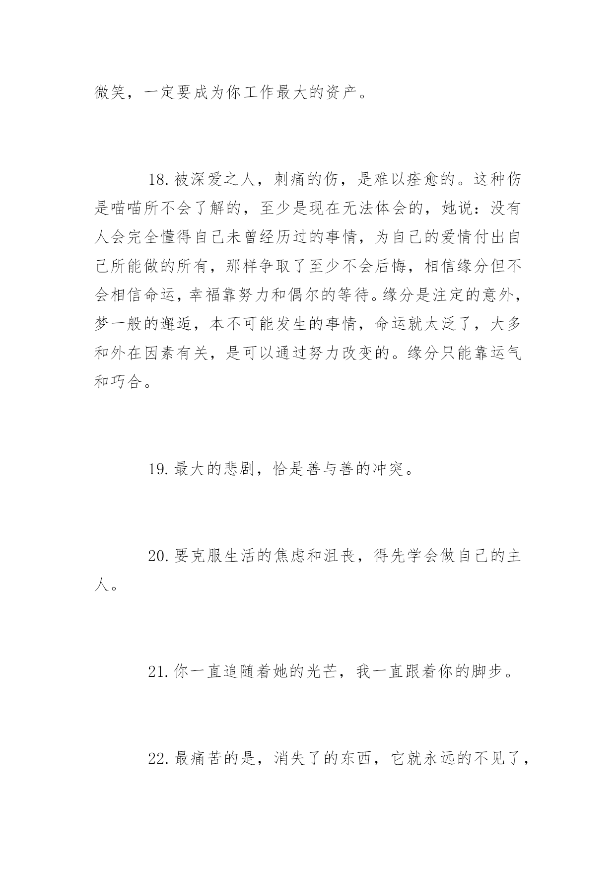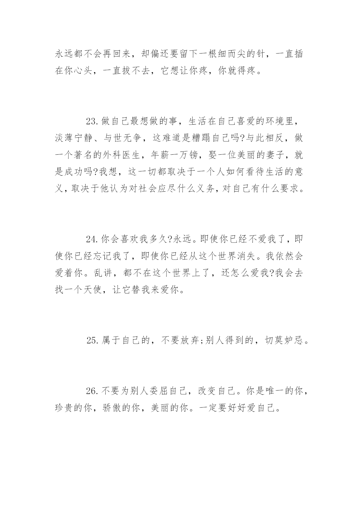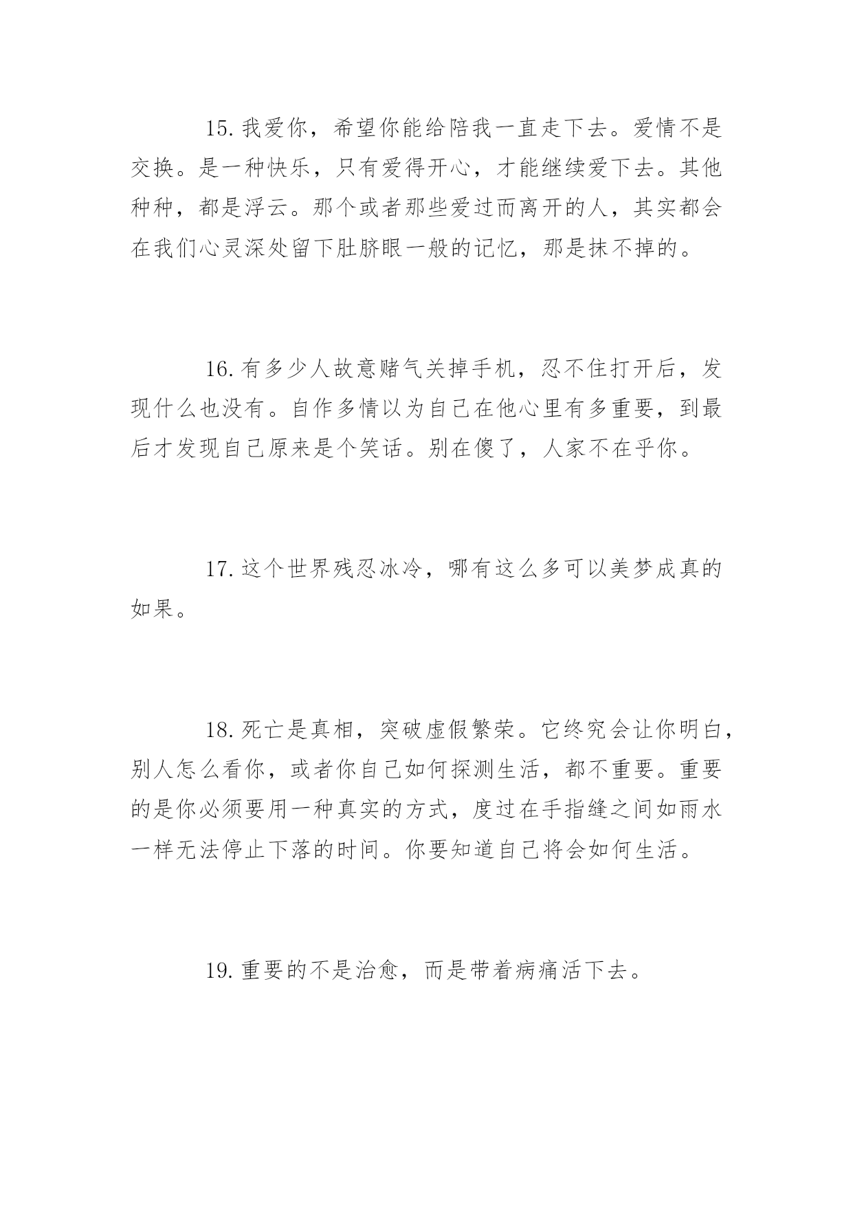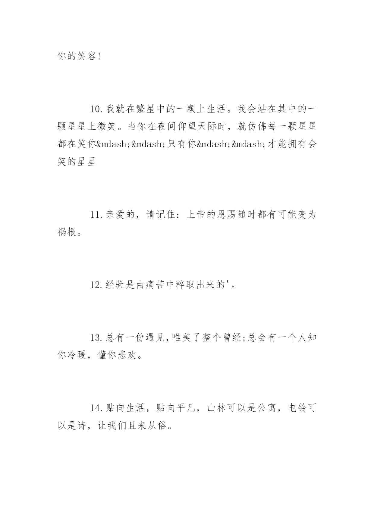 生活上的说说短语再苦再累,只要坚持往前走,属于你的风景终会出现。下面是小编整理的生活上的说说短语,希望你会喜欢。生活上的说说短语精选1.每个人一生都有很多次遇见,不是每次遇见都有故事,可每一个遇见的故事都有充斥灵魂柔软的暖,眼角的柔波,眉间的浅笑,对彼此的欣赏,都心甘情愿地为彼此停留,走过一程山水,携一份美好与感动,记录那一段故事,那一路风景。2.原谅我盛装出席却只为还当年你扇我的那一耳光。3.生活就是一种积累,你若储存的温暖越多,你的生活就会越阳光明媚,你若储存太多寒凉,你的生活就会阴云密布。4.时间会告诉我,那段难挨的日子我是如何走过来。时间也会告诉你,你是如何失去一个愿意用生命爱你的人。5.打开你的手机,收到我的祝福,忘掉所有烦恼,你会幸福每秒,对着镜子笑笑,从此开心到老,想想明天美好,相信自己最好。6.在你停下来的时候,不要忘记别人还在后面奔跑,在你放弃的时候,不要忘记别人就在你的面前,只差一步而已。7.错过了晨曦,你可以欣赏暮霭;错过了春花,你可以接纳秋实;错过了太阳,你可以仰望星月;错过了昨天,你可以拥抱今天。8.生活,一半是回忆,一半是继续9.用你的笑容去改变这个世界,别让这个世界改变了你的笑容!10.我就在繁星中的一颗上生活。我会站在其中的一颗星星上微笑。当你在夜间仰望天际时,就仿佛每一颗星星都在笑你——只有你——才能拥有会笑的星星11.亲爱的,请记住:上帝的恩赐随时都有可能变为祸根。12.经验是由痛苦中粹取出来的'。13.总有一份遇见,唯美了整个曾经;总会有一个人知你冷暖,懂你悲欢。14.贴向生活,贴向平凡,山林可以是公寓,电铃可以是诗,让我们且来从俗。15.我爱你,希望你能给陪我一直走下去。爱情不是交换。是一种快乐,只有爱得开心,才能继续爱下去。其他种种,都是浮云。那个或者那些爱过而离开的人,其实都会在我们心灵深处留下肚脐眼一般的记忆,那是抹不掉的。16.有多少人故意赌气关掉手机,忍不住打开后,发现什么也没有。自作多情以为自己在他心里有多重要,到最后才发现自己原来是个笑话。别在傻了,人家不在乎你。17.这个世界残忍冰冷,哪有这么多可以美梦成真的如果。18.死亡是真相,突破虚假繁荣。它终究会让你明白,别人怎么看你,或者你自己如何探测生活,都不重要。重要的是你必须要用一种真实的方式,度过在手指缝之间如雨水一样无法停止下落的时间。你要知道自己将会如何生活。19.重要的不是治愈,而是带着病痛活下去。20.青春太好,好到你无论怎么过都觉浪掷,回头一看,都要生悔。生活上的说说短语大全1.或文或武,我是说你要有一样能行得地方,样样通样样松是为人之禁忌。样样通几样更通方是境界。2.太懂生活的人,不懂一起生活。3.我希望陪我从齐肩短发到腰间长发的人是你,我希望陪我从青涩到沉静的人是你,我希望六十年后一醒来发现枕边人是你,是你,别的都不重要了。4.如果你准备结婚的话,告诉你一句非常重要的哲学名言,你一定要忍耐包容对方的缺点。5.认真走好生活的每一步,就能在逆境中欣赏到独具特色的风景,悟到许多在顺境中无法参透的人生哲理。6.我不允许任何人,以任何方式,抢走我在乎的人。7.你自以为是的牵挂,在别人的眼里就是个笑话。8.对自己好点,一辈子不长,对身边的人好点,下辈子你们不一定能够遇见。9.人生路上,并非只有帮过你的才是贵人,有时恰恰相反。10.有时候,人生中那些悲伤只该隐藏;有时候,时光是一支焚香的素笔,随着袅袅升起的轻烟,穿越前朝追随你的脚步,才会盛开在有你的国度。今夜,想你,一颗寂寥的心又酸涩着颤动,我也又一次文字里急急行军。11.放弃自己想要的某些东西是幸福生活不可或缺的一部分。12.坚强的人,并不是能应对一切,而是能忽视所有的伤害。13.忙时井然,闲时自然;顺多偶然,逆多必然;得之坦然,失之怡然;捧则淡然,贬则泰然。悟通八然,此生悠然。14.说尽场面话都不及现实一个耳光甩得来得清醒。15.当你真正的喜欢一个人的时候所有标准都不再是标准。16.或许我们走那么远,不是为了看风景,而是为了去天地的尽头会一会自己。因为只有在那样遥远的地方,你才能把喧嚣的人世抛在身后。17.你的脸是为了呈现上帝赐给人类最贵重的礼物--微笑,一定要成为你工作最大的资产。18.被深爱之人,刺痛的伤,是难以痊愈的。这种伤是喵喵所不会了解的,至少是现在无法体会的,她说:没有人会完全懂得自己未曾经历过的事情,为自己的爱情付出自己所能做的所有,那样争取了至少不会后悔,相信缘分但不会相信命运,幸福靠努力和偶尔的等待。缘分是注定的意外,梦一般的邂逅,本不可能发生的事情,命运就太泛了,大多和外在因素有关,是可以通过努力改变的。缘分只能靠