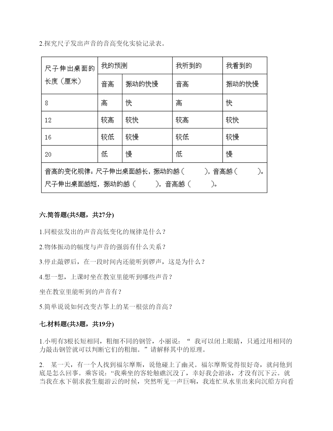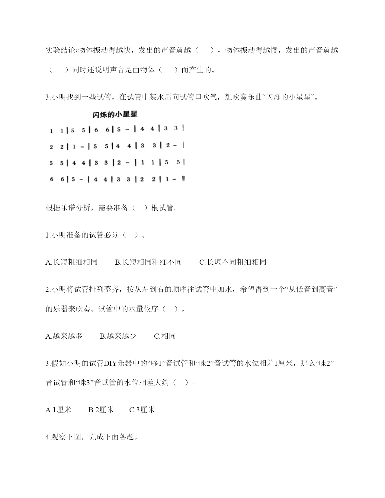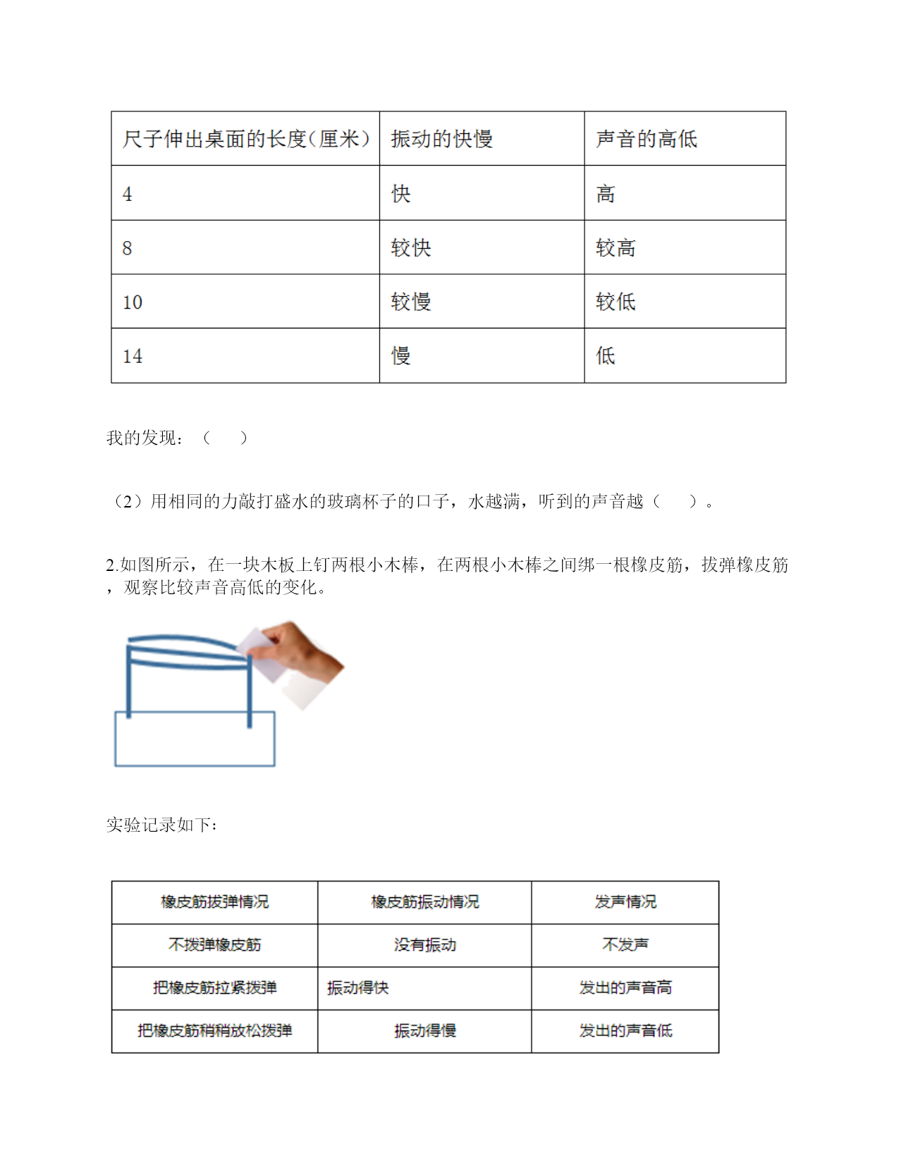 小学科学《声音》综合练习题一.选择题(共10题,共20分)1.唐代诗人张继的名句“姑苏城外寒山寺,夜半钟声到客船”描述了客船中的人听到远方的场景。此时听到的钟声是通过()传来的。A.水面B.客船C.空气2.假如两个人在月球上,必须要()才能顺利聊天。A.大声说话B.使用无线电C.小声说话3.在弹吉他时,若想要使它发出的声音强一些,可以()。A.换新吉他B.用的力气大一些C.调节弦的松紧度4.下面不能用于描述声音的是()。A.高、低B.强、弱C.多、少5.我们耳朵里的()即使是轻微的声音,它都会产生振动。A.听小骨B.鼓膜C.耳蜗6.一个人说话的声音“尖”,表明他说话的()。A.音量大B.音调高C.声音好听7.我们耳里的()时时刻刻都在接受着各种声音并产生振动。A.鼓膜B.听小骨C.耳蜗8.用长短不同的吸管并排在一起做成风笛,当吹这些管的时候,()。A.长管子发出的声音高B.短管子发出的声音高C.用力大时发出的音高高9.声音是以()的形式通过各种物质从一个地方传播到另一个地方的。A.波B.气流C.曲线10.小红吹奏上图的乐器,声音最高的是()。A.1号试管B.3号试管C.6号试管二.填空题(共10题,共36分)1.我们的发声器官是()。2.音叉是一种()的仪器,是用来()乐器和()音高的。音叉上的字母代表(),数字代表音叉每秒()。3.在拨动钢尺时,改变尺子伸出桌面的(),尺子振动时发出的音高也会改变,因为尺子振动的()改变了。4.将一根皮筋绷在纸盒上,绷得越紧,振动时发出的声音越();绷得越松,振动发出的声音越()。(选填“高”或“低”)5.人的()就像一个隧道,声音通过这条隧道到达鼓膜。6.用小锤敲击两个粗细相同、长短不同的铁管,发出的声音高的是()。7.我们说话的声音是由()振动产生的。把手放在喉结处,能感受到()的振动。8.影响弦乐器的弦的音高因素有()等。9.尺子伸出桌面(),发出的声音高;尺子伸出桌面(),发出的声音低。10.鼓声是由()振动产生的。三.判断题(共10题,共20分)1.耳朵贴在书桌上,可以听见同桌的写字声。()2.真空也可以传播声音。()3.制作的乐器只要能发出声音就行了。()4.在声音的世界里,有些声音悦耳动听,有些声音嘈杂刺耳。()5.喉咙里发声的器官叫声带。()6.为了防止琴弦松脱,琴弦调得越紧越好。()7.物体振动的幅度越大,发出的声音就越强。()8.铝板琴上的铝板越大,发出的声音越高。()9.当我们发声时,声带越紧,发出的声音越低。()10.吹奏竖笛时发出的声音是由笛管内空气的振动产生的。()四.连线题(共1题,共5分)1.把人耳各部分的名称与主要功能用线连起来。外耳道将声波转化为振动鼓膜传递声波到中耳听小骨传递声波到内耳耳蜗将听觉信号传递到大脑听觉神经将振动转化为听觉信号五.填表题(共2题,共20分)1.猜想:声音强弱与物体振动幅度有关,振幅越大,声音越();物体振幅越小,声音越()。实验器材:钢尺,桌子改变的条件:()不改变的条件:()填写表格。实验结论是什么?2.探究尺子发出声音的音高变化实验记录表。六.简答题(共5题,共27分)1.同根弦发出的声音高低变化的规律是什么?2.物体振动的幅度与声音的强弱有什么关系?3.停止敲锣后,在一段时间内还能听到锣声,这是为什么?4.想一想,上课时坐在教室里能听到哪些声音?坐在教室里能听到的声音有?5.简单说说如何改变古筝上的某一根弦的音高?七.材料题(共3题,共19分)1.小明有3根长短相同,粗细不同的钢管,小丽说:“我可以闭上眼睛,只通过用相同的力敲击钢管就可以判断它们的粗细。”请解释其中的原理。2.某一天,有一个人找到福尔摩斯,说他碰上了幽灵。福尔摩斯觉得很好奇,就问他到底是怎么回事。乘客说:“我乘坐的客轮触礁沉没了,幸好我会游泳,才没有沉下云。就当我在水下朝求救生艇游云的时候,突然听见一声巨响,我连忙从水里出来向沉船方向看去,结果又传来一声巨响。可是后来所有人都说只听到了一声巨响。你说我是不是遇到幽灵了?”福尔摩斯想了想,笑着说:“你没听错,不过确实只发生了一次爆炸,水里没有幽灵。”你能利用声音传播的知识,替福尔摩斯向这个人解释为什么会听到两次爆炸的声音吗?3.如图所示:在一块木板上钉两个钉子,在两个钉子之间绑一根橡皮筋,拨弹橡皮筋,观察比较声音高低的变化。实验记录如下:实验说明:物体振动得越快,发出的声音就越();物体振动得越慢,发出的声音就越();同时还说明声音是由物体()而产生的。八.综合题(共5题,共35分)1.下列图表的内容是李东同学在“探索尺子的音高变化”时记录的,通过分析表中的数据