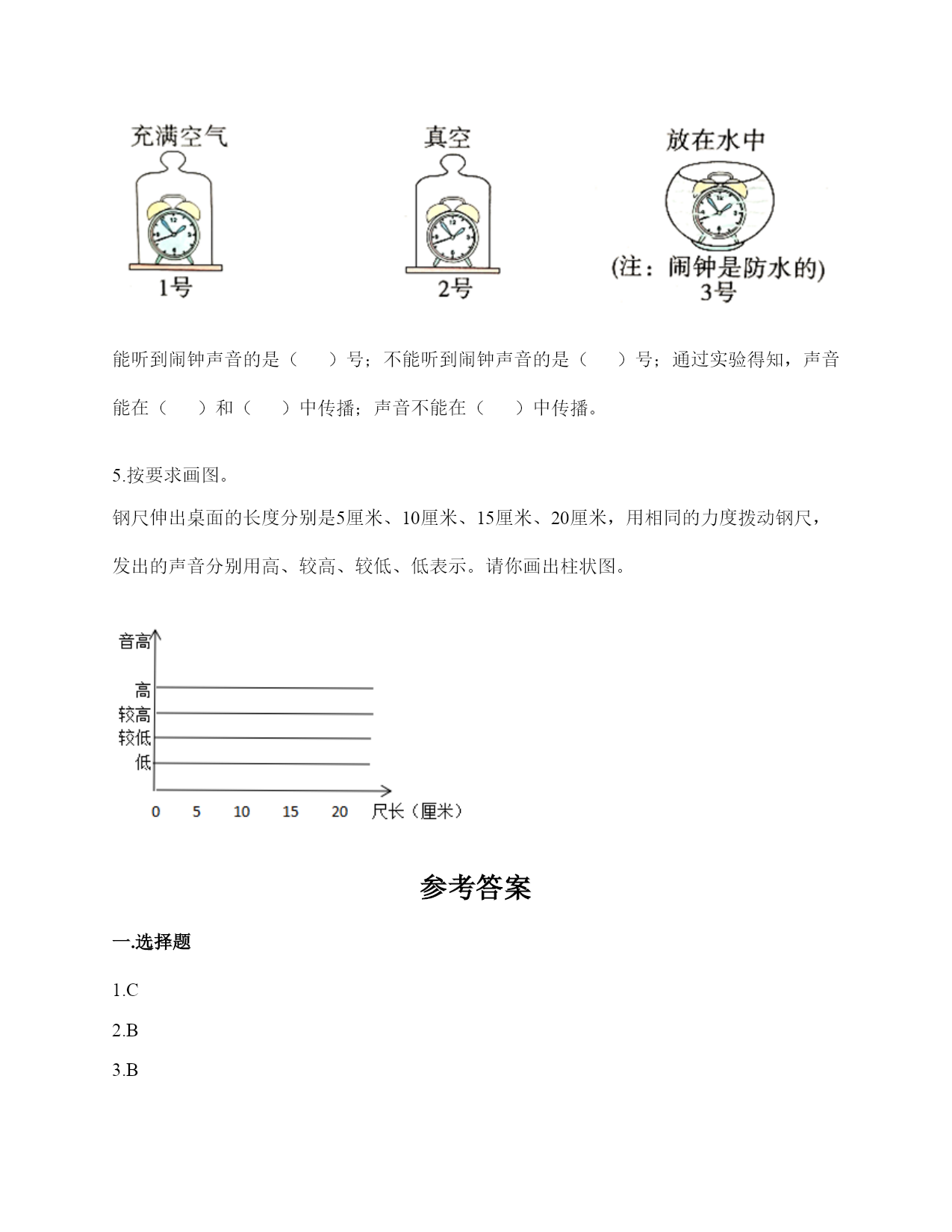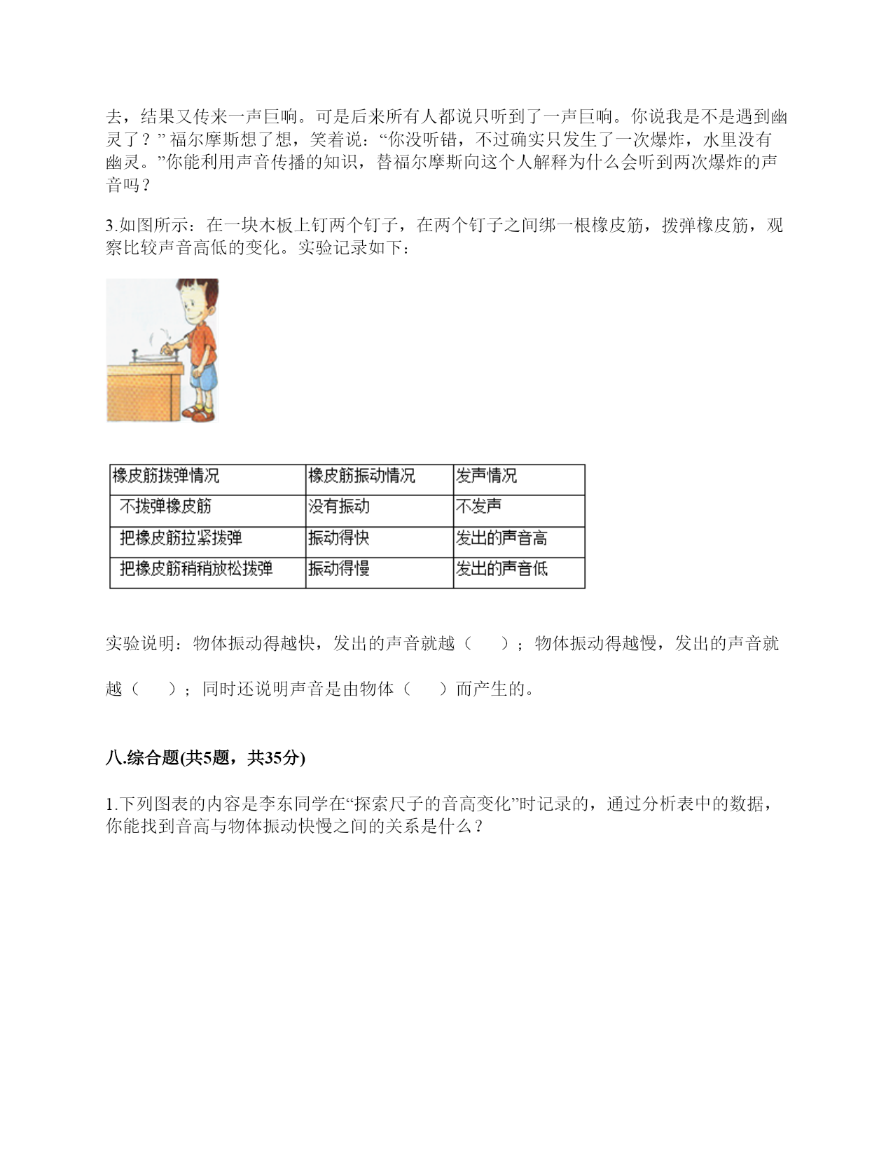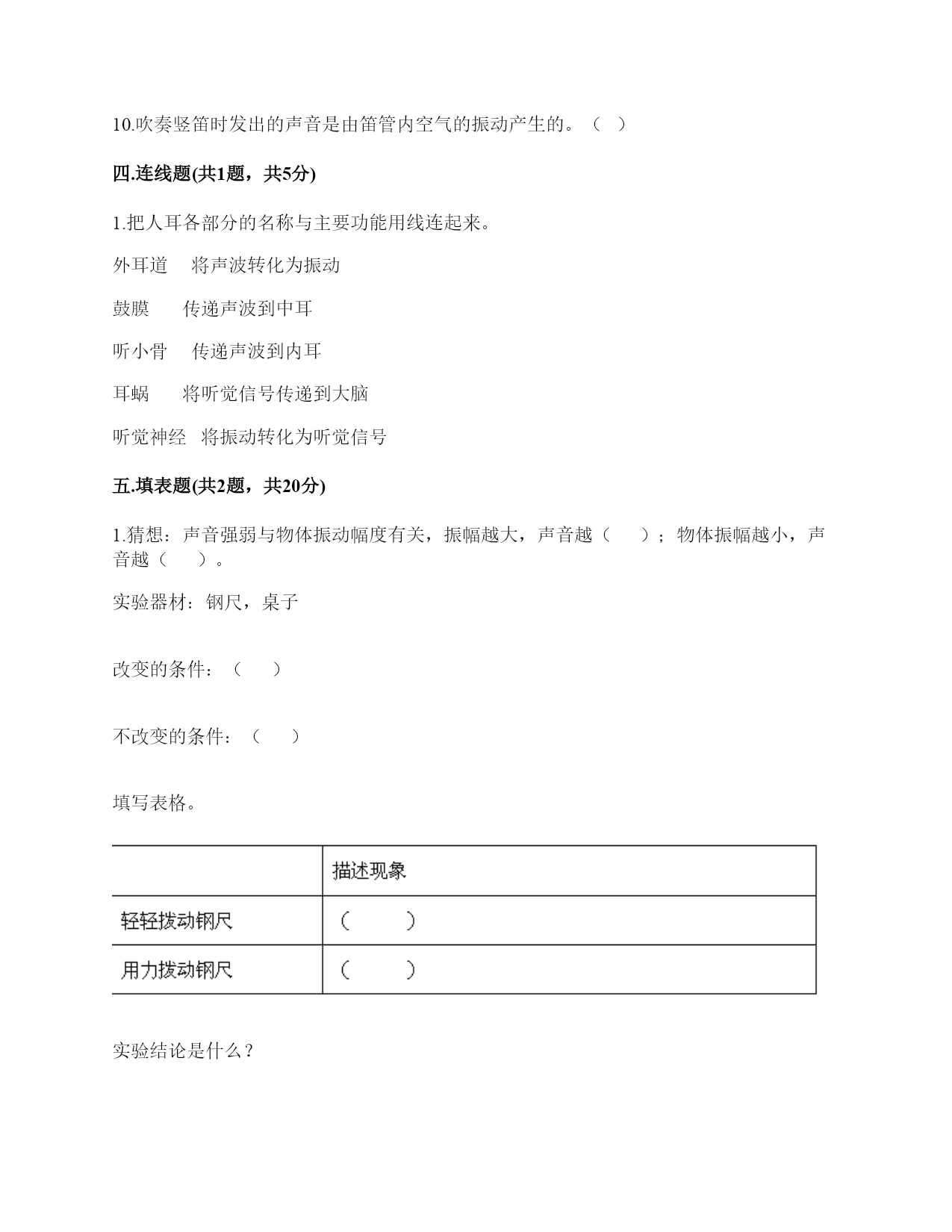 小学科学《声音》综合练习题一.选择题(共10题,共20分)1.唐代诗人张继的名句“姑苏城外寒山寺,夜半钟声到客船”描述了客船中的人听到远方的场景。此时听到的钟声是通过()传来的。A.水面B.客船C.空气2.假如两个人在月球上,必须要()才能顺利聊天。A.大声说话B.使用无线电C.小声说话3.在弹吉他时,若想要使它发出的声音强一些,可以()。A.换新吉他B.用的力气大一些C.调节弦的松紧度4.下面不能用于描述声音的是()。A.高、低B.强、弱C.多、少5.我们耳朵里的()即使是轻微的声音,它都会产生振动。A.听小骨B.鼓膜C.耳蜗6.一个人说话的声音“尖”,表明他说话的()。A.音量大B.音调高C.声音好听7.我们耳里的()时时刻刻都在接受着各种声音并产生振动。A.鼓膜B.听小骨C.耳蜗8.用长短不同的吸管并排在一起做成风笛,当吹这些管的时候,()。A.长管子发出的声音高B.短管子发出的声音高C.用力大时发出的音高高9.声音是以()的形式通过各种物质从一个地方传播到另一个地方的。A.波B.气流C.曲线10.小红吹奏上图的乐器,声音最高的是()。A.1号试管B.3号试管C.6号试管二.填空题(共10题,共36分)1.我们的发声器官是()。2.音叉是一种()的仪器,是用来()乐器和()音高的。音叉上的字母代表(),数字代表音叉每秒()。3.在拨动钢尺时,改变尺子伸出桌面的(),尺子振动时发出的音高也会改变,因为尺子振动的()改变了。4.将一根皮筋绷在纸盒上,绷得越紧,振动时发出的声音越();绷得越松,振动发出的声音越()。(选填“高”或“低”)5.人的()就像一个隧道,声音通过这条隧道到达鼓膜。6.用小锤敲击两个粗细相同、长短不同的铁管,发出的声音高的是()。7.我们说话的声音是由()振动产生的。把手放在喉结处,能感受到()的振动。8.影响弦乐器的弦的音高因素有()等。9.尺子伸出桌面(),发出的声音高;尺子伸出桌面(),发出的声音低。10.鼓声是由()振动产生的。三.判断题(共10题,共20分)1.耳朵贴在书桌上,可以听见同桌的写字声。()2.真空也可以传播声音。()3.制作的乐器只要能发出声音就行了。()4.在声音的世界里,有些声音悦耳动听,有些声音嘈杂刺耳。()5.喉咙里发声的器官叫声带。()6.为了防止琴弦松脱,琴弦调得越紧越好。()7.物体振动的幅度越大,发出的声音就越强。()8.铝板琴上的铝板越大,发出的声音越高。()9.当我们发声时,声带越紧,发出的声音越低。()10.吹奏竖笛时发出的声音是由笛管内空气的振动产生的。()四.连线题(共1题,共5分)1.把人耳各部分的名称与主要功能用线连起来。外耳道将声波转化为振动鼓膜传递声波到中耳听小骨传递声波到内耳耳蜗将听觉信号传递到大脑听觉神经将振动转化为听觉信号五.填表题(共2题,共20分)1.猜想:声音强弱与物体振动幅度有关,振幅越大,声音越();物体振幅越小,声音越()。实验器材:钢尺,桌子改变的条件:()不改变的条件:()填写表格。实验结论是什么?2.探究尺子发出声音的音高变化实验记录表。六.简答题(共5题,共27分)1.同根弦发出的声音高低变化的规律是什么?2.物体振动的幅度与声音的强弱有什么关系?3.停止敲锣后,在一段时间内还能听到锣声,这是为什么?4.想一想,上课时坐在教室里能听到哪些声音?坐在教室里能听到的声音有?5.简单说说如何改变古筝上的某一根弦的音高?七.材料题(共3题,共19分)1.小明有3根长短相同,粗细不同的钢管,小丽说:“我可以闭上眼睛,只通过用相同的力敲击钢管就可以判断它们的粗细。”请解释其中的原理。2.某一天,有一个人找到福尔摩斯,说他碰上了幽灵。福尔摩斯觉得很好奇,就问他到底是怎么回事。乘客说:“我乘坐的客轮触礁沉没了,幸好我会游泳,才没有沉下云。就当我在水下朝求救生艇游云的时候,突然听见一声巨响,我连忙从水里出来向沉船方向看去,结果又传来一声巨响。可是后来所有人都说只听到了一声巨响。你说我是不是遇到幽灵了?”福尔摩斯想了想,笑着说:“你没听错,不过确实只发生了一次爆炸,水里没有幽灵。”你能利用声音传播的知识,替福尔摩斯向这个人解释为什么会听到两次爆炸的声音吗?3.如图所示:在一块木板上钉两个钉子,在两个钉子之间绑一根橡皮筋,拨弹橡皮筋,观察比较声音高低的变化。实验记录如下:实验说明:物体振动得越快,发出的声音就越();物体振动得越慢,发出的声音就越();同时还说明声音是由物体()而产生的。八.综合题(共5题,共35分)1.下列图表的内容是李东同学在“探索尺子的音高变化”时记录的,通过分析表中的数据