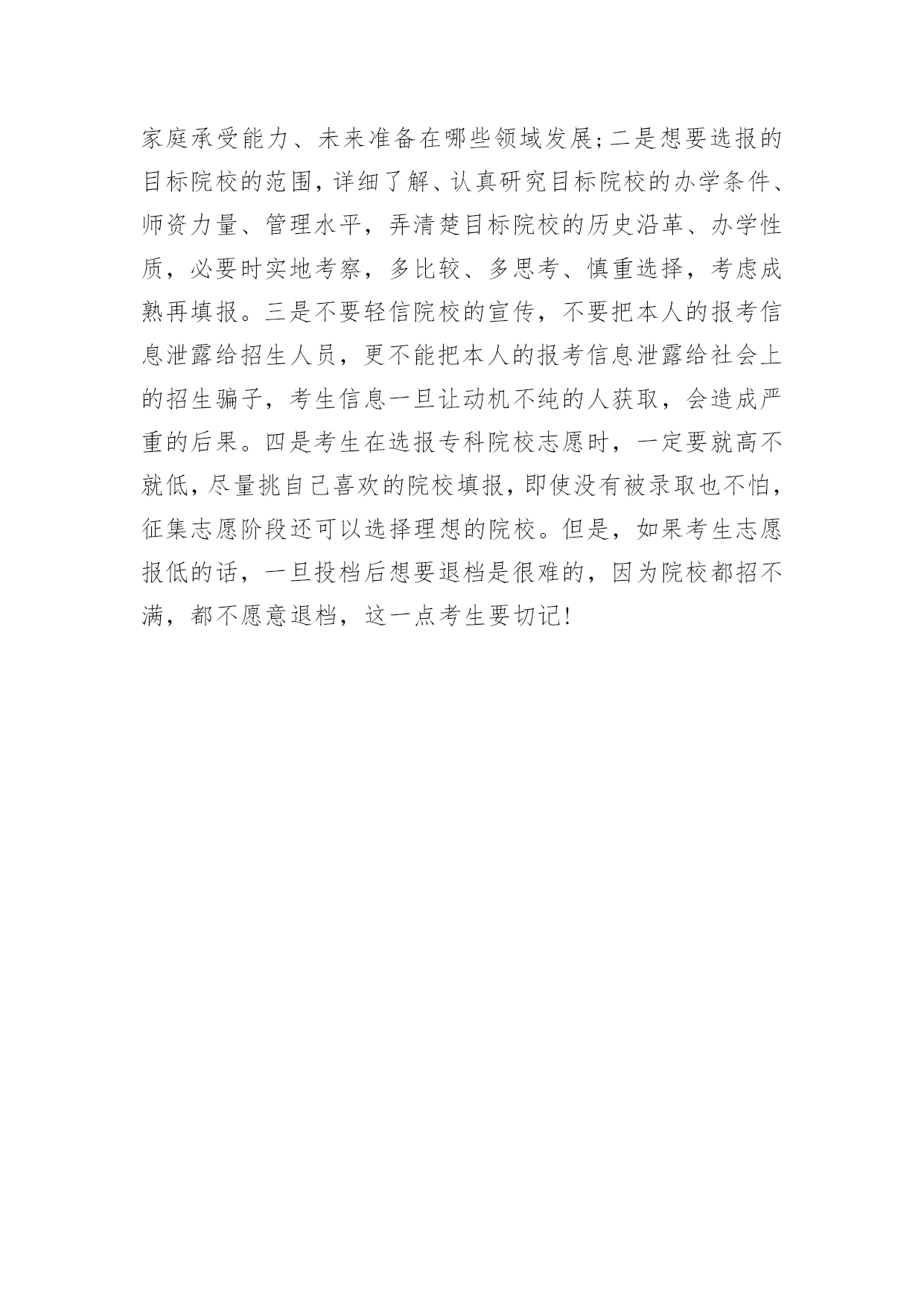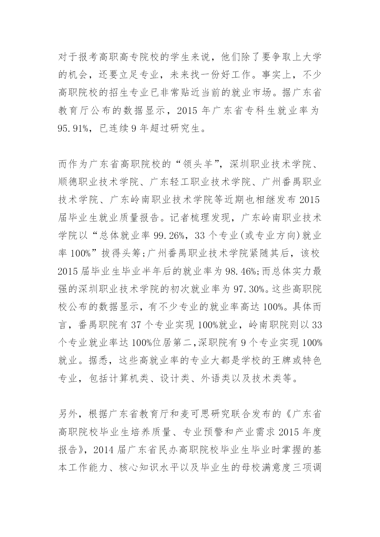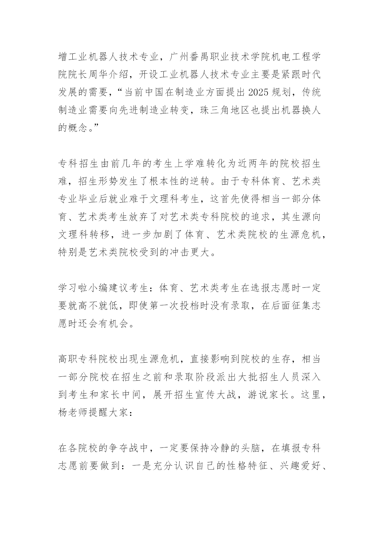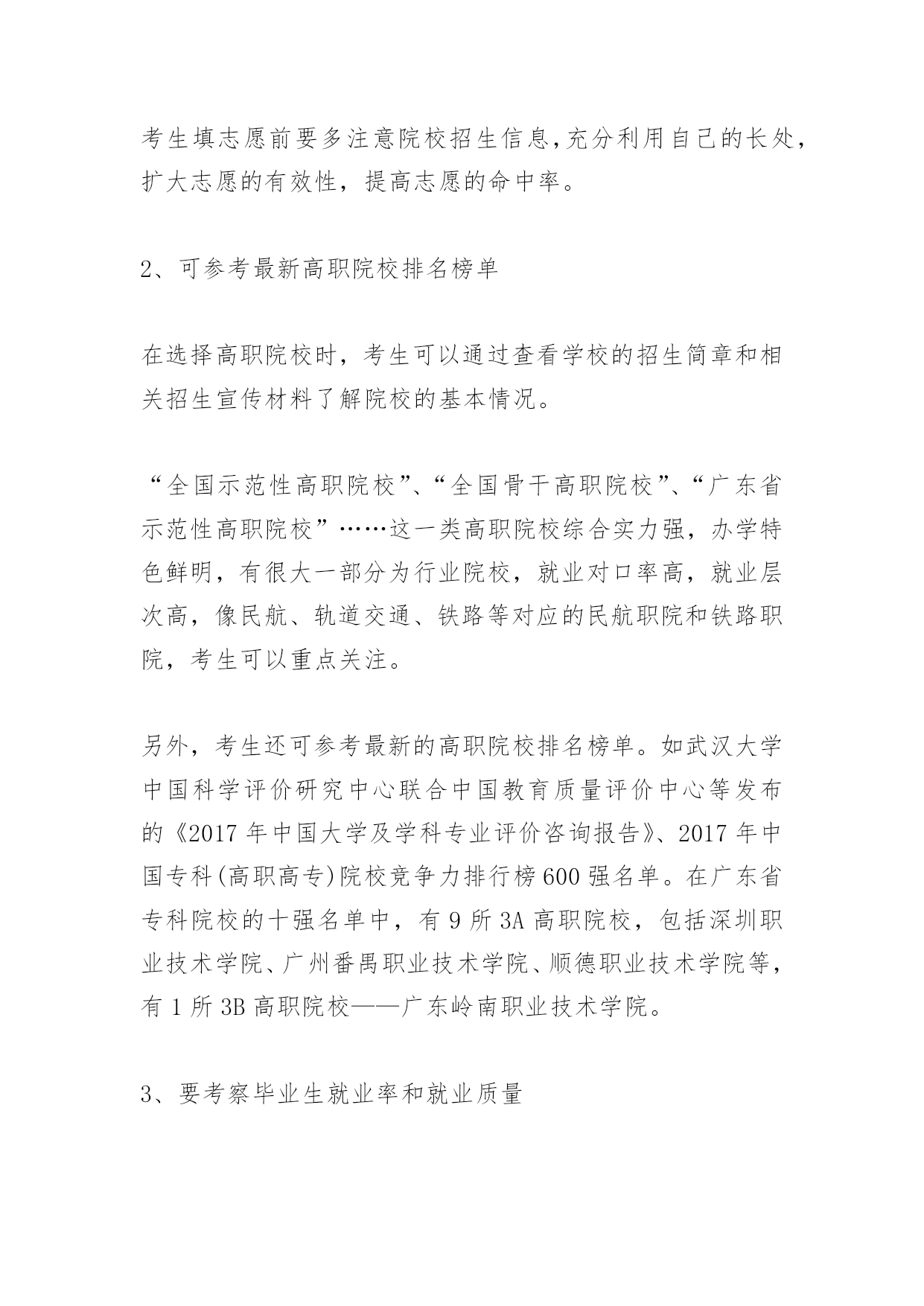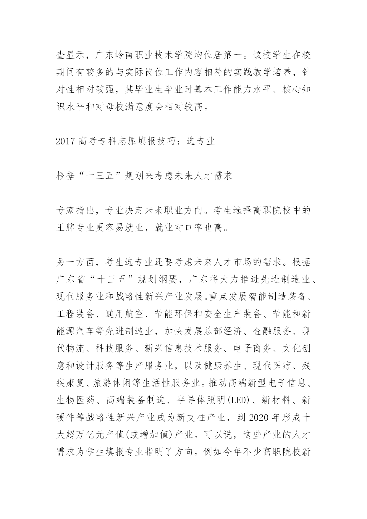 高考专科志愿填报技巧2017高考专科志愿填报技巧在高考志愿填报过程中,需要掌握好一定的技巧,以下是由小编整理关于高考专科志愿填报技巧的内容,希望大家喜欢!2017高考专科志愿填报技巧:选学校1、从考生实际出发,慎选第一志愿据悉,3A、3B批次的一些热门院校只录取第一志愿,有些热门院校每年录取分数比投档线高出几十分甚至上百分。根据往年的经验,这个批次的院校在投档时,两极分化极大,部分口碑较好的院校,分数线很高,而另一部分院校分数线走低。广东岭南职业技术学院招办副主任李勇建议,考生填报志愿前要认真阅读报考指南和招生专业目录,从自身实际情况出发,结合个人兴趣爱好,了解学校就业情况和学生满意度等权威信息,再结合往年录取情况及自己高考成绩在本省同科类考生中的具体位置,综合权衡作出合理选择。“从2009年开始,岭南职业技术学院都是在第一志愿就录满了,所以报考岭南,一定要在第一志愿填报。”李勇提醒考生,有些院校、专业对考生性别、身体状况等方面提出特别要求,所以考生填志愿前要多注意院校招生信息,充分利用自己的长处,扩大志愿的有效性,提高志愿的命中率。2、可参考最新高职院校排名榜单在选择高职院校时,考生可以通过查看学校的招生简章和相关招生宣传材料了解院校的基本情况。“全国示范性高职院校”、“全国骨干高职院校”、“广东省示范性高职院校”……这一类高职院校综合实力强,办学特色鲜明,有很大一部分为行业院校,就业对口率高,就业层次高,像民航、轨道交通、铁路等对应的民航职院和铁路职院,考生可以重点关注。另外,考生还可参考最新的高职院校排名榜单。如武汉大学中国科学评价研究中心联合中国教育质量评价中心等发布的《2017年中国大学及学科专业评价咨询报告》、2017年中国专科(高职高专)院校竞争力排行榜600强名单。在广东省专科院校的十强名单中,有9所3A高职院校,包括深圳职业技术学院、广州番禺职业技术学院、顺德职业技术学院等,有1所3B高职院校——广东岭南职业技术学院。3、要考察毕业生就业率和就业质量对于报考高职高专院校的学生来说,他们除了要争取上大学的机会,还要立足专业,未来找一份好工作。事实上,不少高职院校的招生专业已非常贴近当前的就业市场。据广东省教育厅公布的数据显示,2015年广东省专科生就业率为95.91%,已连续9年超过研究生。而作为广东省高职院校的“领头羊”,深圳职业技术学院、顺德职业技术学院、广东轻工职业技术学院、广州番禺职业技术学院、广东岭南职业技术学院等近期也相继发布2015届毕业生就业质量报告。记者梳理发现,广东岭南职业技术学院以“总体就业率99.26%,33个专业(或专业方向)就业率100%”拔得头筹;广州番禺职业技术学院紧随其后,该校2015届毕业生毕业半年后的就业率为98.46%;而总体实力最强的深圳职业技术学院的初次就业率为97.30%。这些高职院校公布的数据显示,有不少专业的就业率高达100%。具体而言,番禺职院有37个专业实现100%就业,岭南职院则以33个专业就业率达100%位居第二,深职院有9个专业实现100%就业。据悉,这些高就业率的专业大都是学校的王牌或特色专业,包括计算机类、设计类、外语类以及技术类等。另外,根据广东省教育厅和麦可思研究联合发布的《广东省高职院校毕业生培养质量、专业预警和产业需求2015年度报告》,2014届广东省民办高职院校毕业生毕业时掌握的基本工作能力、核心知识水平以及毕业生的母校满意度三项调查显示,广东岭南职业技术学院均位居第一。该校学生在校期间有较多的与实际岗位工作内容相符的实践教学培养,针对性相对较强,其毕业生毕业时基本工作能力水平、核心知识水平和对母校满意度会相对较高。2017高考专科志愿填报技巧:选专业根据“十三五”规划来考虑未来人才需求专家指出,专业决定未来职业方向。考生选择高职院校中的王牌专业更容易就业,就业对口率也高。另一方面,考生选专业还要考虑未来人才市场的需求。根据广东省“十三五”规划纲要,广东将大力推进先进制造业、现代服务业和战略性新兴产业发展。重点发展智能制造装备、工程装备、通用航空、节能环保和安全生产装备、节能和新能源汽车等先进制造业,加快发展总部经济、金融服务、现代物流、科技服务、新兴信息技术服务、电子商务、文化创意和设计服务等生产服务业,以及健康养生、现代医疗、残疾康复、旅游休闲等生活性服务业。推动高端新型电子信息、生物医药、高端装备制造、半导体照明(LED)、新材料、新硬件等战略性新兴产业成为新支柱产业,到2020年形成十大超万亿元产值(或增加值)产业。可以说,这些产业的人才需求为学生填报专业指明了方向。例如今年不少高职院校新增工业机器人技术专业,广州番禺职业技术学院机电工程学院院长周华介绍,开设工业机器人技术专业主要是紧跟时代发展的需要,“当前中国在制造业方面