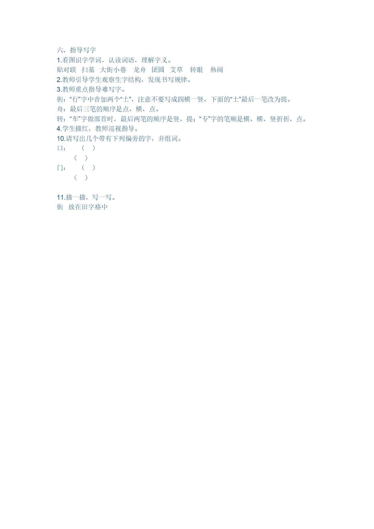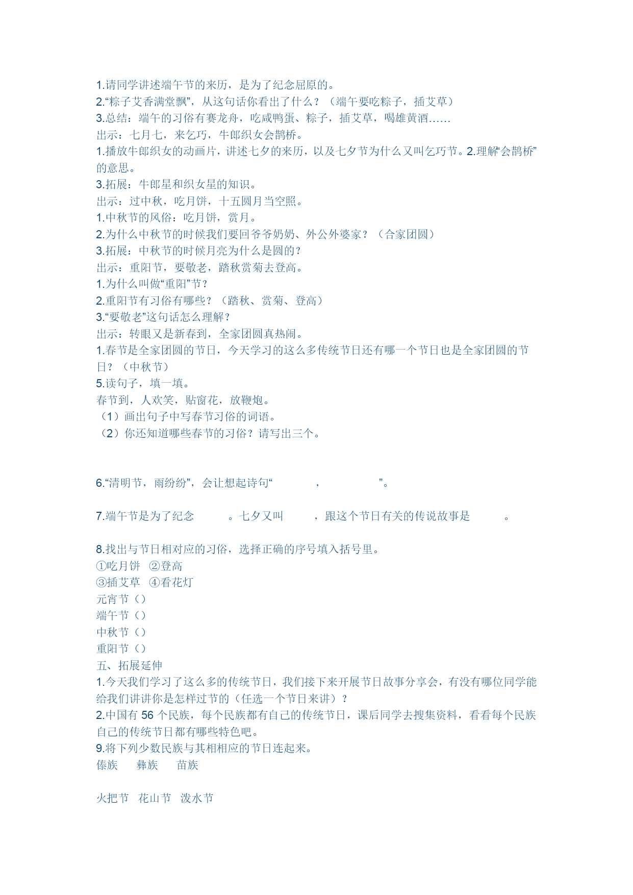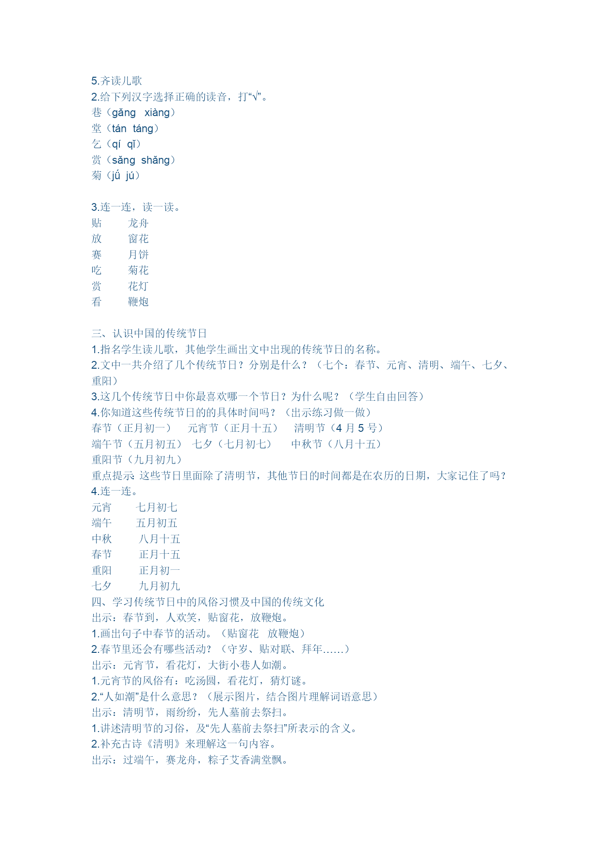 《传统节日》教案识字2传统节日[HYPERLINK"http://www.5ykj.com/Health/"\t"_blank"教学目标]1.会认“传、统”等15个生字,会写“贴、街”等9个生字。2.正确、流利地朗读课文,背诵课文。3.引导学生文化了解中国传统文化,激发学生的爱国感情。[HYPERLINK"http://www.5ykj.com/Health/"\t"_blank"教学重点]1.识记生字词,背诵课文。2.准备掌握中国的传统节日及相关习俗。[教学课时]1课时第一课时教学过程达标检测一、图片导入1.出示课件:春节、端午、中秋三个节日的情景照片。2.同学们,你们从图片看到了什么?能知道图上画的是什么节日吗?(学生自由讨论)这些节日都是中国的传统节日,中国的传统节日还有哪些?哪位同学来说一说?3.出示课题。(齐读课题)4.学习“传统”二字的读音。(“传”:三拼音节,翘舌音;统:后鼻音。)1.下面是我们传统节日的有()①清明节②元旦③元宵节④圣诞节⑤端午节⑥七夕⑦中秋节⑧重阳节二、读儿歌,随文识字1.请学生借助拼音,自由读儿歌。要求:在拼音的帮助下把字音读正确,难读的词多读几遍。2.自读检查。(1)指名轮读,一人一句。相机正音。(2)同桌对读,正音。3.出示带生字词语,认读字词。(1)带拼音读词语。打乱顺序读词语。(出示课件)传chuán统tǒnɡ贴tiē窗花大街jiē小巷xiànɡ祭jì扫sǎo赛龙舟zhōu艾ài香满堂tánɡ乞qǐ巧qiǎo牛郎lánɡ织女月饼bǐnɡ赏shǎnɡ菊jú转zhuǎn眼团tuán圆热rè闹nao(2)去拼音读词语。(3)保留生字,读生字。4.教师教学重难点字词。(1)统、巷、堂、郎、饼、赏:都是后鼻音的字,其中“巷”是三拼音节。(2)菊:注意音节的拼写,“ü”上两点要去掉。(3)热闹:读rènao,“闹”字声母是“n”,两个字连读时,“闹”要读轻声。5.齐读儿歌2.给下列汉字选择正确的读音,打“√”。巷(gǎngxiàng)堂(tántáng)乞(qíqǐ)赏(sǎngshǎng)菊(jǘjú)3.连一连,读一读。贴龙舟放窗花赛月饼吃菊花赏花灯看鞭炮三、认识中国的传统节日1.指名学生读儿歌,其他学生画出文中出现的传统节日的名称。2.文中一共介绍了几个传统节日?分别是什么?(七个:春节、元宵、清明、端午、七夕、重阳)3.这几个传统节日中你最喜欢哪一个节日?为什么呢?(学生自由回答)4.你知道这些传统节日的的具体时间吗?(出示练习做一做)春节(正月初一)元宵节(正月十五)清明节(4月5号)端午节(五月初五)七夕(七月初七)中秋节(八月十五)重阳节(九月初九)重点提示:这些节日里面除了清明节,其他节日的时间都是在农历的日期,大家记住了吗?4.连一连。元宵七月初七端午五月初五中秋八月十五春节正月十五重阳正月初一七夕九月初九四、学习传统节日中的风俗习惯及中国的传统文化出示:春节到,人欢笑,贴窗花,放鞭炮。1.画出句子中春节的活动。(贴窗花放鞭炮)2.春节里还会有哪些活动?(守岁、贴对联、拜年……)出示:元宵节,看花灯,大街小巷人如潮。1.元宵节的风俗有:吃汤圆,看花灯,猜灯谜。2.“人如潮”是什么意思?(展示图片,结合图片理解词语意思)出示:清明节,雨纷纷,先人墓前去祭扫。1.讲述清明节的习俗,及“先人墓前去祭扫”所表示的含义。2.补充古诗《清明》来理解这一句内容。出示:过端午,赛龙舟,粽子艾香满堂飘。1.请同学讲述端午节的来历,是为了纪念屈原的。2.“粽子艾香满堂飘”,从这句话你看出了什么?(端午要吃粽子,插艾草)3.总结:端午的习俗有赛龙舟,吃咸鸭蛋、粽子,插艾草,喝雄黄酒……出示:七月七,来乞巧,牛郎织女会鹊桥。1.播放牛郎织女的动画片,讲述七夕的来历,以及七夕节为什么又叫乞巧节。2.理解“会鹊桥”的意思。3.拓展:牛郎星和织女星的知识。出示:过中秋,吃月饼,十五圆月当空照。1.中秋节的风俗:吃月饼,赏月。2.为什么中秋节的时候我们要回爷爷奶奶、外公外婆家?(合家团圆)3.拓展:中秋节的时候月亮为什么是圆的?出示:重阳节,要敬老,踏秋赏菊去登高。1.为什么叫做“重阳”节?2.重阳节有习俗有哪些?(踏秋、赏菊、登高)3.“要敬老”这句话怎么理解?出示:转眼又是新春到,全家团圆真热闹。1.春节是全家团圆的节日,今天学习的这么多传统节日还有哪一个节日也是全家团圆的节日?(中秋节)5.读句子,填一填。春节到,人欢笑,贴窗花,放鞭炮。(1)画出句子中写春节习俗的词语。(2)你还知道哪些春节的习俗?请写出三个。6.“清明节,雨纷纷”,会让想起诗句“,”。7.端午节是为了纪念。七夕又叫,跟这个节日有关的传说故事是。8.找出与节日相对应的习俗,选择正确的序号填入括号里。①吃月饼②登高③插艾草
