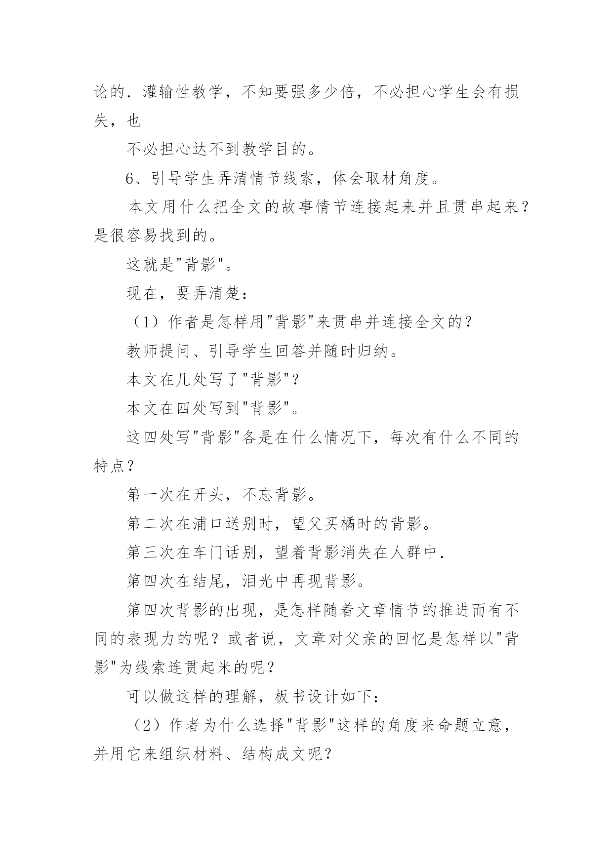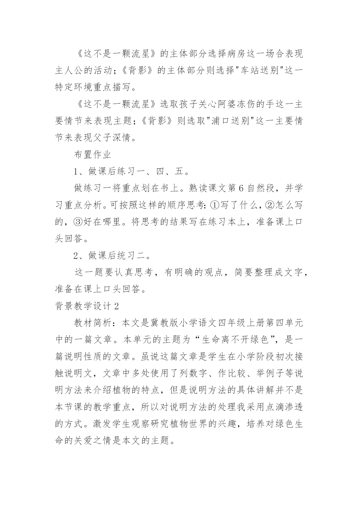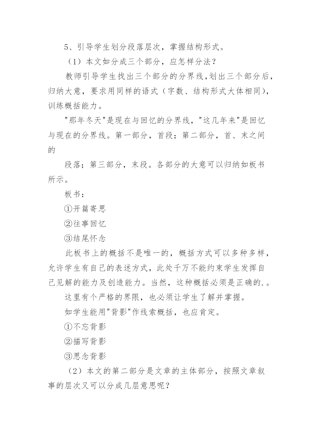 背景教学设计背景教学设计作为一位杰出的教职工,往往需要进行教学设计编写工作,借助教学设计可以让教学工作更加有效地进行。教学设计应该怎么写呢?下面是小编帮大家整理的背景教学设计,欢迎阅读与收藏。背景教学设计1教学目的:1、体会本文抓住人物形象特征、选择最佳角度命题立意、组织材料的写作方法。2、学习本文记叙事实,不加任何修饰渲染的朴实自然的语言。3、体会本文表现的民族传统美德,父亲对儿子的一片探情。教学设想:这篇课文与上篇课文不同。《这不是一颗流星》反映的生活贴近学生实际,而本课反映的是社会家庭亲人的关系。前者是父亲心目中的儿予,后者则写的是儿子心目中的父亲,人物形象的悬殊,也构成了课文完全不同的内容。但作为记叙性文章,在写作方怯上还是有很多共同点的,而思想、感情上的家庭亲情,同样是一脉相承的。教学本文,重点应放在特定环境下父予深情的特定表达方式,抓住文章命题立意的角度和文章线索来作为分析的突彼口;还应抓住本文独特的写人记事的朴实自然的语言,从中体会字里行间所表达的思想感情。本文可分两课时讲授。第一课时主要是划分段落层次,分析贯串全文的线索,侧重完成第一个教学目的;第二课时则以重点语段、语句的体会为主要教学内容,侧重完成第二个教学目的.第一课时教学重点:突出往事回忆的结构形式;用"背影"连接贯串故事情节的艺术构思。教学过程:1、布置预习(可在课前进行)。①让学生认真阅读一遍课文。②结合课后练习三、七体会课文。本文分三部分,第二部分分三层,概括出它们的主要内容,并找出起、讫语句。2、教师导语(先板书出课题)。《背影》是一篇著名的纪实性散文,也可以说是回忆性散文,同《这不是一颗流星》一样,属于记叙文。本文写于1925年,至今已六七十年,一直被广大读者所传诵,多少年来也一直被选入教材,哺育了几代人。对于这样的名篇,我们应认真阅读、学习。本文作为一篇记叙文,与《这不是一颗流星》有很多相同点,如都是写家庭亲情,都是从生活中选取典型的、生动的材料。,都县通过一定的情节线索来组织材料、通过场面和人物的描写来表现中心意思。在这些相同点中,又各有不同的表现方法。阅读时要善于在学习新课文的过程当中,联系旧课文,比较鉴别,从中融会贯通,得到一些新的启发。我们在阅读《这不是一颗流星》时,是从分析结构形式入手,弄清故事情节及其表现形式。本课的学习也应该这样。3、引导学生读准字音,解释词义。交卸(Xie):卸,解除、除去。"交卸",用于某种职务。"推卸",用于某种责任。奔丧(sang),有关死人的事,名词。奔丧,在外地赶回办理尊亲丧事。丧,另读sang,丢掉,失去。动词。踌躇(Ch6uChu),犹豫不定。另意,形容得意。迂腐(yu),拘泥保守。迂腐,拘泥于旧的准则。迂,另意,"迂廻",曲折、绕远。蹒跚(Panshan)走路缓慢、摇摆的样子。颓唐(tui),精神委靡,意气消沉。琐屑(Xie),指细小繁杂的事。晶莹(ying),光洁透明。4、朗读课文。找学生朗读课文,最好分三个部分,找三个同学分别朗读,提出朗读要求。5、引导学生划分段落层次,掌握结构形式。(1)本文如分成三个部分,应怎样分法?教师引导学生找出三个部分的分界线,划出三个部分后,归纳大意,要求用同样的语式(字数、结构形式大体相同),训练概括能力。"那年冬天"是现在与回忆的分界线,"这几年来"是回忆与现在的分界线。第一部分,首段;第二部分,首、末之间的段落;第三部分,末段。各部分的大意可以归纳如板书所示。板书:①开篇寄思②往事回忆③结尾怀念此板书上的概括不是唯一的,概括方式可以多种多样,允许学生有自己的表述方式,此处千万不能约束学生发挥自己见解的能力及创造能力。当然,这种概括必须是正确的.。这里有个严格的界限,也必须让学生了解并掌握。如学生能用"背影"作线索概括,也应肯定。①不忘背影②描写背影③思念背影(2)本文的第二部分是文章的主体部分,按照文章叙事的层次又可以分成几层意思呢?教师引导、学生讨论、教师小结。中间部分可以分成三个层次:第一层次:交代父子分别时的家境第二层次:送行前父亲的细心关照。第三层次;送行时看到父亲的背影还可以有别的概括,比如:中间部分可分为两个层次:第一层次:交代家境第二层次:浦口送别在第二层次"浦口送别"中又可以分为三个小的层次:第一、细心照顾第二、车站买橘第三、车门话别如按此划分,板书设计为(3)在划分段落层次时,应从开始就告诉学生,文章本身的结构形式是固定的、是客观存在的。我们划分层次应力求符合作品本身固有的思路及其结构形式,但由于读者认识的差异、角度的不同、目的的不同,往往有不同的分法。这就要作具体分析。有的最这样分也可以,那样分也未尝不可;有的则绝对不行。划分层次还是有原则的,不是可以任意划分的。学生进入中学开始,就有这样的认识,养成独立阅读和分析的习惯,比教师"一