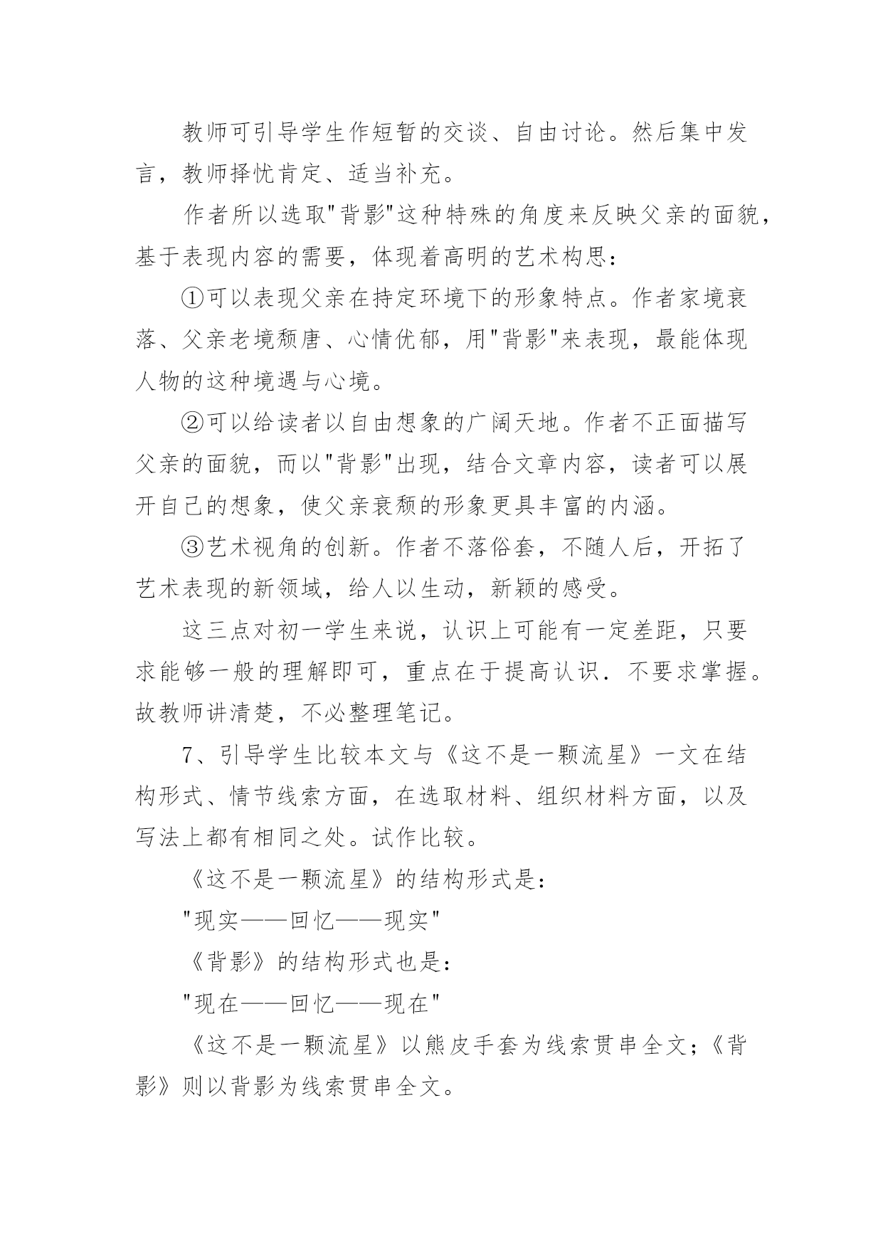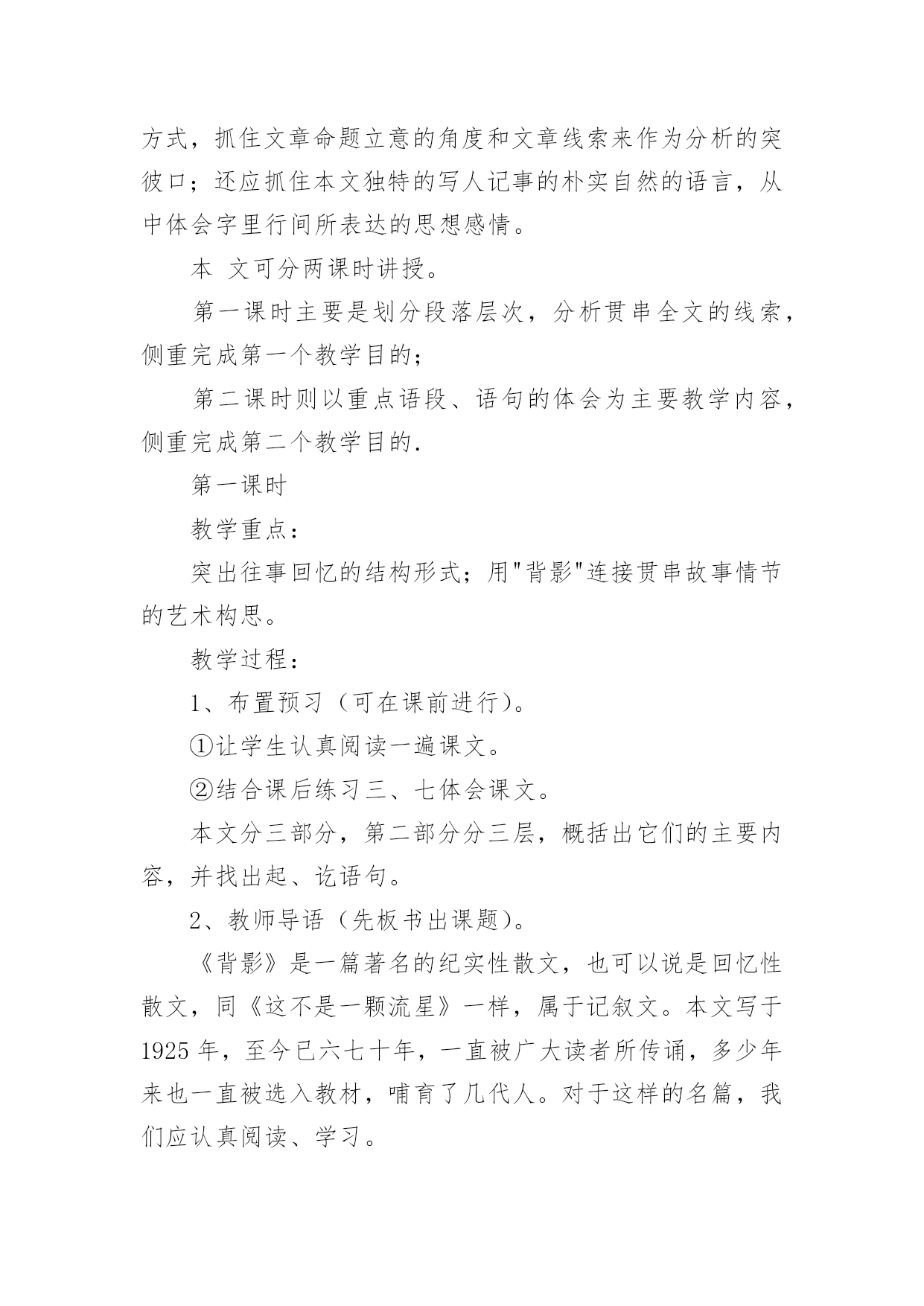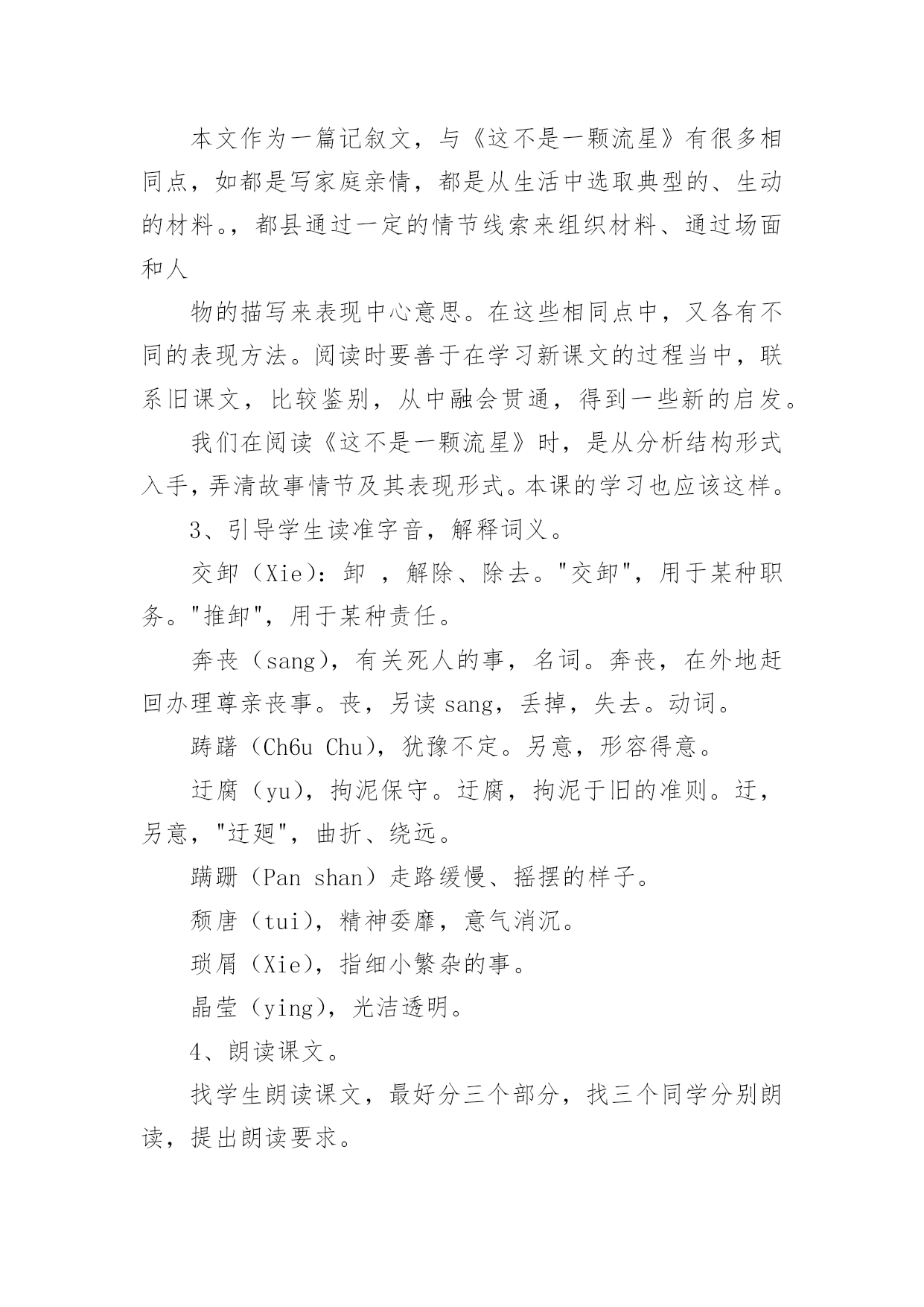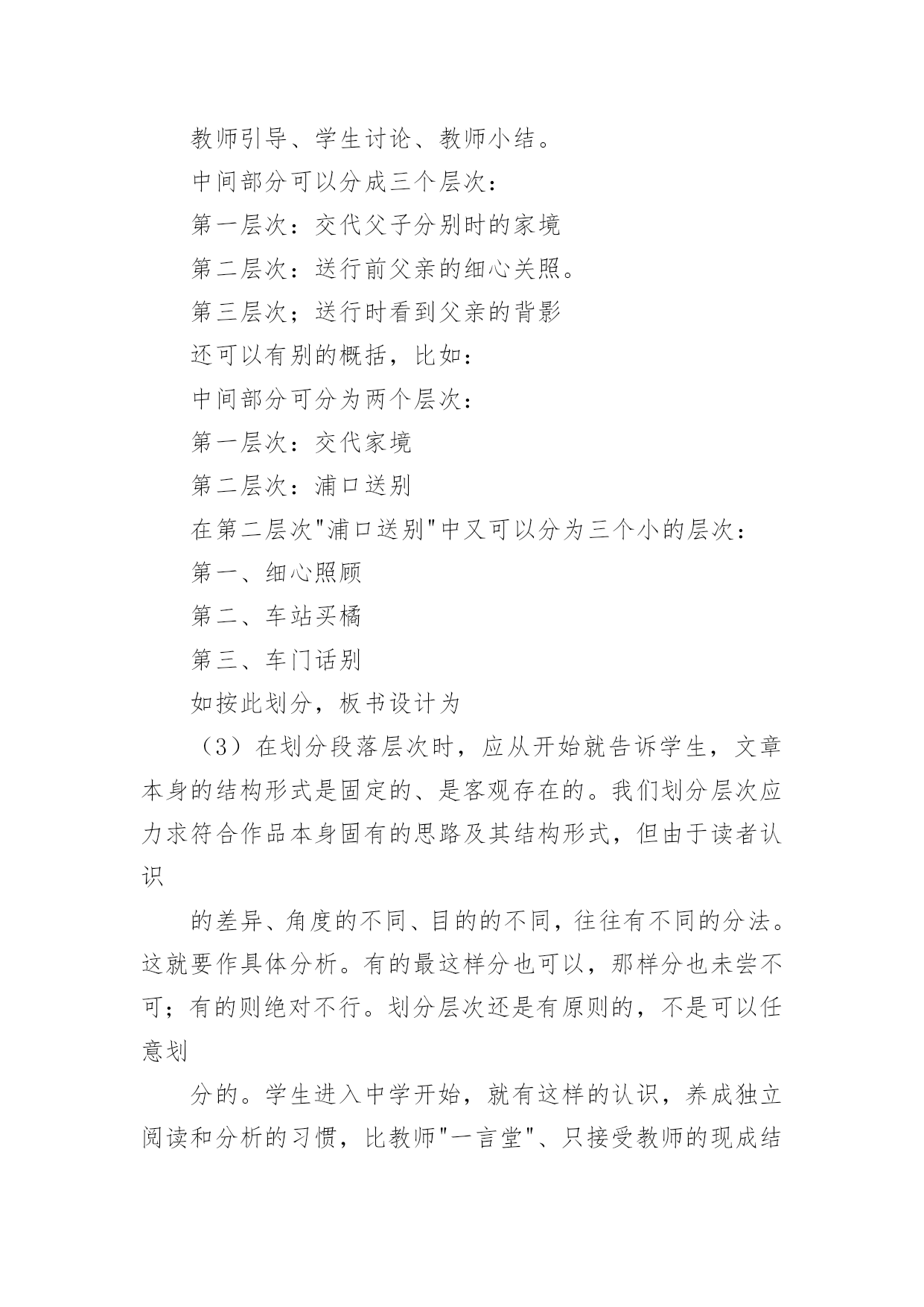 背景教学设计背景教学设计作为一位杰出的教职工,往往需要进行教学设计编写工作,借助教学设计可以让教学工作更加有效地进行。教学设计应该怎么写呢?下面是小编帮大家整理的背景教学设计,欢迎阅读与收藏。背景教学设计1教学目的:1、体会本文抓住人物形象特征、选择最佳角度命题立意、组织材料的写作方法。2、学习本文记叙事实,不加任何修饰渲染的朴实自然的语言。3、体会本文表现的民族传统美德,父亲对儿子的一片探情。教学设想:这篇课文与上篇课文不同。《这不是一颗流星》反映的生活贴近学生实际,而本课反映的是社会家庭亲人的关系。前者是父亲心目中的儿予,后者则写的是儿子心目中的父亲,人物形象的悬殊,也构成了课文完全不同的内容。但作为记叙性文章,在写作方怯上还是有很多共同点的,而思想、感情上的家庭亲情,同样是一脉相承的。教学本文,重点应放在特定环境下父予深情的特定表达方式,抓住文章命题立意的角度和文章线索来作为分析的突彼口;还应抓住本文独特的写人记事的朴实自然的语言,从中体会字里行间所表达的思想感情。本文可分两课时讲授。第一课时主要是划分段落层次,分析贯串全文的线索,侧重完成第一个教学目的;第二课时则以重点语段、语句的体会为主要教学内容,侧重完成第二个教学目的.第一课时教学重点:突出往事回忆的结构形式;用"背影"连接贯串故事情节的艺术构思。教学过程:1、布置预习(可在课前进行)。①让学生认真阅读一遍课文。②结合课后练习三、七体会课文。本文分三部分,第二部分分三层,概括出它们的主要内容,并找出起、讫语句。2、教师导语(先板书出课题)。《背影》是一篇著名的纪实性散文,也可以说是回忆性散文,同《这不是一颗流星》一样,属于记叙文。本文写于1925年,至今已六七十年,一直被广大读者所传诵,多少年来也一直被选入教材,哺育了几代人。对于这样的名篇,我们应认真阅读、学习。本文作为一篇记叙文,与《这不是一颗流星》有很多相同点,如都是写家庭亲情,都是从生活中选取典型的、生动的材料。,都县通过一定的情节线索来组织材料、通过场面和人物的描写来表现中心意思。在这些相同点中,又各有不同的表现方法。阅读时要善于在学习新课文的过程当中,联系旧课文,比较鉴别,从中融会贯通,得到一些新的启发。我们在阅读《这不是一颗流星》时,是从分析结构形式入手,弄清故事情节及其表现形式。本课的学习也应该这样。3、引导学生读准字音,解释词义。交卸(Xie):卸,解除、除去。"交卸",用于某种职务。"推卸",用于某种责任。奔丧(sang),有关死人的事,名词。奔丧,在外地赶回办理尊亲丧事。丧,另读sang,丢掉,失去。动词。踌躇(Ch6uChu),犹豫不定。另意,形容得意。迂腐(yu),拘泥保守。迂腐,拘泥于旧的准则。迂,另意,"迂廻",曲折、绕远。蹒跚(Panshan)走路缓慢、摇摆的样子。颓唐(tui),精神委靡,意气消沉。琐屑(Xie),指细小繁杂的事。晶莹(ying),光洁透明。4、朗读课文。找学生朗读课文,最好分三个部分,找三个同学分别朗读,提出朗读要求。5、引导学生划分段落层次,掌握结构形式。(1)本文如分成三个部分,应怎样分法?教师引导学生找出三个部分的分界线,划出三个部分后,归纳大意,要求用同样的语式(字数、结构形式大体相同),训练概括能力。"那年冬天"是现在与回忆的分界线,"这几年来"是回忆与现在的分界线。第一部分,首段;第二部分,首、末之间的段落;第三部分,末段。各部分的大意可以归纳如板书所示。板书:①开篇寄思②往事回忆③结尾怀念此板书上的概括不是唯一的,概括方式可以多种多样,允许学生有自己的表述方式,此处千万不能约束学生发挥自己见解的能力及创造能力。当然,这种概括必须是正确的.。这里有个严格的界限,也必须让学生了解并掌握。如学生能用"背影"作线索概括,也应肯定。①不忘背影②描写背影③思念背影(2)本文的第二部分是文章的主体部分,按照文章叙事的层次又可以分成几层意思呢?教师引导、学生讨论、教师小结。中间部分可以分成三个层次:第一层次:交代父子分别时的家境第二层次:送行前父亲的细心关照。第三层次;送行时看到父亲的背影还可以有别的概括,比如:中间部分可分为两个层次:第一层次:交代家境第二层次:浦口送别在第二层次"浦口送别"中又可以分为三个小的层次:第一、细心照顾第二、车站买橘第三、车门话别如按此划分,板书设计为(3)在划分段落层次时,应从开始就告诉学生,文章本身的结构形式是固定的、是客观存在的。我们划分层次应力求符合作品本身固有的思路及其结构形式,但由于读者认识的差异、角度的不同、目的的不同,往往有不同的分法。这就要作具体分析。有的最这样分也可以,那样分也未尝不可;有的则绝对不行。划分层次还是有原则的,不是可以任意划分的。学生进入中学开始,就有这样的认识,养成独立阅读和分析的习惯,比教师"一