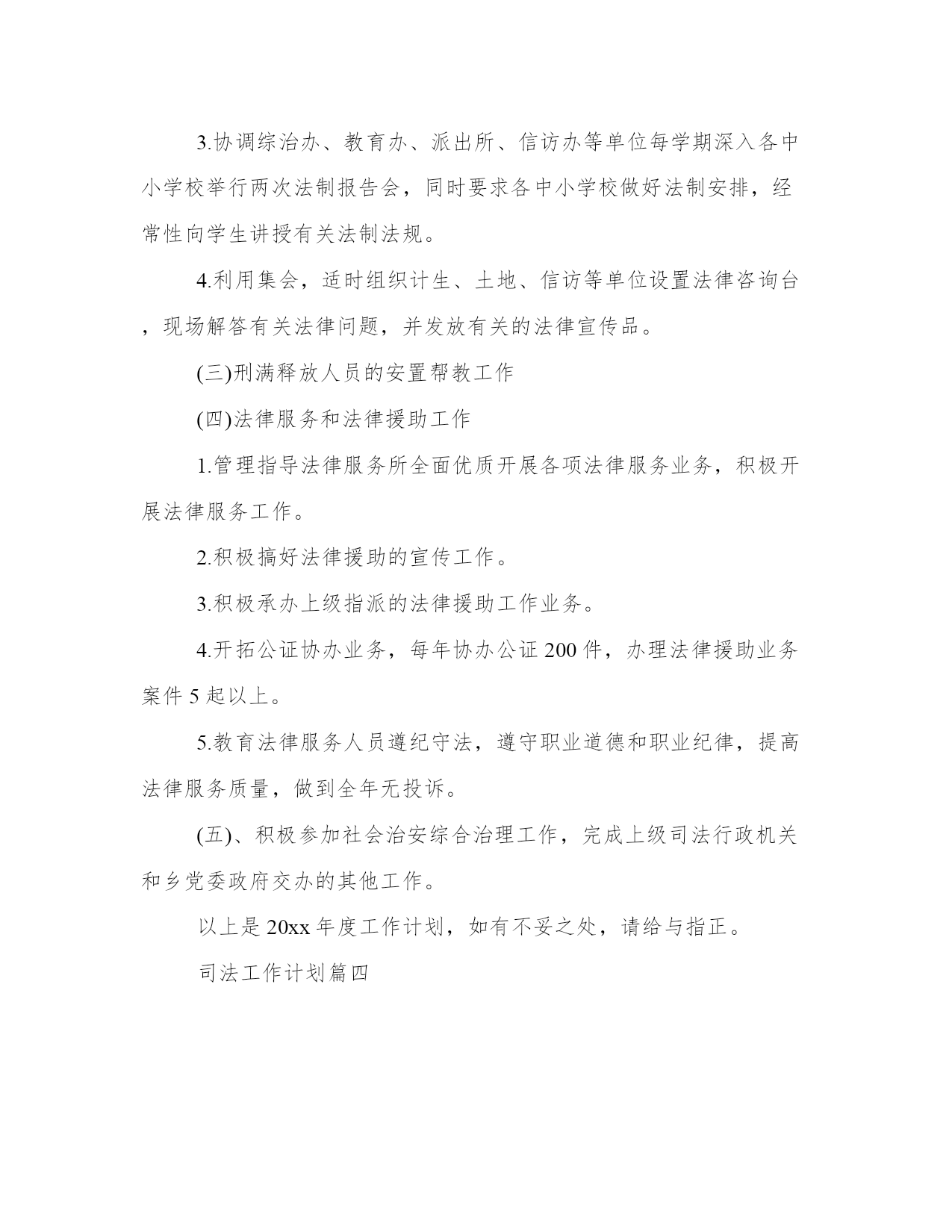 司法工作计划(实用16篇)计划是一种为了实现特定目标而制定的有条理的行动方案。我们在制定计划时需要考虑到各种因素的影响,并保持灵活性和适应性。下面我帮大家找寻并整理了一些优秀的计划书范文,我们一起来了解一下吧。司法工作计划篇一20xx年,我局的司法行政工作要坚持以邓小平理论为指导,全面贯彻落实科学发展观,继续强化队伍建设,充分发挥司法行政工作各项职能的作用,继续为维护全县社会稳定,促进经济和社会各项事业发展做出积极贡献,为我县经济发展、社会和谐创造更加良好的法制环境。现将有关工作计划如下:(一)进一步加强法制宣传教育,做好五五普法的验收工作“五五”普法活动已接近尾声,但我们要继续认真贯彻落实“五五”普法规划,推进“法律七进”活动,提高全民法素质。以“学法律、讲权利、讲义务、讲责任”为主要内容的“法律七进”活动,是“五五”普法的重大创新,是深化普法教育的有效载体,要创造性地推进“法律七进”活动,贴近基层、贴近群众,把法律知识送到广大机关、乡村、社区、学校、企业、单位,满足不同普法对象的学法需求,使“法律七进”成为惠及人民群众的“民心工程”,争取做好五五普法活动的验收工作。(二)进一步加强司法所规范化工作,努力做到人员编制到位目前,部分司法所由于人员的临时性、不确定性导致有些工作无法顺利开展,严重影响了司法所各项职能的发挥,因此,我们要积极开展创建规范化司法所工作,理顺司法所管理体制,落实司法所职能、编制和人员,建立健全各项工作制度,加强和规范各项业务,提高工作能力和水平。(三)进一步加强项目建设,争取司法所办公设施到位一要积极争取司法所配套设施项目。司法所办公用房建成以后,要进一步加大工作力度,积极向上争取办公桌、椅、微机、照相机、摄像机、传真机等办公设施配套项目,彻底改变我县司法所办公条件,充分发挥第一道防线的作用;二要积极争取法律服务中心建设项目。我县律师事务所、公证处、法律援助中心均在统办楼一楼和司法局合署办公,当事人进出影响着统办楼门口的正常管理,有时当事人吵吵闹闹,影响着统办楼的正常工作秩序。我们已将会宁县司法局业务用房建设实施方案上报市发改局、市司法局,希望列入国家计划项目,建设会宁县法律服务中心,将律师事务所、公证处、法律援助中心统一到法律服务中心办公,有效解决办公用房紧缺、维护统办楼正常工作秩序,为我县经济社会发展提供有力的法律保障和法律服务。(四)进一步加强基层基础,努力完成各项工作任务一要大力开展矛盾纠纷排查调处活动,充分运用人民调解、行政调解、司法调解的手段,把矛盾纠纷化解在基层、化解在萌芽状态;二要积极争取建立刑释解教人员过度性安置企业,最大限度地增加和谐因素;三要加大宣传力度,拓展法律服务领域,为经济建设提供法律服务,为弱势群体提供法律保障。司法工作计划篇二一年来,在镇党委、政府的正确领导和上级业务部门的指导下,紧紧围绕镇党委、政府中心工作,以“法治李中、平安李中”为目标,以增强民主法制意识为核心,以推进民主法治示范村建设为突破口,坚持科学发展观,积极开展法制宣传教育,通过全镇各村、单位的共同努力,圆满完成了各项法制宣传教育任务,取得了较好的效果。现将我所的法制宣传教育情况总结如下:今年来,镇党委、政府始终把普法、依法治理工作,纳入镇党委、政府工作的重要议事日程,并按照上级要求成立了相应的组织。一是镇成立了法制宣传教育领导小组,镇党委分管政法的书记担任组长,各单位、各部门负责人为成员的法制宣传教育领导小组,切实加强了对我镇法制宣传教育工作的领导。二是村成立了法制宣传教育小组,村主任为宣传员。三是成立了志愿者宣传教育队伍,主要由老教师、老党员、老干部等人员担任法制宣传教育志愿者。通过各类组织的建立,有效化解了社会矛盾,减少了越级和重复上访。以干部、公务员、青少年和外出务工人员等为重点普法对象;全面深入地开展各项普法教育活动,有力地促进了普法和依法治理工作的开展;并结合“315”消费者权益日、“6.26”禁毒日、“124”法制宣传日,积极开展法制宣传教育活动。在镇政府驻地和部分村悬挂宣传标语横幅,组织各村负责人参观法制宣传黑板报;在吕祖庙会开展大型送法活动。活动中共展出法律知识展板42块、散发普法宣传传单2000余张、赠送法律书籍100余本、接受群众咨询近600人次,受法制宣传教育人数约2.18万人次。1、突出干部和公务人员学法。按照要求认真组织公务员学法,坚持每月一个学法日制度。确保每个公务员掌握本专业、本行业的法律知识,努力提高依法行政、依法办事的能力。对行政执法人员,采取有针对性的定向宣传教育,并向机关、单位发放学习资料500多份。有力提高了知法、守法,特别是用法、护法的能力与水平,自觉做到秉公执法。今年共组织公务员学法讲座3次,受教育约200人次。2、狠抓青少年学