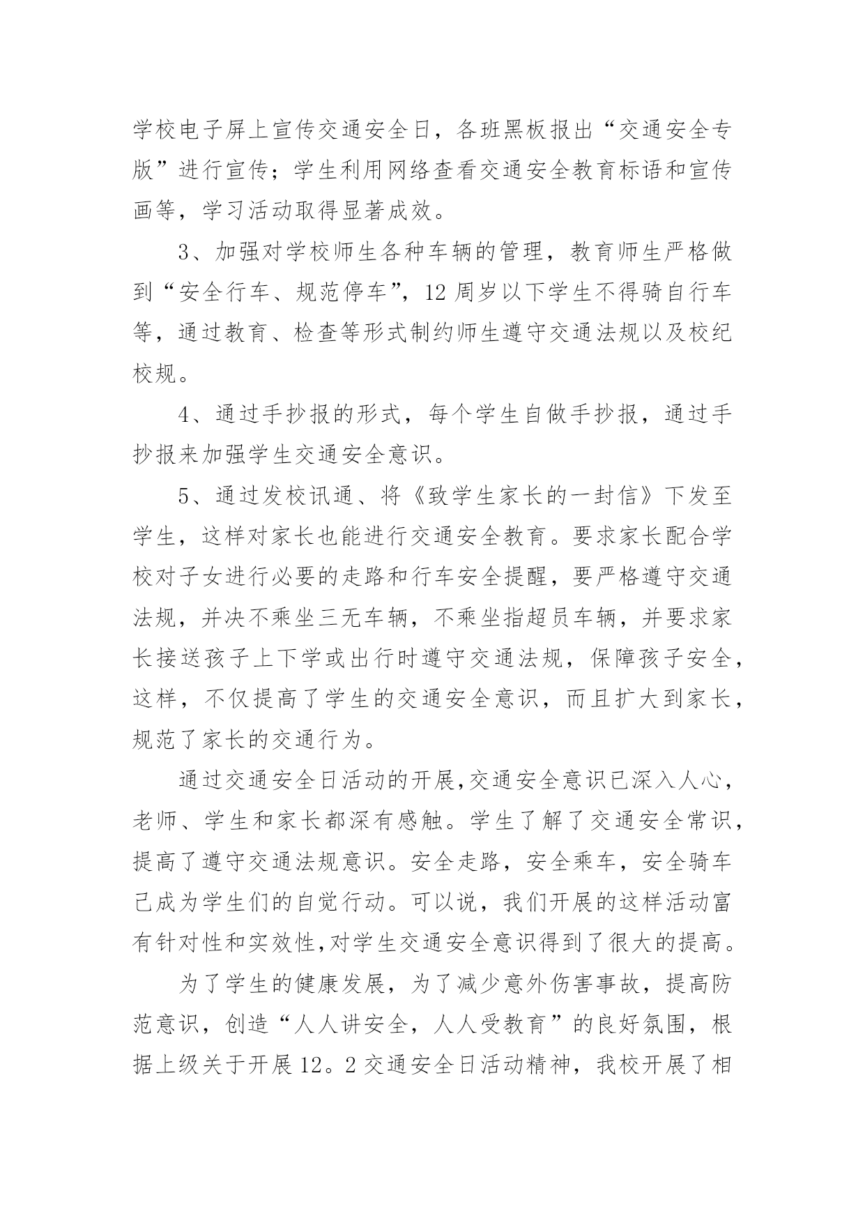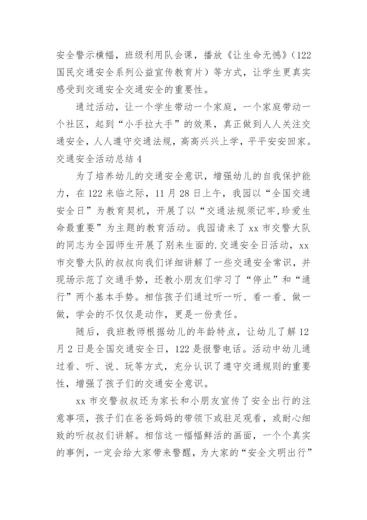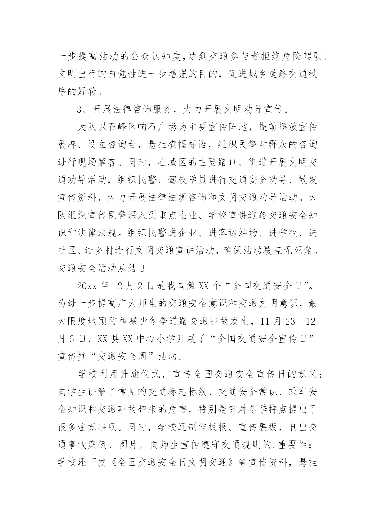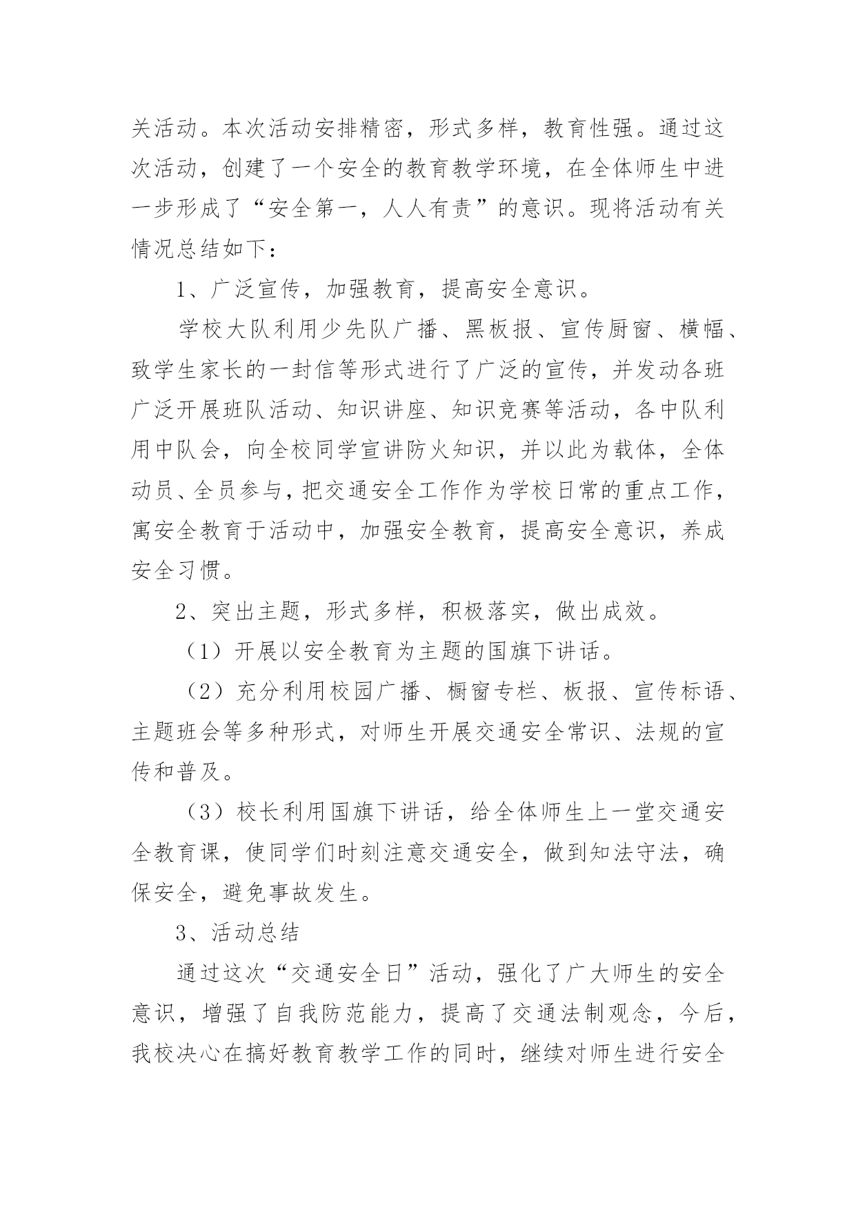 交通安全活动总结交通安全活动总结总结是事后对某一阶段的学习、工作或其完成情况加以回顾和分析的一种书面材料,它可以有效锻炼我们的语言组织能力,让我们一起认真地写一份总结吧。如何把总结做到重点突出呢?以下是小编帮大家整理的交通安全活动总结,欢迎大家分享。交通安全活动总结1为全面贯彻落实上级文件精神,我校在上级部门的指导下,立足自身,针对学校的实际,踏踏实实做好本次全国交通安全反思日教育活动,现将有关活动情况总结:一、健全机制,精心组织作为安全工作,学校把本次教育活动摆在重要议事日程。除完成常规的工作外,学校在各项工作亟待理顺的情况下,抽出时间召开班子会议,专题研究本次活动的开展。各班班主任为组员的“全国交通安全反思日”活动工作领导小组,形成了主要领导亲自抓,分管领导具体抓,其它成员落实抓的良好工作局面,为本次活动的开展打下了良好的基础。二、活动丰富,效果明显在为期一周的宣传教育中,学校开展了多项活动。内容丰富多彩,做到了全员动员、人人参与,全体师生的安全意识明显加强,家长既满意,同时也受到了教育,一个良好的氛围进一步形成。1、张贴宣传标语、宣传画;2、以班级为单位组织学生学习《中小学生交通安全知识》读本,开展主题班会;3、组织学生学习《道路交通安全法》,谈体会,写心得;4、以“小手牵大手”的形式,积极向家长和周围的成人开展交通常识、法规宣传活动。我校接到县教育局《关于组织全县中小学校开展“全国交通安全日”系列主题宣传活动》的通知后,积极响应通知精神,研究并制定了团河中心小学开展“全国交通安全日”系列主题宣传活动的具体活动方案,并按照活动方案认真组织了实施。从20xx年12月2日至12月7日,我校开展了为期5天的以“遵守交通信号,安全文明出行”为主题的宣传活动。现将我校开展此项活动的具体情况总结如下:1、接到通知后,我校十分重视此项活动工作,召开会议进行了专题研究,并制定了具体方案,教师例会时,向全体教师下发了活动方案,并要求全体教师认真组织开展此项活动。2、12月2日学校升国旗后,管安全的罗副校长在国旗下讲话,对学校开展“全国交通安全日”系列主题宣传活动的重要意义进行了大力宣传,使广大学生心灵深处受到触动,自觉树立起安全意识,并积极投入到活动中来。3、各班以班为单位开展了“小手拉大手”给家长的一封信和“大手拉小手”给孩子的回信亲子互动活动。12月3日下午,学校团队室出了一期题为“遵守交通信号,安全文明出行”为主题的黑板报;并且每天中午,红领巾广播站广播20分钟有关"全国交通安全日”方面的知识内容。12月6日下午最后一节课全校各班开展了以“遵守交通信号,安全文明出行”的主题班会活动。总之,通过开展“全国交通安全日”系列主题宣传活动,使我校广大学生树立了“自觉遵守交通法规,了解并掌握了交通信号,提高了自我保护能力的意识”,学到了许多交通安全方面的相关知识,掌握了有关如何避免事故发生和自救、互救的方法,提高了学生自我保护的.能力!我校成立“学校交通安全日活动领导小组”,负责组织和安排学校的交通安全教育工作,把学生的交通安全列入重要的议事日程。根据文件精神,提出活动的方案;开展全校性的教育活动,通过国旗下讲话宣传的同时,还通过学校的LED、学生自做手抄报、黑板报等形式进行交通安全宣传等等。具体活动如下:1、利用班会课,专门设置“小学学生冬季交通安全知识”为内容的课程,备好课,上好课,使全校师生都能受教育,实现了交通安全教育进学校的目的,交通安全知识讲座使全体学生深受教育。2、利用各种载体,广泛开展“文通安全日”活动。在学校电子屏上宣传交通安全日,各班黑板报出“交通安全专版”进行宣传;学生利用网络查看交通安全教育标语和宣传画等,学习活动取得显著成效。3、加强对学校师生各种车辆的管理,教育师生严格做到“安全行车、规范停车”,12周岁以下学生不得骑自行车等,通过教育、检查等形式制约师生遵守交通法规以及校纪校规。4、通过手抄报的形式,每个学生自做手抄报,通过手抄报来加强学生交通安全意识。5、通过发校讯通、将《致学生家长的一封信》下发至学生,这样对家长也能进行交通安全教育。要求家长配合学校对子女进行必要的走路和行车安全提醒,要严格遵守交通法规,并决不乘坐三无车辆,不乘坐指超员车辆,并要求家长接送孩子上下学或出行时遵守交通法规,保障孩子安全,这样,不仅提高了学生的交通安全意识,而且扩大到家长,规范了家长的交通行为。通过交通安全日活动的开展,交通安全意识已深入人心,老师、学生和家长都深有感触。学生了解了交通安全常识,提高了遵守交通法规意识。安全走路,安全乘车,安全骑车己成为学生们的自觉行动。可以说,我们开展的这样活动富有针对性和实效性,对学生交通安全意识得到了很大的提高。为了学生的健康发展,为了减少意外伤害事故,提高防范意识,创造“人人讲安全,人人