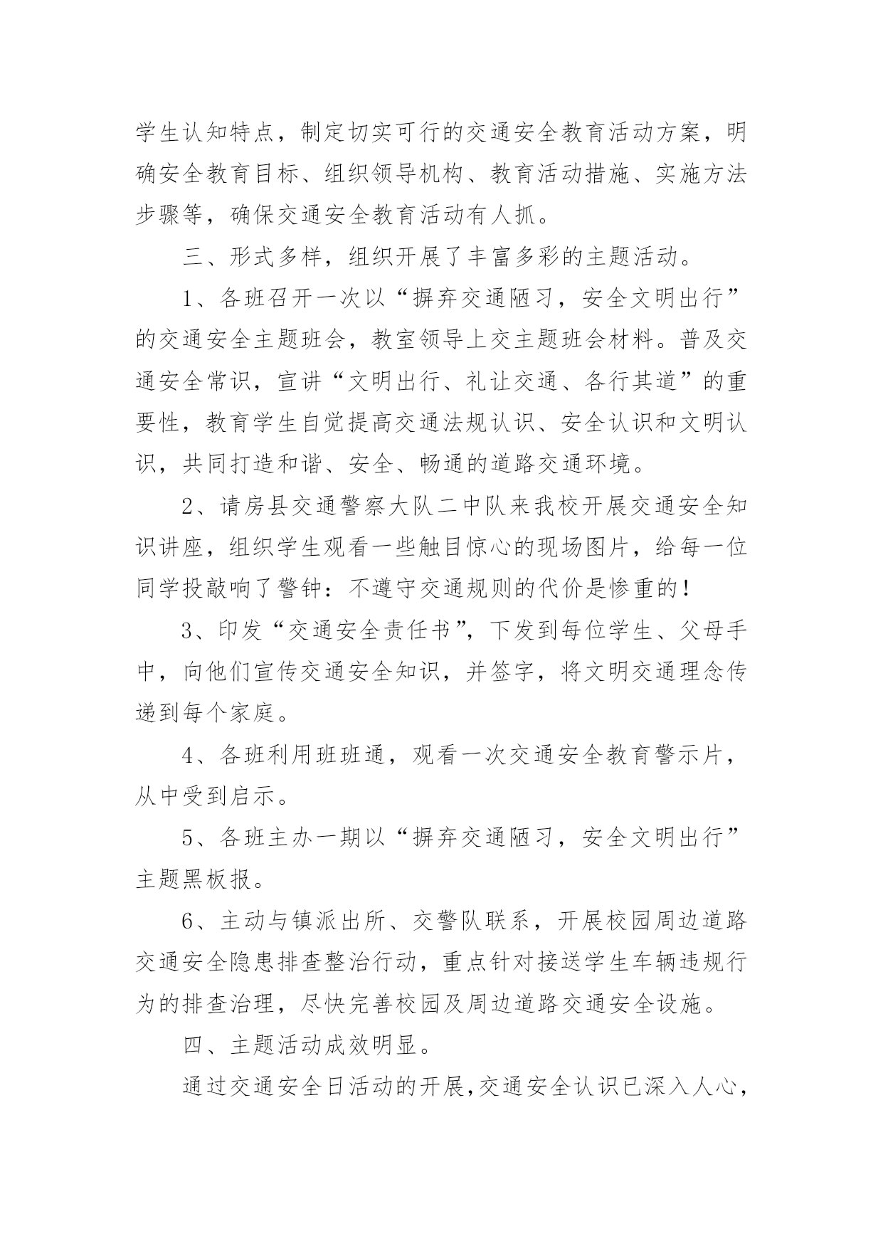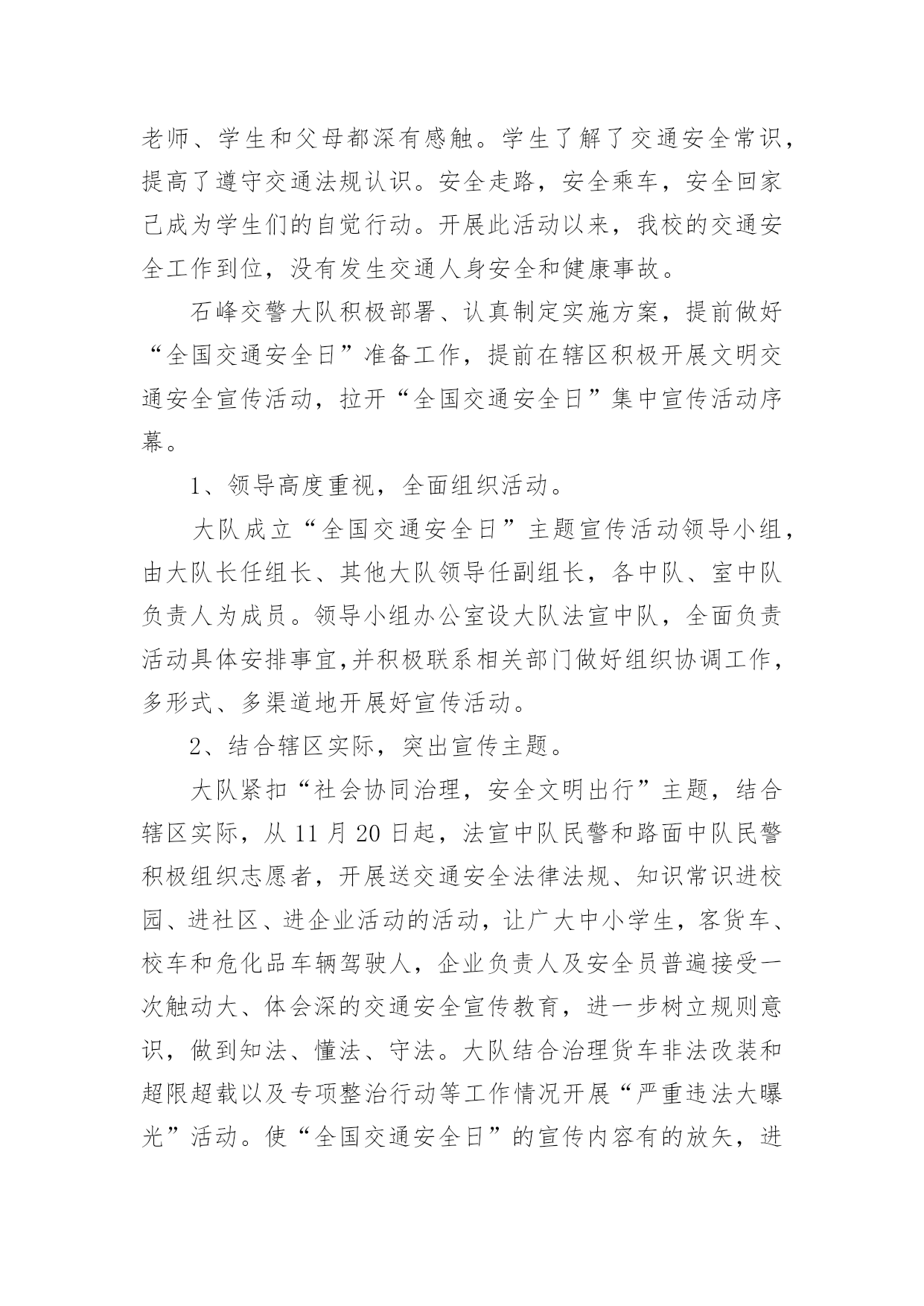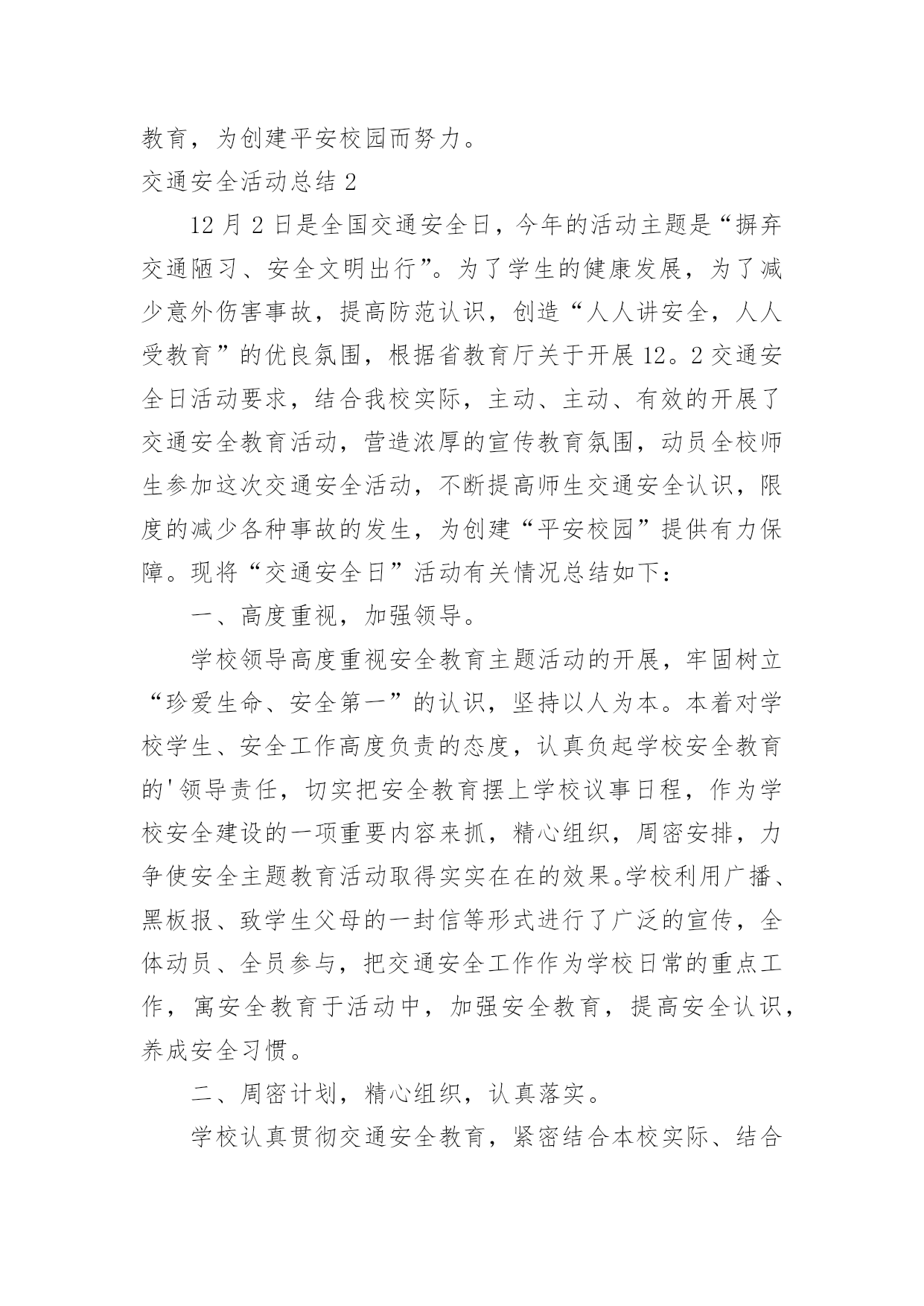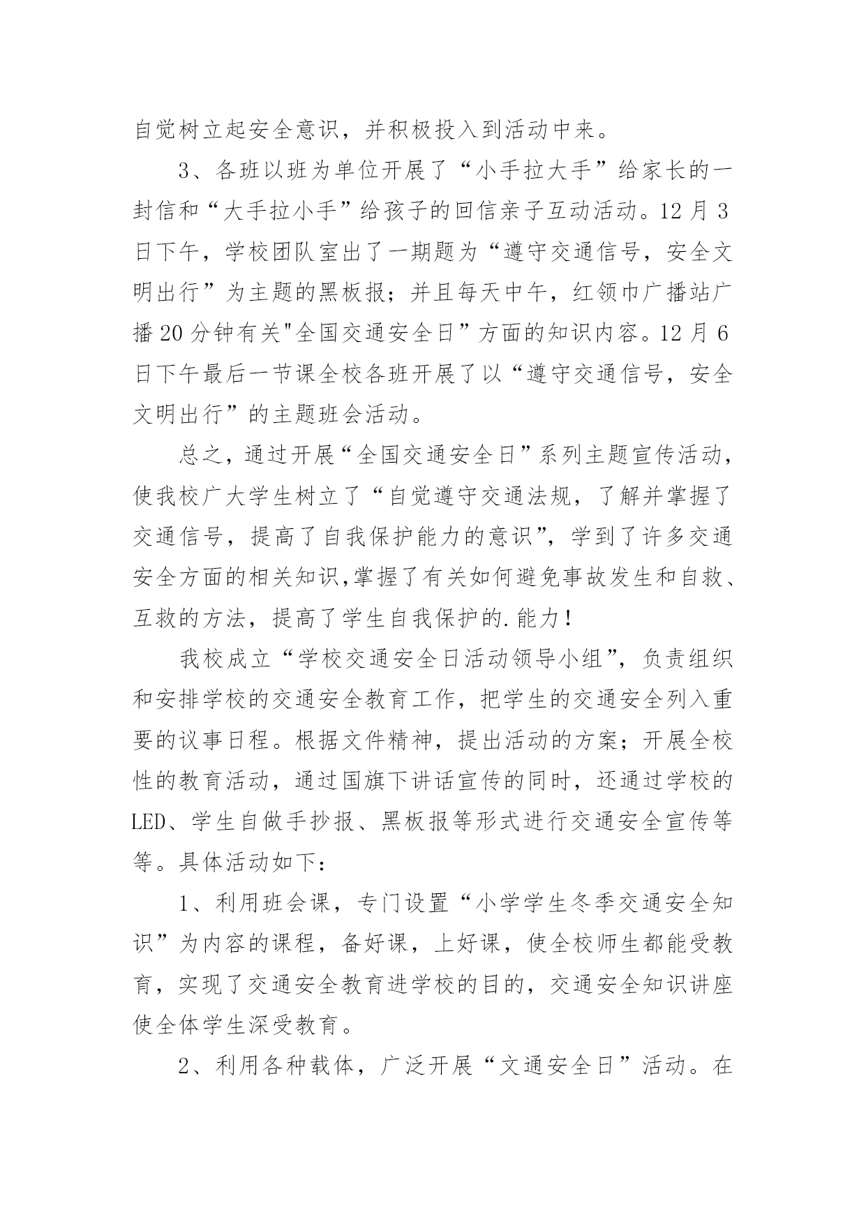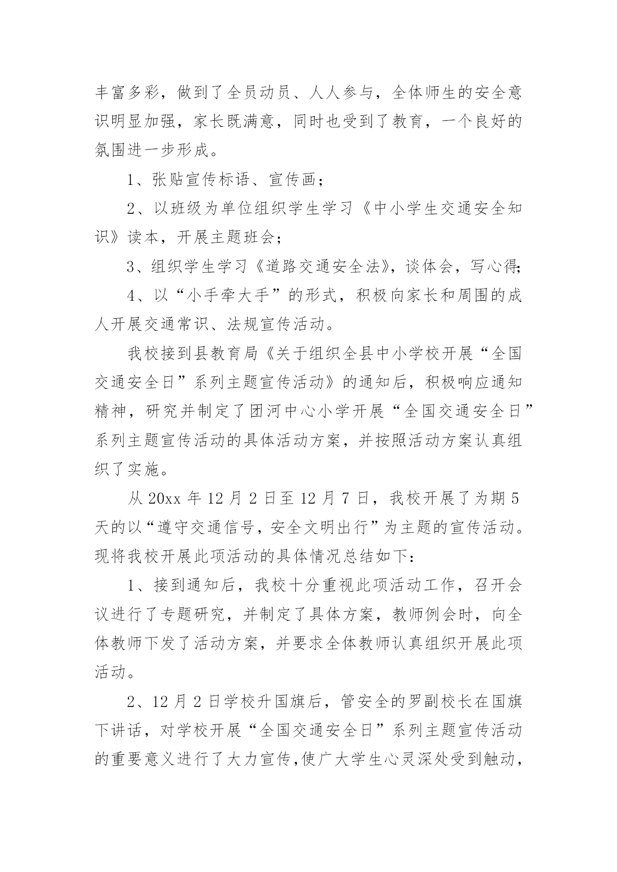 交通安全活动总结交通安全活动总结总结是事后对某一阶段的学习、工作或其完成情况加以回顾和分析的一种书面材料,它可以有效锻炼我们的语言组织能力,让我们一起认真地写一份总结吧。如何把总结做到重点突出呢?以下是小编帮大家整理的交通安全活动总结,欢迎大家分享。交通安全活动总结1为全面贯彻落实上级文件精神,我校在上级部门的指导下,立足自身,针对学校的实际,踏踏实实做好本次全国交通安全反思日教育活动,现将有关活动情况总结:一、健全机制,精心组织作为安全工作,学校把本次教育活动摆在重要议事日程。除完成常规的工作外,学校在各项工作亟待理顺的情况下,抽出时间召开班子会议,专题研究本次活动的开展。各班班主任为组员的“全国交通安全反思日”活动工作领导小组,形成了主要领导亲自抓,分管领导具体抓,其它成员落实抓的良好工作局面,为本次活动的开展打下了良好的基础。二、活动丰富,效果明显在为期一周的宣传教育中,学校开展了多项活动。内容丰富多彩,做到了全员动员、人人参与,全体师生的安全意识明显加强,家长既满意,同时也受到了教育,一个良好的氛围进一步形成。1、张贴宣传标语、宣传画;2、以班级为单位组织学生学习《中小学生交通安全知识》读本,开展主题班会;3、组织学生学习《道路交通安全法》,谈体会,写心得;4、以“小手牵大手”的形式,积极向家长和周围的成人开展交通常识、法规宣传活动。我校接到县教育局《关于组织全县中小学校开展“全国交通安全日”系列主题宣传活动》的通知后,积极响应通知精神,研究并制定了团河中心小学开展“全国交通安全日”系列主题宣传活动的具体活动方案,并按照活动方案认真组织了实施。从20xx年12月2日至12月7日,我校开展了为期5天的以“遵守交通信号,安全文明出行”为主题的宣传活动。现将我校开展此项活动的具体情况总结如下:1、接到通知后,我校十分重视此项活动工作,召开会议进行了专题研究,并制定了具体方案,教师例会时,向全体教师下发了活动方案,并要求全体教师认真组织开展此项活动。2、12月2日学校升国旗后,管安全的罗副校长在国旗下讲话,对学校开展“全国交通安全日”系列主题宣传活动的重要意义进行了大力宣传,使广大学生心灵深处受到触动,自觉树立起安全意识,并积极投入到活动中来。3、各班以班为单位开展了“小手拉大手”给家长的一封信和“大手拉小手”给孩子的回信亲子互动活动。12月3日下午,学校团队室出了一期题为“遵守交通信号,安全文明出行”为主题的黑板报;并且每天中午,红领巾广播站广播20分钟有关"全国交通安全日”方面的知识内容。12月6日下午最后一节课全校各班开展了以“遵守交通信号,安全文明出行”的主题班会活动。总之,通过开展“全国交通安全日”系列主题宣传活动,使我校广大学生树立了“自觉遵守交通法规,了解并掌握了交通信号,提高了自我保护能力的意识”,学到了许多交通安全方面的相关知识,掌握了有关如何避免事故发生和自救、互救的方法,提高了学生自我保护的.能力!我校成立“学校交通安全日活动领导小组”,负责组织和安排学校的交通安全教育工作,把学生的交通安全列入重要的议事日程。根据文件精神,提出活动的方案;开展全校性的教育活动,通过国旗下讲话宣传的同时,还通过学校的LED、学生自做手抄报、黑板报等形式进行交通安全宣传等等。具体活动如下:1、利用班会课,专门设置“小学学生冬季交通安全知识”为内容的课程,备好课,上好课,使全校师生都能受教育,实现了交通安全教育进学校的目的,交通安全知识讲座使全体学生深受教育。2、利用各种载体,广泛开展“文通安全日”活动。在学校电子屏上宣传交通安全日,各班黑板报出“交通安全专版”进行宣传;学生利用网络查看交通安全教育标语和宣传画等,学习活动取得显著成效。3、加强对学校师生各种车辆的管理,教育师生严格做到“安全行车、规范停车”,12周岁以下学生不得骑自行车等,通过教育、检查等形式制约师生遵守交通法规以及校纪校规。4、通过手抄报的形式,每个学生自做手抄报,通过手抄报来加强学生交通安全意识。5、通过发校讯通、将《致学生家长的一封信》下发至学生,这样对家长也能进行交通安全教育。要求家长配合学校对子女进行必要的走路和行车安全提醒,要严格遵守交通法规,并决不乘坐三无车辆,不乘坐指超员车辆,并要求家长接送孩子上下学或出行时遵守交通法规,保障孩子安全,这样,不仅提高了学生的交通安全意识,而且扩大到家长,规范了家长的交通行为。通过交通安全日活动的开展,交通安全意识已深入人心,老师、学生和家长都深有感触。学生了解了交通安全常识,提高了遵守交通法规意识。安全走路,安全乘车,安全骑车己成为学生们的自觉行动。可以说,我们开展的这样活动富有针对性和实效性,对学生交通安全意识得到了很大的提高。为了学生的健康发展,为了减少意外伤害事故,提高防范意识,创造“人人讲安全,人人