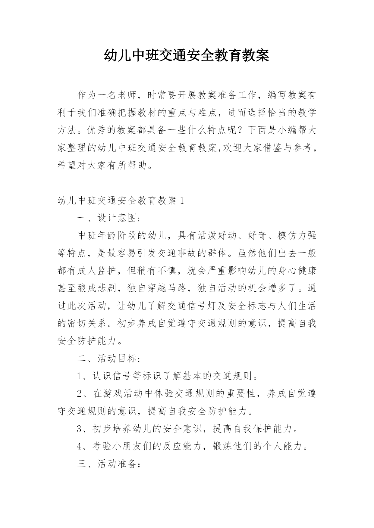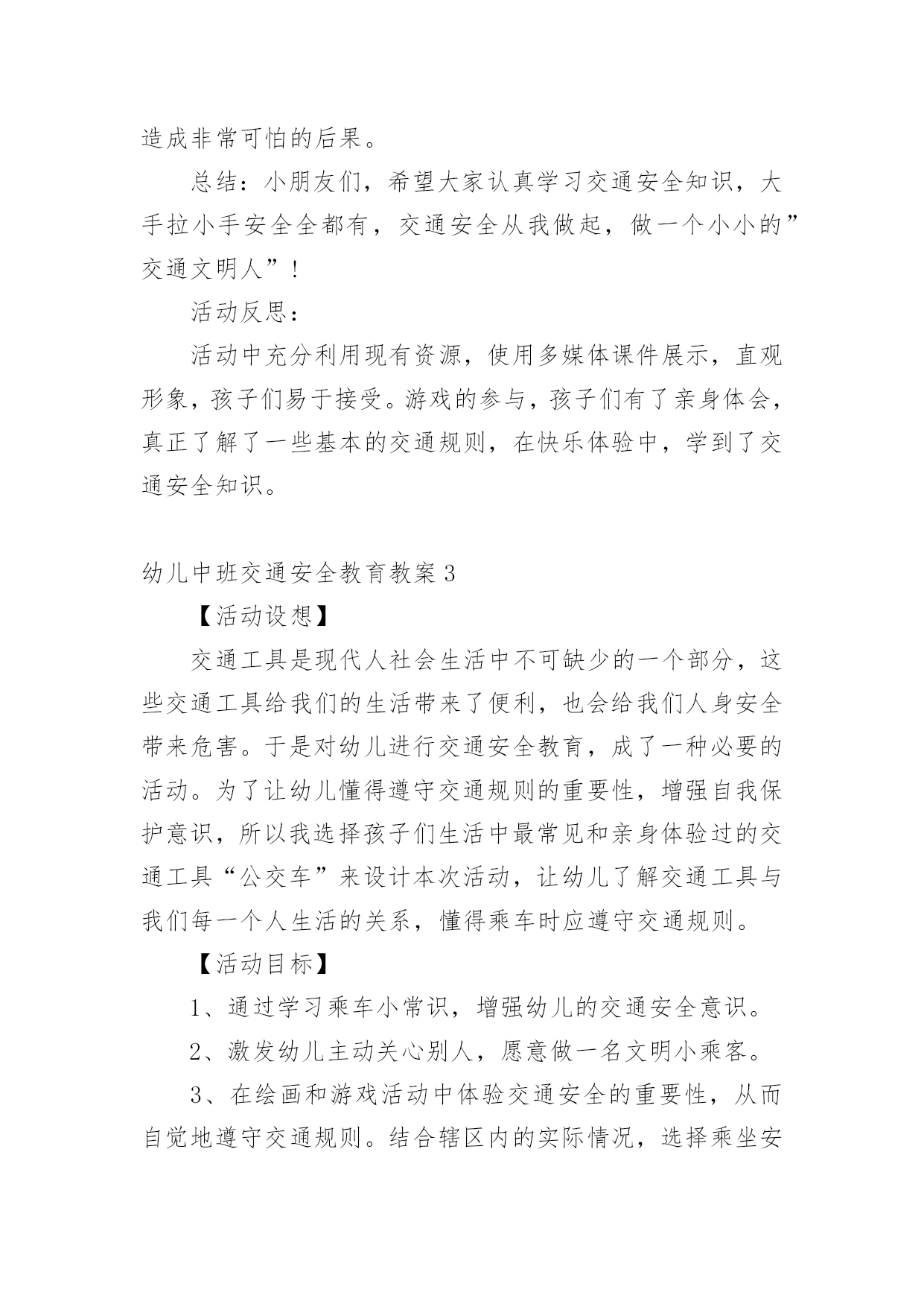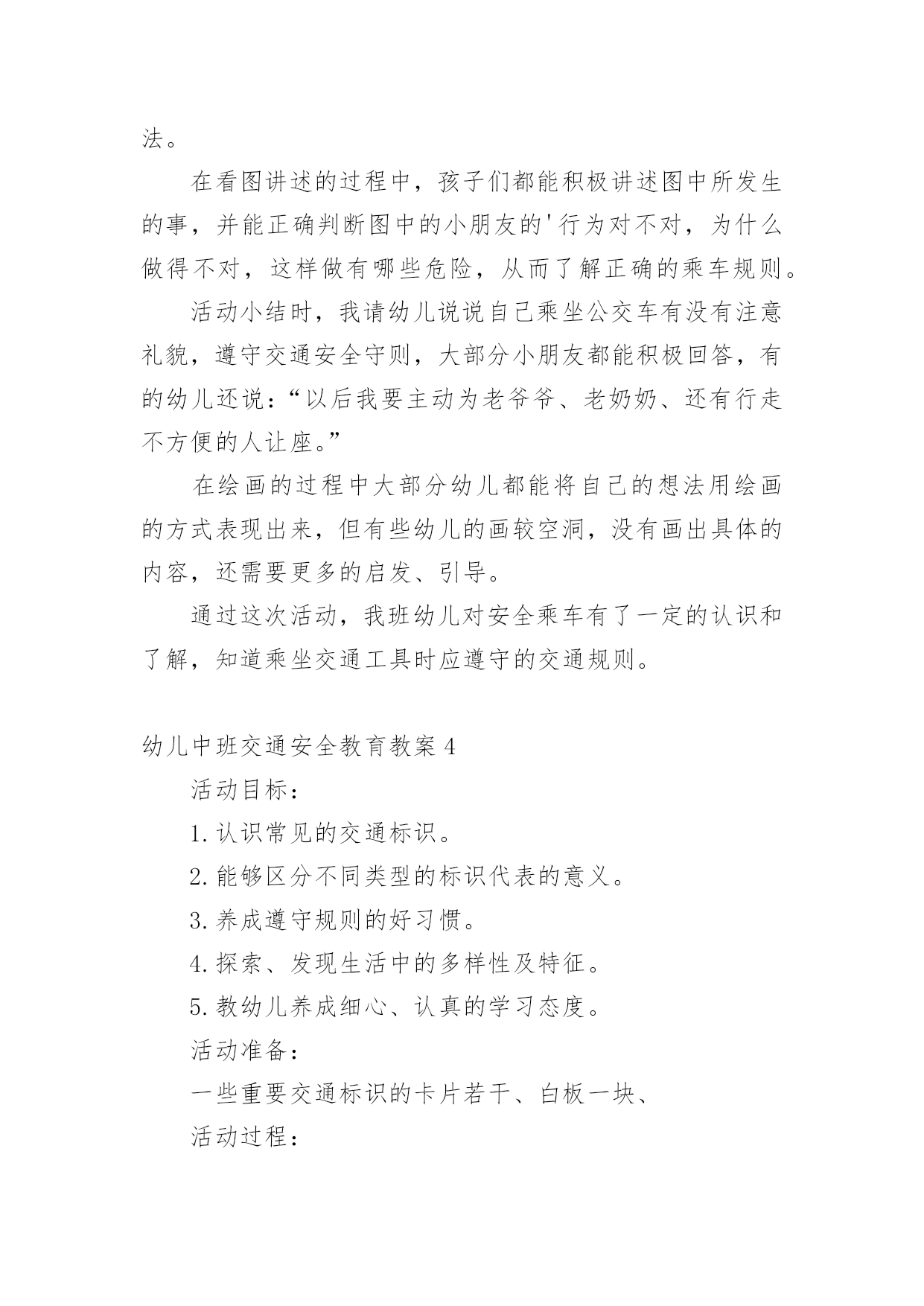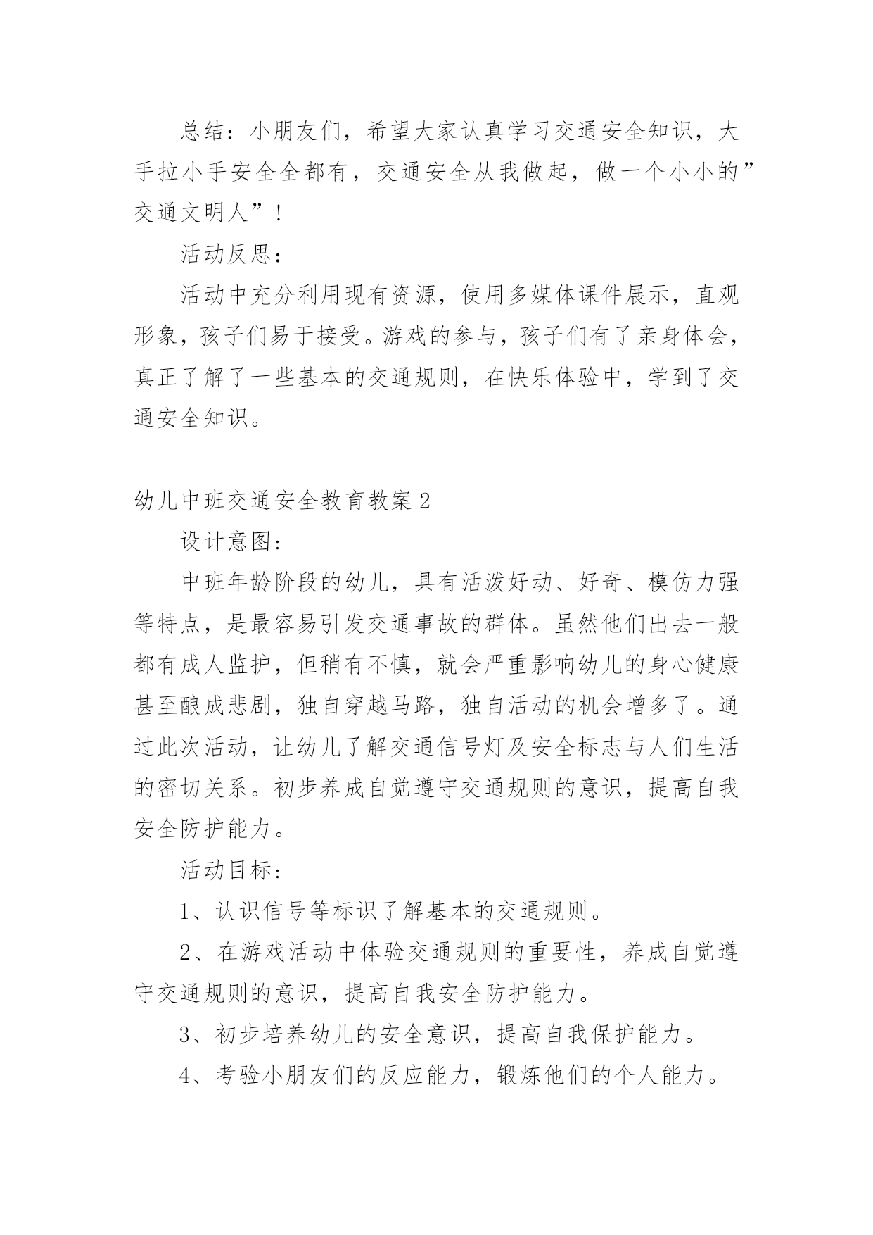 幼儿中班交通安全教育教案作为一名老师,时常要开展教案准备工作,编写教案有利于我们准确把握教材的重点与难点,进而选择恰当的教学方法。优秀的教案都具备一些什么特点呢?下面是小编帮大家整理的幼儿中班交通安全教育教案,欢迎大家借鉴与参考,希望对大家有所帮助。幼儿中班交通安全教育教案1一、设计意图:中班年龄阶段的幼儿,具有活泼好动、好奇、模仿力强等特点,是最容易引发交通事故的群体。虽然他们出去一般都有成人监护,但稍有不慎,就会严重影响幼儿的身心健康甚至酿成悲剧,独自穿越马路,独自活动的机会增多了。通过此次活动,让幼儿了解交通信号灯及安全标志与人们生活的密切关系。初步养成自觉遵守交通规则的意识,提高自我安全防护能力。二、活动目标:1、认识信号等标识了解基本的交通规则。2、在游戏活动中体验交通规则的重要性,养成自觉遵守交通规则的意识,提高自我安全防护能力。3、初步培养幼儿的安全意识,提高自我保护能力。4、考验小朋友们的反应能力,锻炼他们的个人能力。三、活动准备:PPT《交通安全伴我行》四、活动过程:(一)展开联想,揭示活动主题1、出示PPT:你会走路吗?走路,谁不会呢?其实,如果我们不注意交通安全随意的行走,走路就会闯祸哦。小朋友们在上幼儿园、回家的路上、节假日外出时走在人来车往的交通繁忙的道路上,要遵守交通规则,增强自我保护意识。让我们一起来看看有哪些交通安全小知识呢!(二)行走时要注意交通安全1、外出行走时,要在人行道内行走,如果没有人行道的,要靠边行走。2、马路上车辆密集,我们不能穿越、攀爬、倚坐道口护拦。(三)横穿马路应该注意什么横穿马路,可能遇到的危险因素会大大增加,应特别注意安全。1、穿越马路,要听从交通民警的指挥;要遵守交通规则,做到“绿灯行,红灯停”。2、穿越马路,要走人行横道线;在有过街天桥和过街地道的路段,应自觉走过街天桥和地下通道。(四)不要把马路当游乐场我们经常见到一些小朋友在马路上相互追赶着玩,这样做很危险!因为马路上来来往往的汽车速度很快,就算立即停车,由于惯性也会继续向前冲很远,很可能撞到马路上正在奔跑、玩耍的`小朋友们。提示:小朋友们千万不要在马路上追逐、踢球、滑旱冰,横冲直撞!(五)乘车怎样注意交通安全1、乘坐公共汽车:排队上车,先下后上,做懂事的小孩;在车子里,不要把头手伸出窗外,这样容易被别的车刮伤;不要坐在开动的车上看书;没有座位时,要拉好身边的扶手;不得向车内外乱扔东西;不要在开动的车厢里乱跑,容易摔跤;车里不要吃东西,尤其是冰棒和串烧。2、乘坐出租车:不要冲到马路当中去拦车,在路边招手司机叔叔也能看见;下车时要从右边下车,注意后面的车辆和行人;下车前看看坐椅上有没有东西,不要把东西忘在出租车上了;如果下车要穿过马路,走到出租车后面比前面更安全。3、乘坐父母开的车:不要提问题和唱歌,不要去开车门,乖乖地在后排坐好,系好安全带,父母就可以安心地开车了;如果坐前排,不要扳动方向盘、排档杆,很容易造成事故;更不能在车厢里放带尖角的玩具,容易造成伤害。(六)不要扒车、追车、抛物击车不要因为好玩,就去追赶行驶中的车辆,要是撞上行人、电线杆或电话亭等物体,会伤的不轻。如果扒着车,跟着车跑,车辆突然停下来,还有可能直接被车辆撞倒。另外,汽车在高速行驶时,撞上飞来的物体,冲击力非常大,往往会造成非常可怕的后果。总结:小朋友们,希望大家认真学习交通安全知识,大手拉小手安全全都有,交通安全从我做起,做一个小小的”交通文明人”!活动反思:活动中充分利用现有资源,使用多媒体课件展示,直观形象,孩子们易于接受。游戏的参与,孩子们有了亲身体会,真正了解了一些基本的交通规则,在快乐体验中,学到了交通安全知识。幼儿中班交通安全教育教案2设计意图:中班年龄阶段的幼儿,具有活泼好动、好奇、模仿力强等特点,是最容易引发交通事故的群体。虽然他们出去一般都有成人监护,但稍有不慎,就会严重影响幼儿的身心健康甚至酿成悲剧,独自穿越马路,独自活动的机会增多了。通过此次活动,让幼儿了解交通信号灯及安全标志与人们生活的密切关系。初步养成自觉遵守交通规则的意识,提高自我安全防护能力。活动目标:1、认识信号等标识了解基本的交通规则。2、在游戏活动中体验交通规则的重要性,养成自觉遵守交通规则的意识,提高自我安全防护能力。3、初步培养幼儿的安全意识,提高自我保护能力。4、考验小朋友们的反应能力,锻炼他们的个人能力。活动准备:1、PPT《交通安全伴我行》活动过程:一、展开联想,揭示活动主题1、出示PPT:你会走路吗?走路,谁不会呢?其实,如果我们不注意交通安全随意的行走,走路就会闯祸哦。小朋友们在上幼儿园、回家的路上、节假日外出时走在人来车往的交通繁忙的道路上,要遵守交通规则,增强自我保护意识。让我们一起来看看有哪些交通安全小知识呢!一、行走时要注意交通安
