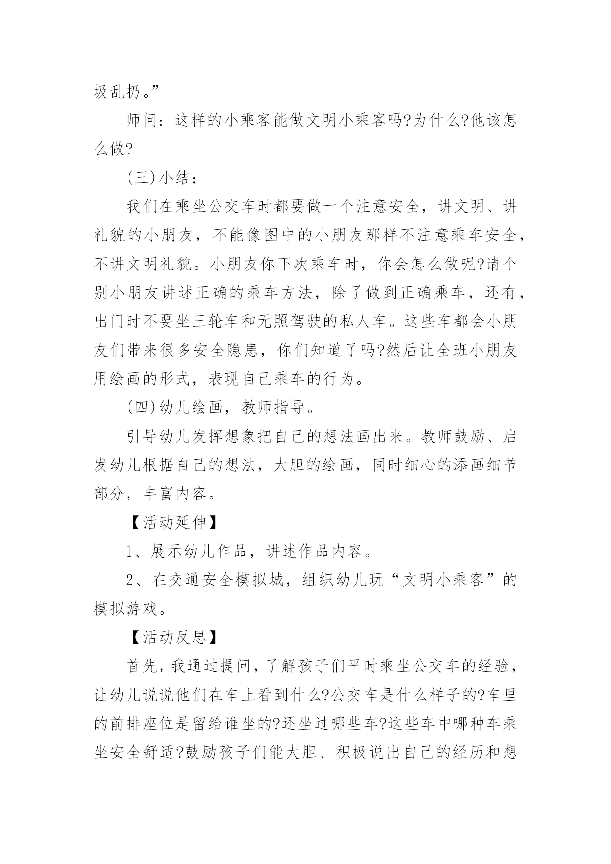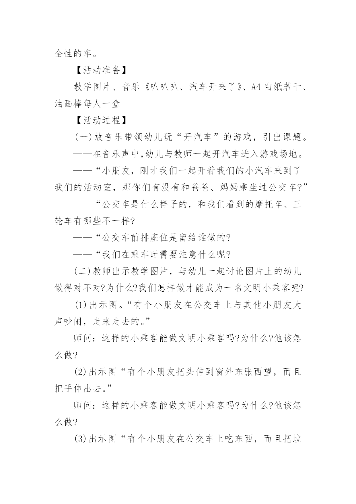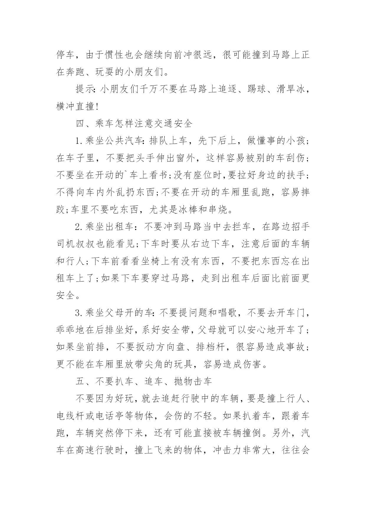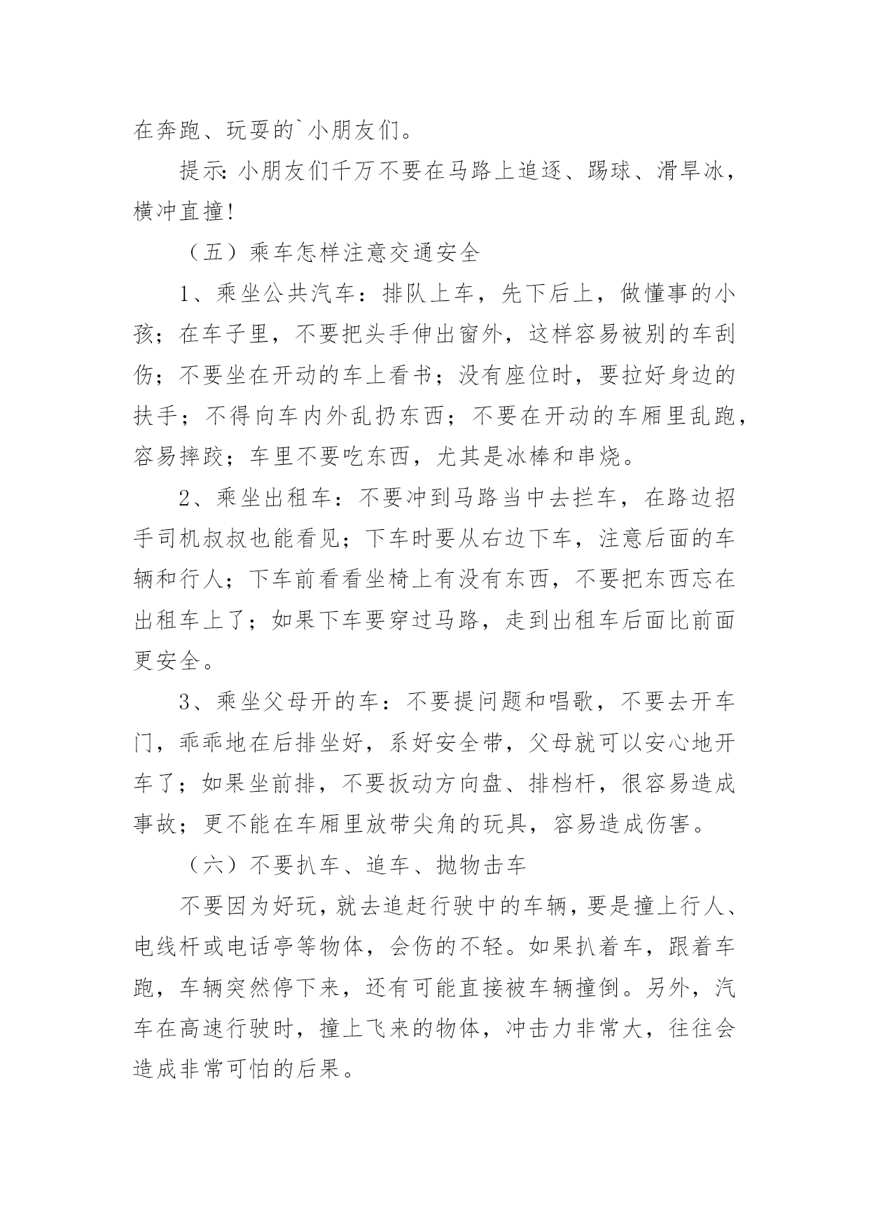 幼儿中班交通安全教育教案作为一名老师,时常要开展教案准备工作,编写教案有利于我们准确把握教材的重点与难点,进而选择恰当的教学方法。优秀的教案都具备一些什么特点呢?下面是小编帮大家整理的幼儿中班交通安全教育教案,欢迎大家借鉴与参考,希望对大家有所帮助。幼儿中班交通安全教育教案1一、设计意图:中班年龄阶段的幼儿,具有活泼好动、好奇、模仿力强等特点,是最容易引发交通事故的群体。虽然他们出去一般都有成人监护,但稍有不慎,就会严重影响幼儿的身心健康甚至酿成悲剧,独自穿越马路,独自活动的机会增多了。通过此次活动,让幼儿了解交通信号灯及安全标志与人们生活的密切关系。初步养成自觉遵守交通规则的意识,提高自我安全防护能力。二、活动目标:1、认识信号等标识了解基本的交通规则。2、在游戏活动中体验交通规则的重要性,养成自觉遵守交通规则的意识,提高自我安全防护能力。3、初步培养幼儿的安全意识,提高自我保护能力。4、考验小朋友们的反应能力,锻炼他们的个人能力。三、活动准备:PPT《交通安全伴我行》四、活动过程:(一)展开联想,揭示活动主题1、出示PPT:你会走路吗?走路,谁不会呢?其实,如果我们不注意交通安全随意的行走,走路就会闯祸哦。小朋友们在上幼儿园、回家的路上、节假日外出时走在人来车往的交通繁忙的道路上,要遵守交通规则,增强自我保护意识。让我们一起来看看有哪些交通安全小知识呢!(二)行走时要注意交通安全1、外出行走时,要在人行道内行走,如果没有人行道的,要靠边行走。2、马路上车辆密集,我们不能穿越、攀爬、倚坐道口护拦。(三)横穿马路应该注意什么横穿马路,可能遇到的危险因素会大大增加,应特别注意安全。1、穿越马路,要听从交通民警的指挥;要遵守交通规则,做到“绿灯行,红灯停”。2、穿越马路,要走人行横道线;在有过街天桥和过街地道的路段,应自觉走过街天桥和地下通道。(四)不要把马路当游乐场我们经常见到一些小朋友在马路上相互追赶着玩,这样做很危险!因为马路上来来往往的汽车速度很快,就算立即停车,由于惯性也会继续向前冲很远,很可能撞到马路上正在奔跑、玩耍的`小朋友们。提示:小朋友们千万不要在马路上追逐、踢球、滑旱冰,横冲直撞!(五)乘车怎样注意交通安全1、乘坐公共汽车:排队上车,先下后上,做懂事的小孩;在车子里,不要把头手伸出窗外,这样容易被别的车刮伤;不要坐在开动的车上看书;没有座位时,要拉好身边的扶手;不得向车内外乱扔东西;不要在开动的车厢里乱跑,容易摔跤;车里不要吃东西,尤其是冰棒和串烧。2、乘坐出租车:不要冲到马路当中去拦车,在路边招手司机叔叔也能看见;下车时要从右边下车,注意后面的车辆和行人;下车前看看坐椅上有没有东西,不要把东西忘在出租车上了;如果下车要穿过马路,走到出租车后面比前面更安全。3、乘坐父母开的车:不要提问题和唱歌,不要去开车门,乖乖地在后排坐好,系好安全带,父母就可以安心地开车了;如果坐前排,不要扳动方向盘、排档杆,很容易造成事故;更不能在车厢里放带尖角的玩具,容易造成伤害。(六)不要扒车、追车、抛物击车不要因为好玩,就去追赶行驶中的车辆,要是撞上行人、电线杆或电话亭等物体,会伤的不轻。如果扒着车,跟着车跑,车辆突然停下来,还有可能直接被车辆撞倒。另外,汽车在高速行驶时,撞上飞来的物体,冲击力非常大,往往会造成非常可怕的后果。总结:小朋友们,希望大家认真学习交通安全知识,大手拉小手安全全都有,交通安全从我做起,做一个小小的”交通文明人”!活动反思:活动中充分利用现有资源,使用多媒体课件展示,直观形象,孩子们易于接受。游戏的参与,孩子们有了亲身体会,真正了解了一些基本的交通规则,在快乐体验中,学到了交通安全知识。幼儿中班交通安全教育教案2设计意图:中班年龄阶段的幼儿,具有活泼好动、好奇、模仿力强等特点,是最容易引发交通事故的群体。虽然他们出去一般都有成人监护,但稍有不慎,就会严重影响幼儿的身心健康甚至酿成悲剧,独自穿越马路,独自活动的机会增多了。通过此次活动,让幼儿了解交通信号灯及安全标志与人们生活的密切关系。初步养成自觉遵守交通规则的意识,提高自我安全防护能力。活动目标:1、认识信号等标识了解基本的交通规则。2、在游戏活动中体验交通规则的重要性,养成自觉遵守交通规则的意识,提高自我安全防护能力。3、初步培养幼儿的安全意识,提高自我保护能力。4、考验小朋友们的反应能力,锻炼他们的个人能力。活动准备:1、PPT《交通安全伴我行》活动过程:一、展开联想,揭示活动主题1、出示PPT:你会走路吗?走路,谁不会呢?其实,如果我们不注意交通安全随意的行走,走路就会闯祸哦。小朋友们在上幼儿园、回家的路上、节假日外出时走在人来车往的交通繁忙的道路上,要遵守交通规则,增强自我保护意识。让我们一起来看看有哪些交通安全小知识呢!一、行走时要注意交通安