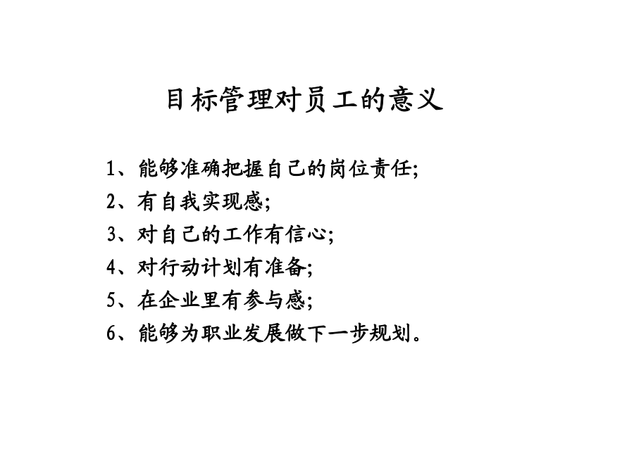 目标管理讲义柯维语录:在你攀越顶峰之前,你必须先具有攀越的意念。目标管理的两个关键人物一、彼得·德鲁克二、E·A·洛克MBO是一个基于效果的绩效管理技术。MBO制度是根据个人的成就而不是工作方法来进行考核。运用MBO进行绩效管理有两个重要步骤:第一步是制定目标,第二步是绩效检查。在MBO的目标制定阶段,每个个人同他的直接上级讨论下一个阶段(通常是1年)的计划,商定绩效目标。在MBO的第二个绩效检查阶段,管理人员和其下级一起讨论下级在完成目标方面取得的进展,根据在最初的目标制定协商中确定的具体目标对下级的绩效进行考核和评价。目标制定的步骤第一步:上级向其下级说明企业和个人的目标第二步:下级草拟自己的目标1、目标必须有助于达到企业目标2、目标必须选自主要的成就领域第三步:下级和上级一起讨论目标。1、目标必须为目标声明规定标准2、目标必须具有挑战性并可以达到第四步:决定目标的先后顺序第五步:明确绩效标准目标管理对上级的意义1、确保预先知道下级要做的事;2、能够放手某些事;3、能够比较容易地制订工作计划;4、能够和下级相互谅解;5、能够向上级作具体的汇报;6、能够公正和准确地考核下属业绩;7、能够培养人才;8、能够调动员工的积极性;9、能够给予下属有效的指导和具体的改进建议;10、能够比较容易衡量绩效、目标、效果间的差距;11、能够确保企业目标的层层落实和实现。目标管理对员工的意义1、能够准确把握自己的岗位责任;2、有自我实现感;3、对自己的工作有信心;4、对行动计划有准备;5、在企业里有参与感;6、能够为职业发展做下一步规划。适当可行的目标的标准1、一种可衡量的结果,而不是一项工作;2、详细说明现在情况和“目标”所要达成的情况;3、时限,包括固定最后期限和可调整(因情况而变)的最后期限;4、应该是对某项主要职责具有重要影响的;5、应该是困难的,但非达不到的。经理人员目标核对表1、目标是否概括了该职位的主要特点?2、目标数量多不多?能否把某些目标合并?3、目标是否具有考核性?人们能否知道他是否完成了目标?’4、目标是否指明了:(1)数量(多少)?(2)质量(多好,及具体要求)?(3)时间(何时)?(4)费用(消耗多少)?(5)如果是定性的目标,可否考核?5、目标是否提出了挑战?是否现实可行?6、是否规定了目标的先后顺序?7、这套目标是否还包括:(l)改进工作的目标?(2)个人发展的目标?8、这些目标是否与其他经理和组织的目标相协调?是否与上级主管人员、部门和公司的目标相吻合?9、这些目标是否已经传达给所有需要知道的人?10、短期计划与长期计划是否相吻合?11、据以拟订目标的一些设想是否都明确地指明了?12、这些目标是否清楚地用文字表达了?13、目标是否能够适时地提供反馈信息?有否纠正的手段?14、现有的资源和职权是否足以实现这些目标?15、是否提供了实现目标的机会?目标管理的基本环节目标管理的操作定义目标管理,也定义为绩效管理,是指公司各层管理人员与下属员工,务必在设立的目标和目标达成度衡量指标等方面达成共识,通过计划、辅导、评价、报酬四个环节激励员工实现目标,推动实现部门、公司目标。事前的、计划式的目标承诺与事后的结果认可,是目标管理的起点与终结,注重过程管理,循环推进,重视双向沟通与共识的达成,并以共识作为评价激励的操作基础。将目标管理理念与手段,转化为管理工具。计划环节计划:是根据公司发展战略及经营计划,为下属制定富有挑战性的、切实可行的长期、短期目标和工作标准,协助下属规化他们在计划期内的行为。计划的重要手段:KPI技术凡事预则立,不预则废KPI技术1、KPI(关键业绩指标体系):是支持公司发展战略的、以责任成果为导向的目标式量化管理体系。2、目的:不断强化、提升公司的核心竞争力;传递市场压力,使管理聚焦,责任到位,成果明确;强化团队合作;代表公司经营管理的预警系统,注意事前、事中控制,以及对结果的客观评价;通过KPI体系的建立,激励约束员工的行为,为价值评价与价值分配提供依据.KPI类型1、面向流程的KPI体系案例:上海号薄公司(中国黄页)数据管理流程、财务管理流程、广告销售与发行流程、人力资源效率2、面向目标的KPI体系案例:中国诚通以“目前必须解决的重大问题”为KPI组织增幅、人均创利、成本控制3、面向企业系统能力的KPI体系案例:山东六合公司从系统的角度以“支持公司可持续发展的要素”为KPI客户拥有率、毛利率、示范户增长率、销量增长率、可比成本降低率KPI的设计程序KPI的“黑箱”设计思想KPI