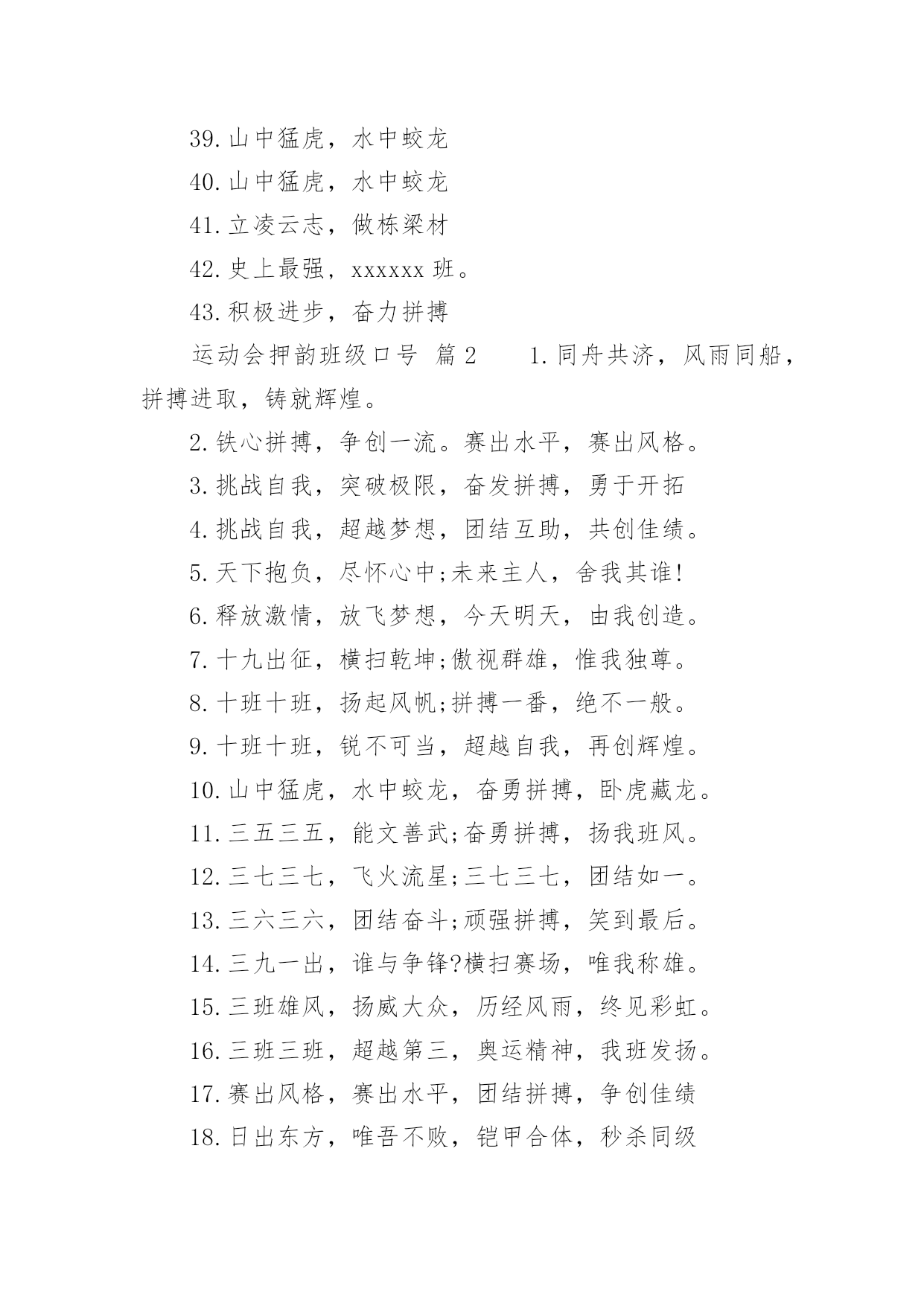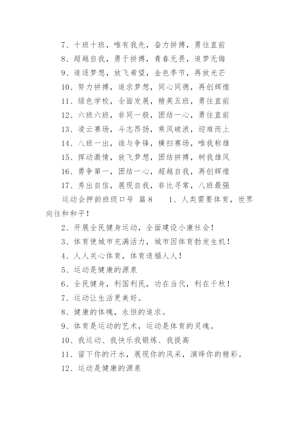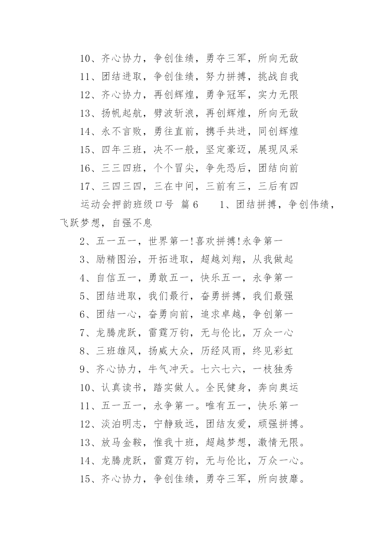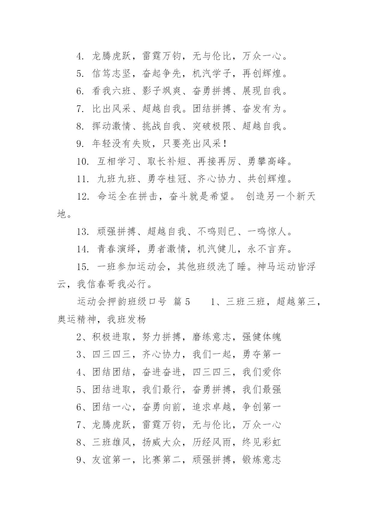 运动会押韵班级口号运动会押韵班级口号(通用15篇)在生活、工作和学习中,大家最不陌生的就是口号了吧,口号一般都用一两句完整的句子来表现一个信息或一个观念,信息单一,容易理解,没有过多的信息需要受众用心记忆和用心理解。究竟什么样的口号才是好的口号呢?以下是小编整理的运动会押韵班级口号,仅供参考,希望能够帮助到大家。运动会押韵班级口号篇11.横扫赛场,唯我称雄。2.龙腾虎跃,雷霆万钧3.秀你自信,展现自我4.非比寻常,xx班最强。5.xx班一出,谁与争锋6.勇夺三军,所向披靡。7.扬长避短,必定成才8.奋勇冲击,永争第一。9.团结拼搏,展现自我10.释放激情,放飞梦想11.力挫群雄,舍我其谁。12.耕耘今天,收获明天13.齐心协力,争创佳绩14.扬帆起航,劈波斩浪15.xx班一出,谁与争锋。16.今天明天,由我创造。17.放飞梦想,创造辉煌。18.刻苦学习,团结一心19.兴我中华,爱我x班20.积极进取,努力拼搏21.奋勇拼搏,披荆斩棘。22.团结一心,奋勇向前23.追求卓越,争创第一。24.莫放松点,莫轻视微25.亲密五班,合作无间26.无与伦比,万众一心。27.英明神武,勇冠江山28.爱我季延,立志成材29.慎而思之,勤而行之30.无与伦比,万众一心。31.龙腾虎跃,雷霆万钧32.天道酬勤,宁静致远33.磨炼意志,奋发冲刺34.奋勇拼搏,永创辉煌。35.磨练意志,强健体魄36.xxxxxx班,卧虎藏龙。37.青春似火,超越自我38.锻炼意志,强身健体。39.山中猛虎,水中蛟龙40.山中猛虎,水中蛟龙41.立凌云志,做栋梁材42.史上最强,xxxxxx班。43.积极进步,奋力拼搏运动会押韵班级口号篇21.同舟共济,风雨同船,拼搏进取,铸就辉煌。2.铁心拼搏,争创一流。赛出水平,赛出风格。3.挑战自我,突破极限,奋发拼搏,勇于开拓4.挑战自我,超越梦想,团结互助,共创佳绩。5.天下抱负,尽怀心中;未来主人,舍我其谁!6.释放激情,放飞梦想,今天明天,由我创造。7.十九出征,横扫乾坤;傲视群雄,惟我独尊。8.十班十班,扬起风帆;拼搏一番,绝不一般。9.十班十班,锐不可当,超越自我,再创辉煌。10.山中猛虎,水中蛟龙,奋勇拼搏,卧虎藏龙。11.三五三五,能文善武;奋勇拼搏,扬我班风。12.三七三七,飞火流星;三七三七,团结如一。13.三六三六,团结奋斗;顽强拼搏,笑到最后。14.三九一出,谁与争锋?横扫赛场,唯我称雄。15.三班雄风,扬威大众,历经风雨,终见彩虹。16.三班三班,超越第三,奥运精神,我班发扬。17.赛出风格,赛出水平,团结拼搏,争创佳绩18.日出东方,唯吾不败,铠甲合体,秒杀同级19.认真读书,踏实做人,全民健身,奔向奥运。20.全民健身,利国利民,功在当代,利在千秋!运动会押韵班级口号篇31.发型到位,气质高贵。我们呐喊,二班万岁。2.这是意志的拼搏。这是速度的挑战。胜利在向你们招手,胜利在向你们呼唤3.把青春合美好都留美丽的母校,为你添彩,为你骄傲。4.和自己比赛。为了明天,超越今天,我们最愉快!5.五班五班,我是五班。再说一遍,我是五班。6.九班九班,法力无边。来我九班,早日成仙。7.发展体育运动,增强人民体质!8.挑战运动极限,演绎健美人生!9.锻炼身体增强体质,报效祖国,造福人类!10.人人关心体育,体育造福人人!11.运动场上,激情飞扬。12.扬帆把舵,奋勇拼搏13.怀学生心,做最强人14.顽强拼搏,赛出风格!15.遵规守纪,团结互敬。运动会押韵班级口号篇41.人文人文,不学伦敦,全家和亲,百姓新闻。2.文者称雄,武者称霸,高三x班,雄霸一中。3.扬帆起航,劈波开浪,xx班出马,谁敢争锋。4.龙腾虎跃,雷霆万钧,无与伦比,万众一心。5.信笃志坚,奋起争先,机汽学子,再创辉煌。6.看我六班、影子飒爽、奋勇拼搏、展现自我。7.比出风采、超越自我。团结拼搏、奋发有为。8.挥动激情、挑战自我、突破极限、超越自我。9.年轻没有失败,只要亮出风采!10.互相学习、取长补短、再接再厉、勇攀高峰。11.九班九班、勇夺桂冠、齐心协力、共创辉煌。12.命运全在拼击,奋斗就是希望。创造另一个新天地。13.顽强拼搏、超越自我、不鸣则已、一鸣惊人。14.青春演绎,勇者激情,机汽健儿,永不言弃。15.一班参加运动会,其他班级洗了睡。神马运动皆浮云,我信春哥我必行。运动会押韵班级口号篇51、三班三班,超越第三,奥运精神,我班发杨2、积极进取,努力拼搏,磨练意志,强健体魄3、四三四三,齐心协力,我们一起,勇夺第一4、团结团结,奋进奋进,四三四三,我们爱你5、团结进取,我们最行,奋勇拼搏,我们最强6、团结一心,奋勇向前,追求卓越,争创第一7、龙腾虎跃,雷霆万钧,无与伦比,万众一心8、三班雄风,扬威大众,历经风雨,终见彩虹9、友谊第一,比