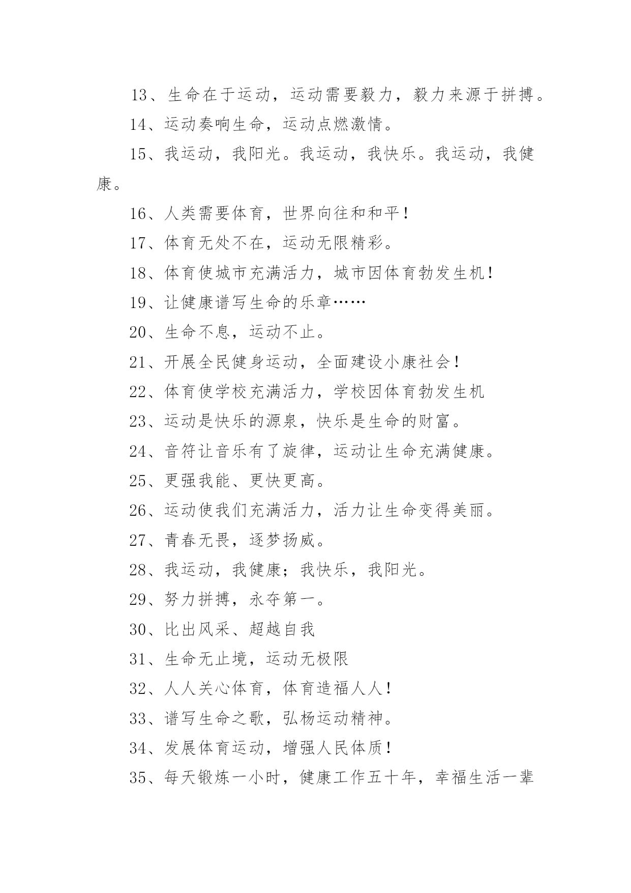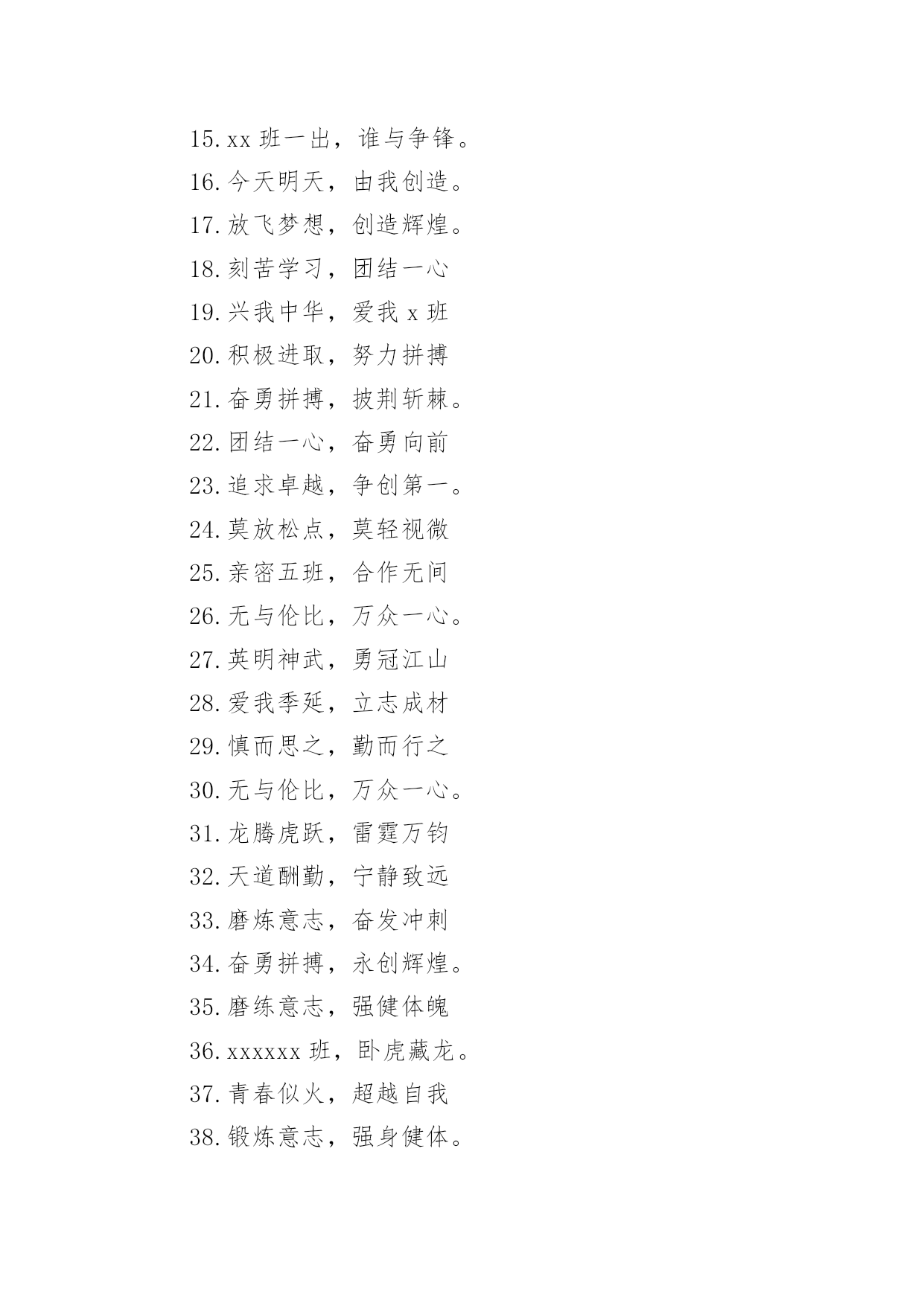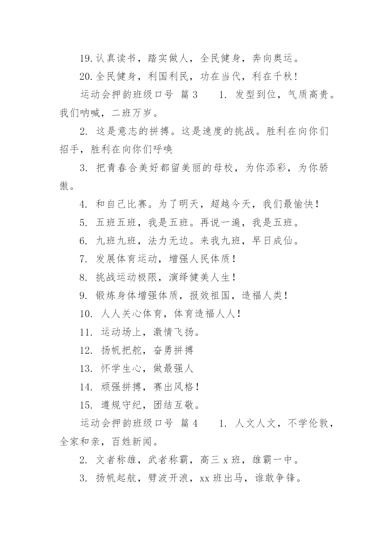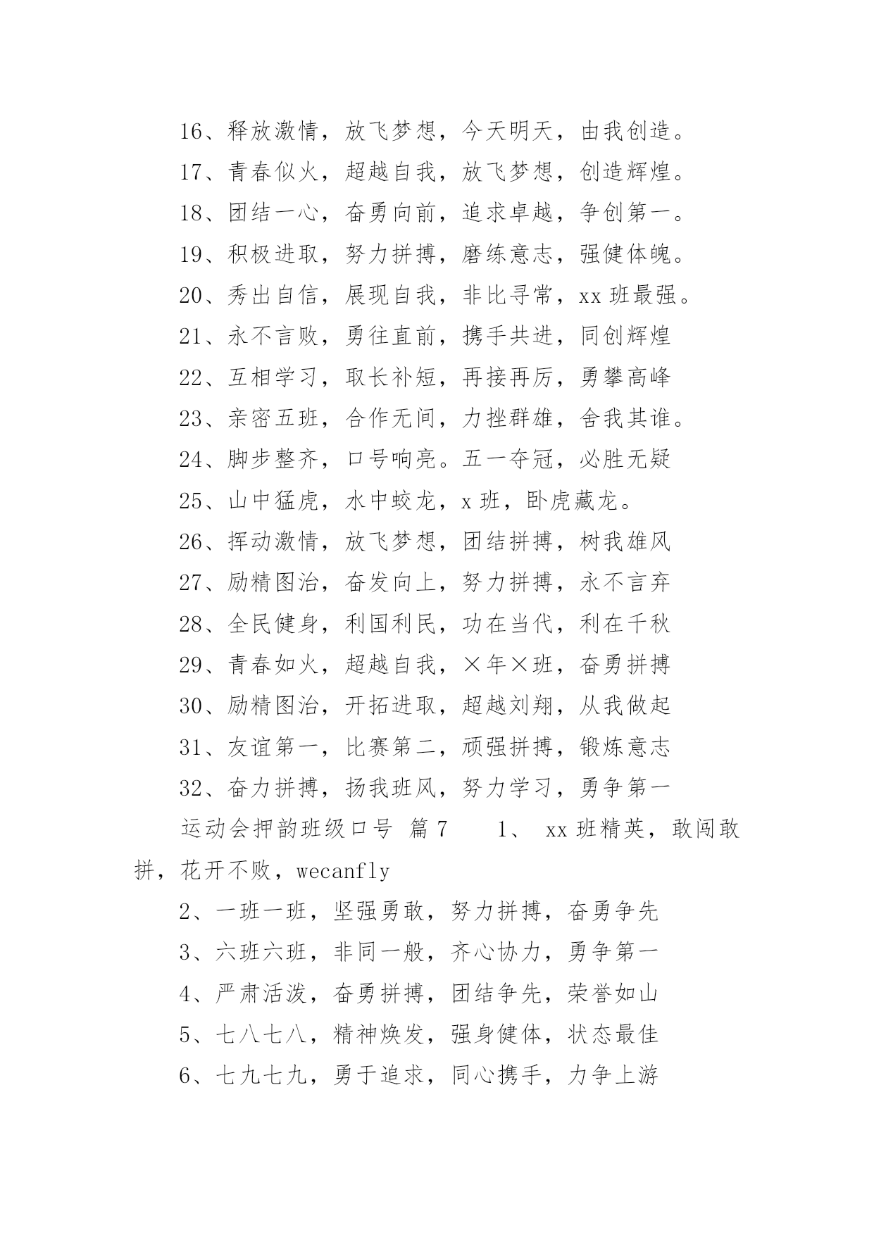 运动会押韵班级口号运动会押韵班级口号(通用15篇)在生活、工作和学习中,大家最不陌生的就是口号了吧,口号一般都用一两句完整的句子来表现一个信息或一个观念,信息单一,容易理解,没有过多的信息需要受众用心记忆和用心理解。究竟什么样的口号才是好的口号呢?以下是小编整理的运动会押韵班级口号,仅供参考,希望能够帮助到大家。运动会押韵班级口号篇11.横扫赛场,唯我称雄。2.龙腾虎跃,雷霆万钧3.秀你自信,展现自我4.非比寻常,xx班最强。5.xx班一出,谁与争锋6.勇夺三军,所向披靡。7.扬长避短,必定成才8.奋勇冲击,永争第一。9.团结拼搏,展现自我10.释放激情,放飞梦想11.力挫群雄,舍我其谁。12.耕耘今天,收获明天13.齐心协力,争创佳绩14.扬帆起航,劈波斩浪15.xx班一出,谁与争锋。16.今天明天,由我创造。17.放飞梦想,创造辉煌。18.刻苦学习,团结一心19.兴我中华,爱我x班20.积极进取,努力拼搏21.奋勇拼搏,披荆斩棘。22.团结一心,奋勇向前23.追求卓越,争创第一。24.莫放松点,莫轻视微25.亲密五班,合作无间26.无与伦比,万众一心。27.英明神武,勇冠江山28.爱我季延,立志成材29.慎而思之,勤而行之30.无与伦比,万众一心。31.龙腾虎跃,雷霆万钧32.天道酬勤,宁静致远33.磨炼意志,奋发冲刺34.奋勇拼搏,永创辉煌。35.磨练意志,强健体魄36.xxxxxx班,卧虎藏龙。37.青春似火,超越自我38.锻炼意志,强身健体。39.山中猛虎,水中蛟龙40.山中猛虎,水中蛟龙41.立凌云志,做栋梁材42.史上最强,xxxxxx班。43.积极进步,奋力拼搏运动会押韵班级口号篇21.同舟共济,风雨同船,拼搏进取,铸就辉煌。2.铁心拼搏,争创一流。赛出水平,赛出风格。3.挑战自我,突破极限,奋发拼搏,勇于开拓4.挑战自我,超越梦想,团结互助,共创佳绩。5.天下抱负,尽怀心中;未来主人,舍我其谁!6.释放激情,放飞梦想,今天明天,由我创造。7.十九出征,横扫乾坤;傲视群雄,惟我独尊。8.十班十班,扬起风帆;拼搏一番,绝不一般。9.十班十班,锐不可当,超越自我,再创辉煌。10.山中猛虎,水中蛟龙,奋勇拼搏,卧虎藏龙。11.三五三五,能文善武;奋勇拼搏,扬我班风。12.三七三七,飞火流星;三七三七,团结如一。13.三六三六,团结奋斗;顽强拼搏,笑到最后。14.三九一出,谁与争锋?横扫赛场,唯我称雄。15.三班雄风,扬威大众,历经风雨,终见彩虹。16.三班三班,超越第三,奥运精神,我班发扬。17.赛出风格,赛出水平,团结拼搏,争创佳绩18.日出东方,唯吾不败,铠甲合体,秒杀同级19.认真读书,踏实做人,全民健身,奔向奥运。20.全民健身,利国利民,功在当代,利在千秋!运动会押韵班级口号篇31.发型到位,气质高贵。我们呐喊,二班万岁。2.这是意志的拼搏。这是速度的挑战。胜利在向你们招手,胜利在向你们呼唤3.把青春合美好都留美丽的母校,为你添彩,为你骄傲。4.和自己比赛。为了明天,超越今天,我们最愉快!5.五班五班,我是五班。再说一遍,我是五班。6.九班九班,法力无边。来我九班,早日成仙。7.发展体育运动,增强人民体质!8.挑战运动极限,演绎健美人生!9.锻炼身体增强体质,报效祖国,造福人类!10.人人关心体育,体育造福人人!11.运动场上,激情飞扬。12.扬帆把舵,奋勇拼搏13.怀学生心,做最强人14.顽强拼搏,赛出风格!15.遵规守纪,团结互敬。运动会押韵班级口号篇41.人文人文,不学伦敦,全家和亲,百姓新闻。2.文者称雄,武者称霸,高三x班,雄霸一中。3.扬帆起航,劈波开浪,xx班出马,谁敢争锋。4.龙腾虎跃,雷霆万钧,无与伦比,万众一心。5.信笃志坚,奋起争先,机汽学子,再创辉煌。6.看我六班、影子飒爽、奋勇拼搏、展现自我。7.比出风采、超越自我。团结拼搏、奋发有为。8.挥动激情、挑战自我、突破极限、超越自我。9.年轻没有失败,只要亮出风采!10.互相学习、取长补短、再接再厉、勇攀高峰。11.九班九班、勇夺桂冠、齐心协力、共创辉煌。12.命运全在拼击,奋斗就是希望。创造另一个新天地。13.顽强拼搏、超越自我、不鸣则已、一鸣惊人。14.青春演绎,勇者激情,机汽健儿,永不言弃。15.一班参加运动会,其他班级洗了睡。神马运动皆浮云,我信春哥我必行。运动会押韵班级口号篇51、三班三班,超越第三,奥运精神,我班发杨2、积极进取,努力拼搏,磨练意志,强健体魄3、四三四三,齐心协力,我们一起,勇夺第一4、团结团结,奋进奋进,四三四三,我们爱你5、团结进取,我们最行,奋勇拼搏,我们最强6、团结一心,奋勇向前,追求卓越,争创第一7、龙腾虎跃,雷霆万钧,无与伦比,万众一心8、三班雄风,扬威大众,历经风雨,终见彩虹9、友谊第一,比