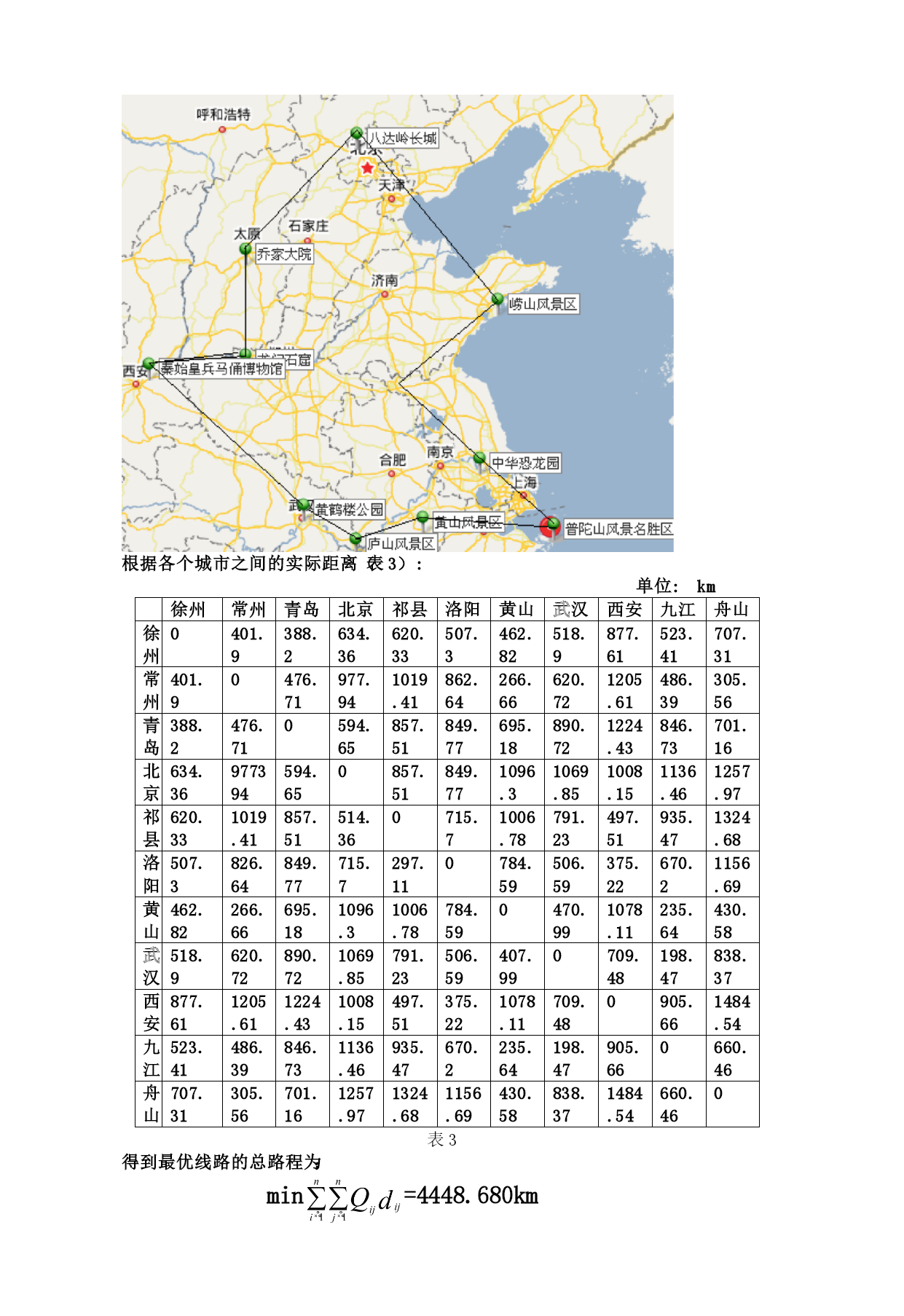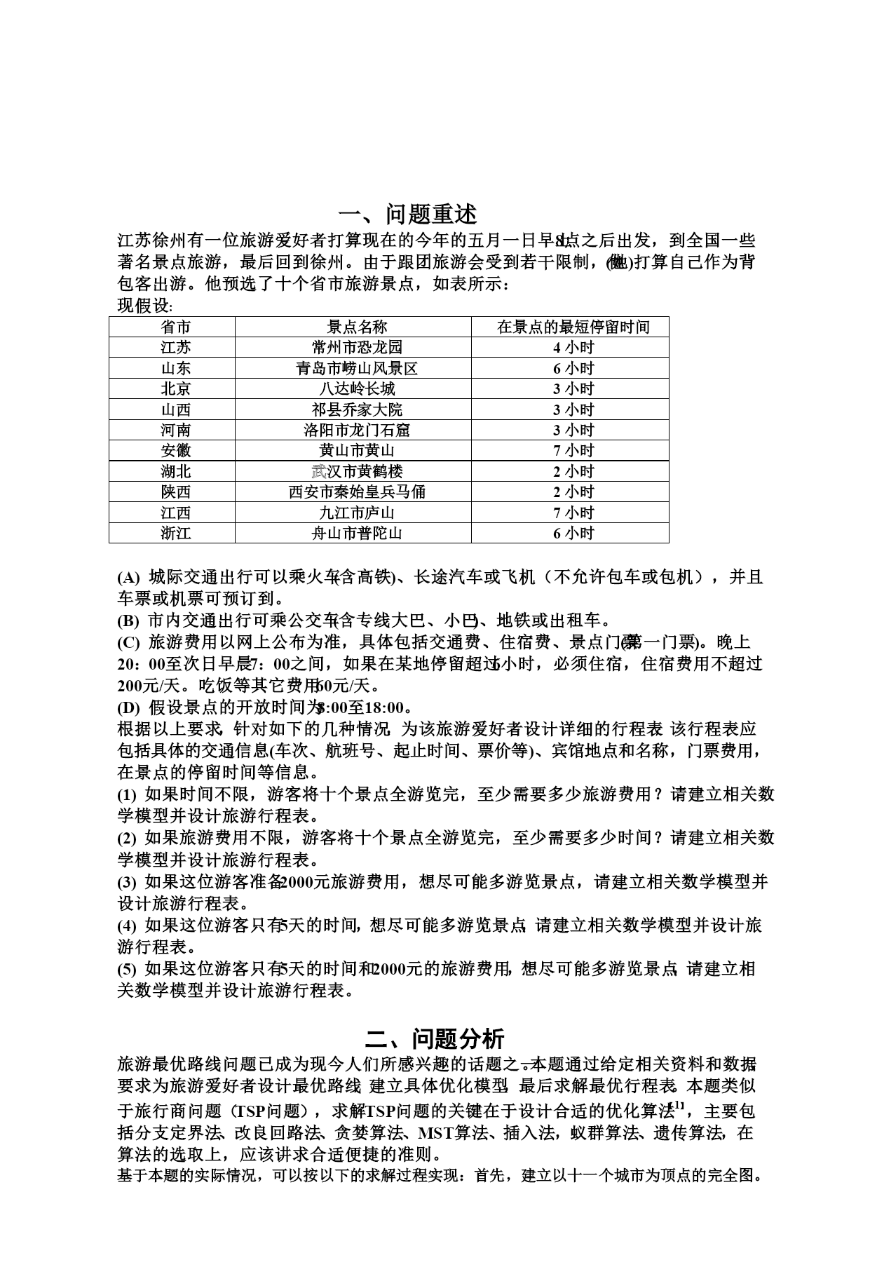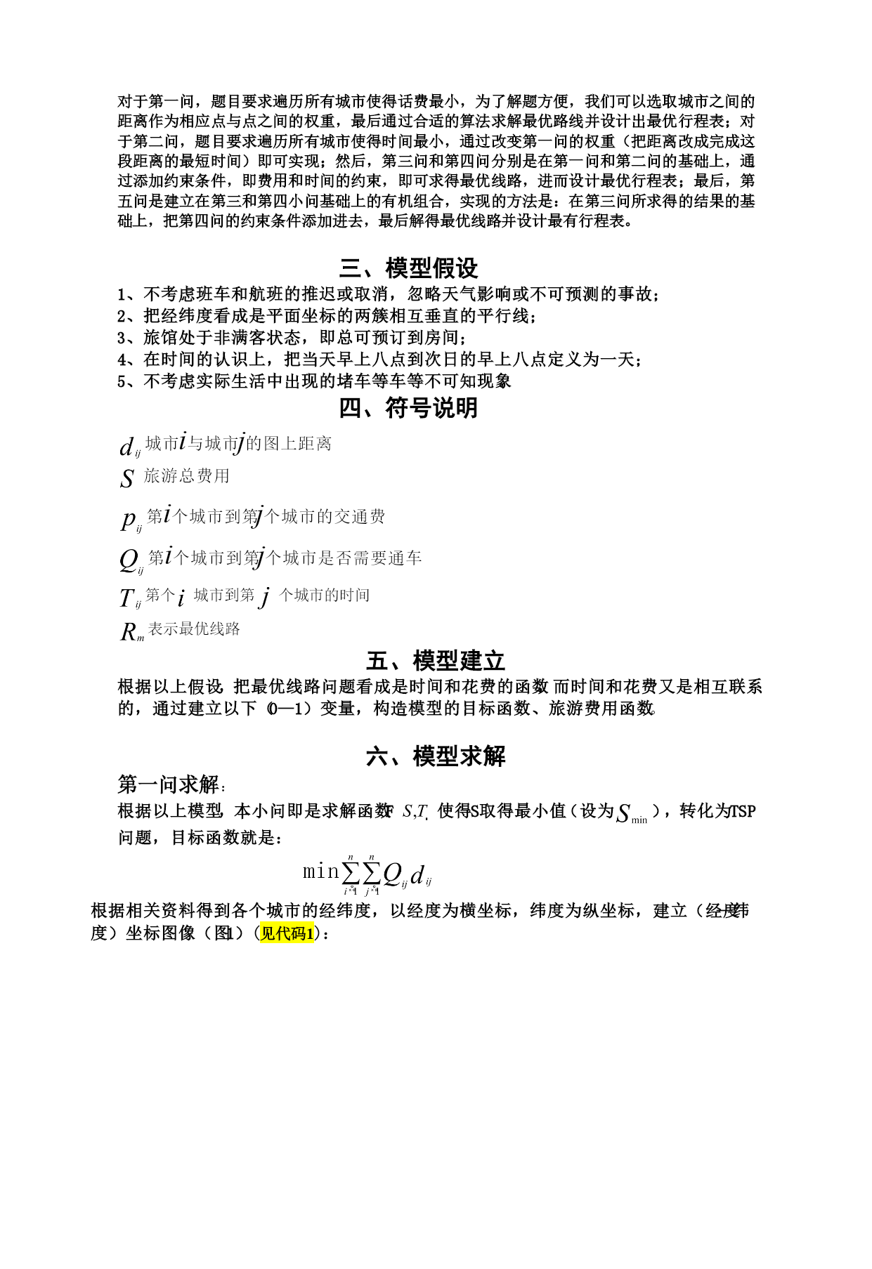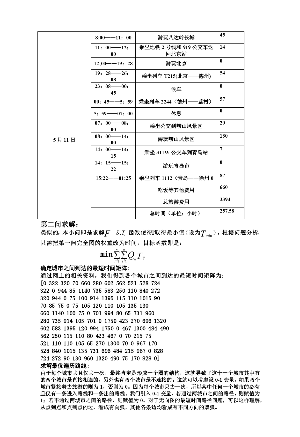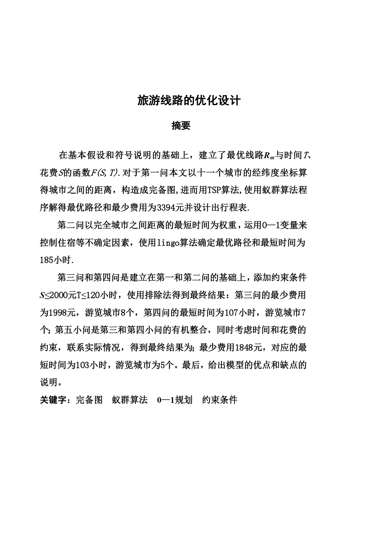 HYPERLINK""旅游线路的优化设计摘要在基本假设和符号说明的基础上,建立了最优线路Rm与时间T、花费S的函数F(S,T).对于第一问本文以十一个城市的经纬度坐标算得城市之间的距离,构造成完备图,进而用TSP算法,使用蚁群算法程序解得最优路径和最少费用为3394元并设计出行程表.第二问以完全城市之间距离的最短时间为权重,运用0—1变量来控制住宿等不确定因素,使用lingo算法确定最优路径和最短时间为185小时.第三问和第四问是建立在第一和第二问的基础上,添加约束条件S≤2000元T≤120小时,使用排除法得到最终结果:第三问的最少费用为1998元,游览城市8个,第四问的最短时间为107小时,游览城市7个;第五小问是第三和第四小问的有机整合,同时考虑时间和花费的约束,联系实际情况,得到最终结果为;最少费用1848元,对应的最短时间为103小时,游览城市为5个。最后,给出模型的优点和缺点的说明。关键字:完备图蚁群算法0—1规划约束条件一、问题重述江苏徐州有一位旅游爱好者打算现在的今年的五月一日早上8点之后出发,到全国一些著名景点旅游,最后回到徐州。由于跟团旅游会受到若干限制,他(她)打算自己作为背包客出游。他预选了十个省市旅游景点,如表所示:现假设:省市景点名称在景点的最短停留时间江苏常州市恐龙园4小时山东青岛市崂山风景区6小时北京八达岭长城3小时山西祁县乔家大院3小时河南洛阳市龙门石窟3小时安徽黄山市黄山7小时湖北武汉市黄鹤楼2小时陕西西安市秦始皇兵马俑2小时江西九江市庐山7小时浙江舟山市普陀山6小时(A)城际交通出行可以乘火车(含高铁)、长途汽车或飞机(不允许包车或包机),并且车票或机票可预订到。(B)市内交通出行可乘公交车(含专线大巴、小巴)、地铁或出租车。(C)旅游费用以网上公布为准,具体包括交通费、住宿费、景点门票(第一门票)。晚上20:00至次日早晨7:00之间,如果在某地停留超过6小时,必须住宿,住宿费用不超过200元/天。吃饭等其它费用60元/天。(D)假设景点的开放时间为8:00至18:00。根据以上要求,针对如下的几种情况,为该旅游爱好者设计详细的行程表,该行程表应包括具体的交通信息(车次、航班号、起止时间、票价等)、宾馆地点和名称,门票费用,在景点的停留时间等信息。(1)如果时间不限,游客将十个景点全游览完,至少需要多少旅游费用?请建立相关数学模型并设计旅游行程表。(2)如果旅游费用不限,游客将十个景点全游览完,至少需要多少时间?请建立相关数学模型并设计旅游行程表。(3)如果这位游客准备2000元旅游费用,想尽可能多游览景点,请建立相关数学模型并设计旅游行程表。(4)如果这位游客只有5天的时间,想尽可能多游览景点,请建立相关数学模型并设计旅游行程表。(5)如果这位游客只有5天的时间和2000元的旅游费用,想尽可能多游览景点,请建立相关数学模型并设计旅游行程表。二、问题分析旅游最优路线问题已成为现今人们所感兴趣的话题之一。本题通过给定相关资料和数据,要求为旅游爱好者设计最优路线,建立具体优化模型,最后求解最优行程表。本题类似于旅行商问题(TSP问题),求解TSP问题的关键在于设计合适的优化算法【1】,主要包括分支定界法、改良回路法、贪婪算法、MST算法、插入法,蚁群算法、遗传算法,在算法的选取上,应该讲求合适便捷的准则。基于本题的实际情况,可以按以下的求解过程实现:首先,建立以十一个城市为顶点的完全图。对于第一问,题目要求遍历所有城市使得话费最小,为了解题方便,我们可以选取城市之间的距离作为相应点与点之间的权重,最后通过合适的算法求解最优路线并设计出最优行程表;对于第二问,题目要求遍历所有城市使得时间最小,通过改变第一问的权重(把距离改成完成这段距离的最短时间)即可实现;然后,第三问和第四问分别是在第一问和第二问的基础上,通过添加约束条件,即费用和时间的约束,即可求得最优线路,进而设计最优行程表;最后,第五问是建立在第三和第四小问基础上的有机组合,实现的方法是:在第三问所求得的结果的基础上,把第四问的约束条件添加进去,最后解得最优线路并设计最有行程表。三、模型假设1、不考虑班车和航班的推迟或取消,忽略天气影响或不可预测的事故;2、把经纬度看成是平面坐标的两簇相互垂直的平行线;3、旅馆处于非满客状态,即总可预订到房间;4、在时间的认识上,把当天早上八点到次日的早上八点定义为一天;5、不考虑实际生活中出现的堵车等车等不可知现象。四、符号说明城市i与城市j的图上距离旅游总费用第i个城市到第j个城市的交通费第i个城市到第j个城市是否需要通车第个城市到第个城市的时间表示最优线路五、模型建立根据