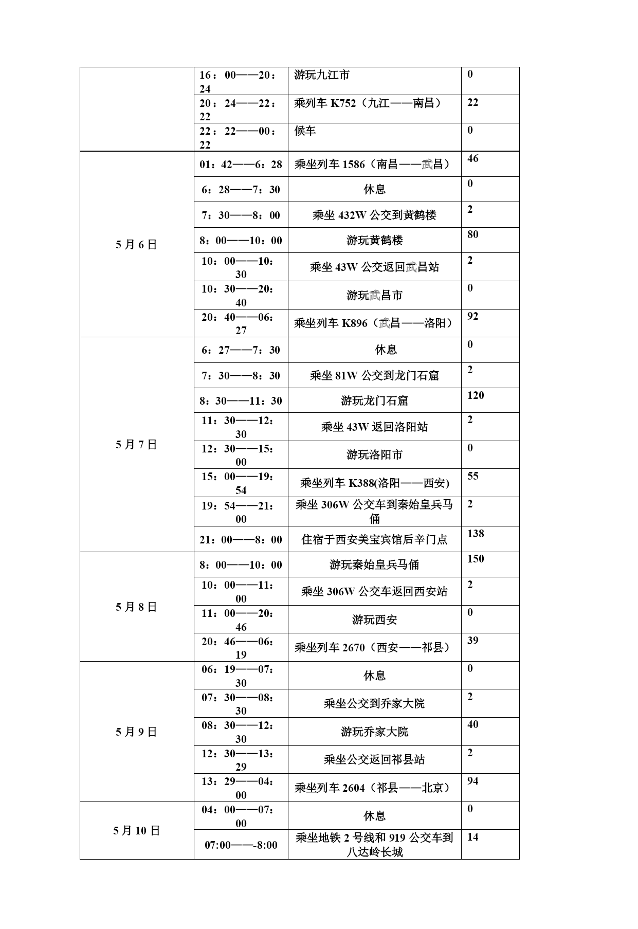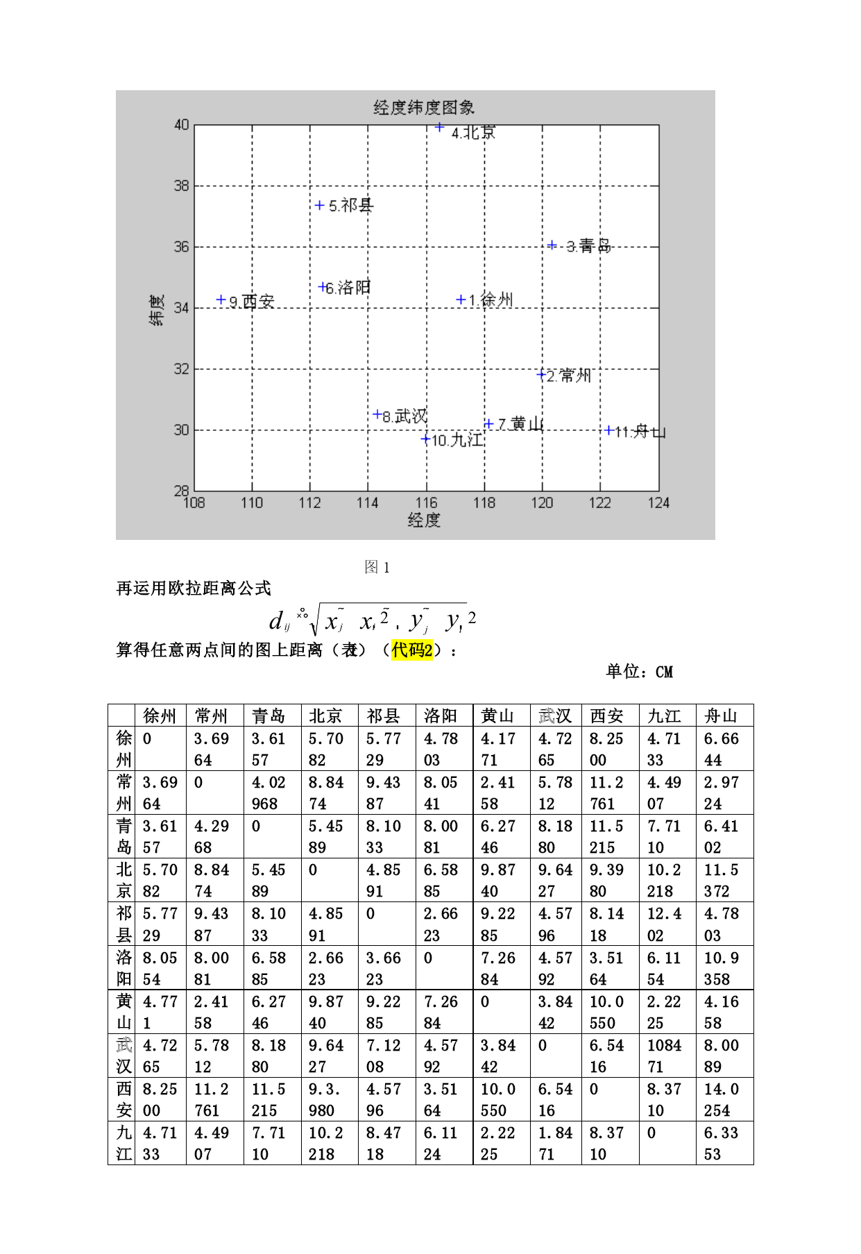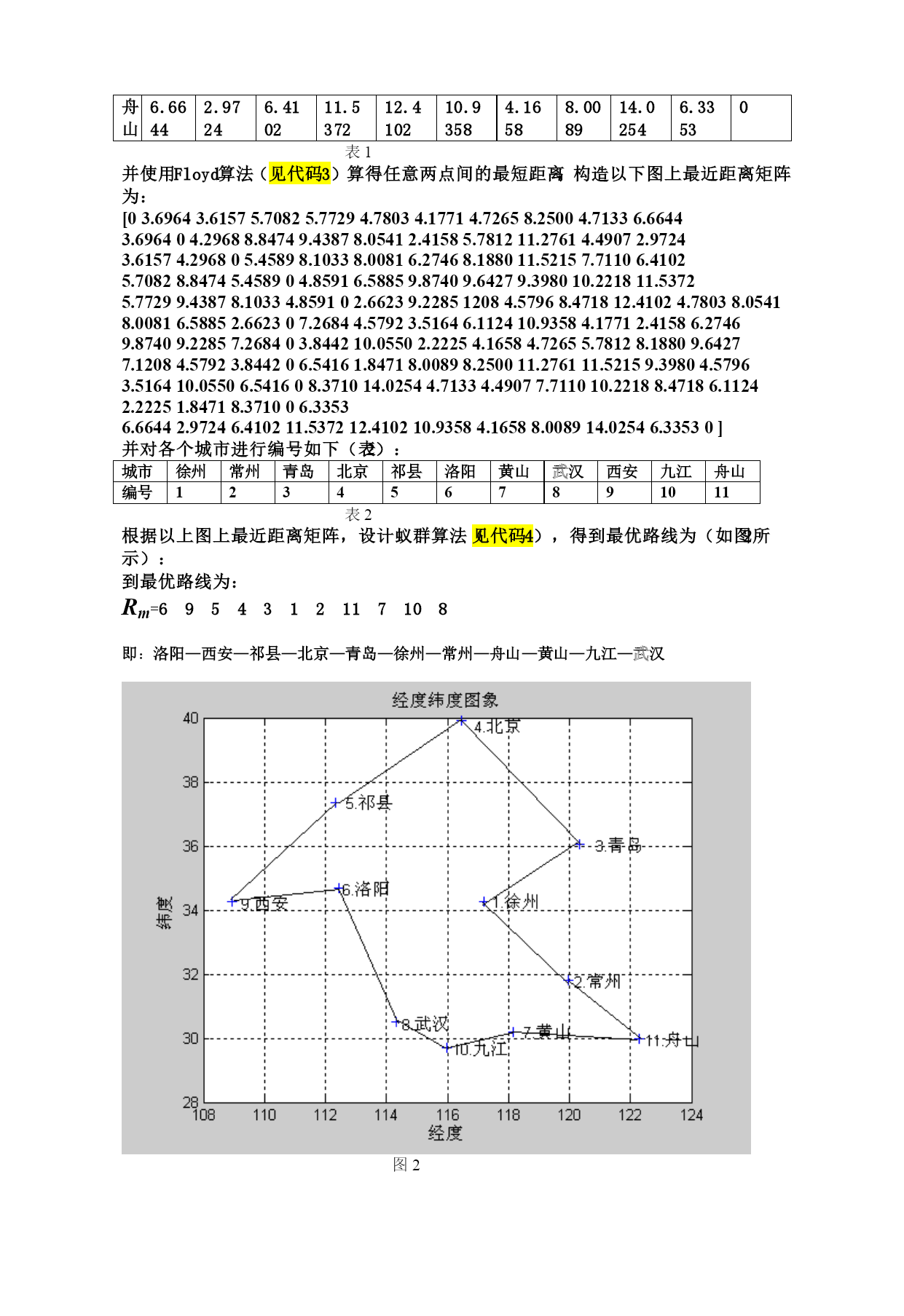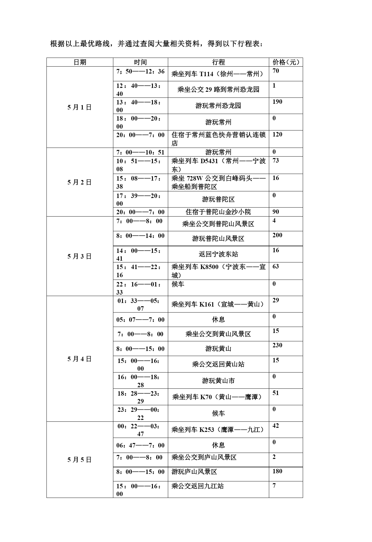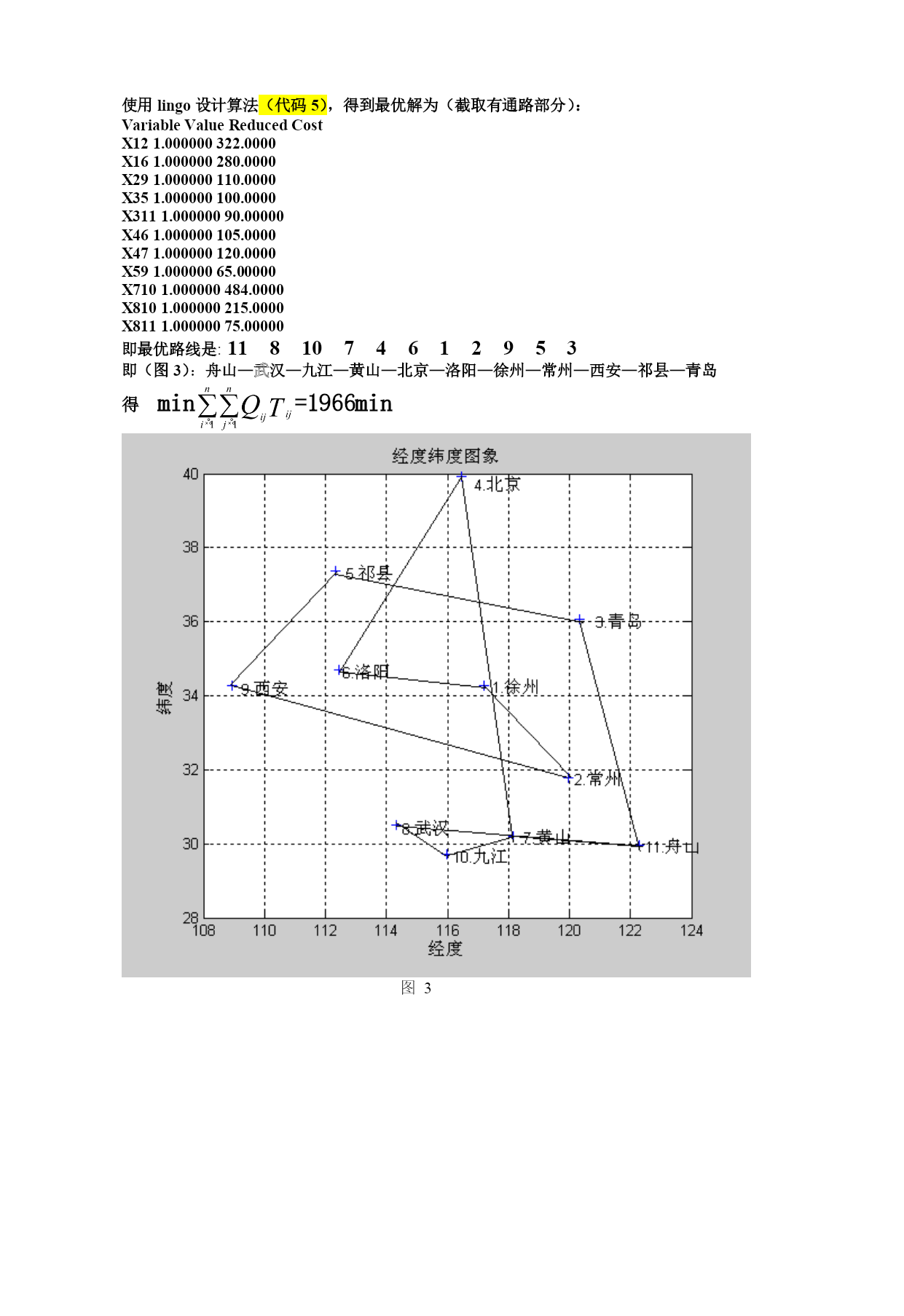 HYPERLINK""旅游线路的优化设计摘要在基本假设和符号说明的基础上,建立了最优线路Rm与时间T、花费S的函数F(S,T).对于第一问本文以十一个城市的经纬度坐标算得城市之间的距离,构造成完备图,进而用TSP算法,使用蚁群算法程序解得最优路径和最少费用为3394元并设计出行程表.第二问以完全城市之间距离的最短时间为权重,运用0—1变量来控制住宿等不确定因素,使用lingo算法确定最优路径和最短时间为185小时.第三问和第四问是建立在第一和第二问的基础上,添加约束条件S≤2000元T≤120小时,使用排除法得到最终结果:第三问的最少费用为1998元,游览城市8个,第四问的最短时间为107小时,游览城市7个;第五小问是第三和第四小问的有机整合,同时考虑时间和花费的约束,联系实际情况,得到最终结果为;最少费用1848元,对应的最短时间为103小时,游览城市为5个。最后,给出模型的优点和缺点的说明。关键字:完备图蚁群算法0—1规划约束条件一、问题重述江苏徐州有一位旅游爱好者打算现在的今年的五月一日早上8点之后出发,到全国一些著名景点旅游,最后回到徐州。由于跟团旅游会受到若干限制,他(她)打算自己作为背包客出游。他预选了十个省市旅游景点,如表所示:现假设:省市景点名称在景点的最短停留时间江苏常州市恐龙园4小时山东青岛市崂山风景区6小时北京八达岭长城3小时山西祁县乔家大院3小时河南洛阳市龙门石窟3小时安徽黄山市黄山7小时湖北武汉市黄鹤楼2小时陕西西安市秦始皇兵马俑2小时江西九江市庐山7小时浙江舟山市普陀山6小时(A)城际交通出行可以乘火车(含高铁)、长途汽车或飞机(不允许包车或包机),并且车票或机票可预订到。(B)市内交通出行可乘公交车(含专线大巴、小巴)、地铁或出租车。(C)旅游费用以网上公布为准,具体包括交通费、住宿费、景点门票(第一门票)。晚上20:00至次日早晨7:00之间,如果在某地停留超过6小时,必须住宿,住宿费用不超过200元/天。吃饭等其它费用60元/天。(D)假设景点的开放时间为8:00至18:00。根据以上要求,针对如下的几种情况,为该旅游爱好者设计详细的行程表,该行程表应包括具体的交通信息(车次、航班号、起止时间、票价等)、宾馆地点和名称,门票费用,在景点的停留时间等信息。(1)如果时间不限,游客将十个景点全游览完,至少需要多少旅游费用?请建立相关数学模型并设计旅游行程表。(2)如果旅游费用不限,游客将十个景点全游览完,至少需要多少时间?请建立相关数学模型并设计旅游行程表。(3)如果这位游客准备2000元旅游费用,想尽可能多游览景点,请建立相关数学模型并设计旅游行程表。(4)如果这位游客只有5天的时间,想尽可能多游览景点,请建立相关数学模型并设计旅游行程表。(5)如果这位游客只有5天的时间和2000元的旅游费用,想尽可能多游览景点,请建立相关数学模型并设计旅游行程表。二、问题分析旅游最优路线问题已成为现今人们所感兴趣的话题之一。本题通过给定相关资料和数据,要求为旅游爱好者设计最优路线,建立具体优化模型,最后求解最优行程表。本题类似于旅行商问题(TSP问题),求解TSP问题的关键在于设计合适的优化算法【1】,主要包括分支定界法、改良回路法、贪婪算法、MST算法、插入法,蚁群算法、遗传算法,在算法的选取上,应该讲求合适便捷的准则。基于本题的实际情况,可以按以下的求解过程实现:首先,建立以十一个城市为顶点的完全图。对于第一问,题目要求遍历所有城市使得话费最小,为了解题方便,我们可以选取城市之间的距离作为相应点与点之间的权重,最后通过合适的算法求解最优路线并设计出最优行程表;对于第二问,题目要求遍历所有城市使得时间最小,通过改变第一问的权重(把距离改成完成这段距离的最短时间)即可实现;然后,第三问和第四问分别是在第一问和第二问的基础上,通过添加约束条件,即费用和时间的约束,即可求得最优线路,进而设计最优行程表;最后,第五问是建立在第三和第四小问基础上的有机组合,实现的方法是:在第三问所求得的结果的基础上,把第四问的约束条件添加进去,最后解得最优线路并设计最有行程表。三、模型假设1、不考虑班车和航班的推迟或取消,忽略天气影响或不可预测的事故;2、把经纬度看成是平面坐标的两簇相互垂直的平行线;3、旅馆处于非满客状态,即总可预订到房间;4、在时间的认识上,把当天早上八点到次日的早上八点定义为一天;5、不考虑实际生活中出现的堵车等车等不可知现象。四、符号说明城市i与城市j的图上距离旅游总费用第i个城市到第j个城市的交通费第i个城市到第j个城市是否需要通车第个城市到第个城市的时间表示最优线路五、模型建立根据