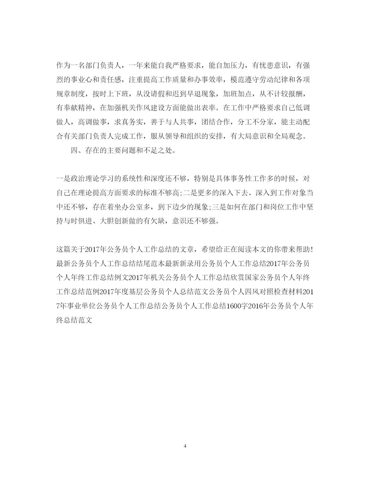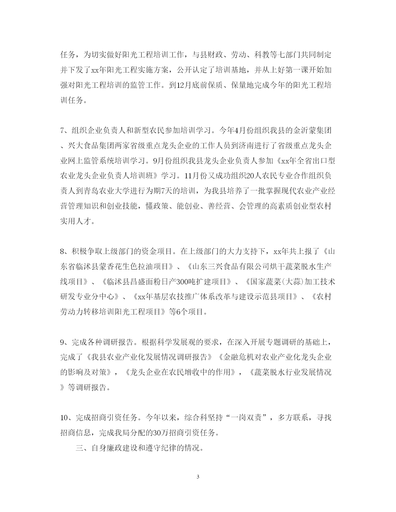此资料由网络收集而来,如有侵权请告知上传者立即删除。资料共分享,我们负责传递知识。PAGEPAGE420XX年公务员个人工作总结样本在局领导及业务主管部门的指导下,在同志们的帮助下,通过自己的努力,在思想上、业务工作水平上都有了很大的提高,圆满的完成了全年的工作、学习任务,并取得了一定的成绩。现将一年来个人工作总结报告一、加强政治思想学习。加强政治理论学习,是坚定理想信念、与党中央保持一致的重要前提,是保持奋发向上和与时俱进精神状态的动力源泉。一年来,本人自觉提高学习积极性,以积极的态度参加“深入学习实践科学发展观”的教育活动;认真学习和领会中央的路线和各项方针政策,及时把思想认识统一到中央的精神上来,并以此指导个人的言行。树立了“讲工作、讲团结、讲奉献”,“只为成功找方法,不为失败找理由”的个人工作信念,成为自己“基础工作做牢、创新工作突破”的动力,不仅自己能认真学习、深刻领会,而且还利用多种渠道和途径,经常向工作对象作宣传引导工作。在学习中,能联系思想工作实际,努力做到围绕主题、把握灵魂、领会精髓。对全面建设小康社会的目标更加充满信心,同时增强了深入学习实践科学发展观活动,推进我县农业产业化纵深发展的主人翁责任感。二、完成本职岗位工作的情况。一年来,我以负责的态度努力完成个人承担的各项工作,积极协助有关部门完成年度部门全部工作任务:1、组织农产品加工企业参加各种农博会。今年5月份成功组织两家企业参加省政府在深圳举办的首届“山东名优农产品及食品在深圳展示订货会”。9月份又组织3家企业参加了“青岛国际农交会”11月份又参与筹备了在临沂举办的首届“中国农产品加工与流通博览会”并制定了《临沭县参加中国农产品加工与流通博览会筹展实施方案》。以及各项具体的会务准备工作。农博会参展期间共签约7个项目,金额1850万元,达成合作意向23个涉及金额5200多万元。通过参加农博会,为我县农业产业化龙头企业沟通信息、扩大宣传、寻找商机,提高了知名度,拓展了市场空间。2、认真做好我县农业产业化龙头企业和一村一品专业村(镇)的统计调查工作。今年2-3月份组织开展了xx年度销售收入500万元以上的龙头企业及xx年底前形成的符合一村一品专业村(镇)条件的调查统计工作。经过历时近2个月的调查统计工作,完成了我县xx年度的统计调查工作,为进一步摸清我县农业产业化发展情况提供了详实的数据。3、积极推荐市级重点龙头企业做好省、市级财政贴息资金项目申报工作。xx年推荐了临沭县宝康工业油脂有限公司、临沂东盛伊思德食品有限公司、山东三兴食品有限公司、临沭县供销棉麻有限公司、山东省沂蒙老区酒业有限公司、临沭祥兴工艺品有限公司等6家农业产业化龙头企业申报xx年省、市级农业产业化财政贴息项目,申请贴息资金253.27万元。4、认真筛选,推荐第五批市级农业产业化重点龙头企业。xx年9月份推荐上报了临沂市金波食品有限公司、临沂连兴工艺品有限公司等11家农产品加工企业,经市专家组评审,已有7家被市政府认定为第五批市级重点龙头企业。5、做好个人工作计划,做好省级重点龙头企业的监测工作。每个季度末通过网上监管系统对我县兴大食品集团有限公司、金沂蒙集团两家省级重点龙头企业进行监测,使每两年一次的动态监测变成了一种常规的监管,取得了很好的效果。6、做好农村劳动力转移阳光工程培训工作。xx年我县承担600人的阳光工程培训任务,为切实做好阳光工程培训工作,与县财政、劳动、科教等七部门共同制定并下发了xx年阳光工程实施方案,公开认定了培训基地,并从上好第一课开始加强对阳光工程培训的监管工作。到12月底前保质、保量地完成今年的阳光工程培训任务。7、组织企业负责人和新型农民参加培训学习。今年4月份组织我县的金沂蒙集团、兴大食品集团两家省级重点龙头企业的工作人员到济南进行了省级重点龙头企业网上监管系统培训学习。9月份组织我县龙头企业负责人参加《xx年全省出口型农业龙头企业负责人培训班》学习。11月份又成功组织20人农民专业合作组织负责人到青岛农业大学进行为期7天的培训,为我县培养了一批掌握现代农业产业经营管理知识和创业技能,懂政策、能创业、善经营、会管理的高素质创业型农村实用人才。8、积极争取上级部门的资金项目。在上级部门的大力支持下,xx年共上报了《山东省临沭县蒙香花生色拉油项目》、《山东三兴食品有限公司烘干蔬菜脱水生产线项目》、《临沭县昌盛面粉日产300吨扩建项目》、《国家蔬菜(大蒜)加工技术研发专业分中心》、《xx年基层农技推广体系改革与建设示范县项目》、《农村劳动力转移培训阳光工程项目》等6个项目。9、完成各种调研报告。根据科学发展观的要求,在深入开展专题调研的基础上,完成了《我县农业产业化发展情况调研报告》《金融危机对农业产业化龙头企业