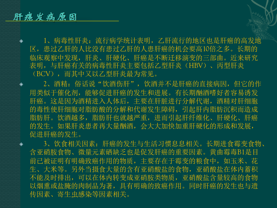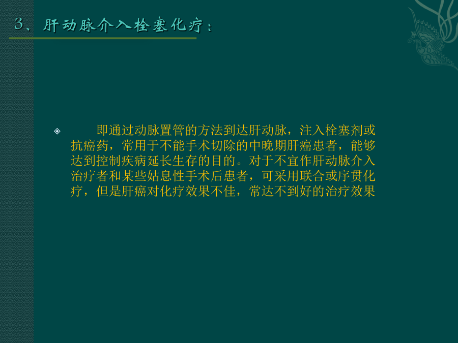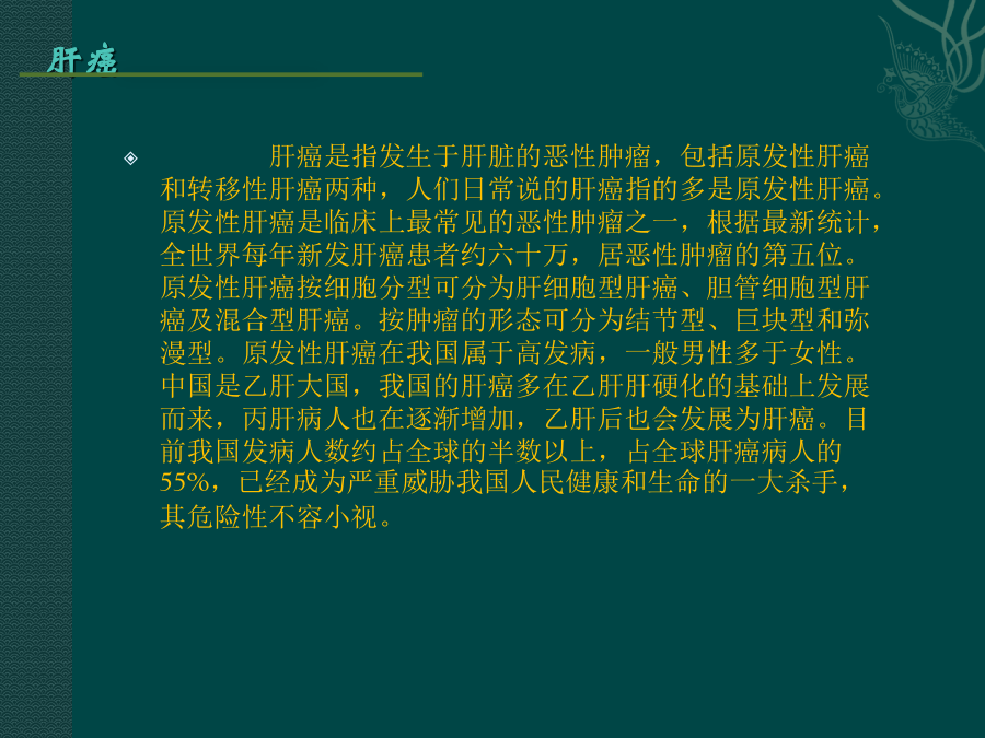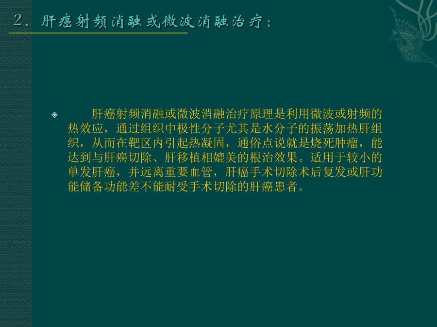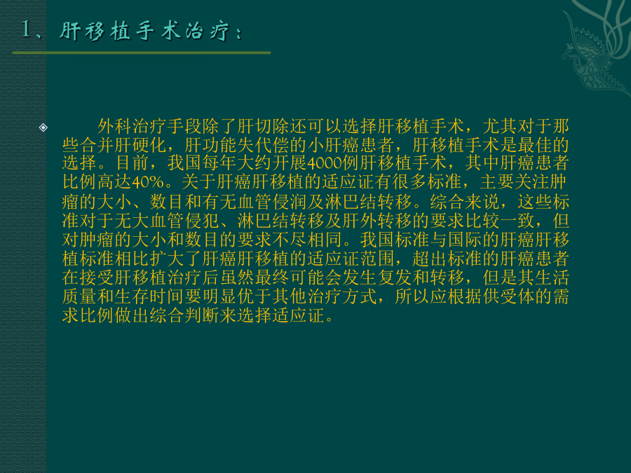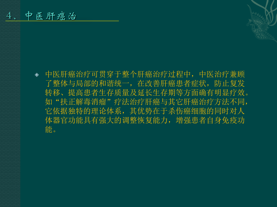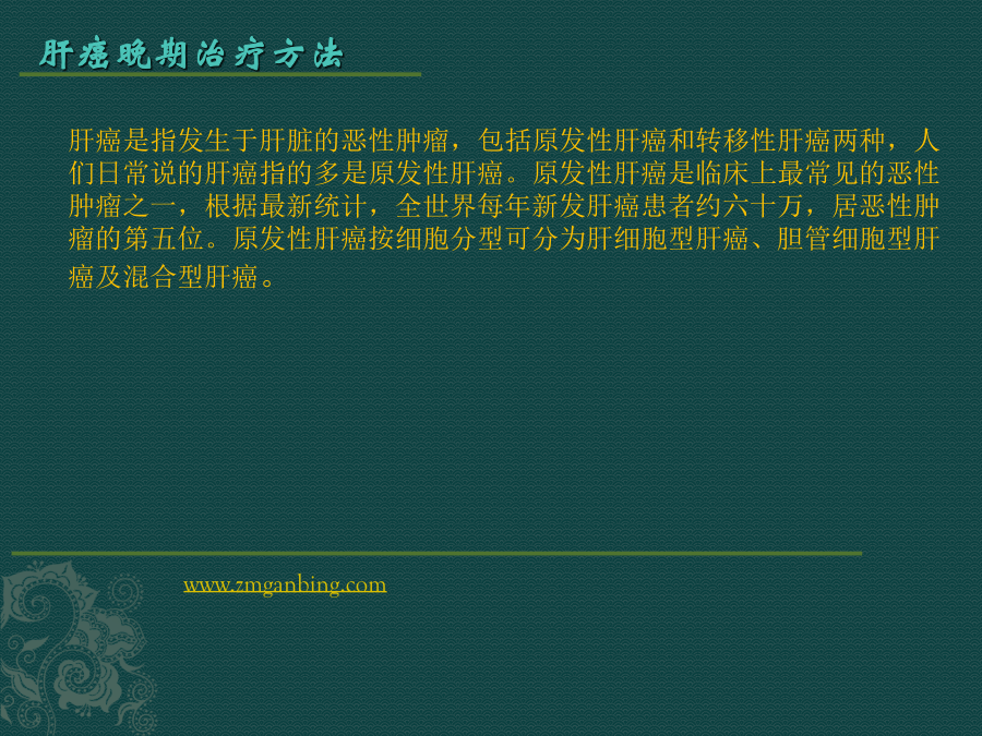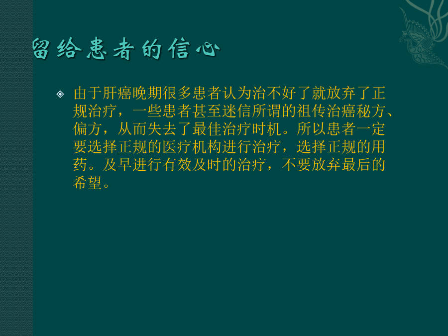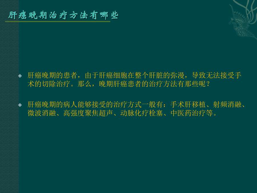 肝癌晚期治疗方法肝癌1、病毒性肝炎:流行病学统计表明,乙肝流行的地区也是肝癌的高发地区,患过乙肝的人比没有患过乙肝的人患肝癌的机会要高10倍之多。长期的临床观察中发现,肝炎、肝硬化、肝癌是不断迁移演变的三部曲。近来研究表明,与肝癌有关的病毒性肝炎主要包括乙型肝炎(HBV)、丙型肝炎(BCV),而其中又以乙型肝炎最为常见。2、酒精:俗话说“饮酒伤肝”,饮酒并不是肝癌的直接病因,但它的作用类似于催化剂,能够促进肝癌的发生和进展。有长期酗酒嗜好者容易诱发肝癌。这是因为酒精进入人体后,主要在肝脏进行分解代谢,酒精对肝细胞的毒性使肝细胞对脂肪酸的分解和代谢发生障碍,引起肝内脂肪沉积而造成脂肪肝。饮酒越多,脂肪肝也就越严重,进而引起肝纤维化、肝硬化、肝癌的发生。如果肝炎患者再大量酗酒,会大大加快加重肝硬化的形成和发展,促进肝癌的发生。3、饮食相关因素:肝癌的发生与生活习惯息息相关。长期进食霉变食物、含亚硝胺食物、微量元素硒缺乏也是促发肝癌的重要因素。黄曲霉毒B1是目前已被证明有明确致癌作用的物质,主要存在于霉变的粮食中,如玉米、花生、大米等。另外当摄食大量的含有亚硝酸盐的食物,亚硝酸盐在体内蓄积不能及时排出,可以在体内转变成亚硝胺类物质,亚硝酸盐含量较高的食物以烟熏或盐腌的肉制品为著,具有明确的致癌作用。同时肝癌的发生也与遗传因素、寄生虫感染等因素相关。肝癌晚期的患者,由于肝癌细胞在整个肝脏的弥漫,导致无法接受手术的切除治疗。那么,晚期肝癌患者的治疗方法有那些呢?肝癌晚期的病人能够接受的治疗方式一般有:手术肝移植、射频消融、微波消融、高强度聚焦超声、动脉化疗栓塞、中医药治疗等。外科治疗手段除了肝切除还可以选择肝移植手术,尤其对于那些合并肝硬化,肝功能失代偿的小肝癌患者,肝移植手术是最佳的选择。目前,我国每年大约开展4000例肝移植手术,其中肝癌患者比例高达40%。关于肝癌肝移植的适应证有很多标准,主要关注肿瘤的大小、数目和有无血管侵润及淋巴结转移。综合来说,这些标准对于无大血管侵犯、淋巴结转移及肝外转移的要求比较一致,但对肿瘤的大小和数目的要求不尽相同。我国标准与国际的肝癌肝移植标准相比扩大了肝癌肝移植的适应证范围,超出标准的肝癌患者在接受肝移植治疗后虽然最终可能会发生复发和转移,但是其生活质量和生存时间要明显优于其他治疗方式,所以应根据供受体的需求比例做出综合判断来选择适应证。肝癌射频消融或微波消融治疗原理是利用微波或射频的热效应,通过组织中极性分子尤其是水分子的振荡加热肝组织,从而在靶区内引起热凝固,通俗点说就是烧死肿瘤,能达到与肝癌切除、肝移植相媲美的根治效果。适用于较小的单发肝癌,并远离重要血管,肝癌手术切除术后复发或肝功能储备功能差不能耐受手术切除的肝癌患者。即通过动脉置管的方法到达肝动脉,注入栓塞剂或抗癌药,常用于不能手术切除的中晚期肝癌患者,能够达到控制疾病延长生存的目的。对于不宜作肝动脉介入治疗者和某些姑息性手术后患者,可采用联合或序贯化疗,但是肝癌对化疗效果不佳,常达不到好的治疗效果中医肝癌治疗可贯穿于整个肝癌治疗过程中,中医治疗兼顾了整体与局部的和谐统一,在改善肝癌患者症状,防止复发转移、提高患者生存质量及延长生存期等方面确有明显疗效。如“扶正解毒消瘤”疗法治疗肝癌与其它肝癌治疗方法不同,它依据独特的理论体系,其优势在于杀伤癌细胞的同时对人体器官功能具有强大的调整恢复能力,增强患者自身免疫功能。“T细胞活化靶向技术”是由“T细胞活化技术”和“免疫靶向技术”两项技术组成的高效抗肿瘤技术,是肿瘤治疗史上的一个里程碑,是对传统治疗技术颠覆性突破。其先通过采用自身细胞修复、扩增免疫系统杀灭病毒的能力杀灭癌细胞,再通过灌肠方式将对肿瘤细胞具有高度特异性的中药制剂送入体内的方式,使中药制剂随血液循环到达肿瘤部位,打破免疫耐受现象,机体免疫系统对肿瘤细胞持续攻击,肿瘤细胞不断坏死和吸收,直至完全消失的方式。双管齐下,为肝癌晚期的患者挽起最后的希望。留给患者的信心ThankYou