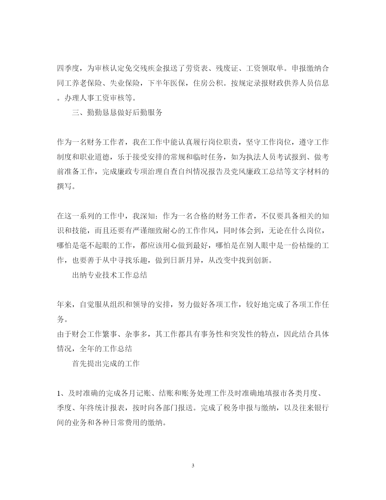 此资料由网络收集而来,如有侵权请告知上传者立即删除。资料共分享,我们负责传递知识。PAGEPAGE5出纳专业技术工作总结写专业技术工作总结时,总结写得好不好,影响到专家对你的评价,也会影响到自己能不能通过。所以写好专业技术总结很重要。以下是小编搜集整理的出纳专业技术工作总结,欢迎阅读。出纳专业技术工作总结在这多年的工作经历中,借助领导及同事们的帮助指导,通过自身的不断努力,我个人无论是在敬业精神、思想境界,还是在业务素质、工作能力上都得到进一步提高,并取得了一定的工作成绩,现将本人一年以来的工作、学习情况汇报如下:一、加强学习,注重提升个人修养一是通过杂志报刊、电脑网络和电视新闻等媒体,认真学习贯彻党的路线、方针、政策,深入学习领会党的17大、努力践行“三个代表”重要思想,不断提高了政治理论水平。加强政治思想和品德修养。二是认真学习财经、廉政方面的各项规定,自觉按照国家的财经政策和程序办事;三是努力钻研业务知识,积极参加相关部门组织的各种业务技能的培训,严格按照xx同志提出的“勤于学习、善于创造、乐于奉献”的要求,坚持“讲学习、讲政治、讲正气”,始终把耐得平淡、舍得付出、默默无闻作为自己的准则;始终把增强服务意识作为一切工作的基础;始终把工作放在严谨、细致、扎实、求实上,脚踏实地工作;四是不断改进学习方法,讲求学习效果,“在工作中学习,在学习中工作”,坚持学以致用,注重融会贯通,理论联系实际,用新的知识、新的思维和新的启示,巩固和丰富综合知识、让知识伴随年龄增长,使自身综合能力不断得到提高。二、严格履行会计岗位职责,扎实做好本职工作一年来,本人以高度的责任感和事业心,自觉服从组织和领导的安排,努力做好各项工作,较好地完成了各项工作任务。由于财会工作繁事、杂事多,其工作都具有事务性和突发性的特点,因此结合具体情况,按时间性,全年的工作如下:一季度,完成年财务决算收尾工作,办好相关事宜,办理事业年检。认真总结去年的财务工作,并为年订下了财务工作设想。对各类会计档案,进行了分类、装订、归档。对财务专用软件进行了清理、杀毒和备份。完成年新增固定资产的建账、建卡、年检工作;二季度,按照财务制度及预算收支科目建立年新账,处理日常发生的经济业务。按工资报表要求建立工资统计账目,以便于分项目统计,准时向主管部门报送财务、统计月报季报;充分发挥了会计核算、监督职能。及时向相关单位、站领导提供相关信息、资料,以便正确决策。主动与局计财科及时保持联系,提出用款申请计划,以达到资金的正常周转。在对外付款方面,严格把关,严格执行和遵守国家财经制度,账务做到日清月结、账实相符、账账相符。办理行政事业性收费年度审验,为贯彻落实行政许可法,及时报送“收费项目、标准、依据、金额”、等自查清理情况表,报送上半年医保软盘、按医保规定缴纳上半年保费、三季度,根据要求,用近一个月时间对年以来的账目按《中华人民共和国会计法》及《某省省会计管理条例》进行对照自查,完善了财务手续,写出了自查情况、经验体会、内部控制度建设情况及会计制度执行情况,进一步规范了会计行为。办理职工增资事项。四季度,为审核认定免交残疾金报送了劳资表、残废证、工资领取单。申报缴纳合同工养老保险、失业保险,下半年医保,住房公积。按规定录报财政供养人员信息。办理人事工资审核等。三、勤勤恳恳做好后勤服务作为一名财务工作者,我在工作中能认真履行岗位职责,坚守工作岗位,遵守工作制度和职业道德,乐于接受安排的常规和临时任务,如为执法人员考试报到、做考前准备工作,完成廉政专项治理自查自纠情况报告及党风廉政工总结等文字材料的撰写。在这一系列的工作中,我深知:作为一名合格的财务工作者,不仅要具备相关的知识和技能,而且还要有严谨细致耐心的工作作风,同时体会到,无论在什么岗位,哪怕是毫不起眼的工作,都应该用心做到最好,哪怕是在别人眼中是一份枯燥的工作,也要善于从中寻找乐趣,做到日新月异,从改变中找到创新。出纳专业技术工作总结年来,自觉服从组织和领导的安排,努力做好各项工作,较好地完成了各项工作任务。由于财会工作繁事、杂事多,其工作都具有事务性和突发性的特点,因此结合具体情况,全年的工作总结首先提出完成的工作1、及时准确的完成各月记账、结账和账务处理工作及时准确地填报市各类月度、季度、年终统计报表,按时向各部门报送。完成了税务申报与缴纳,以及往来银行间的业务和各种日常费用的缴纳。2、以认真的态度积极参加西安市财政局集中所得税培训,做好财务软件记账及系统的维护。3、对各类会计档案,进行了分类、装订、归档。再次提出加强学习,注重提升个人修养和综合素质1、通过报纸杂志、电脑网络和电视新闻等媒体,加强政治思想和品德修养。2、认真学习财经方面的各项规定,自觉