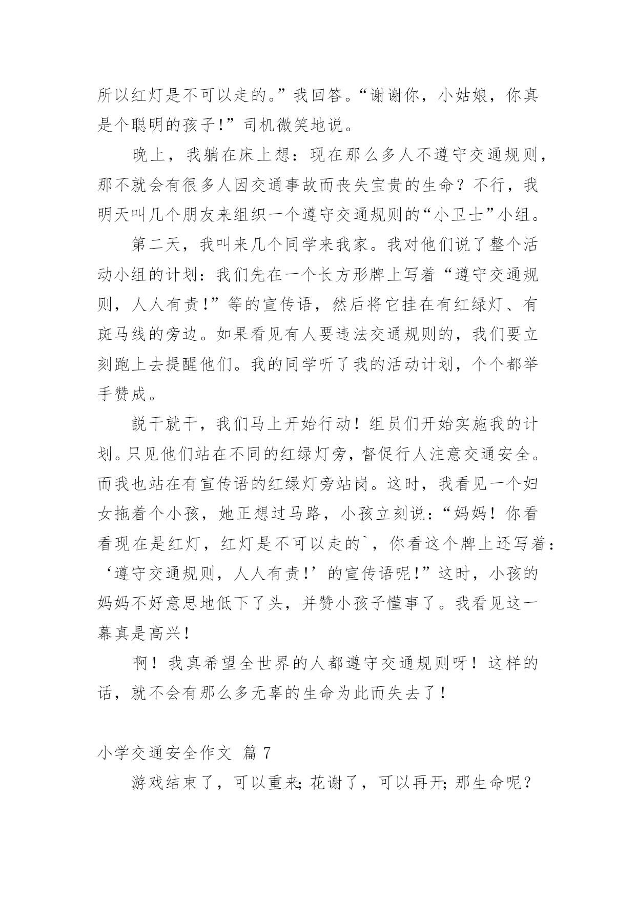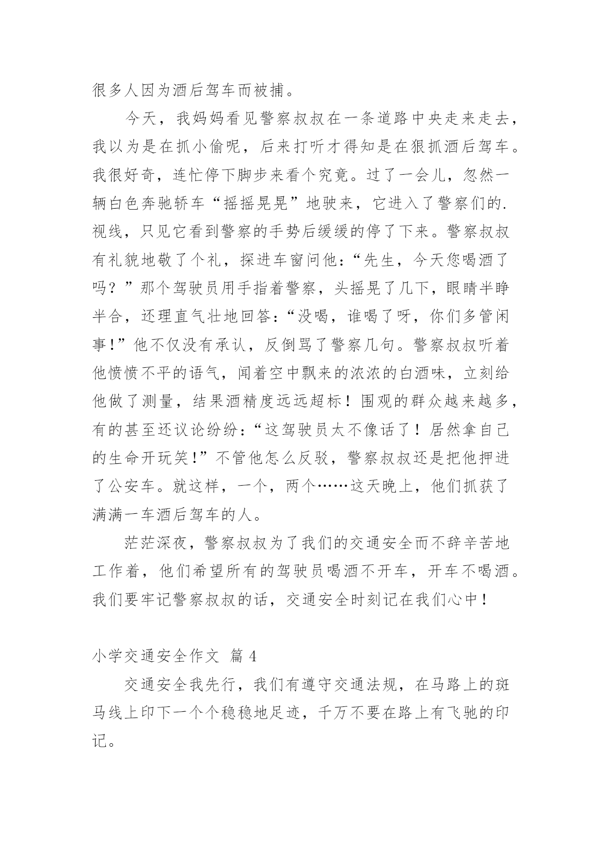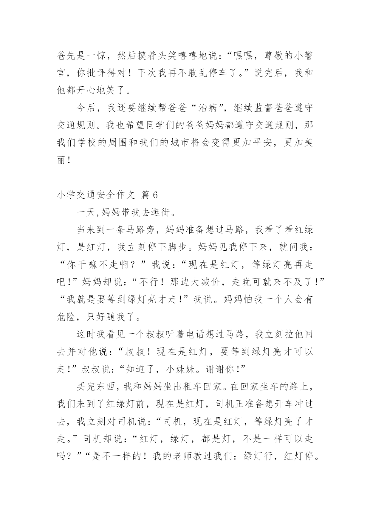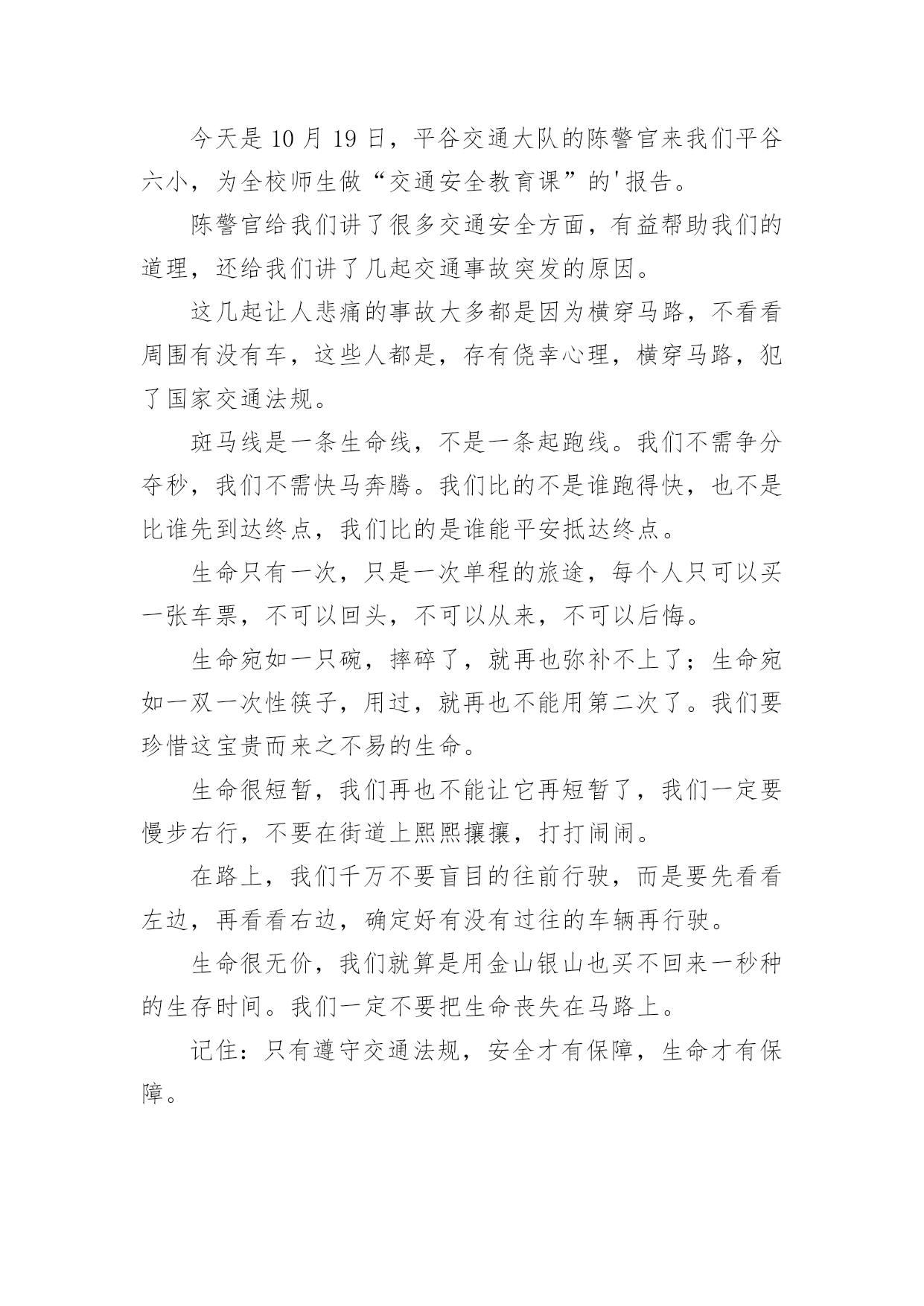 小学交通安全作文【精品】小学交通安全作文锦集九篇在我们平凡的日常里,大家对作文都不陌生吧,写作文是培养人们的观察力、联想力、想象力、思考力和记忆力的重要手段。你所见过的作文是什么样的呢?下面是小编为大家收集的小学交通安全作文10篇,仅供参考,希望能够帮助到大家。小学交通安全作文篇1交通这一个词是我们每天都能看到的。但是有一些人有不遵守规则,却把生命不当成一回事。我们小学生上学,放学或假期间,都能看到公路,但有些人把公路不当一回事,在我国每年交通事故死亡人数打到十万人以上,每五分钟死一人,每一分钟伤一人。是因为有的人闯红灯,有的人在公路上疯狂打闹,还有的人甚至把公路当成踢球场等。有一件案例是我亲眼所见的,一人空气清新的'早晨,我正高高兴兴地上学,当我走到这里,眼看过条公路就到学校,我看到左边有车来了,我停止脚步,离我左边有远的四(5)班的一个学生,正步覆匆匆地走过去,就在这时,车子的轮子轧到他的脚,把他的脚骨折了。看到这一幕,我心里一惊,心想如果不遵守交通规则,就是这样的下场。这件事情深深地记在我的心中,每天上学放学的时候,总是叮嘱我自己要遵守交通规则。语文老师曾讲过“宁停十分,不抢一秒”的话,意思是:什么时候或怎样着急赶路,一定站在公路两旁等十分钟,抢一秒也不行,老师的话使我受益无穷。下面我给人们提出五点交通规则:一、饮酒时不能开车,开车不饮酒。二、看红绿灯,红灯停、绿灯行,走斑马线。三、不能把公路当足球场。四、不闯红灯,从我做起。五、不能在公路上疯狂打闹。交通规则从我做起,不闯红灯,不疯狂打闹。希望我们能记住这句话“宁停十分,不抢一秒”吧!也希望让我们做一个好市民。记住交通规则,注意安全,让我们的生命之树成长吧!小学交通安全作文篇2人的生活中,处处离不开交通,时时刻刻在交通之间徘徊,“交通安全”这个词大家都听过,可又有谁真正的遵守了呢?也许,一刹那的疏忽,会给你带来终身的遗憾。因此,为了朋友,为了家人,为了自己,我们应该遵守交通,做一个知法、守法的好公民。就拿我姑父说吧,他是一位货车司机,整天都要拉货。可这又有什么办法呢,还不是为了挣钱,有一次,姑父在拉货的途中车出了故障,他就只好把货车停在路边,给货车的反光镜帮上一大把红线,提醒人们他在修车。姑父以为车修好了,就把大红线收起并试试发动货车,可谁叫这么倒霉呢。车还没修好,姑父只好又钻到车底下修车。俗话说得好“不怕一万,就怕万一”呀,姑父居然忘了挂大红线!不料这时,一位喝了酒的货车司机驾驶货车从后面撞了上来。就这样,我那才30多岁的'姑父去世了。这件血淋淋的事实在我们的眼前一闪而过,可那悲痛的情景却铭刻于心,那是血的挣扎,那是痛苦的泪痕,那是同情的目光。在一次次恶剧不断重演之时,我们是否有所体会,难道不应该为此而珍惜宝贵的生命吗?也许他们死不瞑目,在黑暗中,那哀叹永不停息。也许,他们在告诫我们:应该注意交通安全,珍惜拥有。这是他们唯一的话语,这是他们一生中最为精典的佳话。他们已深深领悟到生命的脆弱与顽强,它取决于你对它的珍惜。生命只有一次,我们大家都必须去呵护它,我们共同生活在社会这个大家庭里,因为有了生命,我们的世界才会更加美丽!为了使自己、家人、亲人不再痛苦,请遵守交通规则,防止交通事故的发生。小学交通安全作文篇3人的生命是世间最宝贵的,没有了金钱,可以再去赚;没有了工作,可以去拼搏;没有了学业,可以去努力学习;但是没有了生命,就没有了一切。如今交通安全是个大问题,很多人因为酒后驾车而被捕。今天,我妈妈看见警察叔叔在一条道路中央走来走去,我以为是在抓小偷呢,后来打听才得知是在狠抓酒后驾车。我很好奇,连忙停下脚步来看个究竟。过了一会儿,忽然一辆白色奔驰轿车“摇摇晃晃”地驶来,它进入了警察们的.视线,只见它看到警察的手势后缓缓的停了下来。警察叔叔有礼貌地敬了个礼,探进车窗问他:“先生,今天您喝酒了吗?”那个驾驶员用手指着警察,头摇晃了几下,眼睛半睁半合,还理直气壮地回答:“没喝,谁喝了呀,你们多管闲事!”他不仅没有承认,反倒骂了警察几句。警察叔叔听着他愤愤不平的语气,闻着空中飘来的浓浓的白酒味,立刻给他做了测量,结果酒精度远远超标!围观的群众越来越多,有的甚至还议论纷纷:“这驾驶员太不像话了!居然拿自己的生命开玩笑!”不管他怎么反驳,警察叔叔还是把他押进了公安车。就这样,一个,两个……这天晚上,他们抓获了满满一车酒后驾车的人。茫茫深夜,警察叔叔为了我们的交通安全而不辞辛苦地工作着,他们希望所有的驾驶员喝酒不开车,开车不喝酒。我们要牢记警察叔叔的话,交通安全时刻记在我们心中!小学交通安全作文篇4交通安全我先行,我们有遵守交通法规,在马路上的斑马线上印下一个个稳稳地足迹,千万不要在路上有飞驰的印记。今天是10月19日,平谷交通大队的陈警官来我们平谷六小,为全校师生做“交通安全教