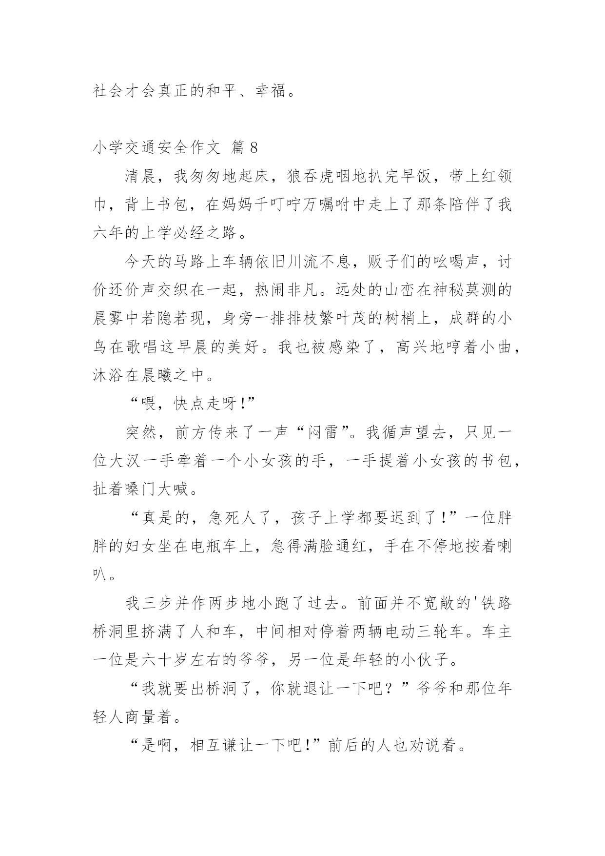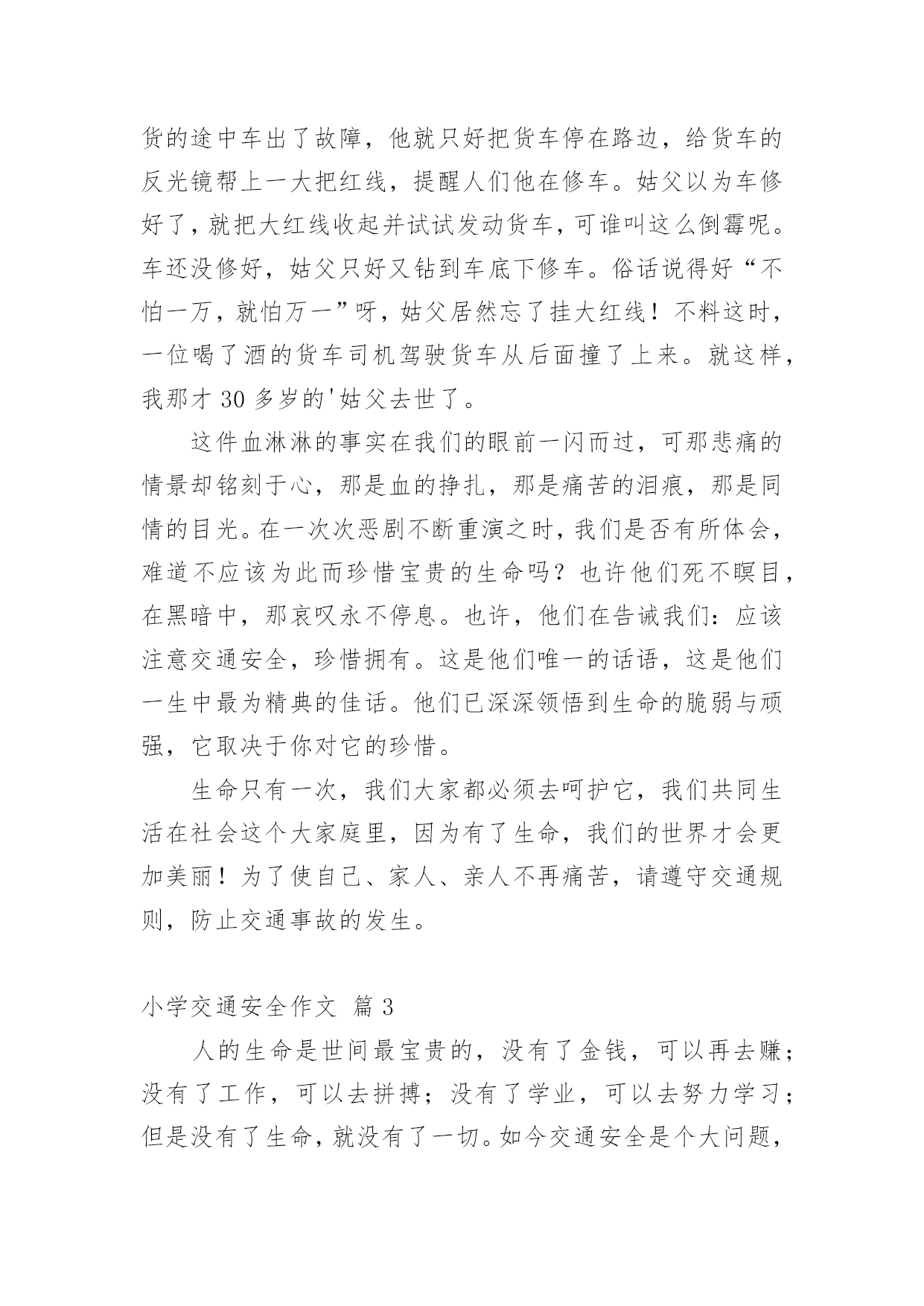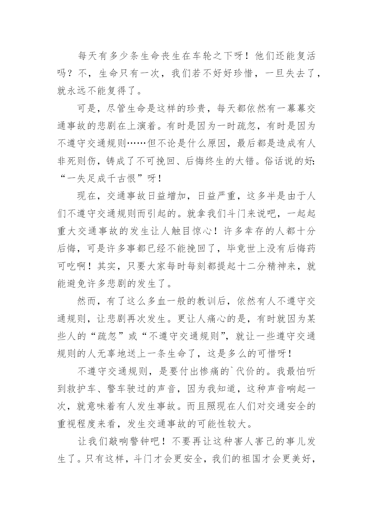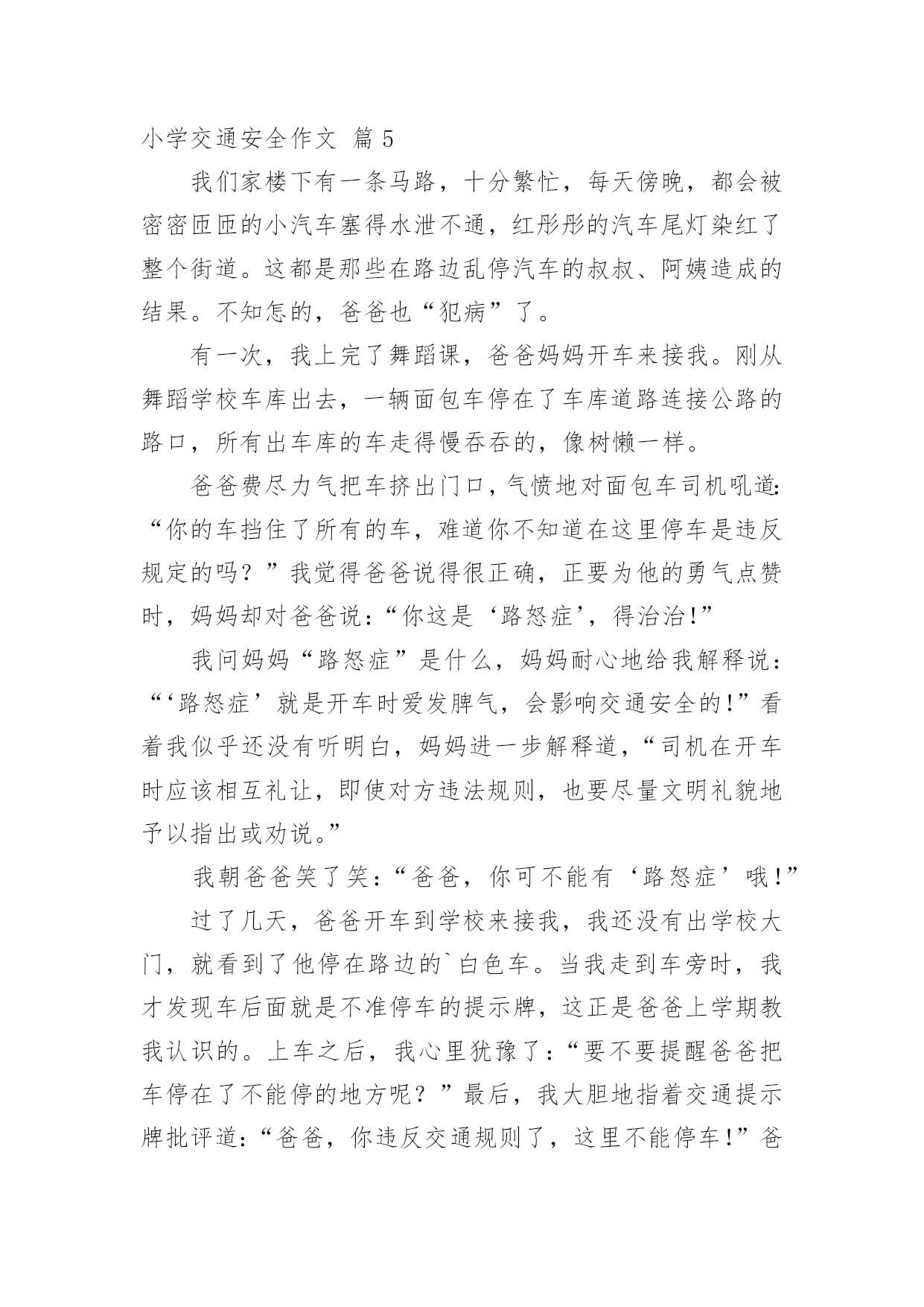 小学交通安全作文【精品】小学交通安全作文锦集九篇在我们平凡的日常里,大家对作文都不陌生吧,写作文是培养人们的观察力、联想力、想象力、思考力和记忆力的重要手段。你所见过的作文是什么样的呢?下面是小编为大家收集的小学交通安全作文10篇,仅供参考,希望能够帮助到大家。小学交通安全作文篇1交通这一个词是我们每天都能看到的。但是有一些人有不遵守规则,却把生命不当成一回事。我们小学生上学,放学或假期间,都能看到公路,但有些人把公路不当一回事,在我国每年交通事故死亡人数打到十万人以上,每五分钟死一人,每一分钟伤一人。是因为有的人闯红灯,有的人在公路上疯狂打闹,还有的人甚至把公路当成踢球场等。有一件案例是我亲眼所见的,一人空气清新的'早晨,我正高高兴兴地上学,当我走到这里,眼看过条公路就到学校,我看到左边有车来了,我停止脚步,离我左边有远的四(5)班的一个学生,正步覆匆匆地走过去,就在这时,车子的轮子轧到他的脚,把他的脚骨折了。看到这一幕,我心里一惊,心想如果不遵守交通规则,就是这样的下场。这件事情深深地记在我的心中,每天上学放学的时候,总是叮嘱我自己要遵守交通规则。语文老师曾讲过“宁停十分,不抢一秒”的话,意思是:什么时候或怎样着急赶路,一定站在公路两旁等十分钟,抢一秒也不行,老师的话使我受益无穷。下面我给人们提出五点交通规则:一、饮酒时不能开车,开车不饮酒。二、看红绿灯,红灯停、绿灯行,走斑马线。三、不能把公路当足球场。四、不闯红灯,从我做起。五、不能在公路上疯狂打闹。交通规则从我做起,不闯红灯,不疯狂打闹。希望我们能记住这句话“宁停十分,不抢一秒”吧!也希望让我们做一个好市民。记住交通规则,注意安全,让我们的生命之树成长吧!小学交通安全作文篇2人的生活中,处处离不开交通,时时刻刻在交通之间徘徊,“交通安全”这个词大家都听过,可又有谁真正的遵守了呢?也许,一刹那的疏忽,会给你带来终身的遗憾。因此,为了朋友,为了家人,为了自己,我们应该遵守交通,做一个知法、守法的好公民。就拿我姑父说吧,他是一位货车司机,整天都要拉货。可这又有什么办法呢,还不是为了挣钱,有一次,姑父在拉货的途中车出了故障,他就只好把货车停在路边,给货车的反光镜帮上一大把红线,提醒人们他在修车。姑父以为车修好了,就把大红线收起并试试发动货车,可谁叫这么倒霉呢。车还没修好,姑父只好又钻到车底下修车。俗话说得好“不怕一万,就怕万一”呀,姑父居然忘了挂大红线!不料这时,一位喝了酒的货车司机驾驶货车从后面撞了上来。就这样,我那才30多岁的'姑父去世了。这件血淋淋的事实在我们的眼前一闪而过,可那悲痛的情景却铭刻于心,那是血的挣扎,那是痛苦的泪痕,那是同情的目光。在一次次恶剧不断重演之时,我们是否有所体会,难道不应该为此而珍惜宝贵的生命吗?也许他们死不瞑目,在黑暗中,那哀叹永不停息。也许,他们在告诫我们:应该注意交通安全,珍惜拥有。这是他们唯一的话语,这是他们一生中最为精典的佳话。他们已深深领悟到生命的脆弱与顽强,它取决于你对它的珍惜。生命只有一次,我们大家都必须去呵护它,我们共同生活在社会这个大家庭里,因为有了生命,我们的世界才会更加美丽!为了使自己、家人、亲人不再痛苦,请遵守交通规则,防止交通事故的发生。小学交通安全作文篇3人的生命是世间最宝贵的,没有了金钱,可以再去赚;没有了工作,可以去拼搏;没有了学业,可以去努力学习;但是没有了生命,就没有了一切。如今交通安全是个大问题,很多人因为酒后驾车而被捕。今天,我妈妈看见警察叔叔在一条道路中央走来走去,我以为是在抓小偷呢,后来打听才得知是在狠抓酒后驾车。我很好奇,连忙停下脚步来看个究竟。过了一会儿,忽然一辆白色奔驰轿车“摇摇晃晃”地驶来,它进入了警察们的.视线,只见它看到警察的手势后缓缓的停了下来。警察叔叔有礼貌地敬了个礼,探进车窗问他:“先生,今天您喝酒了吗?”那个驾驶员用手指着警察,头摇晃了几下,眼睛半睁半合,还理直气壮地回答:“没喝,谁喝了呀,你们多管闲事!”他不仅没有承认,反倒骂了警察几句。警察叔叔听着他愤愤不平的语气,闻着空中飘来的浓浓的白酒味,立刻给他做了测量,结果酒精度远远超标!围观的群众越来越多,有的甚至还议论纷纷:“这驾驶员太不像话了!居然拿自己的生命开玩笑!”不管他怎么反驳,警察叔叔还是把他押进了公安车。就这样,一个,两个……这天晚上,他们抓获了满满一车酒后驾车的人。茫茫深夜,警察叔叔为了我们的交通安全而不辞辛苦地工作着,他们希望所有的驾驶员喝酒不开车,开车不喝酒。我们要牢记警察叔叔的话,交通安全时刻记在我们心中!小学交通安全作文篇4交通安全我先行,我们有遵守交通法规,在马路上的斑马线上印下一个个稳稳地足迹,千万不要在路上有飞驰的印记。今天是10月19日,平谷交通大队的陈警官来我们平谷六小,为全校师生做“交通安全教
