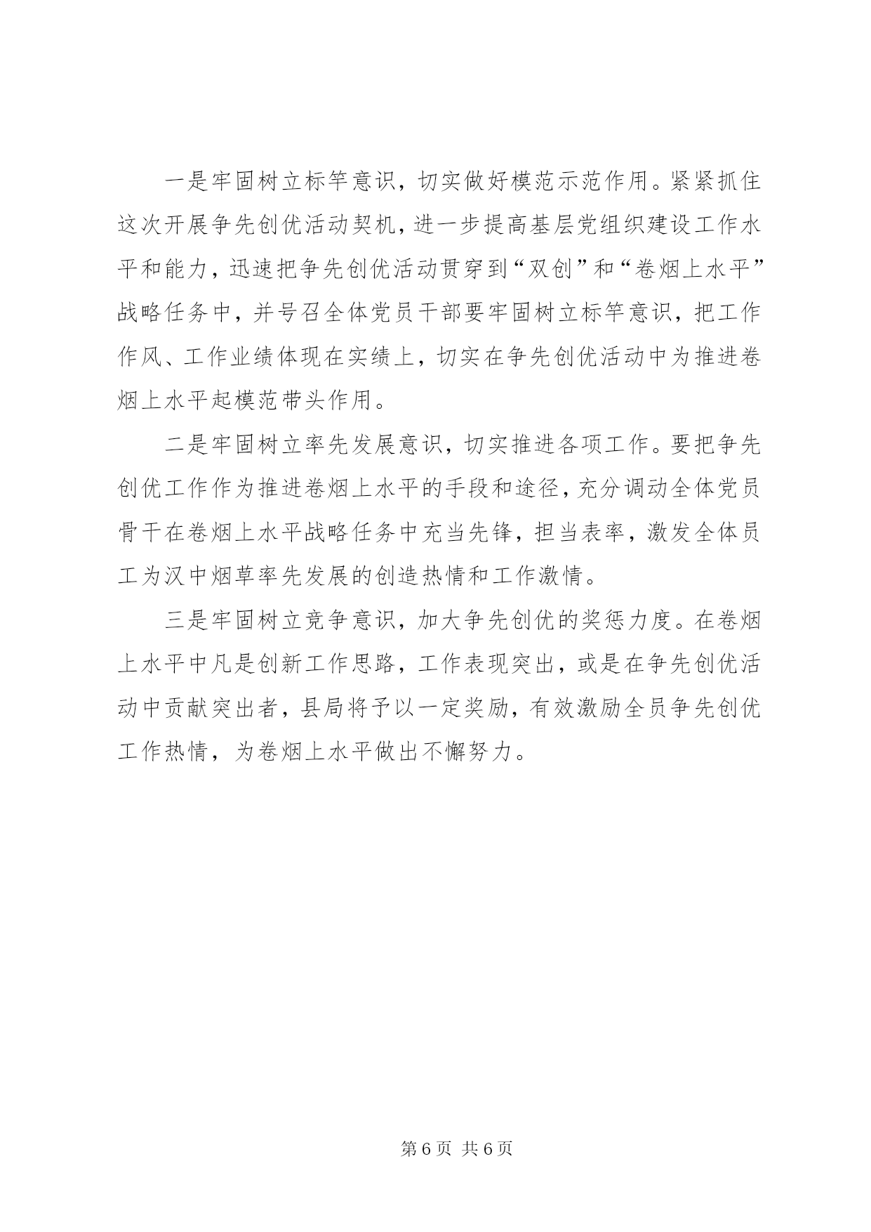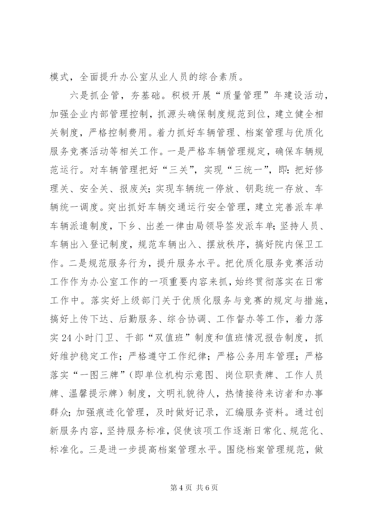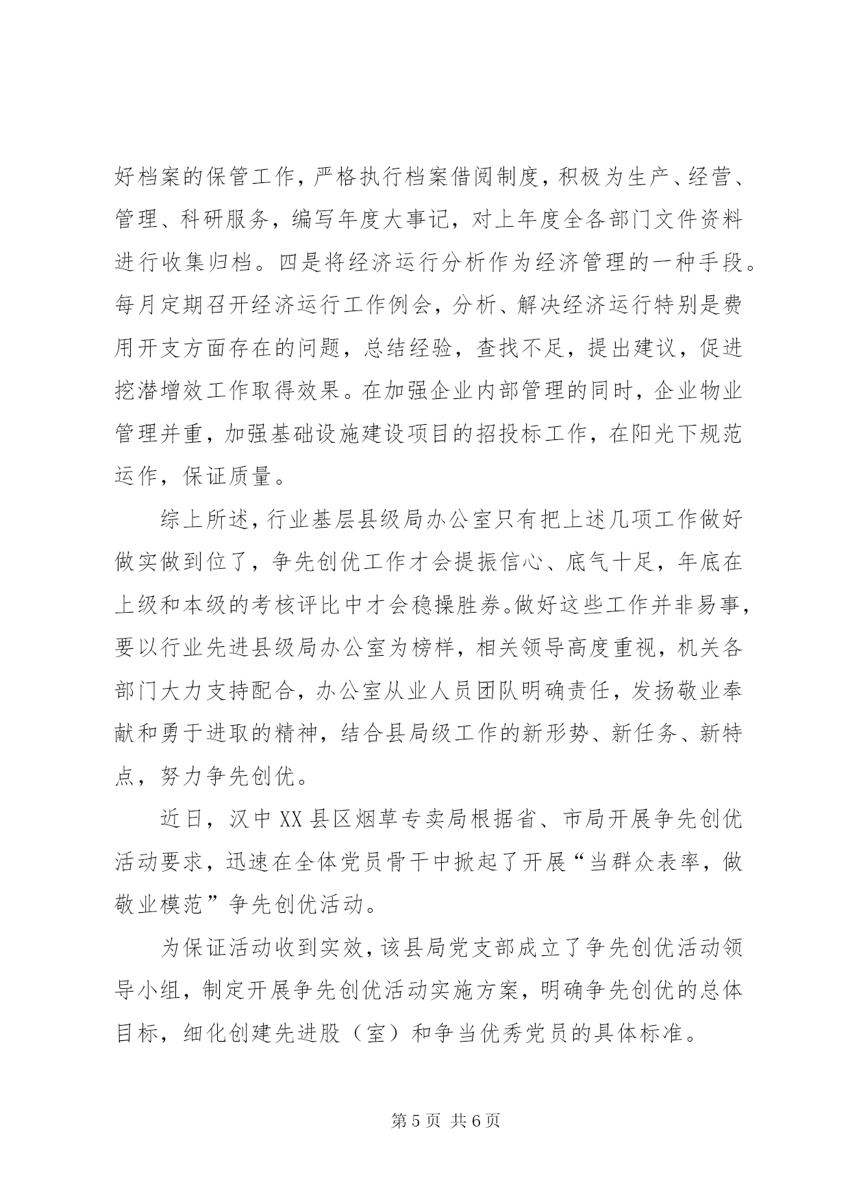 第PAGE\*Arabic\*MERGEFORMAT6页共NUMPAGES\*MERGEFORMAT6页争先创优活动方案近几年来,行业基层县级烟草专卖局办公室在上级主管部门和本局党组的指导重视下,紧紧围绕宣传报道、后勤服务、综合协调、安全保卫、信息化建设、信访维稳等重点工作,潜心办文、办会、办事,努力搞好服务,精细日常管理,各项工作不断取得良好成绩,但有的县级局办公室功夫下了不少,成绩却平平。针对2009年行业基层县级局办公室工作的新形势、新任务、新特点,如何实现争先创优呢。笔者认为,在明确争先创优目标的基础上,县级局办公室更应主动从以下几个方面作出努力。一是抓宣传,树形象。办公室发挥宣传报道的主力军与排头兵作用,积极开展新闻报道的采写、编辑与报送工作,力争在行业主流媒体的信息用稿数量与质量都有较大突破;制订奖励政策,激励机关各部门重视宣传工作,培养、挖掘写作人才,企业形成“众人拾柴火焰高”的宣传工作新格局;将市(州)局下达的行业相关媒体信息报道任务分解到各部门,各部门要落实责任到岗位、到人员;进一步加大督查考核力度,年底奖罚兑现,形成人人肩上有担子、个个头上有任务、齐心协力抓宣传、勤下基层搞调研的良好氛围。二是抓安全,保平安。建立健全一把手负总责,主管领导具体管,办公室具体抓,一级抓一级,层层抓落实的安全保卫工作格局。安全工作要进一步落实安全生产责任制,把上级下达的安全工作任务目标分解到各部门,层层签订责任状,形成上下结合的安全责任网络机制和制约机制。继续实行风险抵押承包责任机制,强化车辆交通运行安全管理,注重资金安全管理,突出卷烟配送车辆的安全管理;提高安全检查频率,重抓安全不稳定因素排查,侧重隐患整改,确保全年实现“无火灾事故、无工伤事故、无设备事故、无刑事经济案件、无交通事故、无盗窃事故”的六无目标。三是抓信息,促管理。紧紧围绕全年信息化工作的目标任务,扎实工作、努力创新,以信息化建设为平台,促进管理规范化、业务流程化、决策科学化。信息化建设工作紧扣行业工作主题,强化制度建设,落实工作措施,注重实际操作,务求工作实效,力促信息化建设工作再上新台阶。四是抓信访,维稳定。继续加大信访、维稳工作力度,全面掌握情况,认真分析员工思想动态,确保企业和谐稳定。一要成立信访维稳工作领导小组。落实信访专职人员,落实办公场地,制度上墙,完善领导接待日制度,每个工作日都有局领导接待,建立信访层层责任制,局领导、信访部门与各部门齐抓共管,共同做好信访维稳工作。二要加强宣传,公开办事程序,防范好、处置好信访事件。充分利用会议、标语、宣传资料等广泛宣传信访维稳条例、工作制度和信访知识,并认真做好信访个案的调处工作,热情接待来访者和办事群众,耐心细致地进行疏导,并将领导接待日、接待地点、联系电话对外公开,向群众告知了信访程序、要求等。三要严格程序,依法行政。加大信访、维稳工作的处置力度。认真执行信访条例和上级信访、维稳文件精神,依法开展信访工作,对来访群众作好接待工作,并认真登记,及时给予明确答复。四要畅通信息,疏通信访渠道,建立健全信访网络机制。机关各部门信访信息员,各级信访、维稳责任人和信息报告员都要确保24小时通讯畅通。单位每月至少召开一次信访、维稳专题会,分析研究当前信访、维稳形势,布置下阶段工作。五要开展好“特防期”维稳工作。开展“特防期”督查行动,坚持做到“四查四到位”,即:查思想,督促各部门高度重视人员稳定和安全生产经营安全工作;查制度,督促各部门建立“制度完善、责任明确,齐抓共管”的安全责任体系;查现场,紧盯重点安全部位、现场安全薄弱环节,及时发现问题、消除隐患;查记录,督促安全管理到位,规范日常安全管理。五是抓队伍,强素质。全面加强办公室队伍建设,提高队伍整体素质。通过对办公室从业人员的德、能、勤、绩、效的强化考核,抓好办公室从业人员的思想作风建设;采取多种多样的培训方式,抓好办公室从业人员的业务培训,积极参加省、市局统一安排的各项培训考试,还根据实际情况,每月组织办公室从业人员定期,或不定期举办一次专业知识培训,以行之有效的培训模式,全面提升办公室从业人员的综合素质。六是抓企管,夯基础。积极开展“质量管理”年建设活动,加强企业内部管理控制,抓源头确保制度规范到位,建立健全相关制度,严格控制费用。着力抓好车辆管理、档案管理与优质化服务竞赛活动等相关工作。一是严格车辆管理规定,确保车辆规范运行。对车辆管理把好“三关”,实现“三统一”,即:把好修理关、安全关、报废关;实现车辆统一停放、钥匙统一存放、车辆统一调度。突出抓好车辆交通运行安全管理,建立完善派车单车辆派遣制度,下乡、出差一律由局领导签发派车单;坚持人员、车辆出入登记制度,规范车辆出入、摆放秩序,搞好院内保卫工作。二是规范服务行为,提升服务水平。把优
