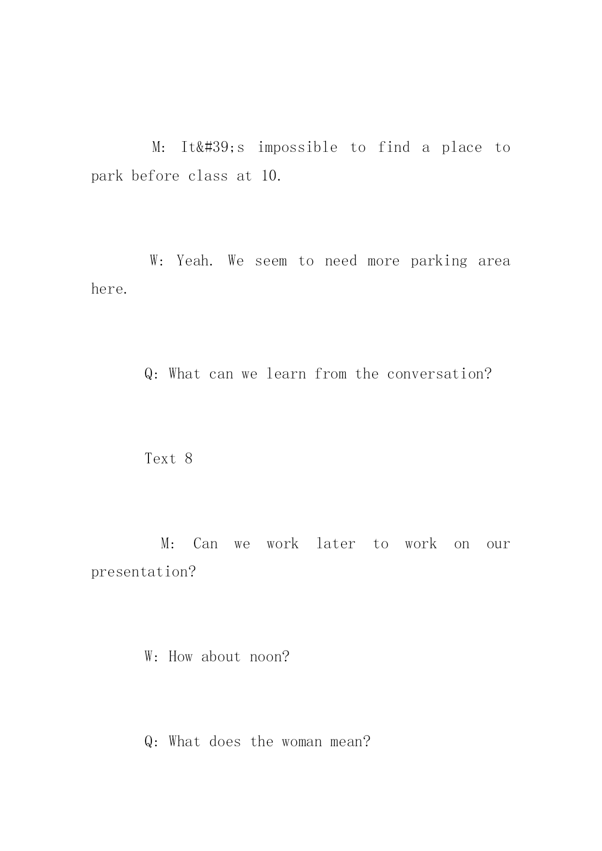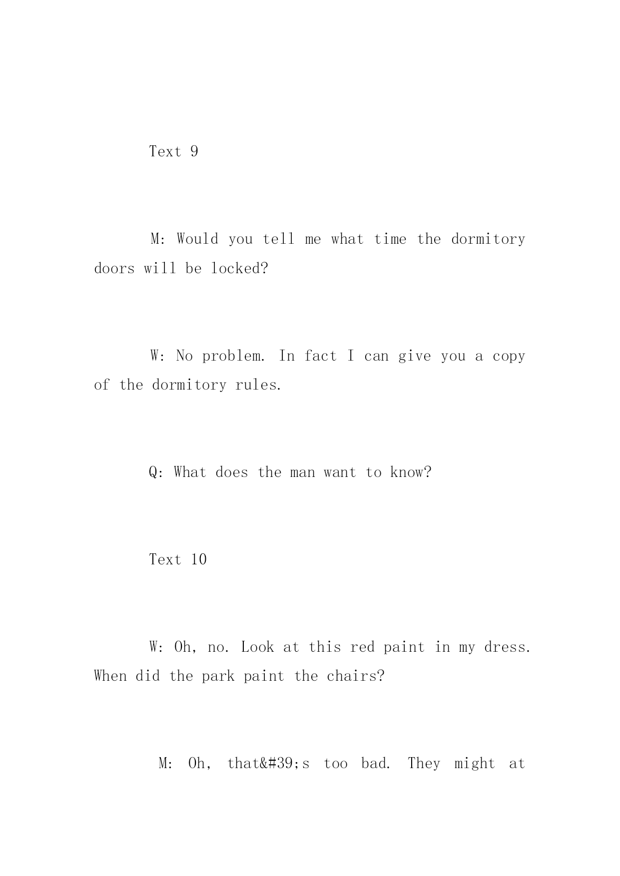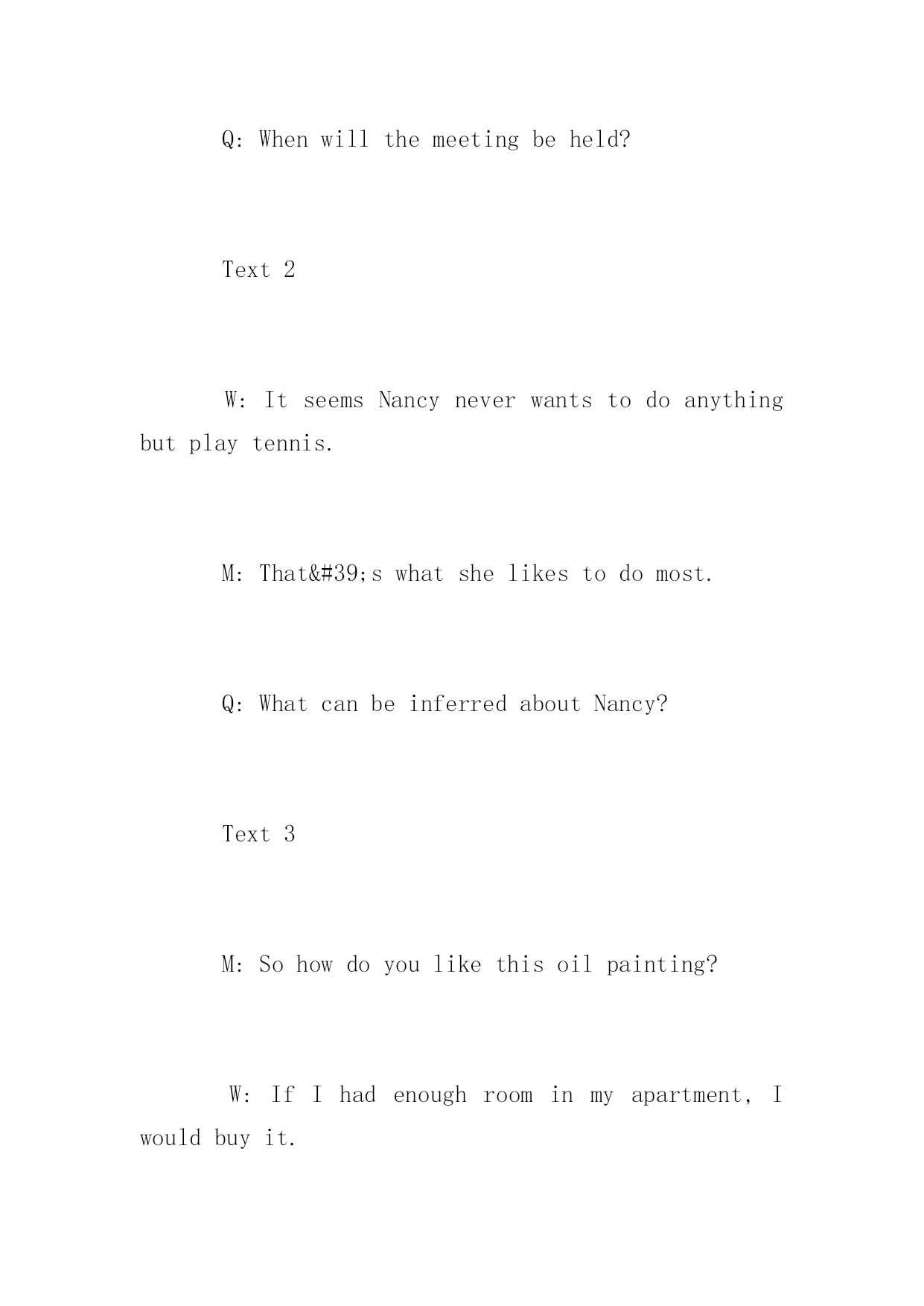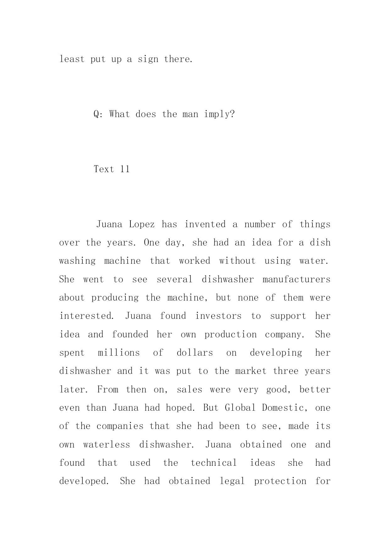 高考英语专项训练材料高考英语专项训练材料高考英语听力主要是考查考生对所听信息的正确理解能力和快速反应能力。为了帮助大家备考高考英语,小编分享了一些高考英语听力题,希望能对大家有所帮助!听力原文Text1M:WillMrs.Johnsonbeheretomorrowforthemeeting?W:Probablynot.Shecalledthisafternoontoputoffthemeetingtonextweek.Q:Whenwillthemeetingbeheld?Text2W:ItseemsNancyneverwantstodoanythingbutplaytennis.M:That'swhatshelikestodomost.Q:WhatcanbeinferredaboutNancy?Text3M:Sohowdoyoulikethisoilpainting?W:IfIhadenoughroominmyapartment,Iwouldbuyit.Q:Wheredoestheconversationprobablytakeplace?Text4W:Peter,wanttotakeawalk?M:No,Ihavetogodowntotheyardnow.Iambuildingsomebookshelves.Q:WhatwouldPeterprobablydonext?Text5M:Thedriver'sbeenoutsideinthetaxifor10minutesnow.Shallwehurryup?W:That'sallright.We'repayinghimanyway.Q:Whoarethespeakerstalkingabout?Text6M:Thecopymachineisbrokenagain.I'llcallforservice.W:It'sonlyjammed,justremovethepapersstuckinit.I'llshowyou.Q:Whatwillthewomando?Text7M:It'simpossibletofindaplacetoparkbeforeclassat10.W:Yeah.Weseemtoneedmoreparkingareahere.Q:Whatcanwelearnfromtheconversation?Text8M:Canweworklatertoworkonourpresentation?W:Howaboutnoon?Q:Whatdoesthewomanmean?Text9M:Wouldyoutellmewhattimethedormitorydoorswillbelocked?W:Noproblem.InfactIcangiveyouacopyofthedormitoryrules.Q:Whatdoesthemanwanttoknow?Text10W:Oh,no.Lookatthisredpaintinmydress.Whendidtheparkpaintthechairs?M:Oh,that'stoobad.Theymightatleastputupasignthere.Q:Whatdoesthemanimply?Text11JuanaLopezhasinventedanumberofthingsovertheyears.Oneday,shehadanideaforadishwashingmachinethatworkedwithoutusingwater.Shewenttoseeseveraldishwashermanufacturersaboutproducingthemachine,butnoneofthemwereinterested.Juanafoundinvestorstosupportherideaandfoundedherownproductioncompany.Shespentmillionsofdollarsondevelopingherdishwasheranditwasputtothemarketthreeyearslater.Fromthenon,saleswereverygood,bettereventhanJuanahadhoped.ButGlobalDomestic,oneofthecompaniesthatshehadbeentosee,madeitsownwaterlessdishwasher.Juanaobtainedoneandfoundthatusedthete