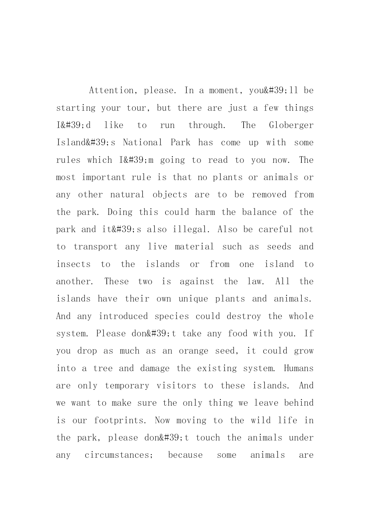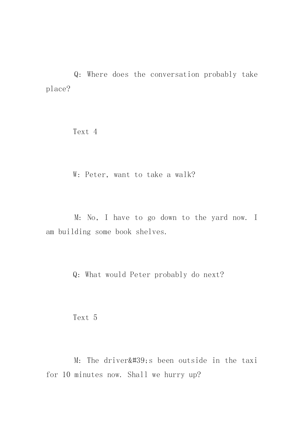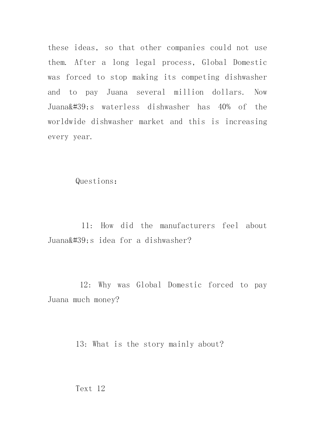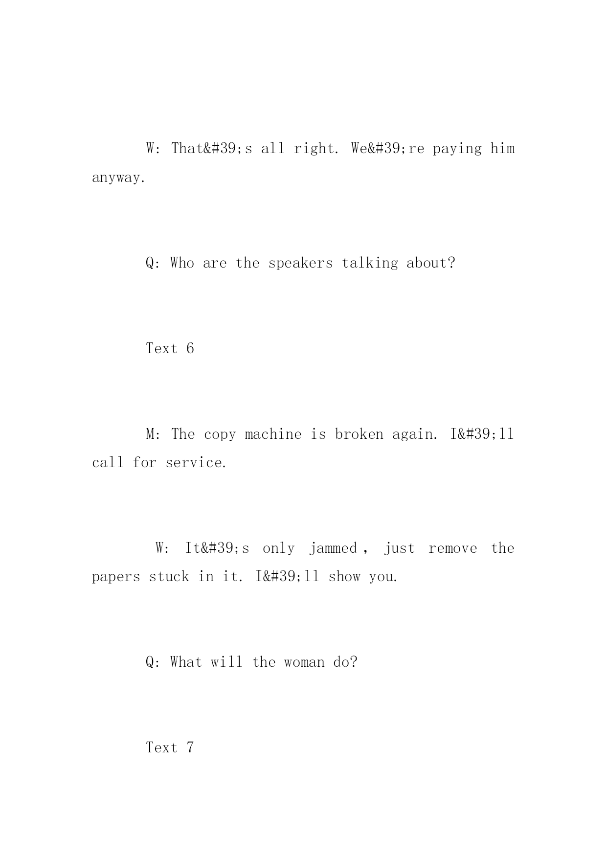 高考英语专项训练材料高考英语专项训练材料高考英语听力主要是考查考生对所听信息的正确理解能力和快速反应能力。为了帮助大家备考高考英语,小编分享了一些高考英语听力题,希望能对大家有所帮助!听力原文Text1M:WillMrs.Johnsonbeheretomorrowforthemeeting?W:Probablynot.Shecalledthisafternoontoputoffthemeetingtonextweek.Q:Whenwillthemeetingbeheld?Text2W:ItseemsNancyneverwantstodoanythingbutplaytennis.M:That'swhatshelikestodomost.Q:WhatcanbeinferredaboutNancy?Text3M:Sohowdoyoulikethisoilpainting?W:IfIhadenoughroominmyapartment,Iwouldbuyit.Q:Wheredoestheconversationprobablytakeplace?Text4W:Peter,wanttotakeawalk?M:No,Ihavetogodowntotheyardnow.Iambuildingsomebookshelves.Q:WhatwouldPeterprobablydonext?Text5M:Thedriver'sbeenoutsideinthetaxifor10minutesnow.Shallwehurryup?W:That'sallright.We'repayinghimanyway.Q:Whoarethespeakerstalkingabout?Text6M:Thecopymachineisbrokenagain.I'llcallforservice.W:It'sonlyjammed,justremovethepapersstuckinit.I'llshowyou.Q:Whatwillthewomando?Text7M:It'simpossibletofindaplacetoparkbeforeclassat10.W:Yeah.Weseemtoneedmoreparkingareahere.Q:Whatcanwelearnfromtheconversation?Text8M:Canweworklatertoworkonourpresentation?W:Howaboutnoon?Q:Whatdoesthewomanmean?Text9M:Wouldyoutellmewhattimethedormitorydoorswillbelocked?W:Noproblem.InfactIcangiveyouacopyofthedormitoryrules.Q:Whatdoesthemanwanttoknow?Text10W:Oh,no.Lookatthisredpaintinmydress.Whendidtheparkpaintthechairs?M:Oh,that'stoobad.Theymightatleastputupasignthere.Q:Whatdoesthemanimply?Text11JuanaLopezhasinventedanumberofthingsovertheyears.Oneday,shehadanideaforadishwashingmachinethatworkedwithoutusingwater.Shewenttoseeseveraldishwashermanufacturersaboutproducingthemachine,butnoneofthemwereinterested.Juanafoundinvestorstosupportherideaandfoundedherownproductioncompany.Shespentmillionsofdollarsondevelopingherdishwasheranditwasputtothemarketthreeyearslater.Fromthenon,saleswereverygood,bettereventhanJuanahadhoped.ButGlobalDomestic,oneofthecompaniesthatshehadbeentosee,madeitsownwaterlessdishwasher.Juanaobtainedoneandfoundthatusedthete