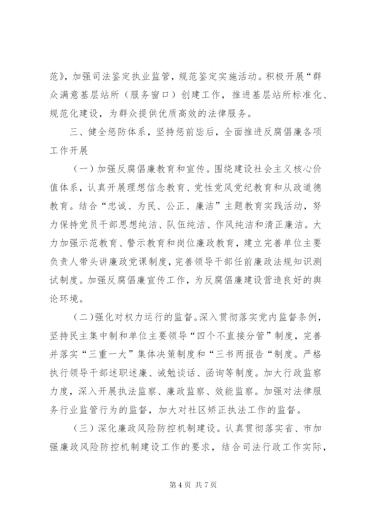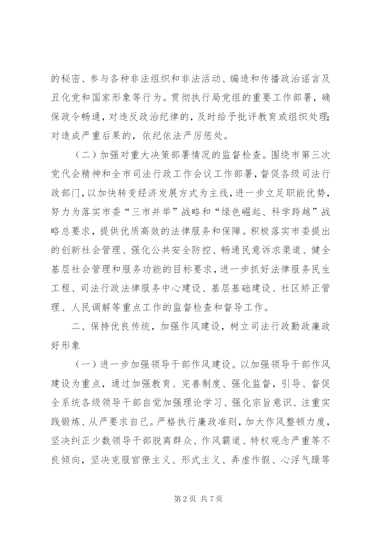 第PAGE\*Arabic\*MERGEFORMAT7页共NUMPAGES\*MERGEFORMAT7页司法行政局纪检监察工作安排2012年全市司法行政系统纪检监察工作总体要求是。高举中国特色社会主义伟大旗帜,以邓小平理论和“三个代表”重要思想为指导,深入贯彻落实科学发展观、党的十七大以来历次中央全会和市第三次党代会精神,按照上级部门对纪检监察工作的部署和要求,围绕省、市司法行政工作会议精神,坚持标本兼治、综合治理、惩防并举、注重预防的方针,有效推进具有司法行政特色的惩治和预防腐败体系建设,严格执行党风廉政建设责任制,扎实开展党风党性党纪教育,深入推进廉政风险防控机制建设,强化监督检查职能,为确保司法行政系统健康发展提供有力保障,迎接党的十八大胜利召开。一、严明党的纪律,加强监督检查,确保重大决策部署的贯彻执行(一)严格执行党的政治纪律。坚持把维护党的政治纪律放在突出位置来抓。深入开展遵守政治纪律的教育和宣传,引导和督促全局干部职工和法律服务工作者坚定政治立场和政治方向,增强政治敏锐性和政治鉴别力,始终同党中央和省、市委保持高度一致。在重大问题上旗帜鲜明,在关键时刻和重大事件中经得起风浪考验。加强对政治纪律执行情况的监督检查,坚决反对和纠正散布违背党的理论和路线方针政策的意见、公开发表同中央决定相违背的言论、对中央的决策部署阳奉阴违、泄露党和国家的秘密、参与各种非法组织和非法活动、编造和传播政治谣言及丑化党和国家形象等行为。贯彻执行局党组的重要工作部署,确保政令畅通,对违反政治纪律的,及时给予批评教育或组织处理;对造成严重后果的,依纪依法严厉惩处。(二)加强对重大决策部署情况的监督检查。围绕市第三次党代会精神和全市司法行政工作会议工作部署,督促各级司法行政部门,以加快转变经济发展方式为主线,进一步立足职能优势,努力为落实市委“三市并举”战略和“绿色崛起、科学跨越”战略总要求,提供优质高效的法律服务和保障。积极落实市委提出的创新社会管理、强化公共安全防控、畅通民意诉求渠道、健全基层社会管理和服务功能的目标要求,进一步抓好法律服务民生工程、司法行政法律服务中心建设、基层基础建设、社区矫正管理、人民调解等重点工作的监督检查和督导工作。二、保持优良传统,加强作风建设,树立司法行政勤政廉政好形象(一)进一步加强领导干部作风建设。以加强领导干部作风建设为重点,通过加强教育、完善制度、强化监督,引导、督促全系统各级领导干部自觉加强理论学习、强化宗旨意识、注重实践锻炼、从严要求自己。严格执行廉政准则,加大作风整顿力度,坚决纠正少数领导干部脱离群众、作风霸道、特权观念严重等不良倾向,坚决克服官僚主义、形式主义、弄虚作假、心浮气躁等不良风气。进一步强化责任意识、公仆意识、服务意识,营造真抓实干的风气和干事创业的氛围,贯彻党的群众路线,坚持领导干部基层调研,在一线指导工作,在“进村入企大走访”活动中,坚持走下去、沉下去,帮助基层单位理清工作思路,破解发展难题,加快经济发展。(二)进一步加强司法行政机关政风建设。加强机关干部从政道德建设,治庸治懒,着力营造能共事、想干事、会干事、干成事、不出事的工作氛围;不断完善各项服务制度,全面推行服务承诺、首问负责、限时办结等工作制度。加强对执行力和效能建设的监督检查,执行效能建设“五条禁令”,严肃查处各种违规违纪行为,严格对失职渎职干部实行责任追究,促进机关效能建设。在效能建设和机关作风建设上,进一步强化干部身份证制度,对工作纪律实行逐月检查,每季度一通报,坚持并完善工作日签到制度,创新机关效能建设载体和内容。(三)进一步加强法律服务行风建设。不断深化社会主义法治理念教育,增强法律服务工作者特别是律师对中国特色社会主义的感情认同、理论认同、政治认同、道路认同,有效预防和坚决抵制错误政治观点和法学观点的影响与侵蚀。进一步加强律师行业党的建设,加强行业自律和诚信体系建设,完善律师执业评价考核和奖惩机制。进一步完善公证执业规范,加强执业监督,提高公证质量和社会公信力。深入贯彻《司法鉴定职业道德规范》,加强司法鉴定执业监管,规范鉴定实施活动。积极开展“群众满意基层站所(服务窗口)创建工作,推进基层站所标准化、规范化建设,为群众提供优质高效的法律服务。三、健全惩防体系,坚持惩前毖后,全面推进反腐倡廉各项工作开展(一)加强反腐倡廉教育和宣传。围绕建设社会主义核心价值体系,认真开展理想信念教育、党性党风党纪教育和从政道德教育。结合“忠诚、为民、公正、廉洁”主题教育实践活动,努力保持党员干部思想纯洁、队伍纯洁、作风纯洁和清正廉洁。大力加强示范教育、警示教育和岗位廉政教育,建立完善单位主要负责人带头讲廉政党课制度,完善领导干部任前廉政法规知识测试制度。加强反腐倡廉宣传工作,为反腐倡廉建设营造良好的舆论环