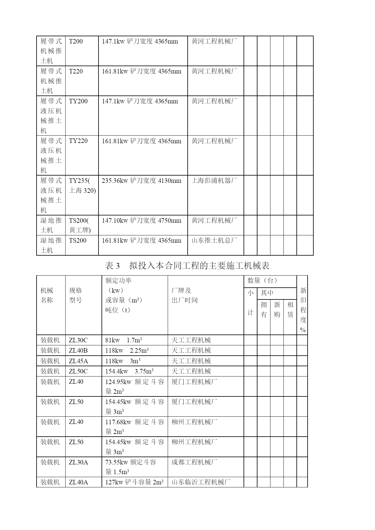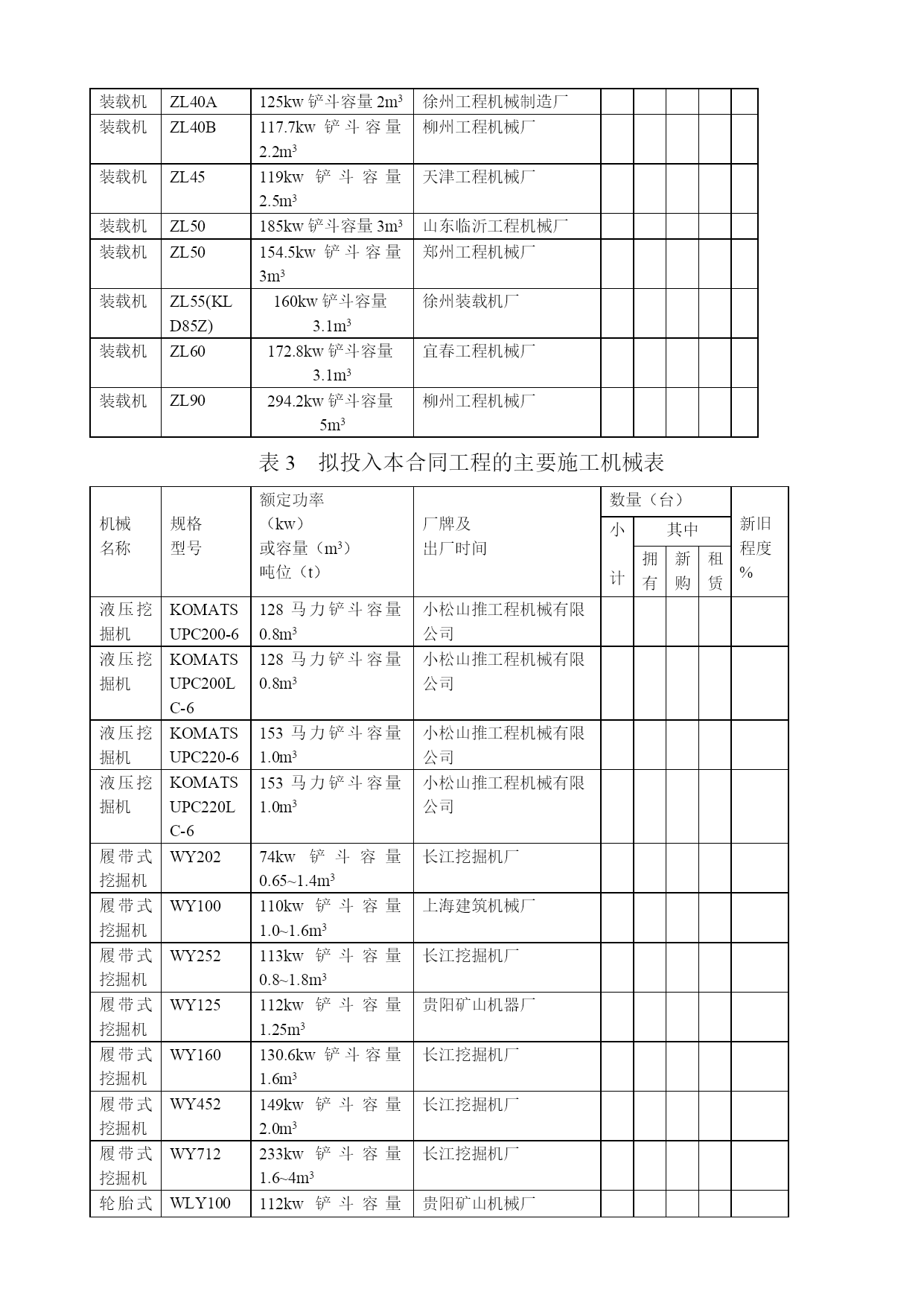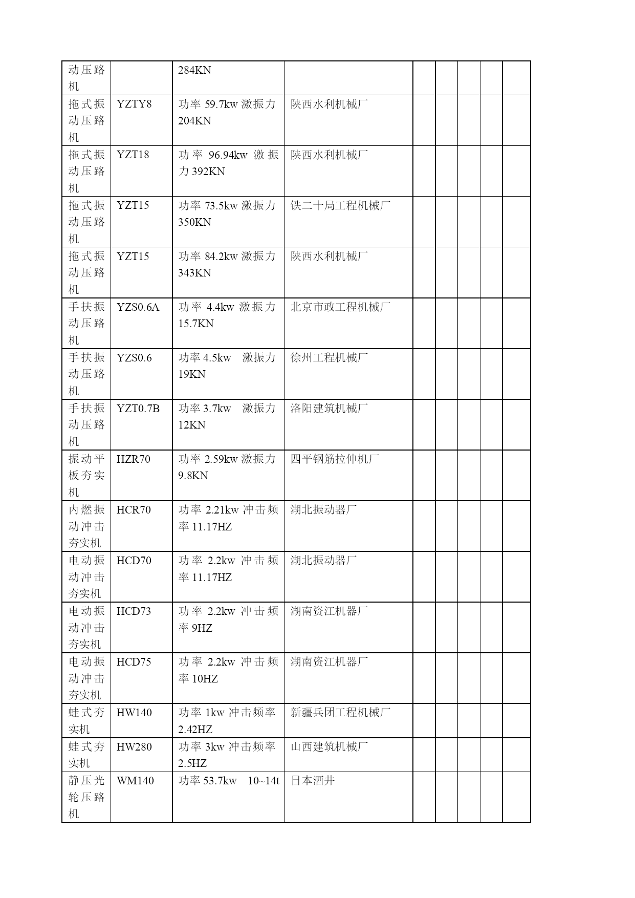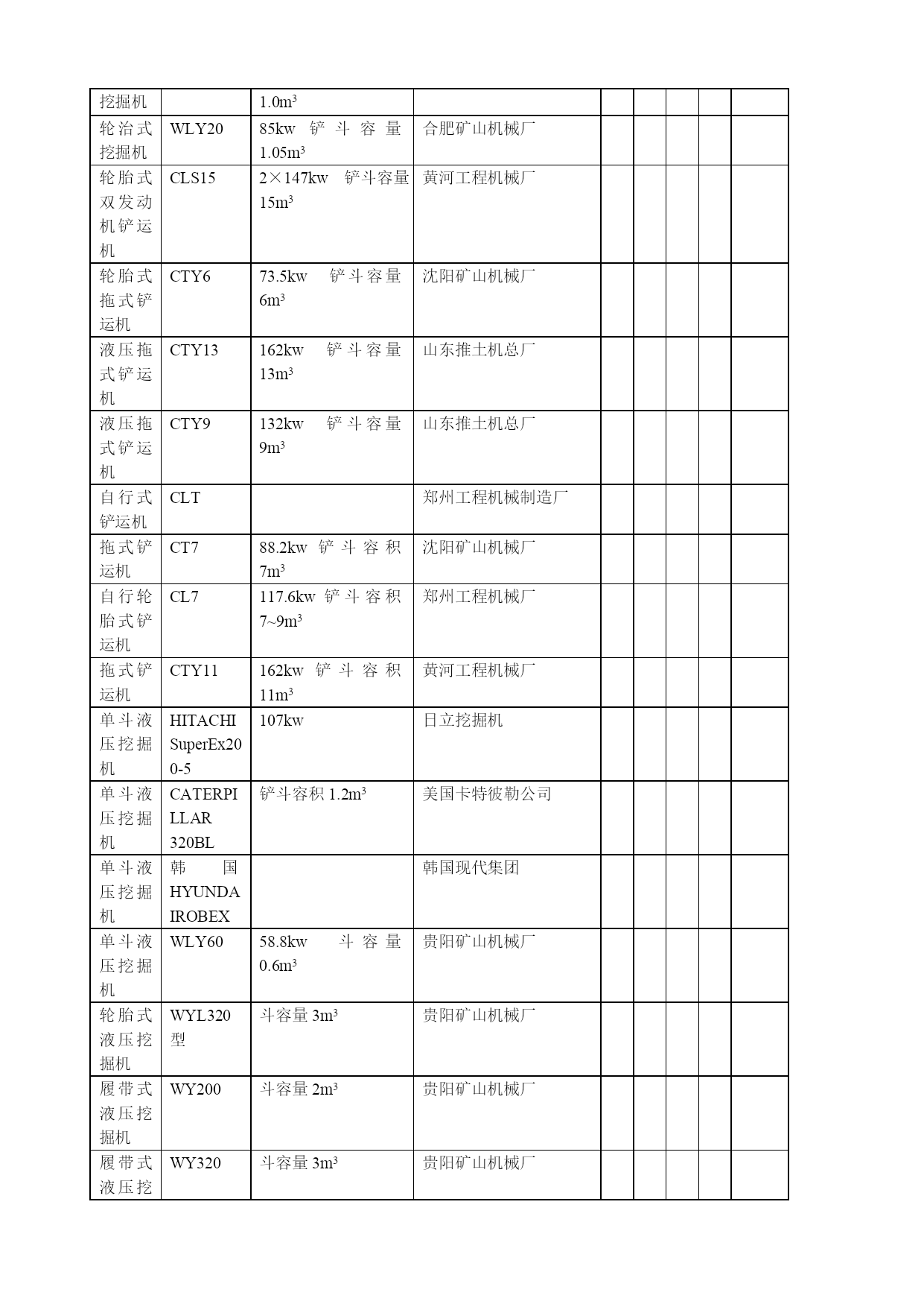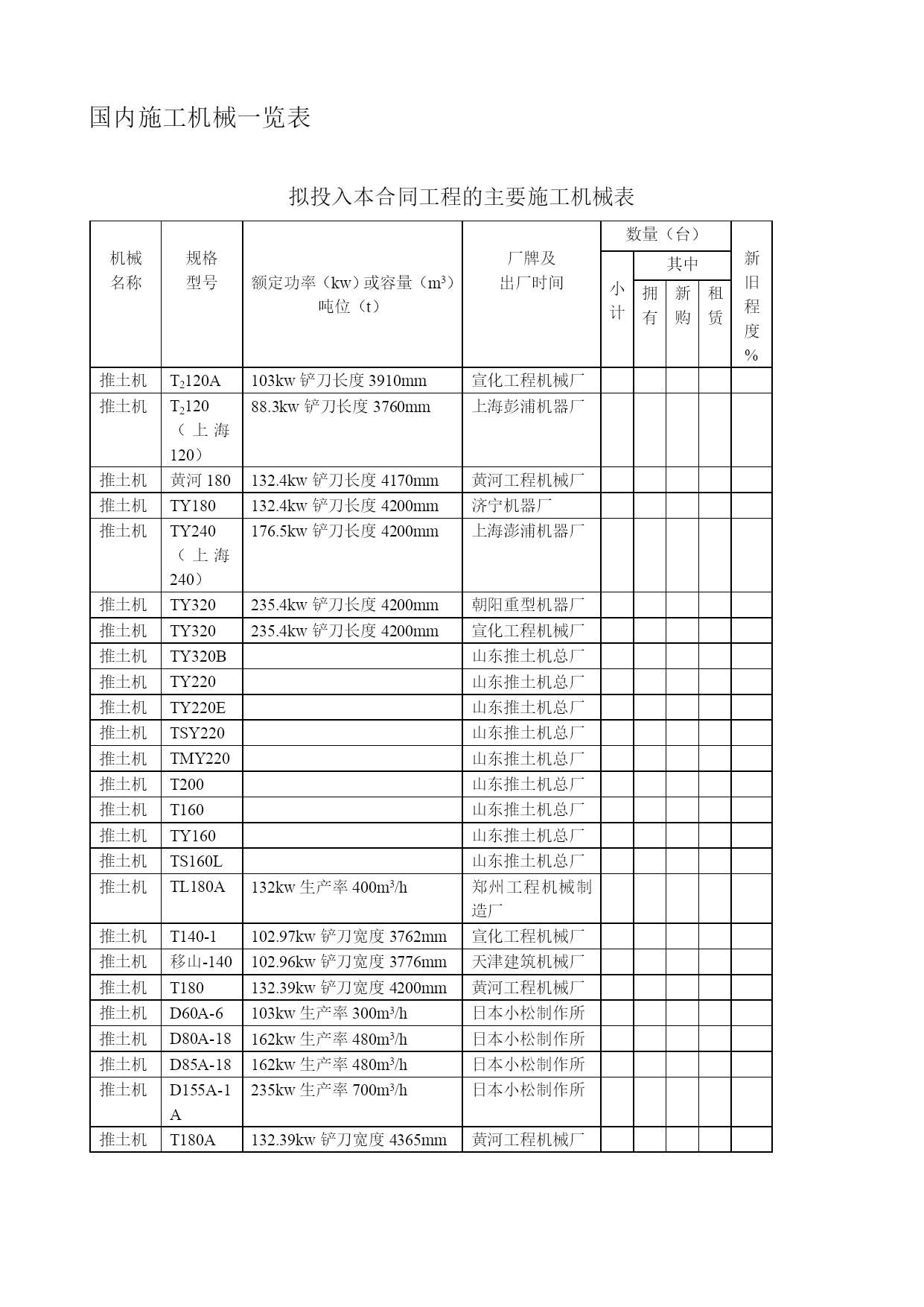 常用施工机械表优质资料(可以直接使用,可编辑优质资料,欢迎下载)国内施工机械一览表拟投入本合同工程的主要施工机械表机械名称规格型号额定功率(kw)或容量(m3)吨位(t)厂牌及出厂时间数量(台)新旧程度%小计其中拥有新购租赁推土机T2120A103kw铲刀长度3910mm宣化工程机械厂推土机T2120(上海120)88.3kw铲刀长度3760mm上海彭浦机器厂推土机黄河180132.4kw铲刀长度4170mm黄河工程机械厂推土机TY180132.4kw铲刀长度4200mm济宁机器厂推土机TY240(上海240)176.5kw铲刀长度4200mm上海澎浦机器厂推土机TY320235.4kw铲刀长度4200mm朝阳重型机器厂推土机TY320235.4kw铲刀长度4200mm宣化工程机械厂推土机TY320B山东推土机总厂推土机TY220山东推土机总厂推土机TY220E山东推土机总厂推土机TSY220山东推土机总厂推土机TMY220山东推土机总厂推土机T200山东推土机总厂推土机T160山东推土机总厂推土机TY160山东推土机总厂推土机TS160L山东推土机总厂推土机TL180A132kw生产率400m3/h郑州工程机械制造厂推土机T140-1102.97kw铲刀宽度3762mm宣化工程机械厂推土机移山-140102.96kw铲刀宽度3776mm天津建筑机械厂推土机T180132.39kw铲刀宽度4200mm黄河工程机械厂推土机D60A-6103kw生产率300m3/h日本小松制作所推土机D80A-18162kw生产率480m3/h日本小松制作所推土机D85A-18162kw生产率480m3/h日本小松制作所推土机D155A-1A235kw生产率700m3/h日本小松制作所推土机T180A132.39kw铲刀宽度4365mm黄河工程机械厂履带式机械推土机T200147.1kw铲刀宽度4365mm黄河工程机械厂履带式机械推土机T220161.81kw铲刀宽度4365mm黄河工程机械厂履带式液压机械推土机TY200147.1kw铲刀宽度4365mm黄河工程机械厂履带式液压机械推土机TY220161.81kw铲刀宽度4365mm黄河工程机械厂履带式液压机械推土机TY235(上海320)235.36kw铲刀宽度4130mm上海彭浦机器厂湿地推土机TS200(黄工牌)147.10kw铲刀宽度4750mm黄河工程机械厂湿地推土机TS200161.81kw铲刀宽度4365mm山东推土机总厂表3拟投入本合同工程的主要施工机械表机械名称规格型号额定功率(kw)或容量(m3)吨位(t)厂牌及出厂时间数量(台)新旧程度%小计其中拥有新购租赁装载机ZL30C81kw1.7m3天工工程机械装载机ZL40B118kw2.25m3天工工程机械装载机ZL45A118kw3m3天工工程机械装载机ZL50C154.4kw3.75m3天工工程机械装载机ZL40124.95kw额定斗容量2m3厦门工程机械厂装载机ZL50154.45kw额定斗容量3m3厦门工程机械厂装载机ZL40117.68kw额定斗容量2m3柳州工程机械厂装载机ZL50154.45kw额定斗容量3m3柳州工程机械厂装载机ZL30A73.55kw额定斗容量1.5m3成都工程机械厂装载机ZL40A127kw铲斗容量2m3山东临沂工程机械厂装载机ZL40A125kw铲斗容量2m3徐州工程机械制造厂装载机ZL40B117.7kw铲斗容量2.2m3柳州工程机械厂装载机ZL45119kw铲斗容量2.5m3天津工程机械厂装载机ZL50185kw铲斗容量3m3山东临沂工程机械厂装载机ZL50154.5kw铲斗容量3m3郑州工程机械厂装载机ZL55(KLD85Z)160kw铲斗容量3.1m3徐州装载机厂装载机ZL60172.8kw铲斗容量3.1m3宜春工程机械厂装载机ZL90294.2kw铲斗容量5m3柳州工程机械厂表3拟投入本合同工程的主要施工机械表机械名称规格型号额定功率(kw)或容量(m3)吨位(t)厂牌及出厂时间数量(台)新旧程度%小计其中拥有新购租赁液压挖掘机KOMATSUPC200-6128马力铲斗容量0.8m3小松山推工程机械有限公司液压挖掘机KOMATSUPC200LC-6128马力铲斗容量0.8m3小松山推工程机械有限公司液压挖掘机KOMATSUPC220-6153马力铲斗容量1.0m3小松山推工程机械有限公司液压挖掘机KOMATSUPC220LC-6153马力铲斗容量1.0m3小松山推工程机械有限公司履带式挖掘机WY20274kw铲斗容量0.65~1.4m3长江挖掘机厂履带式
