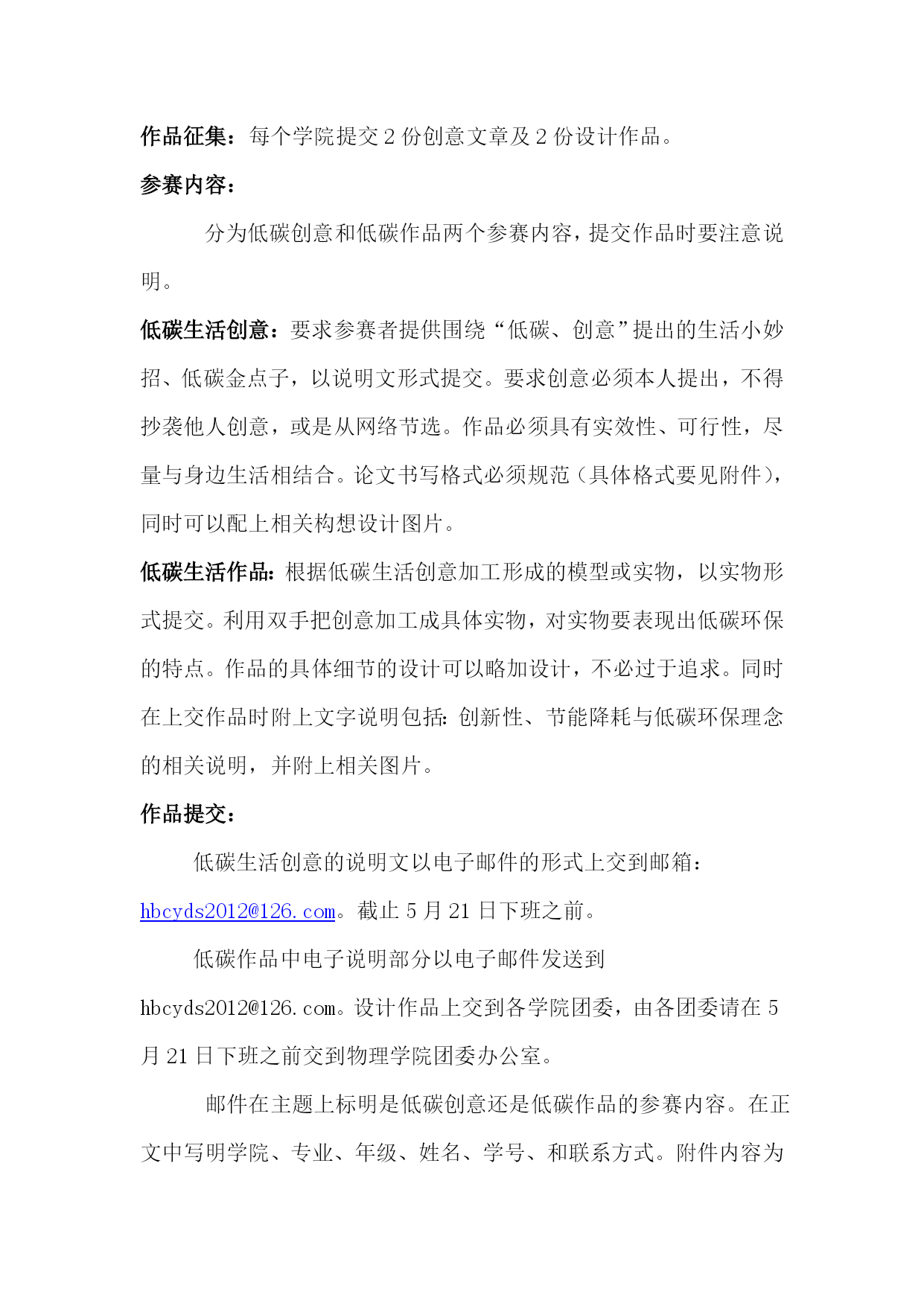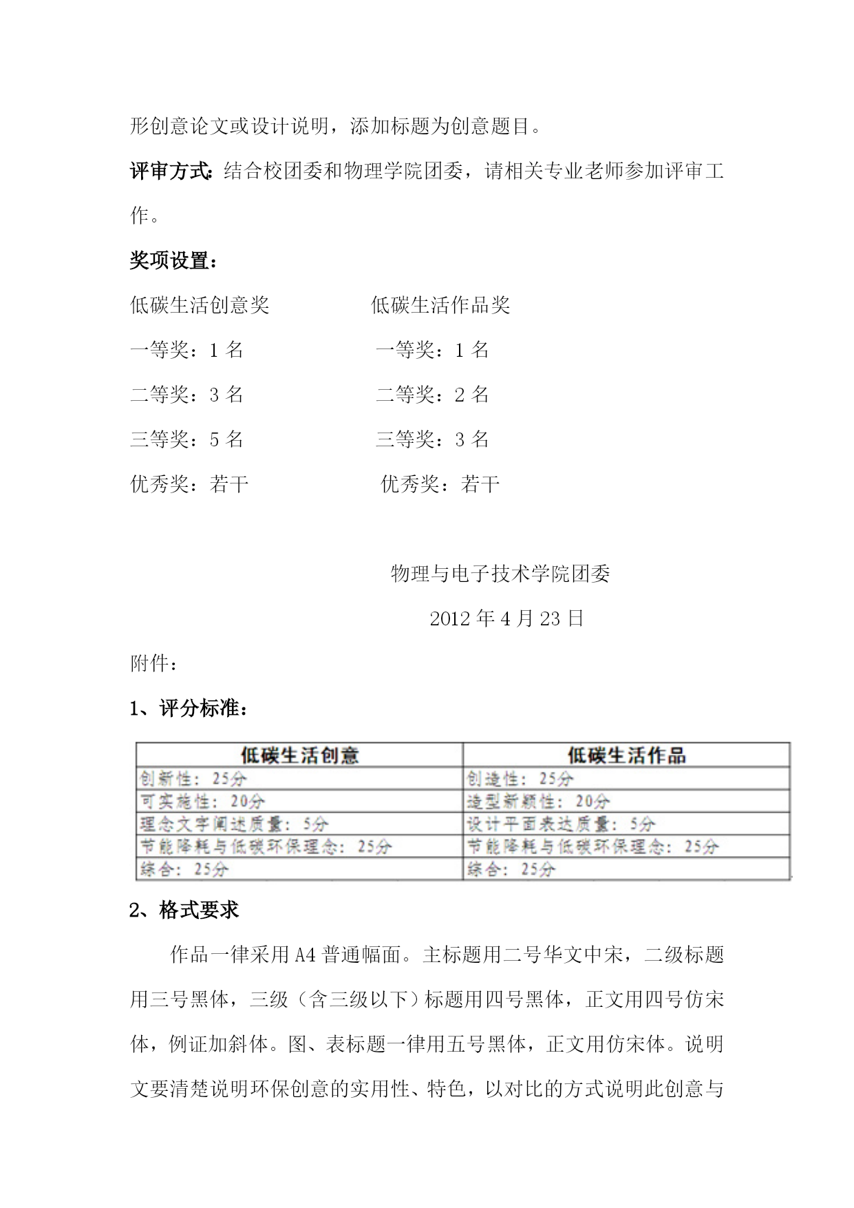 “低碳生活绿色校园”科技创意大赛活动方案一、活动目的:激发大学生低碳意识,倡导节能减碳,在校园生活中融入低碳创意,实践低碳生活。通过大赛,号召大学生积极参与节能减排,增强低碳意识,全面贯彻落实科学发展观,建设资源节约型和环境友好型社会,为缓解能源紧张,减轻环境压力,促进人与自然和谐相处,贡献自己的一份力量。二、活动形式:本次大赛面向全校大学生及各学院社团征集作品,分为“低碳生活创意”和“低碳生活作品”两类,作品涉及校园生活、公共生活和科技生活等方面。三、主办单位:共青团辽宁师范大学校委员会承办单位:辽宁师范大学物理与电子技术学院团委四、活动时间:作品征集:5月9日至5月21日作品评选:5月22日至5月25日作品展出:5月26日至5月31日五、实施方案:作品征集:每个学院提交2份创意文章及2份设计作品。参赛内容:分为低碳创意和低碳作品两个参赛内容,提交作品时要注意说明。低碳生活创意:要求参赛者提供围绕“低碳、创意”提出的生活小妙招、低碳金点子,以说明文形式提交。要求创意必须本人提出,不得抄袭他人创意,或是从网络节选。作品必须具有实效性、可行性,尽量与身边生活相结合。论文书写格式必须规范(具体格式要见附件),同时可以配上相关构想设计图片。低碳生活作品:根据低碳生活创意加工形成的模型或实物,以实物形式提交。利用双手把创意加工成具体实物,对实物要表现出低碳环保的特点。作品的具体细节的设计可以略加设计,不必过于追求。同时在上交作品时附上文字说明包括:创新性、节能降耗与低碳环保理念的相关说明,并附上相关图片。作品提交:低碳生活创意的说明文以电子邮件的形式上交到邮箱:HYPERLINK"mailto:hbcyds2012@126.com"hbcyds2012@126.com。截止5月21日下班之前。低碳作品中电子说明部分以电子邮件发送到hbcyds2012@126.com。设计作品上交到各学院团委,由各团委请在5月21日下班之前交到物理学院团委办公室。邮件在主题上标明是低碳创意还是低碳作品的参赛内容。在正文中写明学院、专业、年级、姓名、学号、和联系方式。附件内容为形创意论文或设计说明,添加标题为创意题目。评审方式:结合校团委和物理学院团委,请相关专业老师参加评审工作。奖项设置:低碳生活创意奖低碳生活作品奖一等奖:1名一等奖:1名二等奖:3名二等奖:2名三等奖:5名三等奖:3名优秀奖:若干优秀奖:若干物理与电子技术学院团委2012年4月23日附件:1、评分标准:2、格式要求作品一律采用A4普通幅面。主标题用二号华文中宋,二级标题用三号黑体,三级(含三级以下)标题用四号黑体,正文用四号仿宋体,例证加斜体。图、表标题一律用五号黑体,正文用仿宋体。说明文要清楚说明环保创意的实用性、特色,以对比的方式说明此创意与原有方式相比的优势,字数控制在3000字以内。