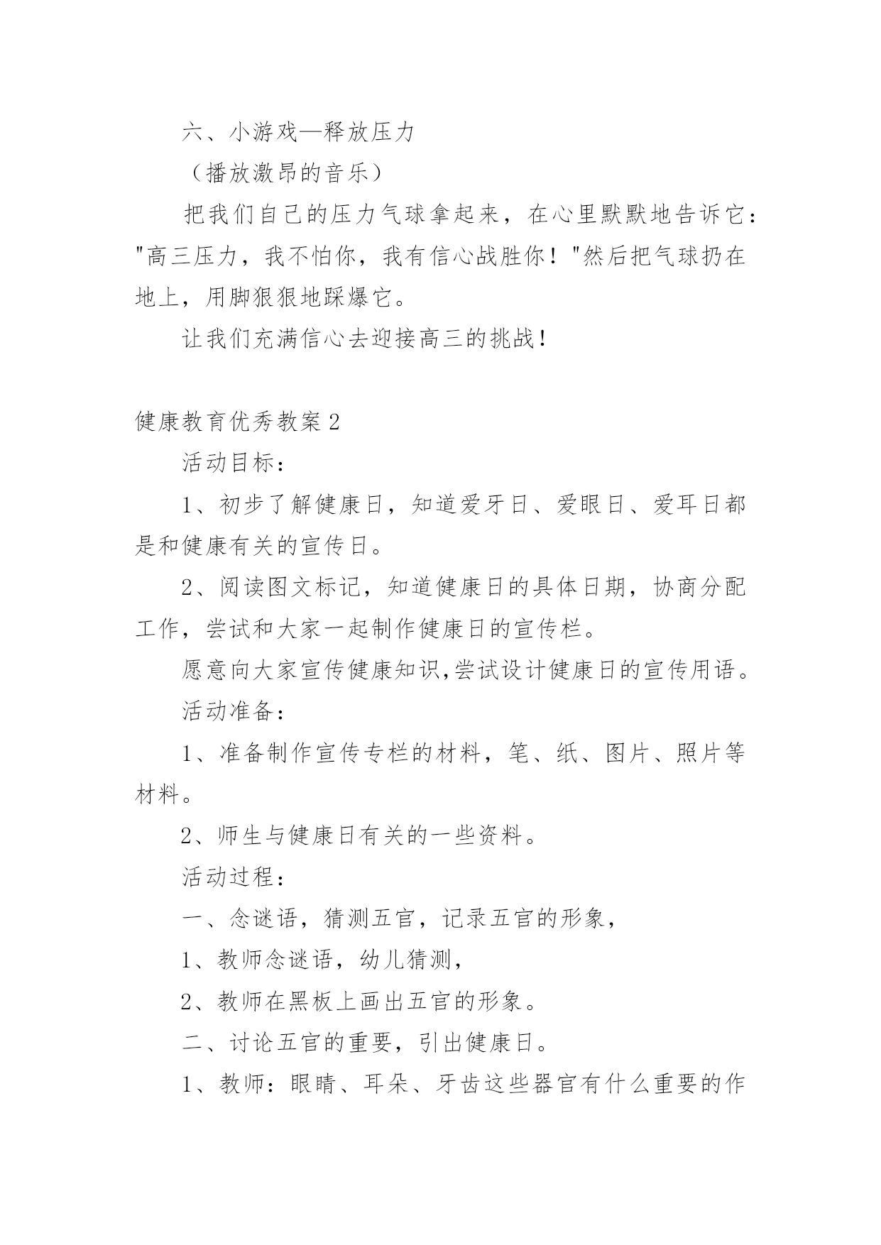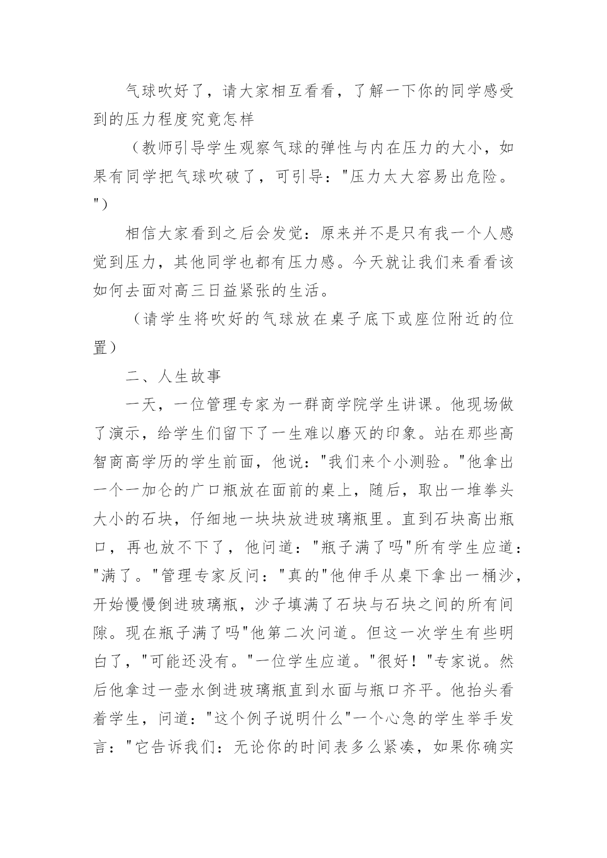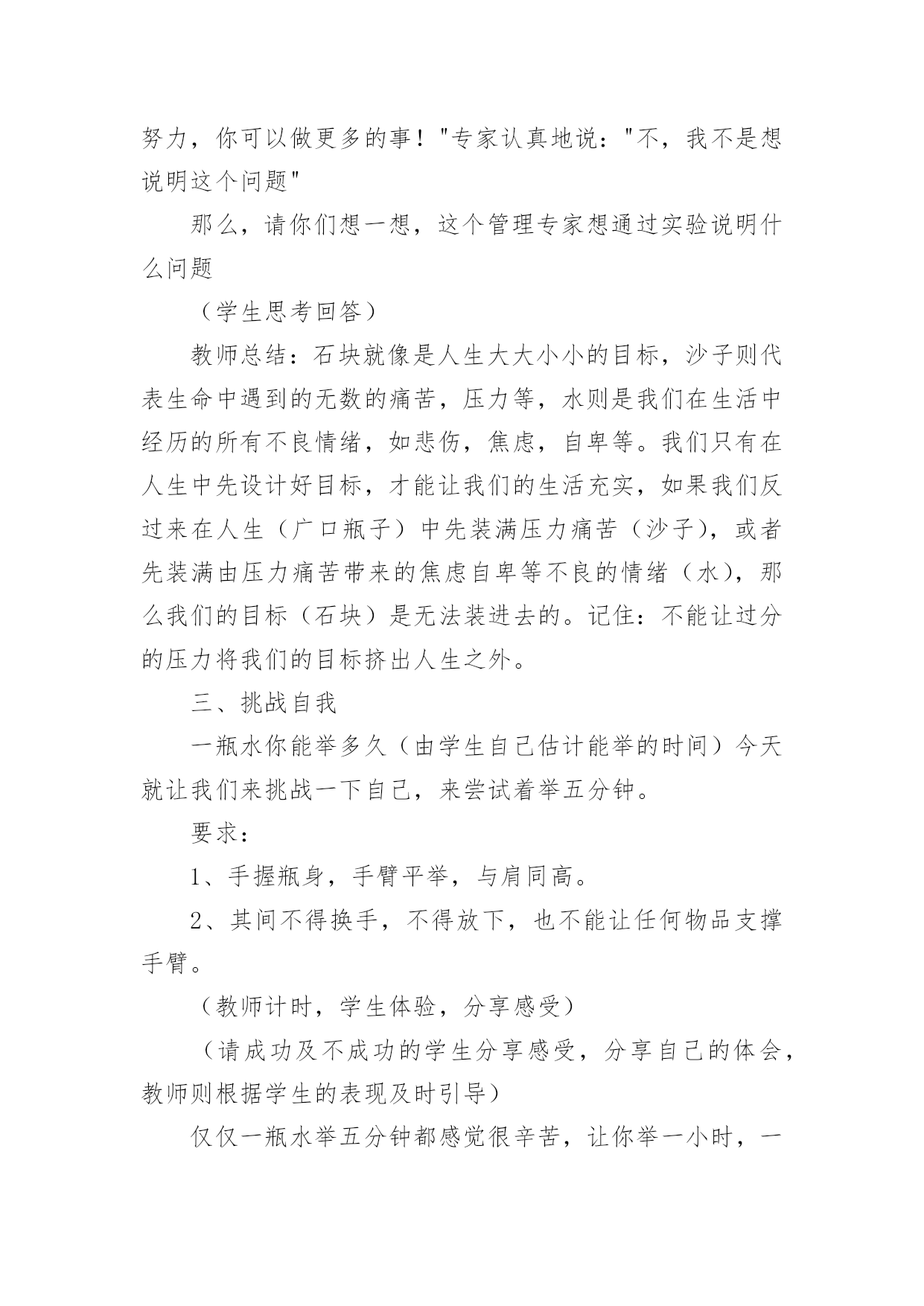 健康教育优秀教案作为一名专为他人授业解惑的人民教师,时常要开展教案准备工作,借助教案可以恰当地选择和运用教学方法,调动学生学习的积极性。那要怎么写好教案呢?下面是小编为大家收集的健康教育优秀教案,欢迎阅读与收藏。健康教育优秀教案1一、活动目标:1,了解压力存在的必要性以及压力与成就的关系。2,调整心态,做好应对学习压力的准备。二、活动准备:1,每位学生1个气球,1瓶水和一段绑气球的线2,计时器或手表l块,激昂的音乐3,多媒体课件,压力与成就的倒U型图4,学生分成6~8人小组,并提前布置好教室人小组,并提前布置好教室三、活动过程:一、我的压力气球进入高三,你们感觉到压力了吗(学生回答略)现在就请你们根据自己进入高三感受到的压力的程度,把这些压力吹进气球里。看看你们的压力有多大。(学生活动)气球吹好了,请大家相互看看,了解一下你的同学感受到的压力程度究竟怎样(教师引导学生观察气球的弹性与内在压力的大小,如果有同学把气球吹破了,可引导:"压力太大容易出危险。")相信大家看到之后会发觉:原来并不是只有我一个人感觉到压力,其他同学也都有压力感。今天就让我们来看看该如何去面对高三日益紧张的生活。(请学生将吹好的气球放在桌子底下或座位附近的位置)二、人生故事一天,一位管理专家为一群商学院学生讲课。他现场做了演示,给学生们留下了一生难以磨灭的印象。站在那些高智商高学历的学生前面,他说:"我们来个小测验。"他拿出一个一加仑的广口瓶放在面前的桌上,随后,取出一堆拳头大小的石块,仔细地一块块放进玻璃瓶里。直到石块高出瓶口,再也放不下了,他问道:"瓶子满了吗"所有学生应道:"满了。"管理专家反问:"真的"他伸手从桌下拿出一桶沙,开始慢慢倒进玻璃瓶,沙子填满了石块与石块之间的所有间隙。现在瓶子满了吗"他第二次问道。但这一次学生有些明白了,"可能还没有。"一位学生应道。"很好!"专家说。然后他拿过一壶水倒进玻璃瓶直到水面与瓶口齐平。他抬头看着学生,问道:"这个例子说明什么"一个心急的学生举手发言:"它告诉我们:无论你的时间表多么紧凑,如果你确实努力,你可以做更多的事!"专家认真地说:"不,我不是想说明这个问题"那么,请你们想一想,这个管理专家想通过实验说明什么问题(学生思考回答)教师总结:石块就像是人生大大小小的目标,沙子则代表生命中遇到的无数的痛苦,压力等,水则是我们在生活中经历的所有不良情绪,如悲伤,焦虑,自卑等。我们只有在人生中先设计好目标,才能让我们的生活充实,如果我们反过来在人生(广口瓶子)中先装满压力痛苦(沙子),或者先装满由压力痛苦带来的焦虑自卑等不良的情绪(水),那么我们的目标(石块)是无法装进去的。记住:不能让过分的压力将我们的目标挤出人生之外。三、挑战自我一瓶水你能举多久(由学生自己估计能举的时间)今天就让我们来挑战一下自己,来尝试着举五分钟。要求:1、手握瓶身,手臂平举,与肩同高。2、其间不得换手,不得放下,也不能让任何物品支撑手臂。(教师计时,学生体验,分享感受)(请成功及不成功的学生分享感受,分享自己的体会,教师则根据学生的表现及时引导)仅仅一瓶水举五分钟都感觉很辛苦,让你举一小时,一天会怎么样有多少人能坚持下来(统计回答"能"的学生效,可对比前面学生估计的时间及学生表现出来的态度)一瓶水我们尚且举不了多久,何况是我们即将面对的压力呢问问自己你能带着压力走多久一个月,一年要想把水举得久,就要适当地放下,让自己歇歇才有力气继续举;同样的,要想背负压力走得久,就要懂得适当地放下,让自己能喘口气,幽一默。可是,能否永远地将压力放下压力会把我们压垮,那么没有压力是否会对我们有利是否就能让我们的成绩高唱凯歌四、压力与学习效率日的倒U型图是一张在心理学中常用的图,如果横坐标代表我们所感受到的.压力,纵坐标代表我们的学习效率,这张图型所表达的意义就是:在压力小的情况下,我们可能不觉醒,不能发挥出我们的最佳水平;当觉醒增强时,我们感觉到的压力增大,学习效率开始提高,但是在达到一个最佳水平后,学习效率水平便不再提高了。然后,随着觉醒增强(压力加大)时,学习效率则开始下降,当压力超过一定限度时,我们就会变得十分惊慌,以致不能完成与我们实际能力相符的工作和学习,过分的压力使我们的学习效率下降,在图型上显示出倒"U"型曲线。从上图中可以看出,压力太小或者太大都会降低我们的学习效率,也就直接会影响到我们的成绩,正如我们的压力气球一样,压力小时,气球无弹性,压力大时,气球的弹性强,压力太大,气球就被撑破了。由此可以看出,有压力并不是坏事,压力的存在对我们的成功来说是必须的。五、心理实验曾经有心理学家做过这样一个实验:将一只小白鼠放进一缸水中,在孤立无援的情况下,小白鼠在水中仅仅挣扎了四分多钟就死了,再将另一只小白鼠放入水中,让它在水中挣扎了一分钟后将它