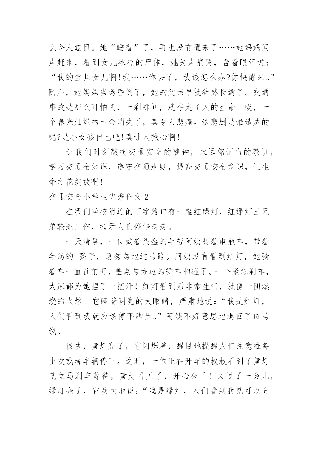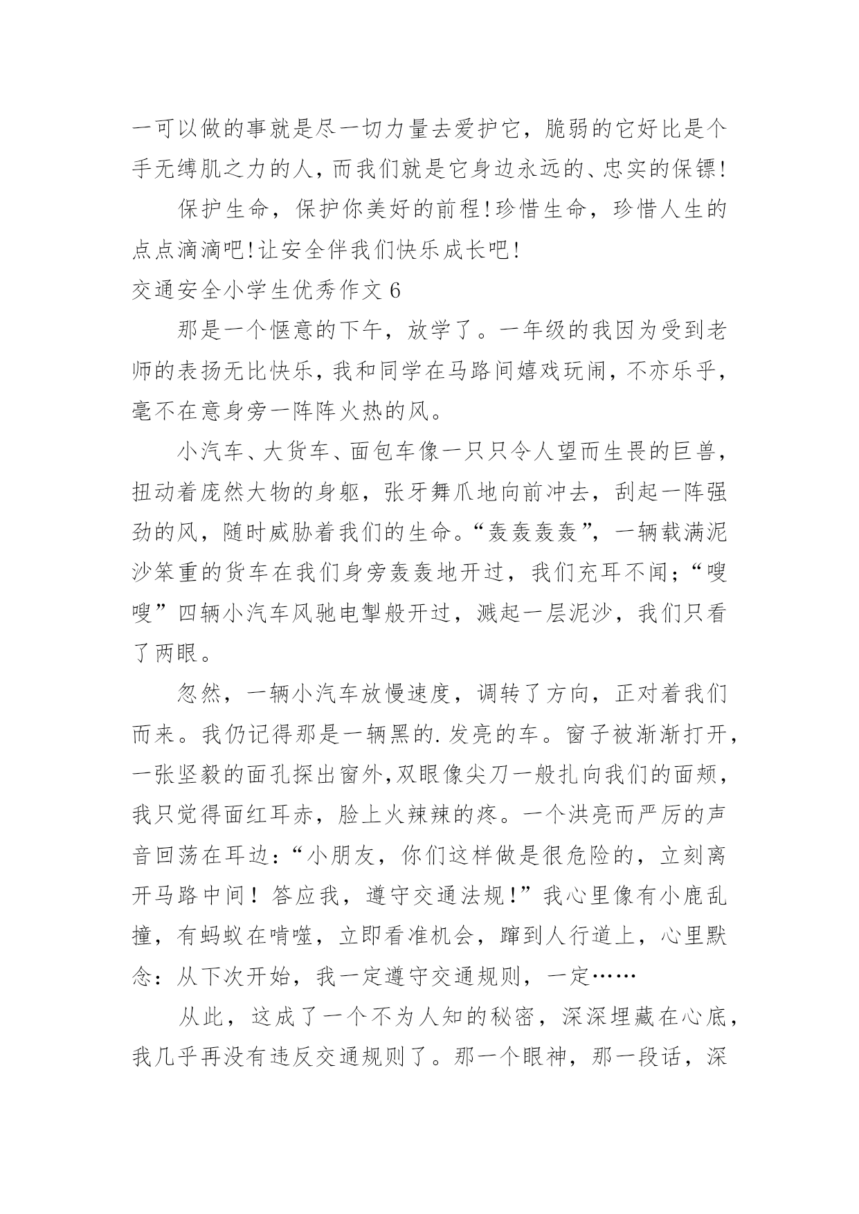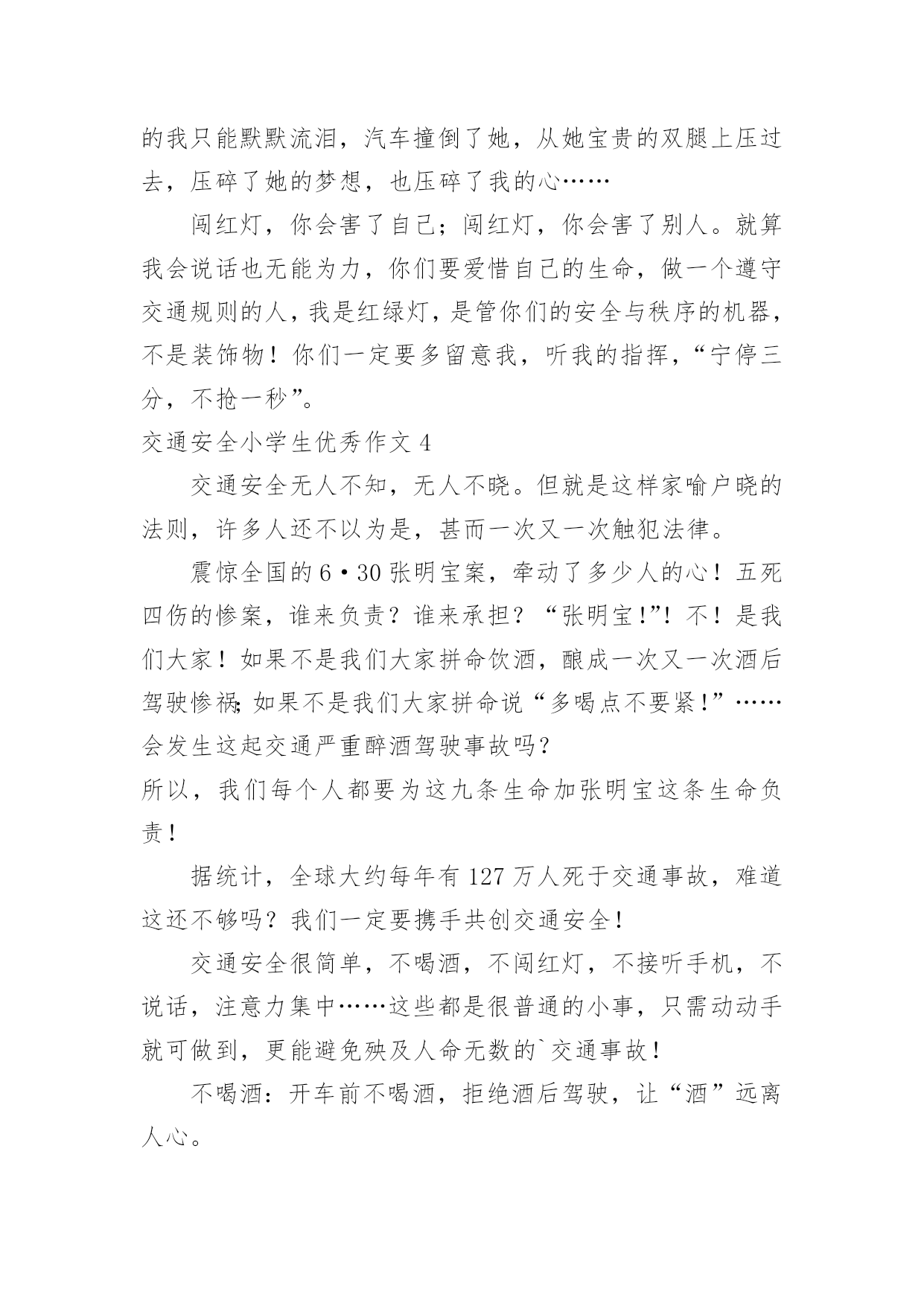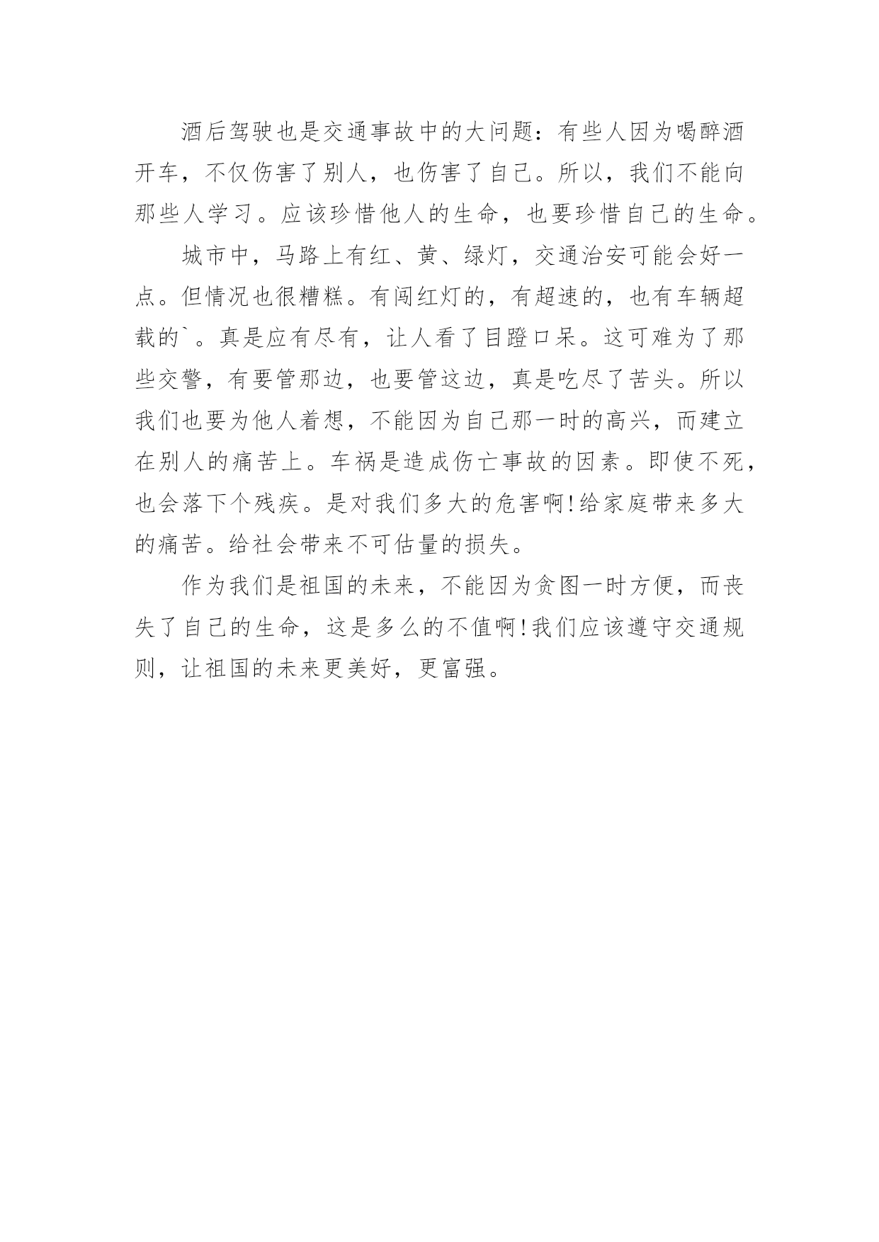 交通安全小学生优秀作文交通安全小学生优秀作文在学习、工作、生活中,大家都不可避免地会接触到作文吧,根据写作命题的特点,作文可以分为命题作文和非命题作文。你知道作文怎样写才规范吗?下面是小编收集整理的交通安全小学生优秀作文,欢迎阅读,希望大家能够喜欢。交通安全小学生优秀作文1交通日益发达、日新月异的今天,人们日常的出行,都离不开交通工具。它给我们带来了前所未有的方便与快捷,也给我们带来了灾难,一个个鲜活的生命消失在飞驰的车轮下,一个个幸福美满的家庭转眼间便破碎不堪了。因此,我们要遵守交通规则,安全行驶,才能避免这些事故的发生,健康成长。交通事故时时刻刻都会发生,它就像颗威力十足的`原炸弹,一时大意,这颗埋伏在我们生活中的炸弹就会爆炸,炸得家庭支零破碎,炸得人心悲苦。我在电视上目睹这样一个惊心动魄的场面:走在男孩面前的是一位活蹦乱跳的女孩,头上扎着一对粉黄的蝴蝶结,身穿一条漂亮的白纱裙,正准备过马路,绿灯停了,红灯亮了,男孩立刻停在马路边,小女孩却飞快地向前冲。说时迟,那时快,一辆汽车像箭一样向小女孩驶来。司机来不及刹车,“嘭”的一声,小女孩躺在地上,鲜血染红了白纱裙,是那么令人眩目。她“睡着”了,再也没有醒来了……她妈妈闻声赶来,看到女儿冰冷的尸体,她失声痛哭,含着眼泪说:“我的宝贝女儿啊!我……你去了,我该怎么办?你快醒来。”随后,她妈妈当场昏倒了,她的父亲早就猝然长逝了。交通事故是那么可怕啊,一刹那间,就夺走了人的生命。唉,一个春光灿烂的生命消失了,真令人悲痛。这悲剧是谁造成的呢?是小女孩自己吧!真让人揪心啊!让我们时刻敲响交通安全的警钟,永远铭记血的教训,学习交通全知识,遵守交通规则,提高交通安全意识,让生命之花绽放吧!交通安全小学生优秀作文2在我们学校附近的丁字路口有一盏红绿灯,红绿灯三兄弟轮流工作,指示人们停停走走。一天清晨,一位戴着头盔的年轻阿姨骑着电瓶车,带着年幼的'孩子,急匆匆地过马路。阿姨没有看到红灯,她骑着车一直往前开,差点与旁边的轿车相碰了。一个紧急刹车,大家都为她捏了一把汗!红灯看到后非常生气,就像一团燃烧的火焰。它睁着明亮的大眼睛,严肃地说:“我是红灯,人们看到我就应该停下脚步。”阿姨不好意思地退回了斑马线。很快,黄灯亮了,它闪烁着,醒目地提醒人们注意准备出发或者车辆停下。这时,一位正在开车的叔叔看到了黄灯就立马刹车等待,黄灯看见了,开心极了!又过了一会儿,绿灯亮了,它欢快地说:“我是绿灯,人们看到我就可以向前出发。”一群穿着校服、戴着红领巾的少先队员们看到绿灯后,一个接一个有序地过马路,走向学校。红灯、黄灯、绿灯,三兄弟辛勤地工作,指引我们安全出行。同学们,我们要遵守交通规则,牢记:红灯停,绿灯行,黄灯亮了等一等。交通安全小学生优秀作文3我是一个“红绿灯”。我身穿一件铁皮衣裳,衣服上有三个会发光的钮扣,瞧!红色代表危险,黄色代表警告,绿色代表安全。“红灯停,绿灯行,遇到黄灯莫争行。”每当我看到小朋友们唱着歌谣从我身边经过,我多么高兴与自豪啊!但是,遇到我无法阻止的交通事故时,我也愁眉不展。这一天,我像往常一样工作,耳边突然传来一阵对话:“快点儿,今天要考试,自己心里没点儿数啊!”妈妈脸色苍白,咬牙切齿,眉头紧锁,拉着女孩往前冲,在斑马线上直跺脚。“可是,妈妈,现在是红灯……”随之“嘭”的一声巨响打断了小女孩的话,我的`心一阵一阵痛!红绿灯的规则大家都倒背如流,但我更希望人人心中都装有红绿灯,自觉遵守。又是一个阳光明媚的早晨,一位亭亭玉立的女孩正在等着我的绿色钮扣亮起,她是个舞蹈尖子生,穿着舞衣,站在斑马线边上,轻轻哼着愉快的曲调。我点亮绿色钮扣,小女孩向我走来,两旁汽车都停下静静等待,忽然间,一辆汽车朝小女孩飞驰而来,我心一颤,拼命地想要亮起红钮扣提醒小女孩,可是悲剧还是发生了,无法阻止的我只能默默流泪,汽车撞倒了她,从她宝贵的双腿上压过去,压碎了她的梦想,也压碎了我的心……闯红灯,你会害了自己;闯红灯,你会害了别人。就算我会说话也无能为力,你们要爱惜自己的生命,做一个遵守交通规则的人,我是红绿灯,是管你们的安全与秩序的机器,不是装饰物!你们一定要多留意我,听我的指挥,“宁停三分,不抢一秒”。交通安全小学生优秀作文4交通安全无人不知,无人不晓。但就是这样家喻户晓的法则,许多人还不以为是,甚而一次又一次触犯法律。震惊全国的6·30张明宝案,牵动了多少人的心!五死四伤的惨案,谁来负责?谁来承担?“张明宝!”!不!是我们大家!如果不是我们大家拼命饮酒,酿成一次又一次酒后驾驶惨祸;如果不是我们大家拼命说“多喝点不要紧!”……会发生这起交通严重醉酒驾驶事故吗?所以,我们每个人都要为这九条生命加张明宝这条生命负责!据统计,全球大约每年有127万人死于交通事故,难道这还不够吗?我们一定要携手共创交通安全!交通安
