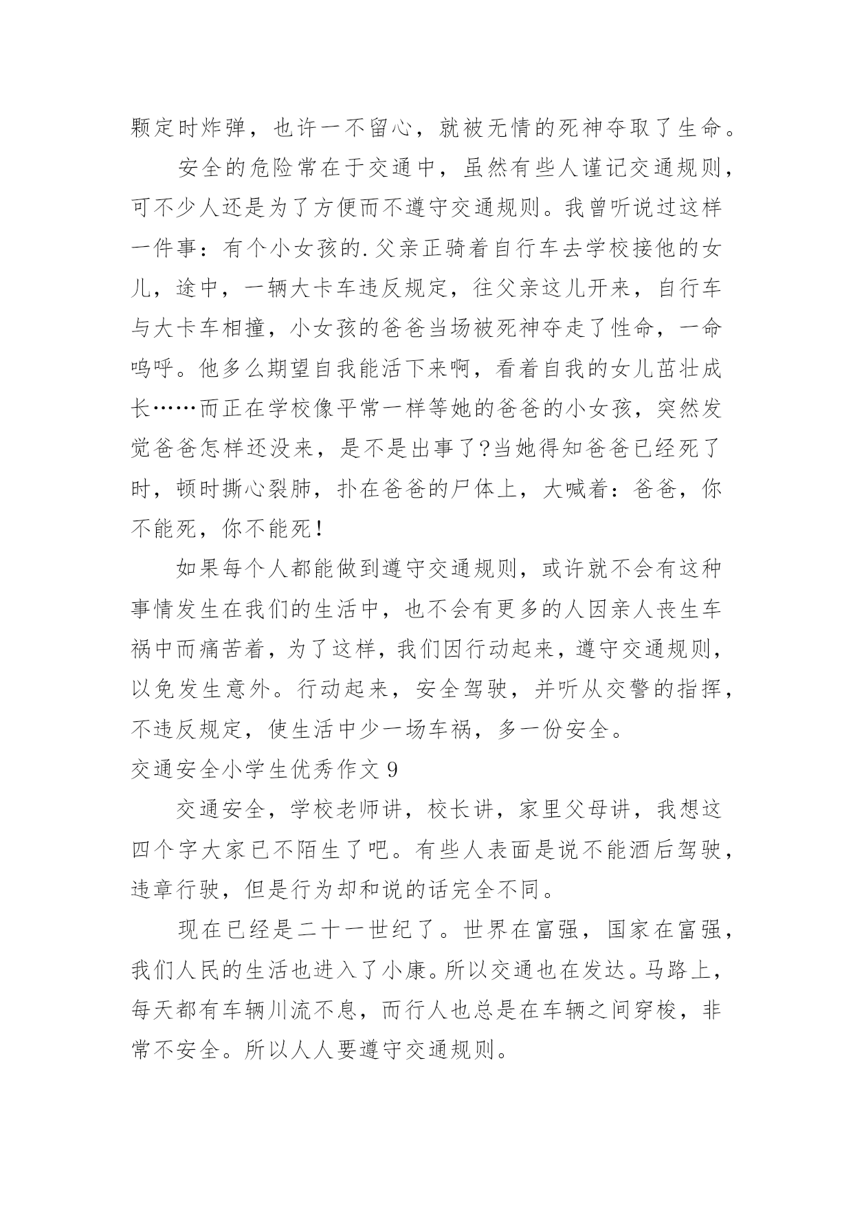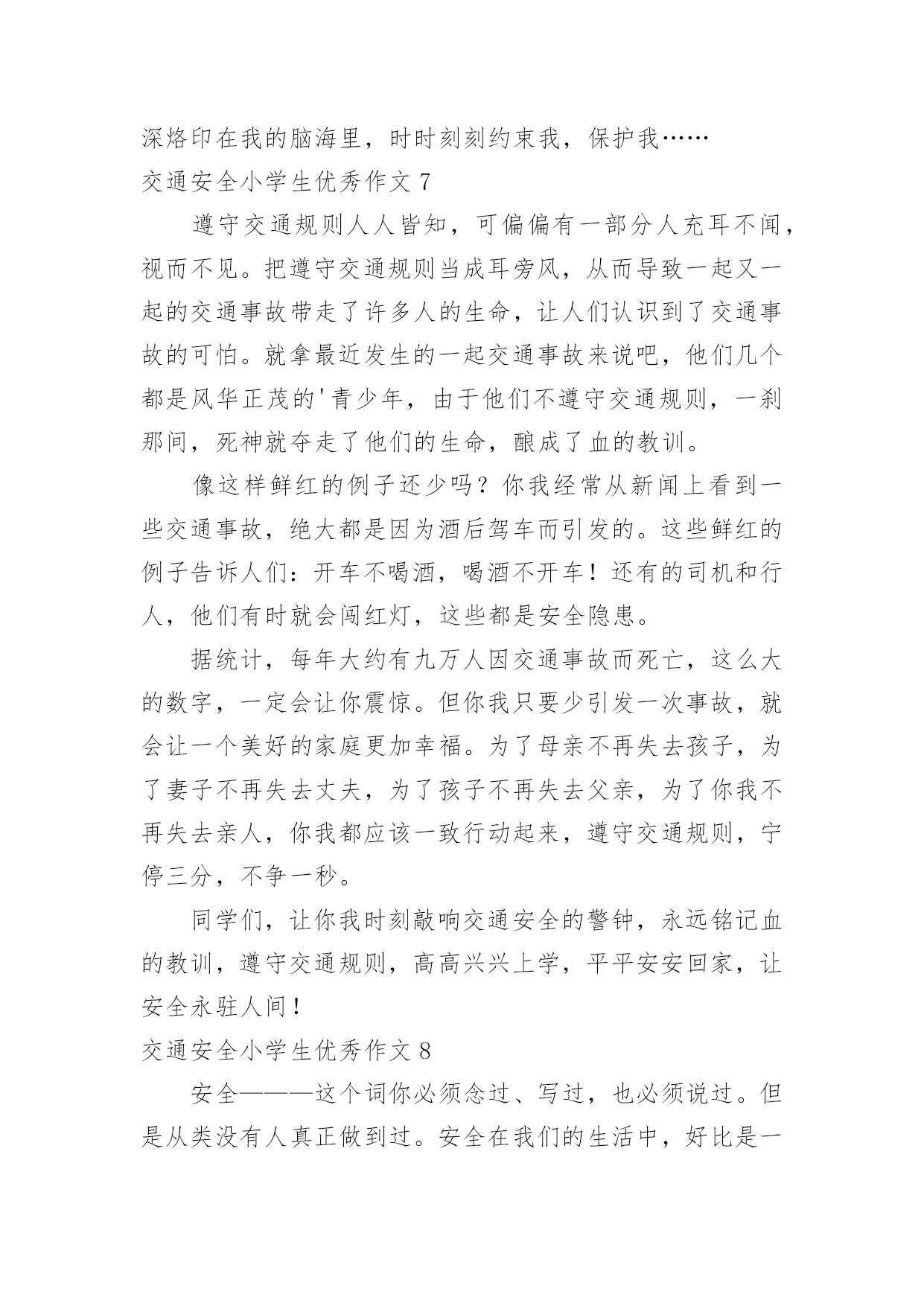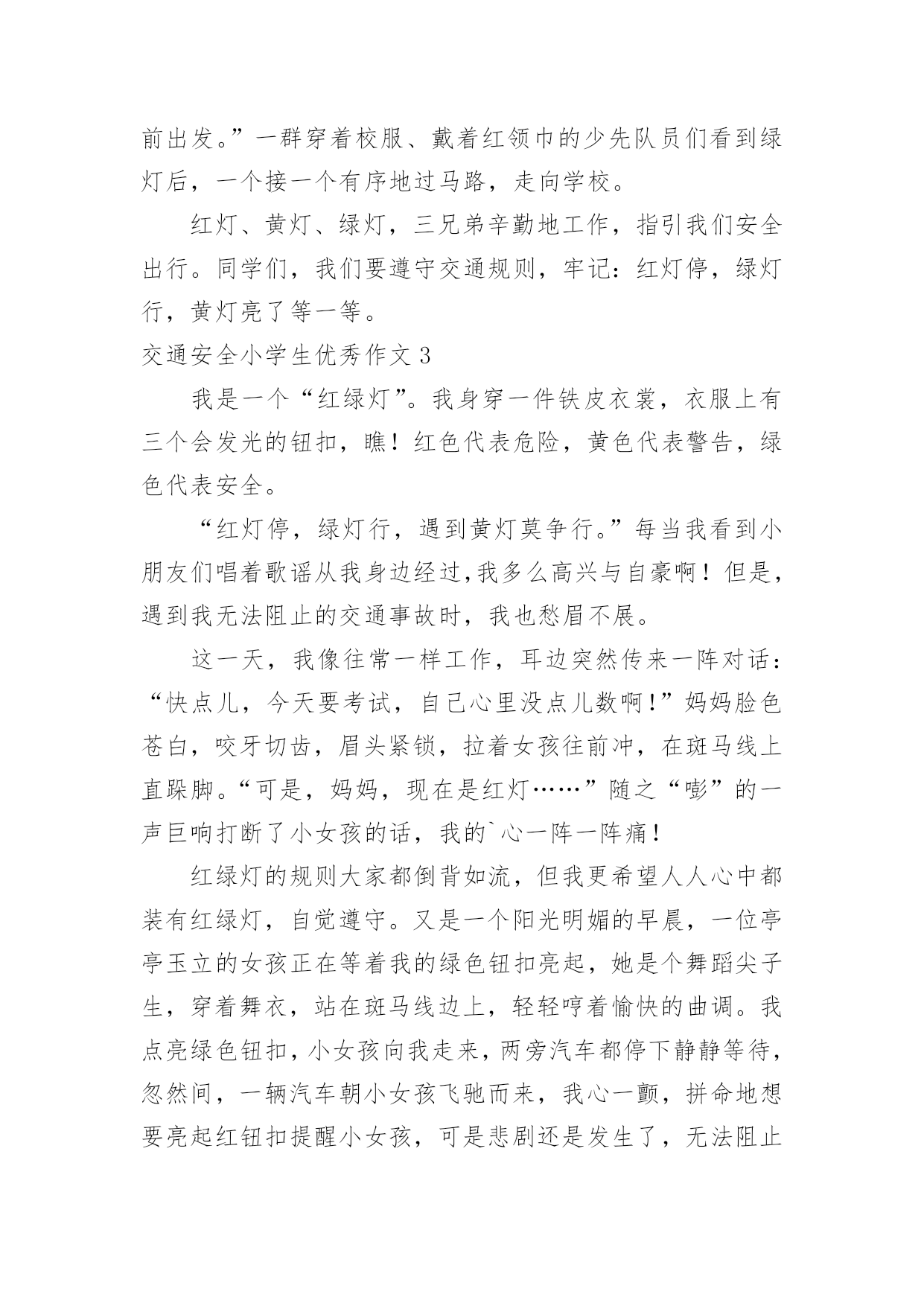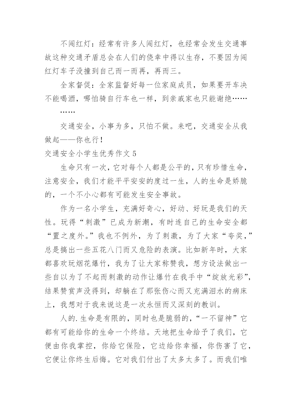 交通安全小学生优秀作文交通安全小学生优秀作文在学习、工作、生活中,大家都不可避免地会接触到作文吧,根据写作命题的特点,作文可以分为命题作文和非命题作文。你知道作文怎样写才规范吗?下面是小编收集整理的交通安全小学生优秀作文,欢迎阅读,希望大家能够喜欢。交通安全小学生优秀作文1交通日益发达、日新月异的今天,人们日常的出行,都离不开交通工具。它给我们带来了前所未有的方便与快捷,也给我们带来了灾难,一个个鲜活的生命消失在飞驰的车轮下,一个个幸福美满的家庭转眼间便破碎不堪了。因此,我们要遵守交通规则,安全行驶,才能避免这些事故的发生,健康成长。交通事故时时刻刻都会发生,它就像颗威力十足的`原炸弹,一时大意,这颗埋伏在我们生活中的炸弹就会爆炸,炸得家庭支零破碎,炸得人心悲苦。我在电视上目睹这样一个惊心动魄的场面:走在男孩面前的是一位活蹦乱跳的女孩,头上扎着一对粉黄的蝴蝶结,身穿一条漂亮的白纱裙,正准备过马路,绿灯停了,红灯亮了,男孩立刻停在马路边,小女孩却飞快地向前冲。说时迟,那时快,一辆汽车像箭一样向小女孩驶来。司机来不及刹车,“嘭”的一声,小女孩躺在地上,鲜血染红了白纱裙,是那么令人眩目。她“睡着”了,再也没有醒来了……她妈妈闻声赶来,看到女儿冰冷的尸体,她失声痛哭,含着眼泪说:“我的宝贝女儿啊!我……你去了,我该怎么办?你快醒来。”随后,她妈妈当场昏倒了,她的父亲早就猝然长逝了。交通事故是那么可怕啊,一刹那间,就夺走了人的生命。唉,一个春光灿烂的生命消失了,真令人悲痛。这悲剧是谁造成的呢?是小女孩自己吧!真让人揪心啊!让我们时刻敲响交通安全的警钟,永远铭记血的教训,学习交通全知识,遵守交通规则,提高交通安全意识,让生命之花绽放吧!交通安全小学生优秀作文2在我们学校附近的丁字路口有一盏红绿灯,红绿灯三兄弟轮流工作,指示人们停停走走。一天清晨,一位戴着头盔的年轻阿姨骑着电瓶车,带着年幼的'孩子,急匆匆地过马路。阿姨没有看到红灯,她骑着车一直往前开,差点与旁边的轿车相碰了。一个紧急刹车,大家都为她捏了一把汗!红灯看到后非常生气,就像一团燃烧的火焰。它睁着明亮的大眼睛,严肃地说:“我是红灯,人们看到我就应该停下脚步。”阿姨不好意思地退回了斑马线。很快,黄灯亮了,它闪烁着,醒目地提醒人们注意准备出发或者车辆停下。这时,一位正在开车的叔叔看到了黄灯就立马刹车等待,黄灯看见了,开心极了!又过了一会儿,绿灯亮了,它欢快地说:“我是绿灯,人们看到我就可以向前出发。”一群穿着校服、戴着红领巾的少先队员们看到绿灯后,一个接一个有序地过马路,走向学校。红灯、黄灯、绿灯,三兄弟辛勤地工作,指引我们安全出行。同学们,我们要遵守交通规则,牢记:红灯停,绿灯行,黄灯亮了等一等。交通安全小学生优秀作文3我是一个“红绿灯”。我身穿一件铁皮衣裳,衣服上有三个会发光的钮扣,瞧!红色代表危险,黄色代表警告,绿色代表安全。“红灯停,绿灯行,遇到黄灯莫争行。”每当我看到小朋友们唱着歌谣从我身边经过,我多么高兴与自豪啊!但是,遇到我无法阻止的交通事故时,我也愁眉不展。这一天,我像往常一样工作,耳边突然传来一阵对话:“快点儿,今天要考试,自己心里没点儿数啊!”妈妈脸色苍白,咬牙切齿,眉头紧锁,拉着女孩往前冲,在斑马线上直跺脚。“可是,妈妈,现在是红灯……”随之“嘭”的一声巨响打断了小女孩的话,我的`心一阵一阵痛!红绿灯的规则大家都倒背如流,但我更希望人人心中都装有红绿灯,自觉遵守。又是一个阳光明媚的早晨,一位亭亭玉立的女孩正在等着我的绿色钮扣亮起,她是个舞蹈尖子生,穿着舞衣,站在斑马线边上,轻轻哼着愉快的曲调。我点亮绿色钮扣,小女孩向我走来,两旁汽车都停下静静等待,忽然间,一辆汽车朝小女孩飞驰而来,我心一颤,拼命地想要亮起红钮扣提醒小女孩,可是悲剧还是发生了,无法阻止的我只能默默流泪,汽车撞倒了她,从她宝贵的双腿上压过去,压碎了她的梦想,也压碎了我的心……闯红灯,你会害了自己;闯红灯,你会害了别人。就算我会说话也无能为力,你们要爱惜自己的生命,做一个遵守交通规则的人,我是红绿灯,是管你们的安全与秩序的机器,不是装饰物!你们一定要多留意我,听我的指挥,“宁停三分,不抢一秒”。交通安全小学生优秀作文4交通安全无人不知,无人不晓。但就是这样家喻户晓的法则,许多人还不以为是,甚而一次又一次触犯法律。震惊全国的6·30张明宝案,牵动了多少人的心!五死四伤的惨案,谁来负责?谁来承担?“张明宝!”!不!是我们大家!如果不是我们大家拼命饮酒,酿成一次又一次酒后驾驶惨祸;如果不是我们大家拼命说“多喝点不要紧!”……会发生这起交通严重醉酒驾驶事故吗?所以,我们每个人都要为这九条生命加张明宝这条生命负责!据统计,全球大约每年有127万人死于交通事故,难道这还不够吗?我们一定要携手共创交通安全!交通安
