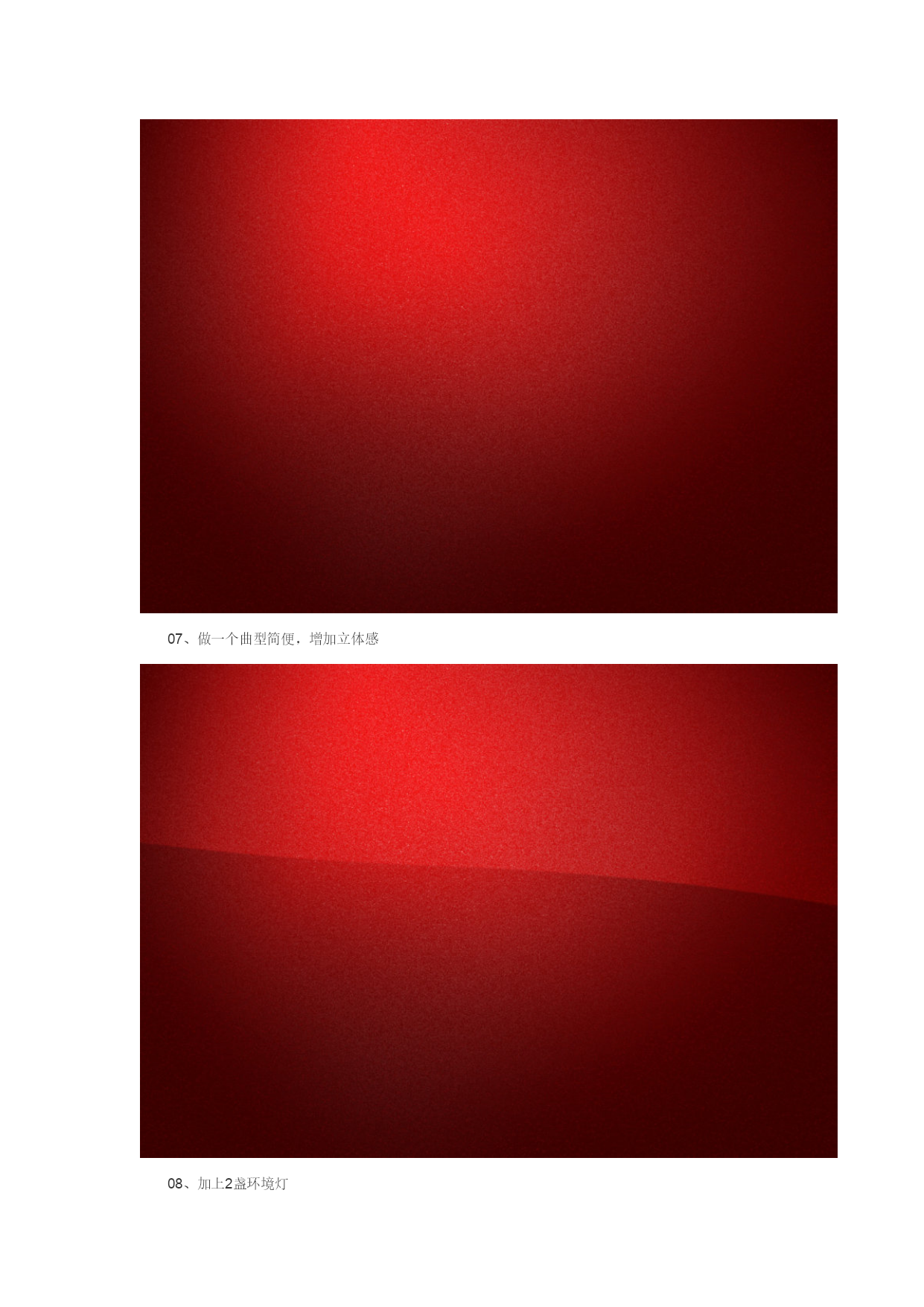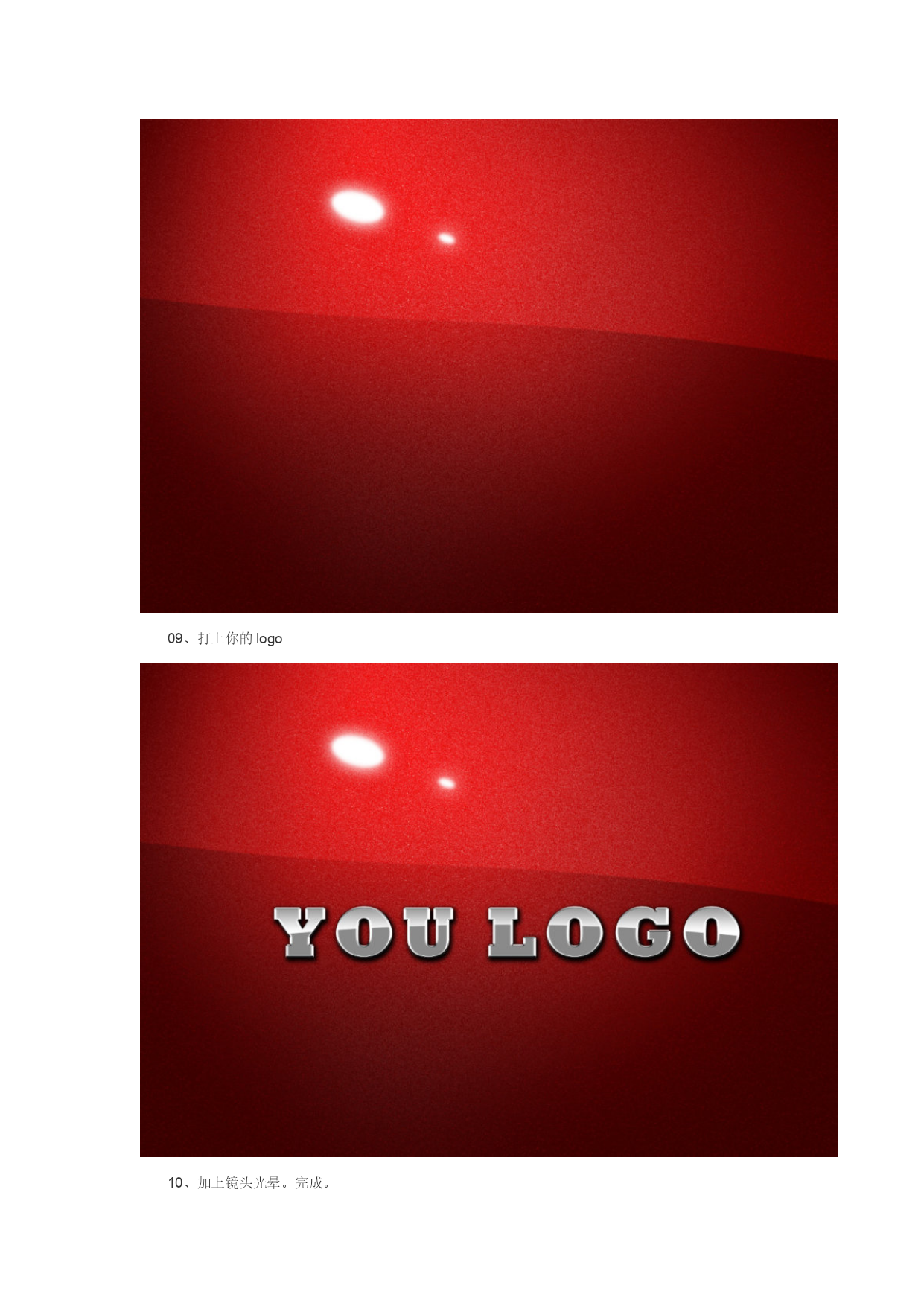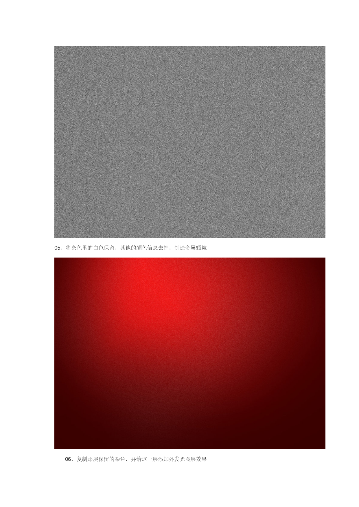 金属烤漆字教程作者:网络运营中心文章来源:HYPERLINK"http://www.hnxhdn.com/"河南新华电脑学院具体的制作步骤如下:01、新建一个文件,填充一个大红02、用渐变将四周涂黑,形成光影效果03、新建一层,填充灰色04、增加一个杂色滤镜,黑白杂色即可05、将杂色里的白色保留,其他的颜色信息去掉,制造金属颗粒06、复制那层保留的杂色,并给这一层添加外发光图层效果07、做一个曲型简便,增加立体感08、加上2盏环境灯09、打上你的logo10、加上镜头光晕。完成。