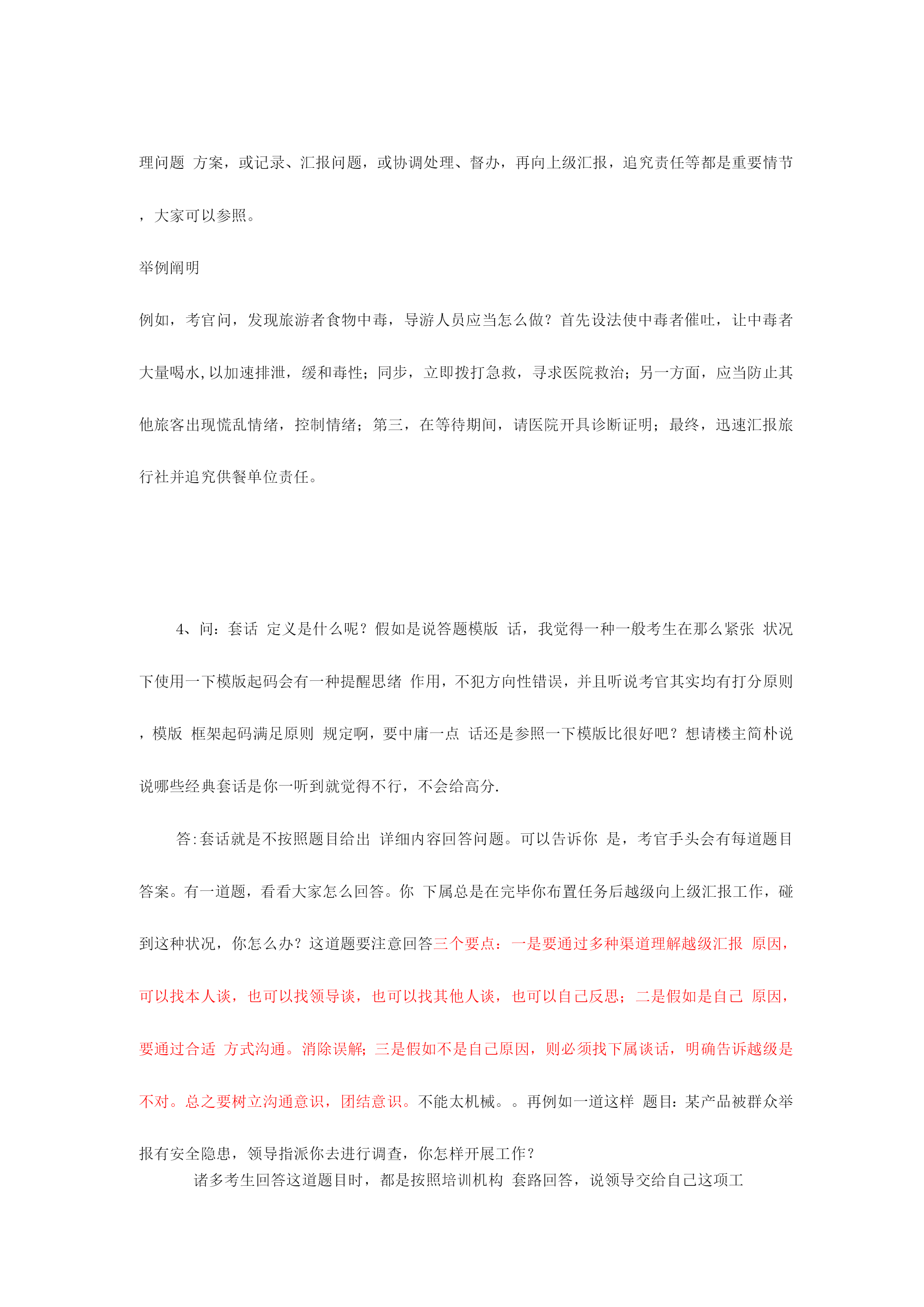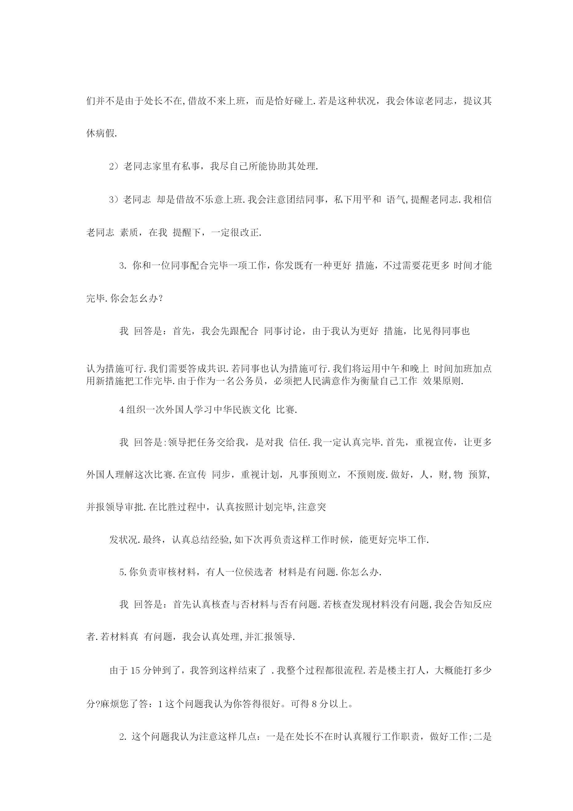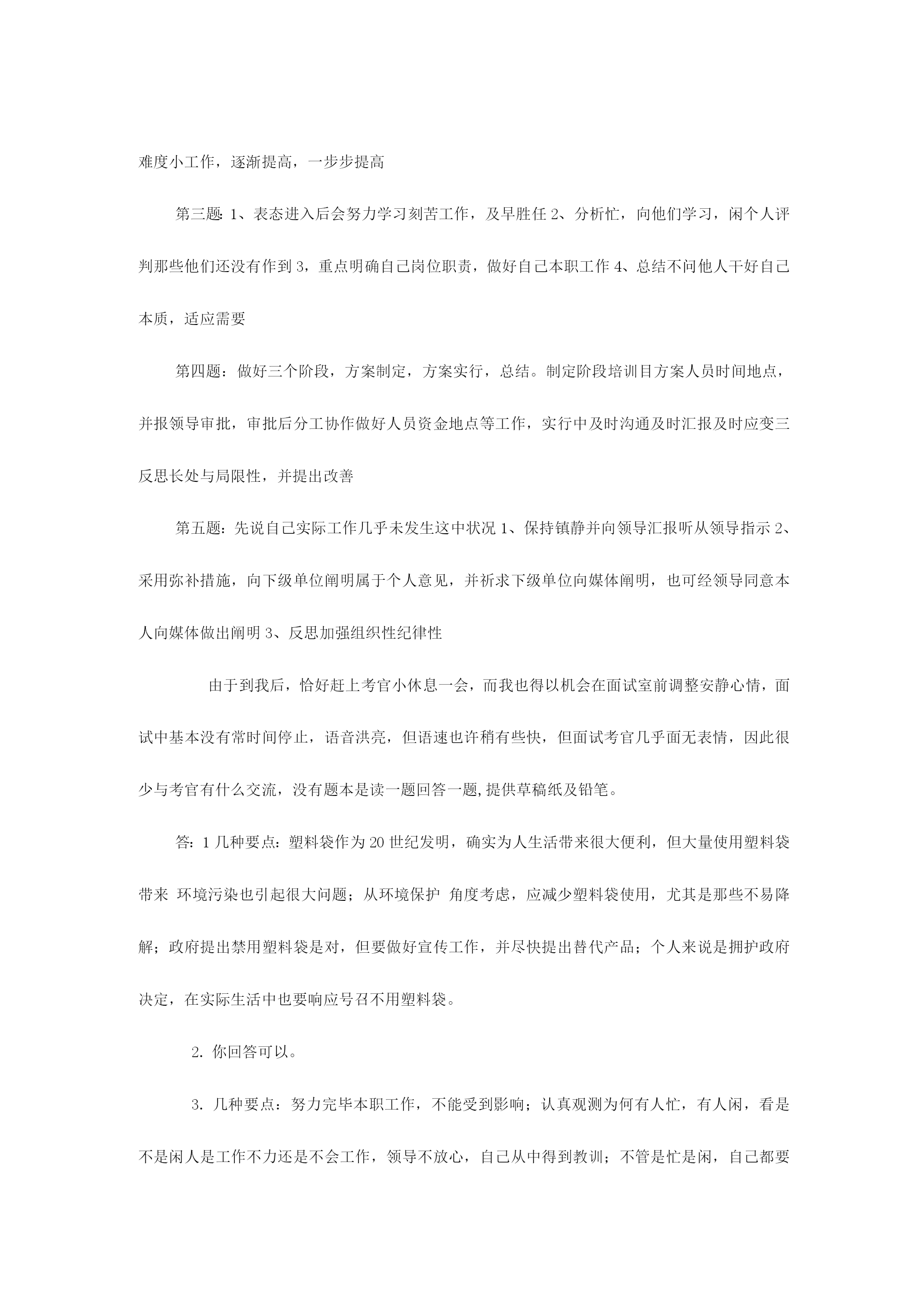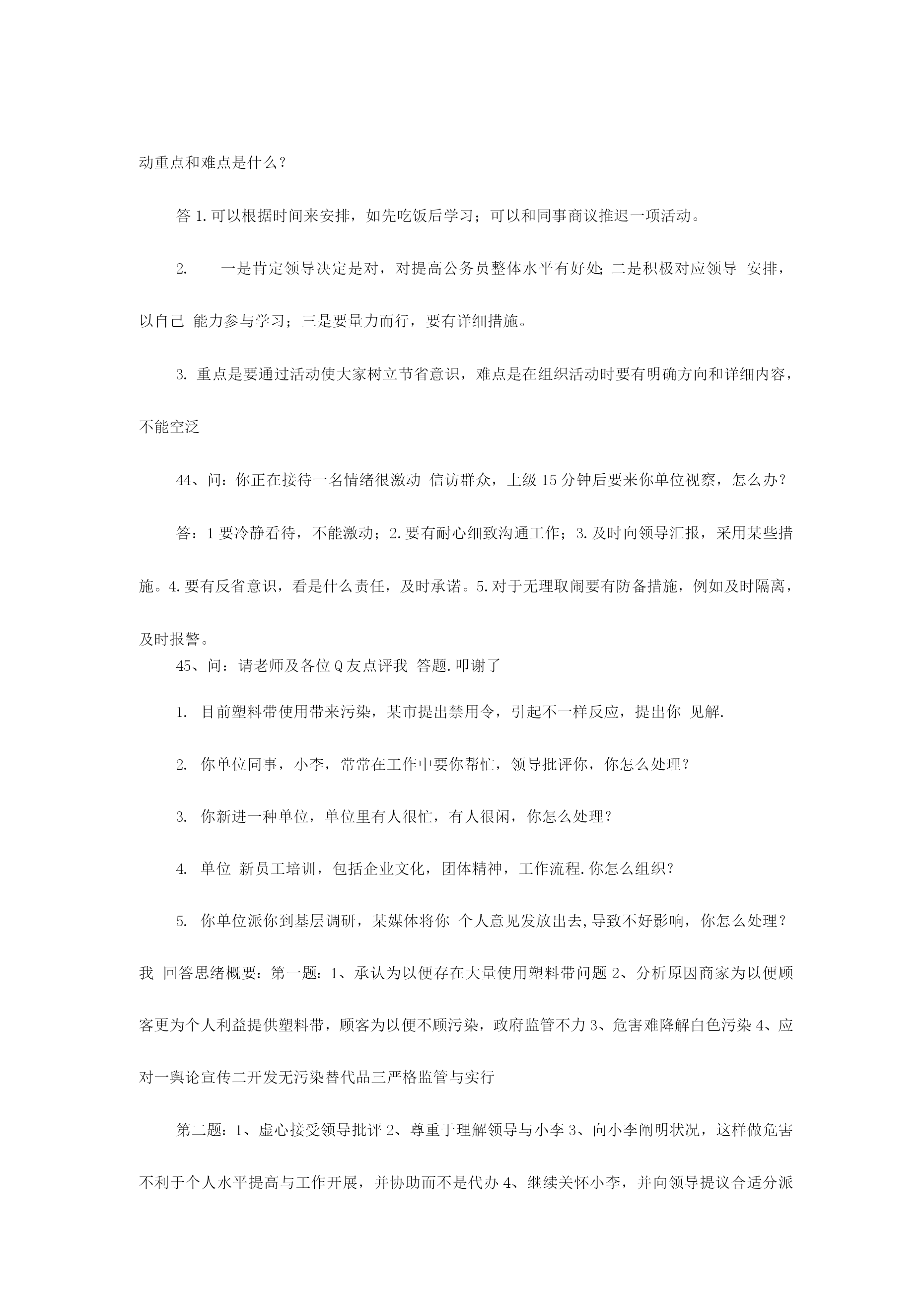 公务员面试备用万能模板2023年国家公务员笔试成绩已经公布,通过笔试障碍幸运公考学子们又遇上了“面试”这个拦路虎,在为自己努力得到回报欣喜同步,心、中难免会对公务员面试有几分担忧。为了协助广大公考学子走出面试疑团重围,专家总结了四大招法,帮您轻松过关。当碰到不好回答问题时,可以紧急使用万能模板。第一招法:应对人际交往,例如与同事发生矛盾,有了冲突,产生危机,怎样相处等。先讲一句名言:海明威说“每个人都不是一座孤岛”,因此在交往中会产生……总之要把握四个方面。一要尊重,二是理解,三是沟通,四是协助。第二招法:应对与领导相处,例如领导与自己意见相左,领导能力比自己差,领导比较专断等。把握四个原则:一尊重领导。每一种成功领导人均有其成功理由。二是理解领导。看问题每个人角度都不一样样,“横当作岭侧成峰”,自己想法是对,但领导就未必是错。三是协助领导,此为亮点,协助领导出筹划策,没有采用也是正常,假如领导违法违反原则,坚持自己意见,其实这也是协助领导防止出错。四是适应领导,适应其领导方式,并用自己影响力慢慢改正其缺陷。此四点绝对通吃天下领导与下属关系。第三招法:组织活动会议,尚有培训或是完毕领导交待任务。先讲一句“凡事预则立,不预则废”,合理规划将协助自己顺利完毕。第一,制定工作方案(活动主题、方式、时间、地点、对象、人员配置、费用预算、程序安排等等);第二,对方案论证(征求各方意见,向领导汇报,由领导定夺);第三,按计划实行(人员分组分工,任务分派等);第四,注意计划执行过程中各方关系协调(三个及时:及时沟通各方状况进行协调,及时向领导汇报,发现原方案内容或措施不妥要及时纠正);第五,计划后总结(对整个活动进行回忆、总结经验)。这五个环节十分有用,无往不胜!第四招法:处理政府突发事件或是异常状况。一保持镇静;二想尽一切措施使他情绪稳定;三耐心宣传国家有关法律法规;四实在不能稳定情势,向领导汇报,祈求支援。集体上访事件:第一,热情接待(请坐,倒杯水)第二,稳定情绪(想尽一切措施……)第三,认真倾听(群众呼声)第四,仔细记录(群众反应问题)第五,宣传解释(力所能及)第六,及时汇报(能处理当场处理,不能处理汇报领导处理或转交有关部门)成功属于有准备人,面试需要专心准备,才可以在面试中脱颖而出面试专家于老师提醒考生应遵照“先控制事态不能恶化”原则,按照:1、先冷静,2、迅速处理,3、查明原因追究责任”次序展开回答。其中,保持冷静,先安抚情绪,然后及时补救,提出处理问题方案,或记录、汇报问题,或协调处理、督办,再向上级汇报,追究责任等都是重要情节,大家可以参照。举例阐明例如,考官问,发现旅游者食物中毒,导游人员应当怎么做?首先设法使中毒者催吐,让中毒者大量喝水,以加速排泄,缓和毒性;同步,立即拨打急救,寻求医院救治;另一方面,应当防止其他旅客出现慌乱情绪,控制情绪;第三,在等待期间,请医院开具诊断证明;最终,迅速汇报旅行社并追究供餐单位责任。4、问:套话定义是什么呢?假如是说答题模版话,我觉得一种一般考生在那么紧张状况下使用一下模版起码会有一种提醒思绪作用,不犯方向性错误,并且听说考官其实均有打分原则,模版框架起码满足原则规定啊,要中庸一点话还是参照一下模版比很好吧?想请楼主简朴说说哪些经典套话是你一听到就觉得不行,不会给高分.答:套话就是不按照题目给出详细内容回答问题。可以告诉你是,考官手头会有每道题目答案。有一道题,看看大家怎么回答。你下属总是在完毕你布置任务后越级向上级汇报工作,碰到这种状况,你怎么办?这道题要注意回答三个要点:一是要通过多种渠道理解越级汇报原因,可以找本人谈,也可以找领导谈,也可以找其他人谈,也可以自己反思;二是假如是自己原因,要通过合适方式沟通。消除误解;三是假如不是自己原因,则必须找下属谈话,明确告诉越级是不对。总之要树立沟通意识,团结意识。不能太机械。。再例如一道这样题目:某产品被群众举报有安全隐患,领导指派你去进行调查,你怎样开展工作?诸多考生回答这道题目时,都是按照培训机构套路回答,说领导交给自己这项工作,是对自己信任,自己一定会认真完毕任务,这就是套话。主线不用说,本来你工作就是这个,你不完毕也不行,更扯不上领导信任问题。此外,诸多考生回答时就是三部曲,第一要做一种详细调查计划,第二认真开展调查,第三写出调查汇报,然后就完了。培训机构可以这样说,但考生这样回答,那肯定不行,就是套话。由于已经明确告诉你是什么工作了,必须按照工作来回答。这道题答题要点是:1.搜集这个产品有关信息,如国家或者工厂制造原则,这个产品在当地区销售状况,举报危害状况(有多少人,危害程度等等);2.请教专家和有关管理部门,对产品状况进行鉴定;3.根据搜集到信息制定