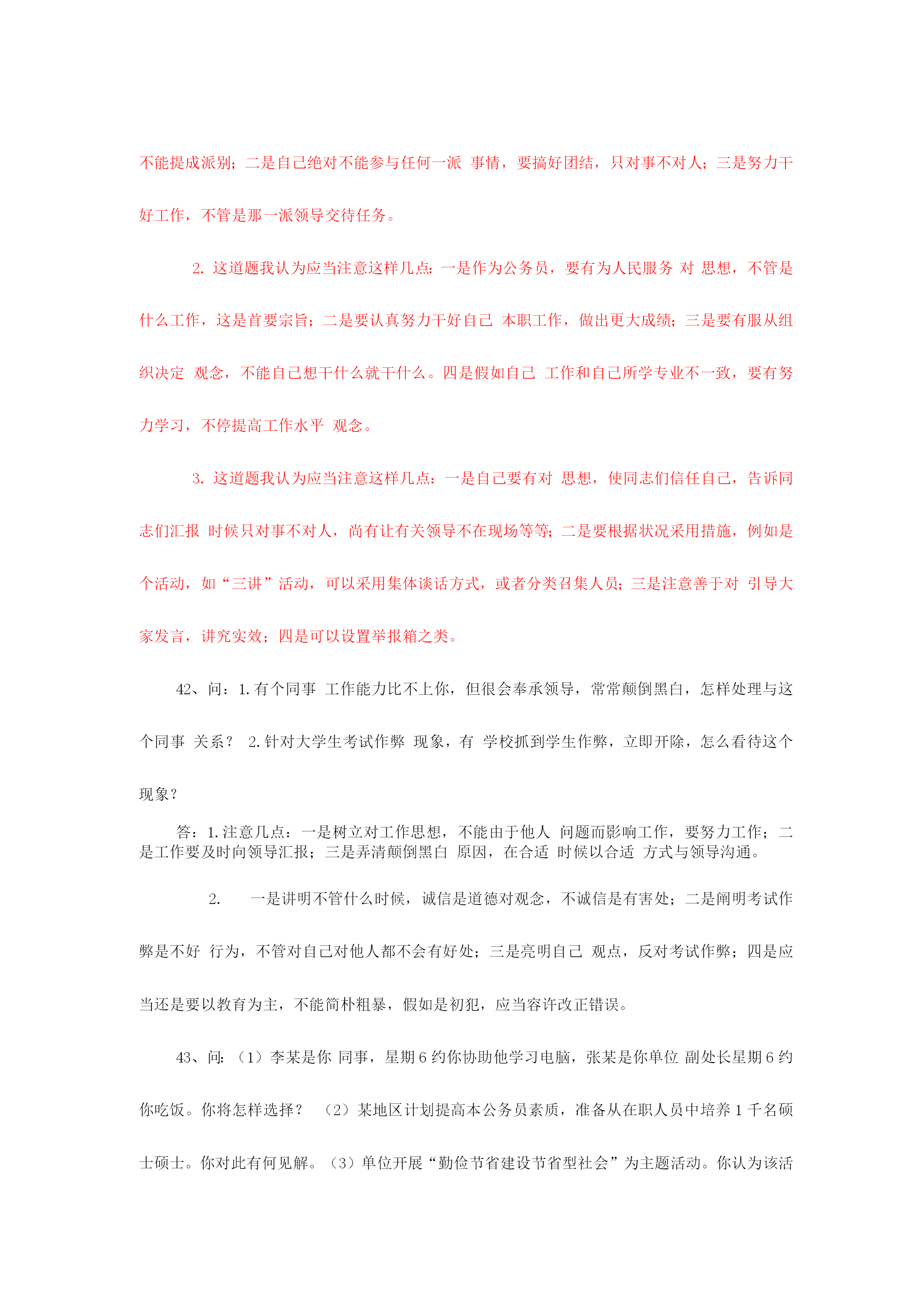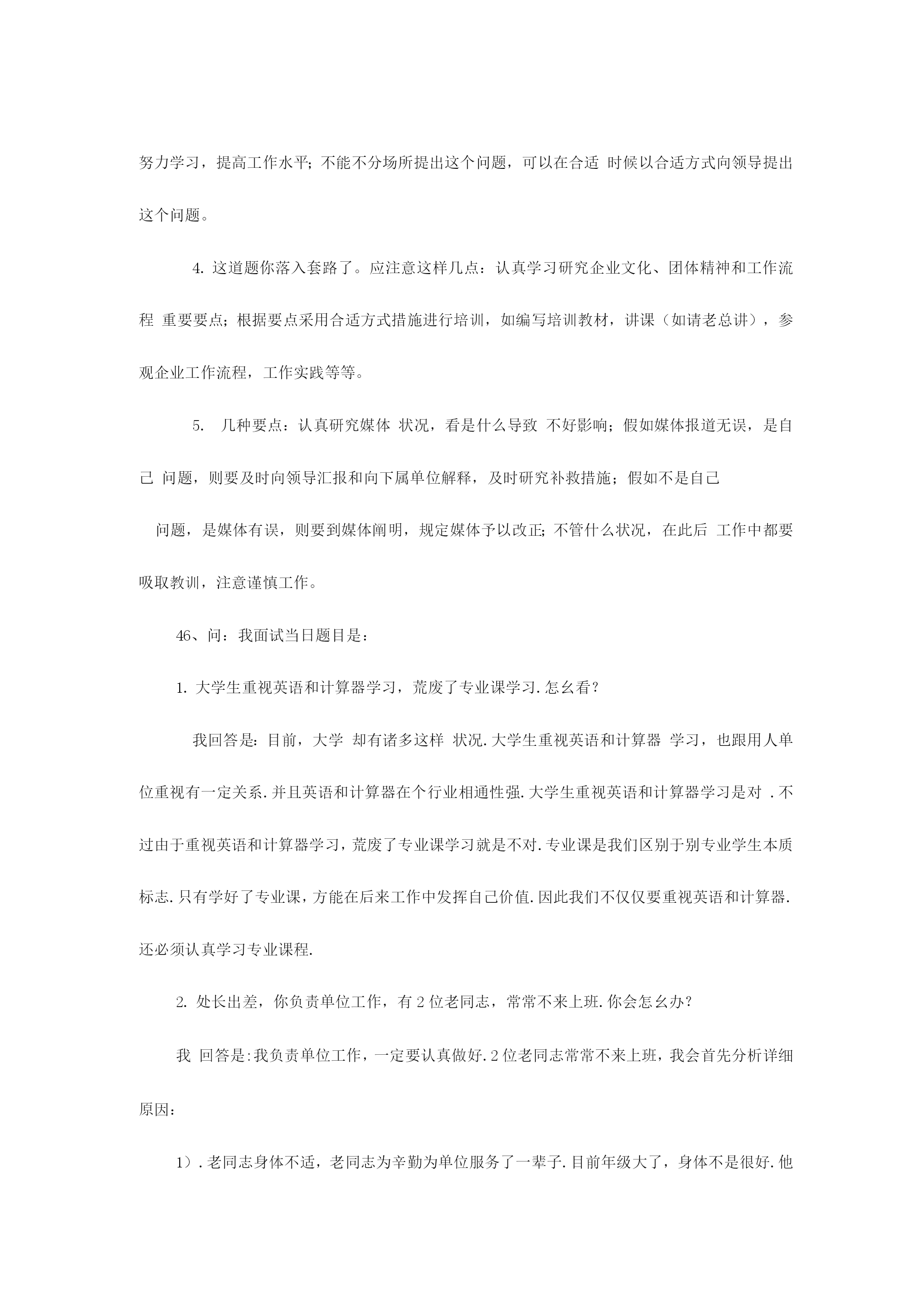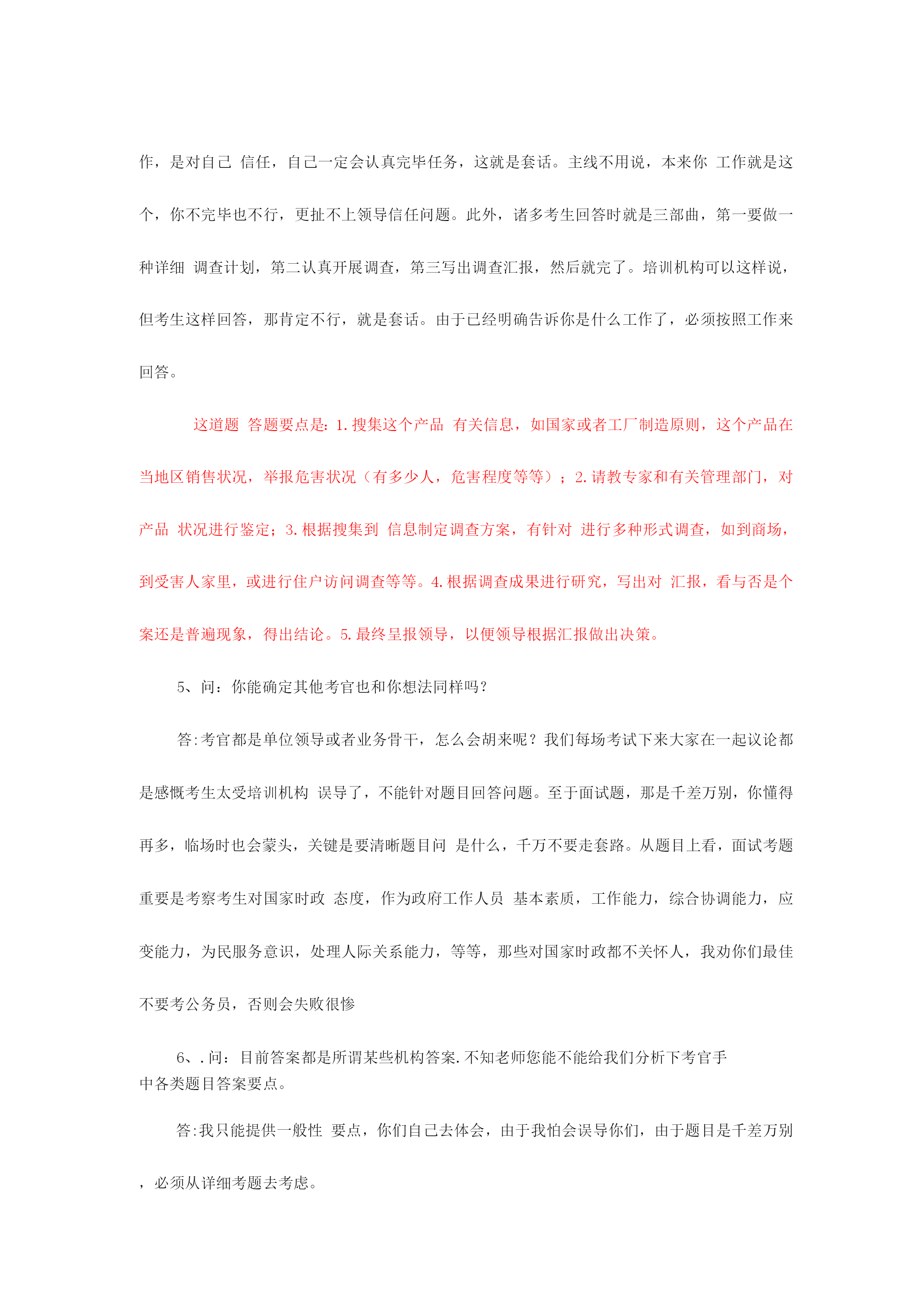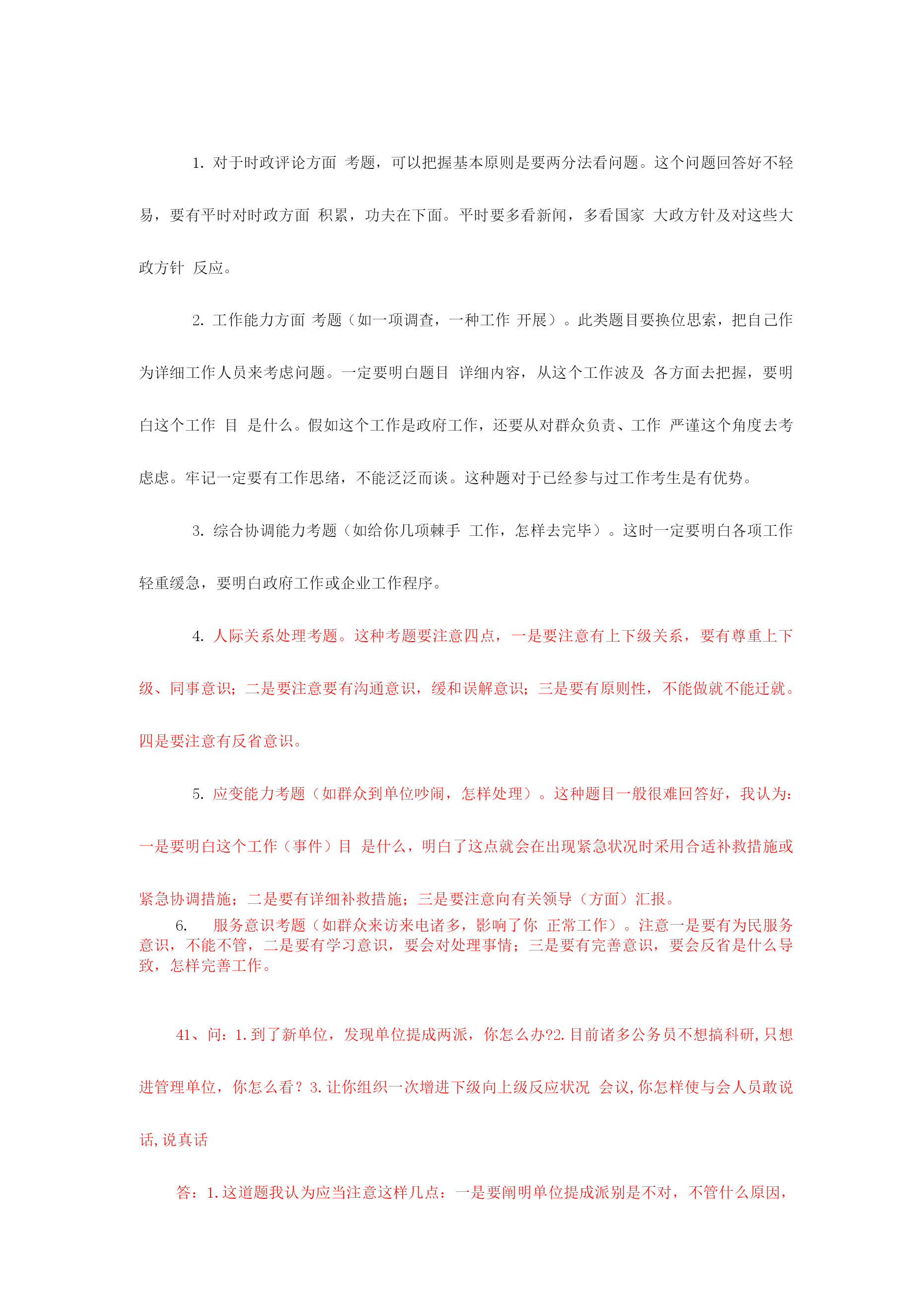 公务员面试备用万能模板2023年国家公务员笔试成绩已经公布,通过笔试障碍幸运公考学子们又遇上了“面试”这个拦路虎,在为自己努力得到回报欣喜同步,心、中难免会对公务员面试有几分担忧。为了协助广大公考学子走出面试疑团重围,专家总结了四大招法,帮您轻松过关。当碰到不好回答问题时,可以紧急使用万能模板。第一招法:应对人际交往,例如与同事发生矛盾,有了冲突,产生危机,怎样相处等。先讲一句名言:海明威说“每个人都不是一座孤岛”,因此在交往中会产生……总之要把握四个方面。一要尊重,二是理解,三是沟通,四是协助。第二招法:应对与领导相处,例如领导与自己意见相左,领导能力比自己差,领导比较专断等。把握四个原则:一尊重领导。每一种成功领导人均有其成功理由。二是理解领导。看问题每个人角度都不一样样,“横当作岭侧成峰”,自己想法是对,但领导就未必是错。三是协助领导,此为亮点,协助领导出筹划策,没有采用也是正常,假如领导违法违反原则,坚持自己意见,其实这也是协助领导防止出错。四是适应领导,适应其领导方式,并用自己影响力慢慢改正其缺陷。此四点绝对通吃天下领导与下属关系。第三招法:组织活动会议,尚有培训或是完毕领导交待任务。先讲一句“凡事预则立,不预则废”,合理规划将协助自己顺利完毕。第一,制定工作方案(活动主题、方式、时间、地点、对象、人员配置、费用预算、程序安排等等);第二,对方案论证(征求各方意见,向领导汇报,由领导定夺);第三,按计划实行(人员分组分工,任务分派等);第四,注意计划执行过程中各方关系协调(三个及时:及时沟通各方状况进行协调,及时向领导汇报,发现原方案内容或措施不妥要及时纠正);第五,计划后总结(对整个活动进行回忆、总结经验)。这五个环节十分有用,无往不胜!第四招法:处理政府突发事件或是异常状况。一保持镇静;二想尽一切措施使他情绪稳定;三耐心宣传国家有关法律法规;四实在不能稳定情势,向领导汇报,祈求支援。集体上访事件:第一,热情接待(请坐,倒杯水)第二,稳定情绪(想尽一切措施……)第三,认真倾听(群众呼声)第四,仔细记录(群众反应问题)第五,宣传解释(力所能及)第六,及时汇报(能处理当场处理,不能处理汇报领导处理或转交有关部门)成功属于有准备人,面试需要专心准备,才可以在面试中脱颖而出面试专家于老师提醒考生应遵照“先控制事态不能恶化”原则,按照:1、先冷静,2、迅速处理,3、查明原因追究责任”次序展开回答。其中,保持冷静,先安抚情绪,然后及时补救,提出处理问题方案,或记录、汇报问题,或协调处理、督办,再向上级汇报,追究责任等都是重要情节,大家可以参照。举例阐明例如,考官问,发现旅游者食物中毒,导游人员应当怎么做?首先设法使中毒者催吐,让中毒者大量喝水,以加速排泄,缓和毒性;同步,立即拨打急救,寻求医院救治;另一方面,应当防止其他旅客出现慌乱情绪,控制情绪;第三,在等待期间,请医院开具诊断证明;最终,迅速汇报旅行社并追究供餐单位责任。4、问:套话定义是什么呢?假如是说答题模版话,我觉得一种一般考生在那么紧张状况下使用一下模版起码会有一种提醒思绪作用,不犯方向性错误,并且听说考官其实均有打分原则,模版框架起码满足原则规定啊,要中庸一点话还是参照一下模版比很好吧?想请楼主简朴说说哪些经典套话是你一听到就觉得不行,不会给高分.答:套话就是不按照题目给出详细内容回答问题。可以告诉你是,考官手头会有每道题目答案。有一道题,看看大家怎么回答。你下属总是在完毕你布置任务后越级向上级汇报工作,碰到这种状况,你怎么办?这道题要注意回答三个要点:一是要通过多种渠道理解越级汇报原因,可以找本人谈,也可以找领导谈,也可以找其他人谈,也可以自己反思;二是假如是自己原因,要通过合适方式沟通。消除误解;三是假如不是自己原因,则必须找下属谈话,明确告诉越级是不对。总之要树立沟通意识,团结意识。不能太机械。。再例如一道这样题目:某产品被群众举报有安全隐患,领导指派你去进行调查,你怎样开展工作?诸多考生回答这道题目时,都是按照培训机构套路回答,说领导交给自己这项工作,是对自己信任,自己一定会认真完毕任务,这就是套话。主线不用说,本来你工作就是这个,你不完毕也不行,更扯不上领导信任问题。此外,诸多考生回答时就是三部曲,第一要做一种详细调查计划,第二认真开展调查,第三写出调查汇报,然后就完了。培训机构可以这样说,但考生这样回答,那肯定不行,就是套话。由于已经明确告诉你是什么工作了,必须按照工作来回答。这道题答题要点是:1.搜集这个产品有关信息,如国家或者工厂制造原则,这个产品在当地区销售状况,举报危害状况(有多少人,危害程度等等);2.请教专家和有关管理部门,对产品状况进行鉴定;3.根据搜集到信息制定