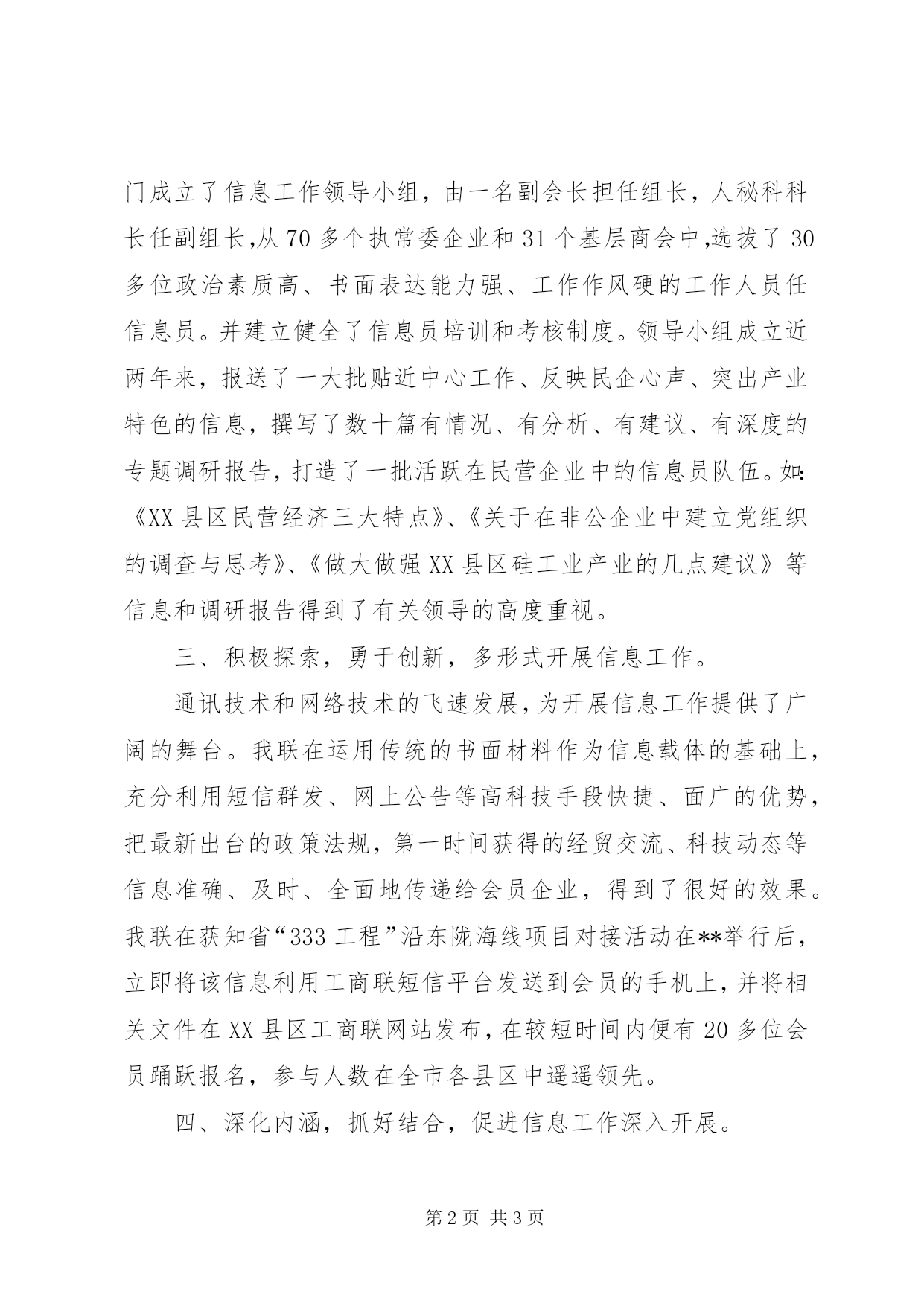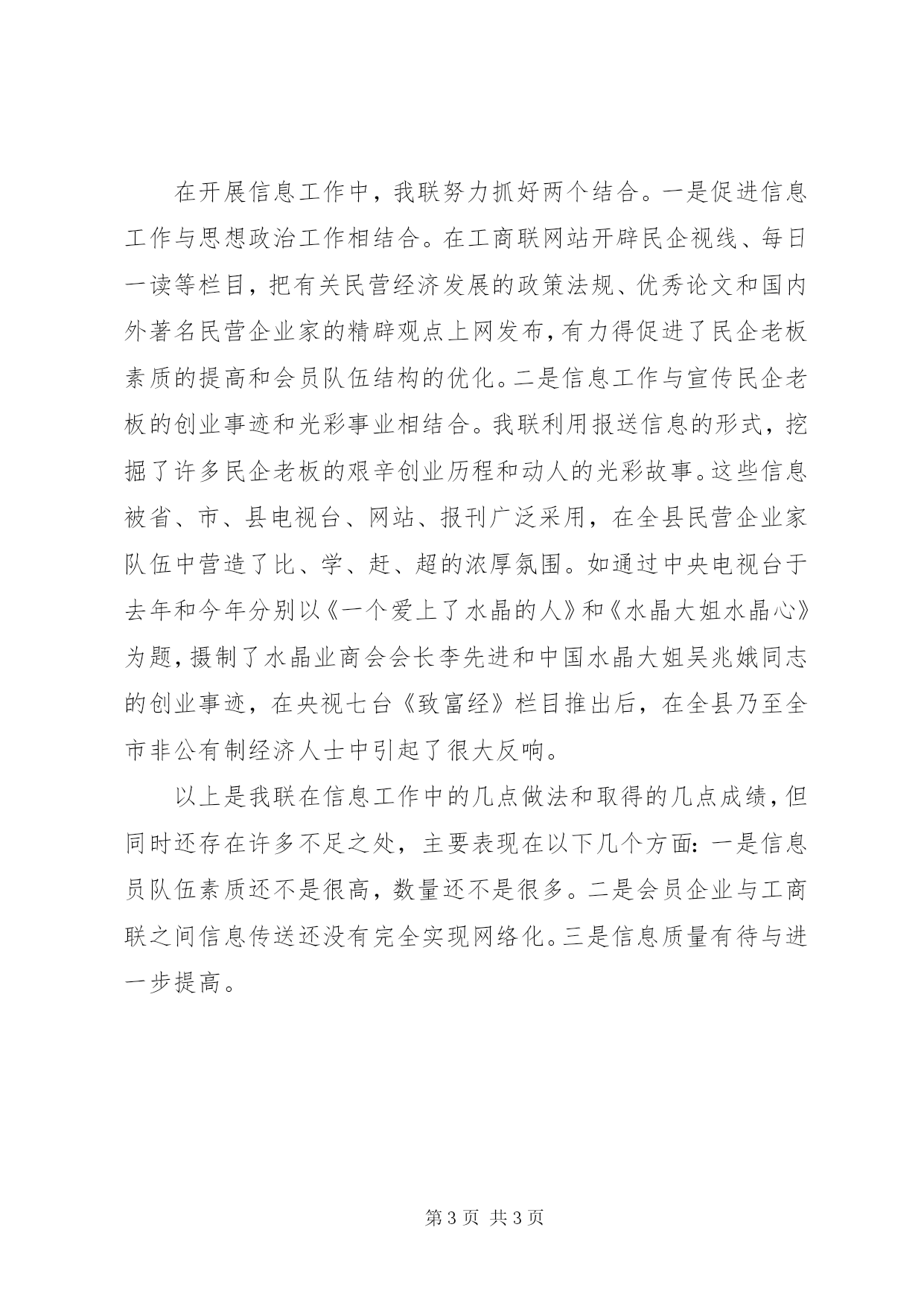 第PAGE\*Arabic\*MERGEFORMAT3页共NUMPAGES\*MERGEFORMAT3页工商联信息调研报告近年来,XX县区工商联在上级工商联的关心指导下,在县委、县政府的正确领导下,紧紧围绕县委、县政府中心工作和市工商联下达的目标任务,在信息工作方面取得了一定的成绩,主要采取了以下几点做法。一、与时俱进,充分认识新形势下信息工作的重要性。当今社会,是一个信息社会,信息工作已经成为政府、企业、军队、政党等各种社会组织的一项重要工作,信息已经成为决策的基础和依据。研究新情况,需要灵敏地捕捉信息;解决新问题,需要充分的利用信息。在新形势下,民营企业更加需要大量的、真实的、具有前瞻性的信息,以作为了解情况、制定决策、指导工作的参考和依据。信息工作做得好不好,提供的及时不及时,准确不准确,全面不全面,将直接影响民企业主的决策和全县经济的发展。信息工作开展得如何,在某种程度上反映着工商联为民营企业的服务质量和整体工作水平。近年来,我联紧密围绕民营经济发展需要,明确信息工作思路、重点和措施,不间断地为民营企业传递信息,并及时将民营企业需要上传的信息进行梳理和归纳,传递给县委、县政府和上级工商联,起到了桥梁和纽带作用。二、加强领导,健全组织,全面完善信息工作网络。为了确保信息工作顺利推进和向纵深发展。**年初,我联专门成立了信息工作领导小组,由一名副会长担任组长,人秘科科长任副组长,从70多个执常委企业和31个基层商会中,选拔了30多位政治素质高、书面表达能力强、工作作风硬的工作人员任信息员。并建立健全了信息员培训和考核制度。领导小组成立近两年来,报送了一大批贴近中心工作、反映民企心声、突出产业特色的信息,撰写了数十篇有情况、有分析、有建议、有深度的专题调研报告,打造了一批活跃在民营企业中的信息员队伍。如:《XX县区民营经济三大特点》、《关于在非公企业中建立党组织的调查与思考》、《做大做强XX县区硅工业产业的几点建议》等信息和调研报告得到了有关领导的高度重视。三、积极探索,勇于创新,多形式开展信息工作。通讯技术和网络技术的飞速发展,为开展信息工作提供了广阔的舞台。我联在运用传统的书面材料作为信息载体的基础上,充分利用短信群发、网上公告等高科技手段快捷、面广的优势,把最新出台的政策法规,第一时间获得的经贸交流、科技动态等信息准确、及时、全面地传递给会员企业,得到了很好的效果。我联在获知省“333工程”沿东陇海线项目对接活动在**举行后,立即将该信息利用工商联短信平台发送到会员的手机上,并将相关文件在XX县区工商联网站发布,在较短时间内便有20多位会员踊跃报名,参与人数在全市各县区中遥遥领先。四、深化内涵,抓好结合,促进信息工作深入开展。在开展信息工作中,我联努力抓好两个结合。一是促进信息工作与思想政治工作相结合。在工商联网站开辟民企视线、每日一读等栏目,把有关民营经济发展的政策法规、优秀论文和国内外著名民营企业家的精辟观点上网发布,有力得促进了民企老板素质的提高和会员队伍结构的优化。二是信息工作与宣传民企老板的创业事迹和光彩事业相结合。我联利用报送信息的形式,挖掘了许多民企老板的艰辛创业历程和动人的光彩故事。这些信息被省、市、县电视台、网站、报刊广泛采用,在全县民营企业家队伍中营造了比、学、赶、超的浓厚氛围。如通过中央电视台于去年和今年分别以《一个爱上了水晶的人》和《水晶大姐水晶心》为题,摄制了水晶业商会会长李先进和中国水晶大姐吴兆娥同志的创业事迹,在央视七台《致富经》栏目推出后,在全县乃至全市非公有制经济人士中引起了很大反响。以上是我联在信息工作中的几点做法和取得的几点成绩,但同时还存在许多不足之处,主要表现在以下几个方面:一是信息员队伍素质还不是很高,数量还不是很多。二是会员企业与工商联之间信息传送还没有完全实现网络化。三是信息质量有待与进一步提高。