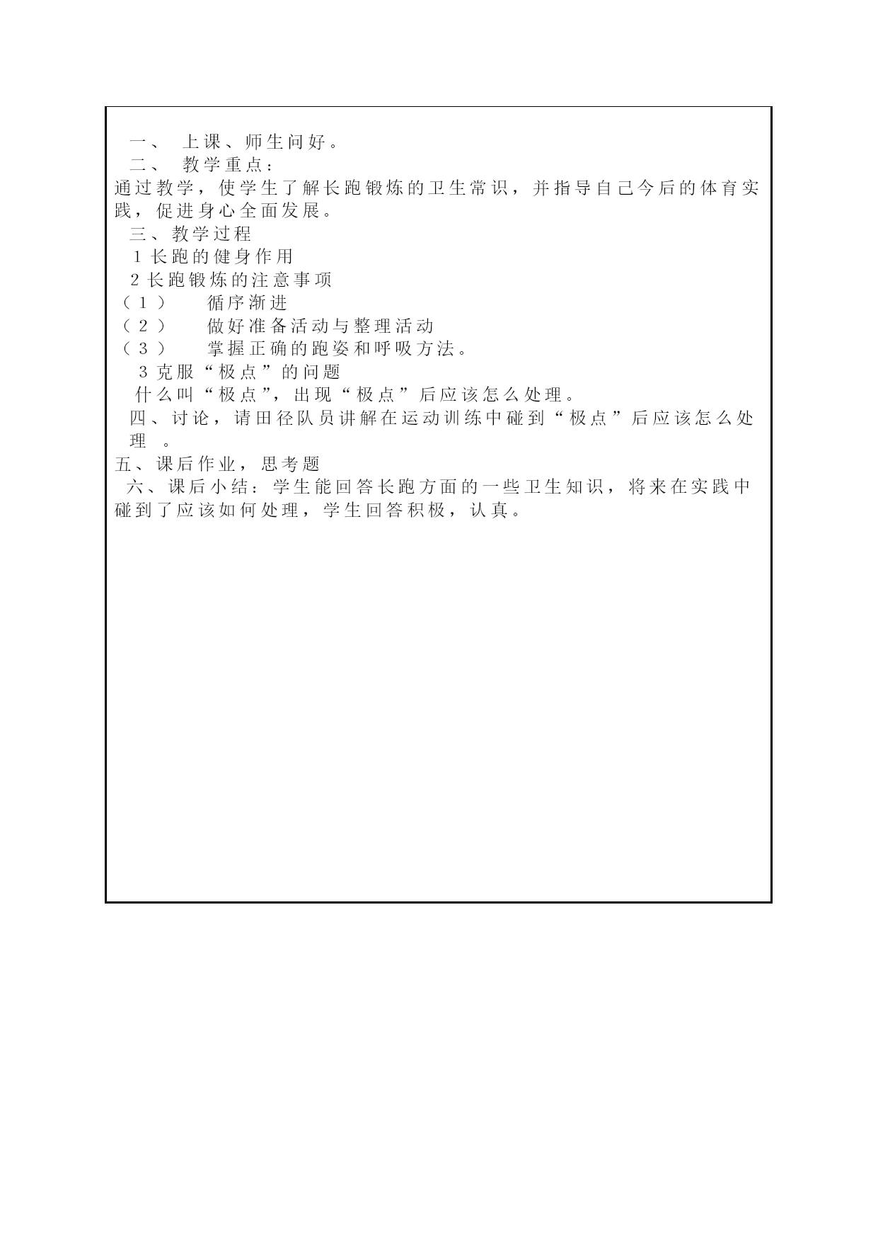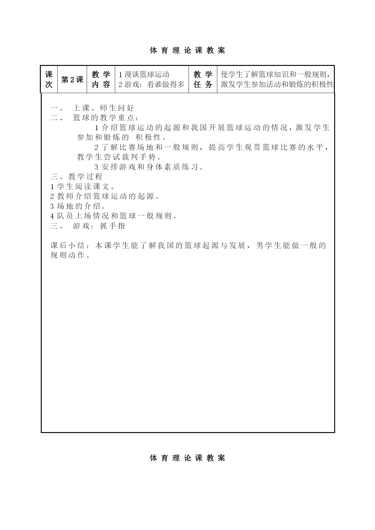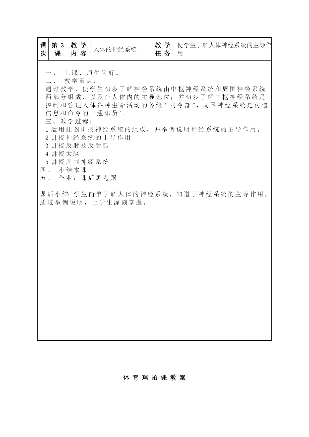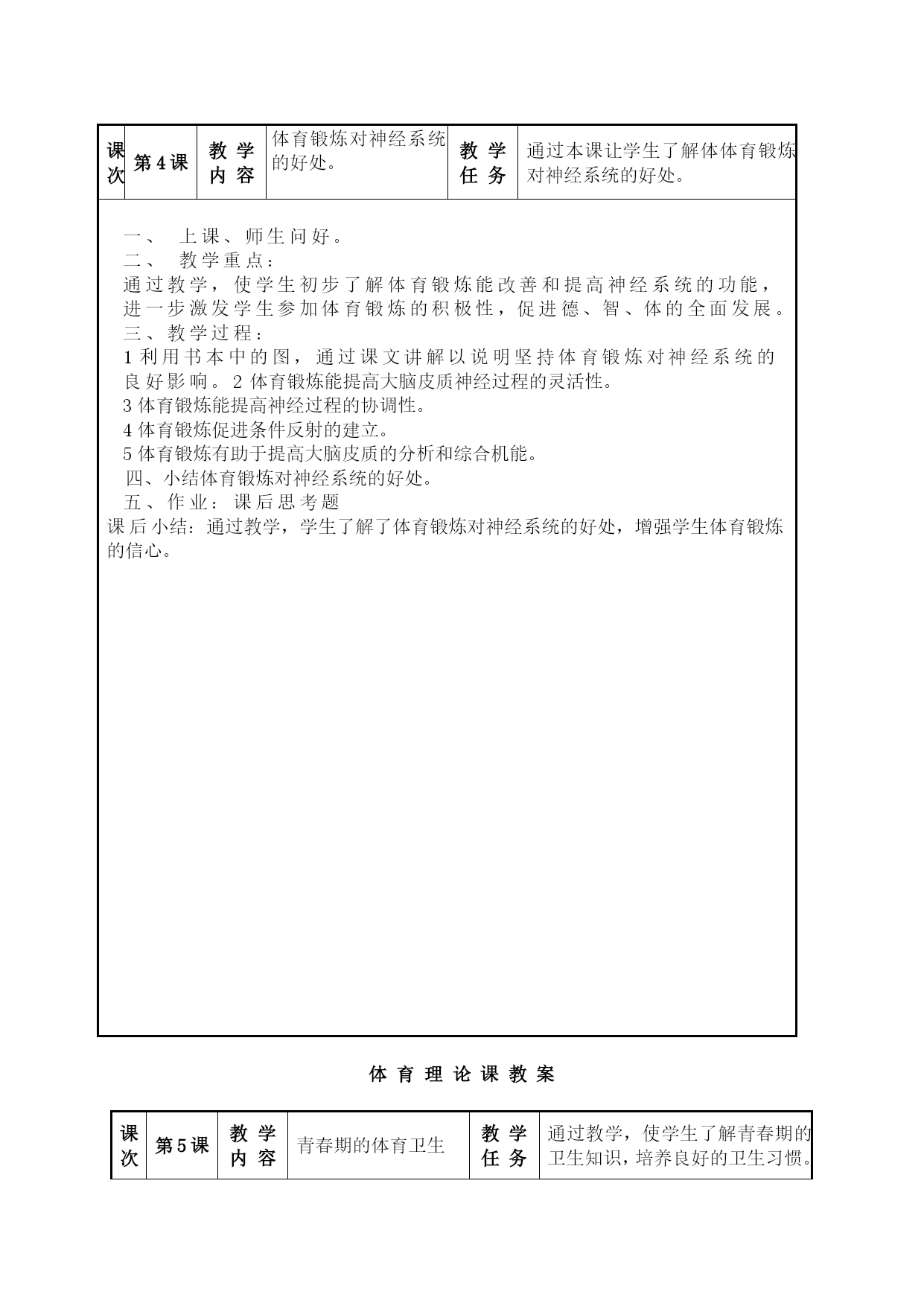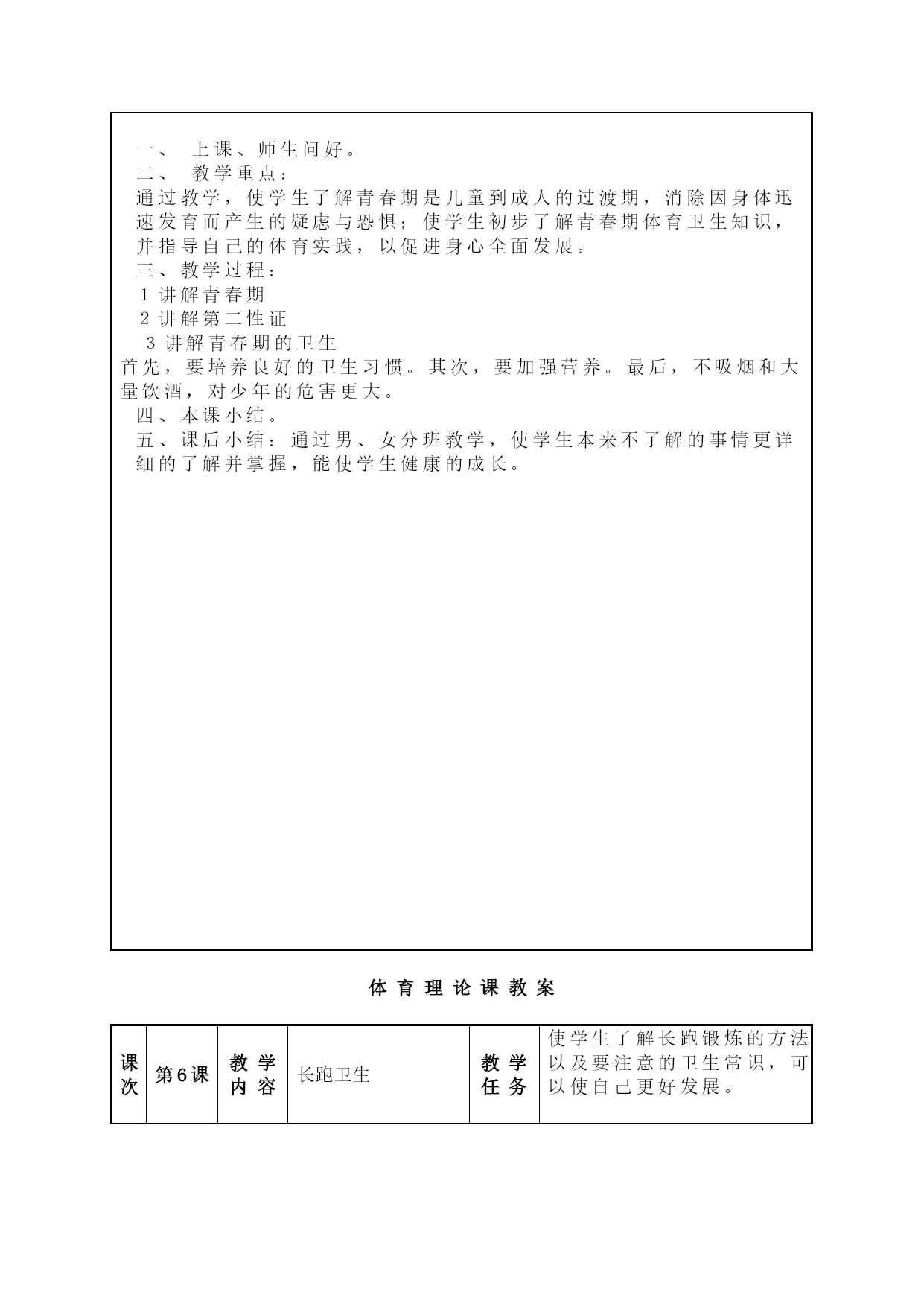 体育理论课教案课次第1课教学内容风靡全球的世界第一运动——足球教学任务教育学生响应毛毛主席的号召,以毛主席为榜样,从小养成自觉锻炼身体的良好习惯。上课、师生问好。新学期要求:(1)回顾上一学期的体育成绩,谈谈本学期的要求。(2)本学期考核内容:400米、一分钟仰卧起坐、立位体前屈教学重点了解足球为什么被称为“世界第一运动”介绍足球的起源、作用和价值,激励学生参加有益的体育运动。理论知识1大家先看课文,再说说“世界杯”上中国队员的表现,为什么中国队技不如人。谈谈看法。2足球的起源于我国,早在3500年前的殷代就有了足球舞,这是古代足球的雏形。公元前四纪,足球运动因古希腊马其顿国王亚力山发动的战争而引入中东。以后传入罗马,发展成一种把球带到对方一方为胜的竞赛性游戏。接着传入到法国,1066年传入美国,在东方,唐代时我国的足球游戏传入日本。现代足球运动始于英国。巴西可称为“足球王国”在第十五“世界杯”足球赛上又获得冠军。成为第一个四次获得世界杯冠军的球队。我国为加速提高足球运动水平,冲出亚洲,走向世界,从儿童抓起,打下基础,目前已经成立许多儿童足球学校,我们每个少年儿童应积极参加足球运动,将来为祖国争光。课后作业1足球为何被称为“世界第一运动”?2结合考核内容写本学期的计划、目标。课后小结:本课学生的足球知识比较丰富,从“世界杯”的话题上看出男学生比较喜欢这个项目。知道了足球为什么被称为“世界第一运动”,等等知识。体育理论课教案课次第2课教学内容1漫谈篮球运动2游戏:看谁做得多教学任务使学生了解篮球知识和一般规则,激发学生参加活动和锻炼的积极性。上课、师生问好篮球的教学重点:1介绍篮球运动的起源和我国开展篮球运动的情况,激发学生参加和锻炼的积极性。2了解比赛场地和一般规则,提高学生观赏篮球比赛的水平,教学生尝试裁判手势。3安排游戏和身体素质练习。三、教学过程1学生阅读课文。2教师介绍篮球运动的起源。3场地的介绍。4队员上场情况和篮球一般规则。游戏:抓手指课后小结:本课学生能了解我国的篮球起源与发展,男学生能做一般的规则动作。体育理论课教案课次第3课教学内容人体的神经系统教学任务使学生了解人体神经系统的主导作用上课、师生问好。教学重点:通过教学,使学生初步了解神经系统由中枢神经系统和周围神经系统两部分组成,以及在人体内的主导地位;并初步了解中枢神经系统是控制和管理人体各种生命活动的各级“司令部”,周围神经系统是传递信息和命令的“通讯员”。三、教学过程:1运用挂图讲授神经系统的组成,并举例说明神经系统的主导作用。2讲授神经系统的主导作用3讲授反射及反射弧4讲授大脑5讲授周围神经系统小结本课作业:课后思考题课后小结:学生简单了解人体的神经系统,知道了神经系统的主导作用,通过举例说明,让学生深刻掌握。体育理论课教案课次第4课教学内容体育锻炼对神经系统的好处。教学任务通过本课让学生了解体体育锻炼对神经系统的好处。上课、师生问好。教学重点:通过教学,使学生初步了解体育锻炼能改善和提高神经系统的功能,进一步激发学生参加体育锻炼的积极性,促进德、智、体的全面发展。三、教学过程:1利用书本中的图,通过课文讲解以说明坚持体育锻炼对神经系统的良好影响。2体育锻炼能提高大脑皮质神经过程的灵活性。3体育锻炼能提高神经过程的协调性。4体育锻炼促进条件反射的建立。5体育锻炼有助于提高大脑皮质的分析和综合机能。四、小结体育锻炼对神经系统的好处。五、作业:课后思考题课后小结:通过教学,学生了解了体育锻炼对神经系统的好处,增强学生体育锻炼的信心。体育理论课教案课次第5课教学内容青春期的体育卫生教学任务通过教学,使学生了解青春期的卫生知识,培养良好的卫生习惯。上课、师生问好。教学重点:通过教学,使学生了解青春期是儿童到成人的过渡期,消除因身体迅速发育而产生的疑虑与恐惧;使学生初步了解青春期体育卫生知识,并指导自己的体育实践,以促进身心全面发展。三、教学过程:1讲解青春期2讲解第二性证3讲解青春期的卫生首先,要培养良好的卫生习惯。其次,要加强营养。最后,不吸烟和大量饮酒,对少年的危害更大。四、本课小结。五、课后小结:通过男、女分班教学,使学生本来不了解的事情更详细的了解并掌握,能使学生健康的成长。体育理论课教案课次第6课教学内容长跑卫生教学任务使学生了解长跑锻炼的方法以及要注意的卫生常识,可以使自己更好发展。上课、师生问好。教学重点:通过教学,使学生了解长跑锻炼的卫生常识,并指导自己今后的体育实践,促进身心全面发展。三、教学过程1长跑的健身作用2长跑锻
