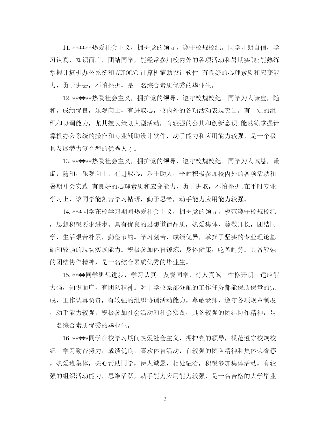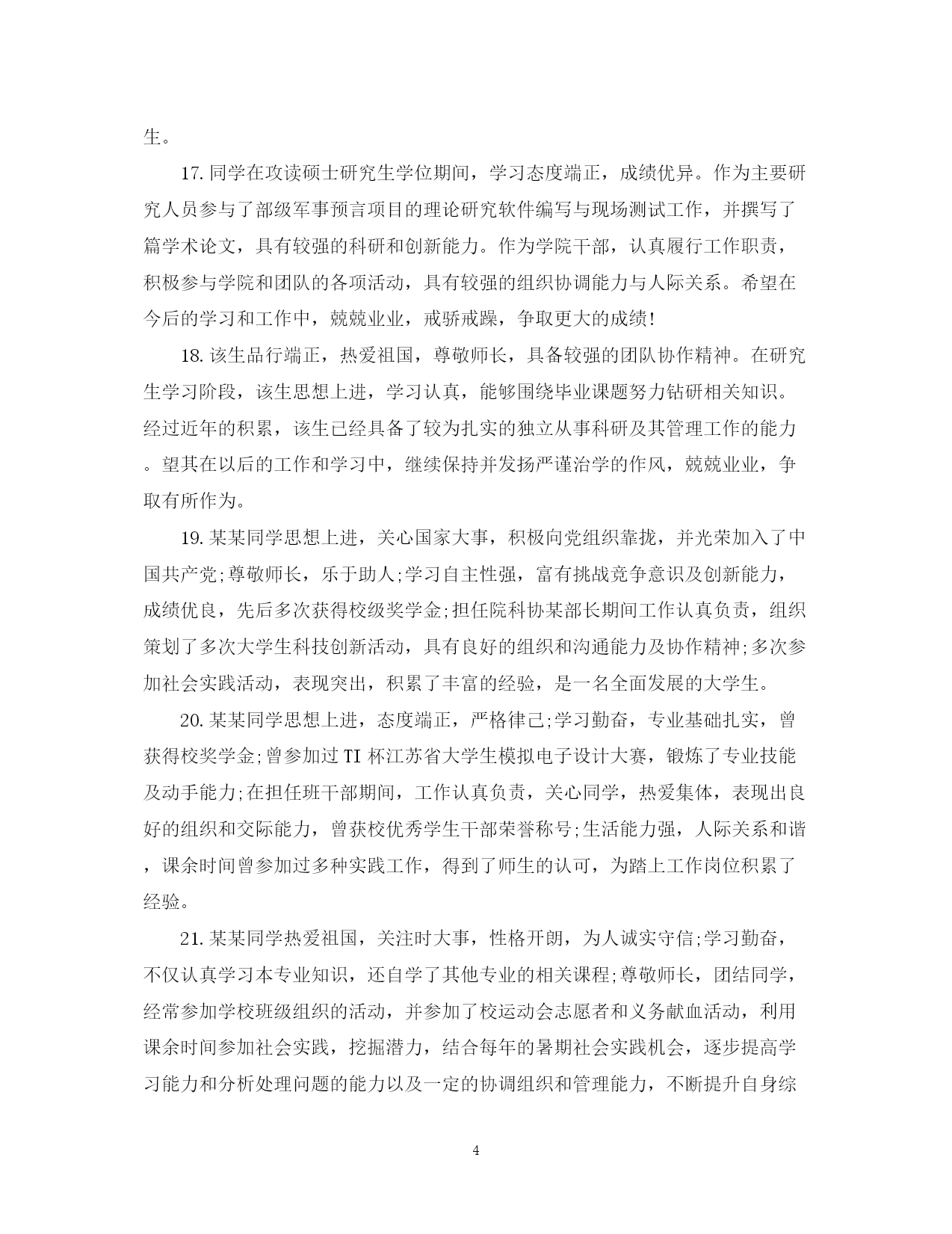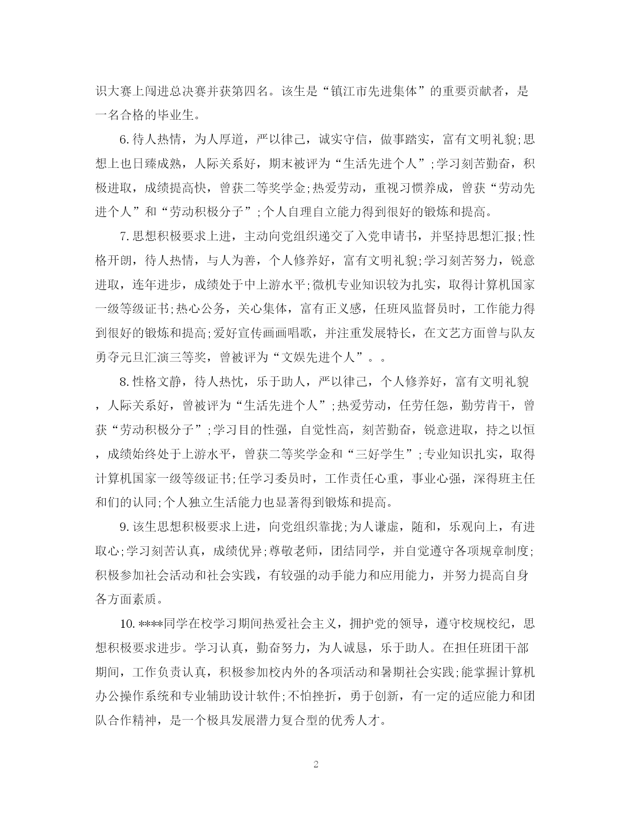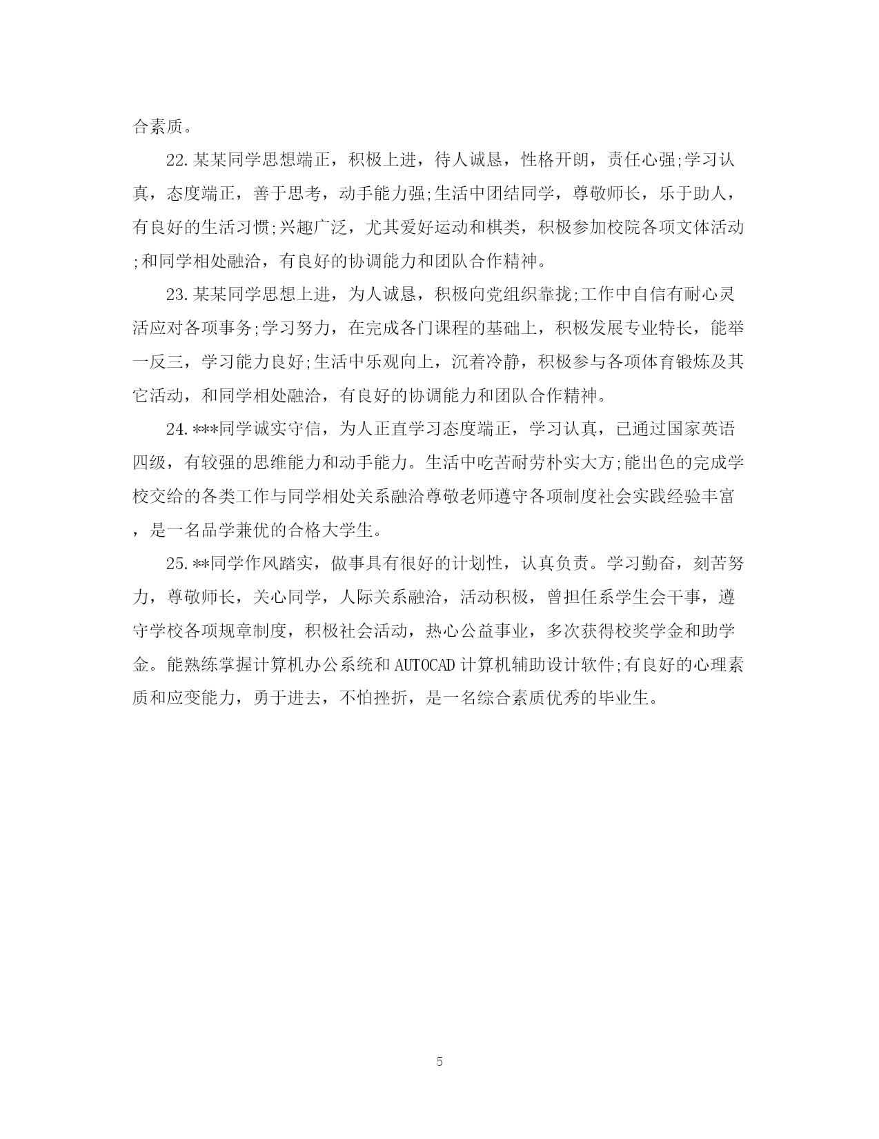 此资料由网络收集而来,如有侵权请告知上传者立即删除。资料共分享,我们负责传递知识。PAGEPAGE5研究生推荐表学校评语就业推荐表中一般都需要我们学校对我们学生能力等进行评价,写一份评语。以下是小编搜集整理的研究生推荐表学校评语,欢迎阅读,供大家参考和借鉴!更多资讯尽在学校评语栏目!1.某某同学热爱祖国,热爱集体,把提高自身修养和素质作为目标,在学习上有自己的规划,能够自觉朝制定的方向努力,学习勤奋,注重学习效率。在担任班干部期间,积极参与班级的活动,协助班长和团支书做好班级的工作。在生活上,该同学性格开朗,与大家和睦相处,团结一致,有较强的集体荣誉感。2.该生学习刻苦,成绩优秀,热爱网络技术,具备一定技能。有很强的学习能力和适应能力,能快速接受新生技术,并具有良好的团队精神。积极参加各项集体活动,有团队精神。乐观进取,吃苦耐劳,是一名全面发展的毕业生。3.思维活跃,性格直率,为人坦诚;学习注重效率,阅读广泛,知识面宽,学业成绩始终处于中上游水平;注重能力的培养,在口头表达即兴演讲活动主持和文艺方面小有特长,两年元旦汇演分获三二等奖,公开主题班会上有上佳表现;对专业知识兴趣甚浓,学得较为扎实,不仅在基本原理常用应用软件上较为得心应手,而且在硬件方面也小显伸手,代表系部在全高专互联网知识大赛上闯进总决赛并获第四名。该生是“镇江市先进集体”的重要贡献者,是一名合格的毕业生。4.思想积极要求上进,主动向党组织递交了入党申请书,并坚持思想汇报;为人忠厚,遵规守纪,文明礼貌和个人修养较好;平时生活俭朴,自立能力强团队意识浓,曾被评为“生活先进个人”;学习用功钻研,有恒心和毅力,成绩始终处于上游水平,尤其是理科方面更为见长,曾获一等奖学金;专业知识扎实,取得计算机国家一级二级等级证书,代表系部在全高专互联网知识大赛上闯进总决赛并获第四名。该生是“镇江市先进集体”的重要贡献者,是一名合格的毕业生。5.自立能力强团队意识浓,曾被评为“生活先进个人”;学习用功钻研,有恒心和毅力,成绩始终处于上游水平,尤其是理科方面更为见长,曾获一等奖学金;专业知识扎实,取得计算机国家一级二级等级证书,代表系部在全高专互联网知识大赛上闯进总决赛并获第四名。该生是“镇江市先进集体”的重要贡献者,是一名合格的毕业生。6.待人热情,为人厚道,严以律己,诚实守信,做事踏实,富有文明礼貌;思想上也日臻成熟,人际关系好,期末被评为“生活先进个人”;学习刻苦勤奋,积极进取,成绩提高快,曾获二等奖学金;热爱劳动,重视习惯养成,曾获“劳动先进个人”和“劳动积极分子”;个人自理自立能力得到很好的锻炼和提高。7.思想积极要求上进,主动向党组织递交了入党申请书,并坚持思想汇报;性格开朗,待人热情,与人为善,个人修养好,富有文明礼貌;学习刻苦努力,锐意进取,连年进步,成绩处于中上游水平;微机专业知识较为扎实,取得计算机国家一级等级证书;热心公务,关心集体,富有正义感,任班风监督员时,工作能力得到很好的锻炼和提高;爱好宣传画画唱歌,并注重发展特长,在文艺方面曾与队友勇夺元旦汇演三等奖,曾被评为“文娱先进个人”。。8.性格文静,待人热忱,乐于助人,严以律己,个人修养好,富有文明礼貌,人际关系好,曾被评为“生活先进个人”;热爱劳动,任劳任怨,勤劳肯干,曾获“劳动积极分子”;学习目的性强,自觉性高,刻苦勤奋,锐意进取,持之以恒,成绩始终处于上游水平,曾获二等奖学金和“三好学生”;专业知识扎实,取得计算机国家一级等级证书;任学习委员时,工作责任心重,事业心强,深得班主任和们的认同;个人独立生活能力也显著得到锻炼和提高。9.该生思想积极要求上进,向党组织靠拢;为人谦虚,随和,乐观向上,有进取心;学习刻苦认真,成绩优异;尊敬老师,团结同学,并自觉遵守各项规章制度;积极参加社会活动和社会实践,有较强的动手能力和应用能力,并努力提高自身各方面素质。10.****同学在校学习期间热爱社会主义,拥护党的领导,遵守校规校纪,思想积极要求进步。学习认真,勤奋努力,为人诚恳,乐于助人。在担任班团干部期间,工作负责认真,积极参加校内外的各项活动和暑期社会实践;能掌握计算机办公操作系统和专业辅助设计软件;不怕挫折,勇于创新,有一定的适应能力和团队合作精神,是一个极具发展潜力复合型的优秀人才。11.******热爱社会主义,拥护党的领导,遵守校规校纪。同学开朗自信,学习认真,知识面广,团结同学,能经常参加校内外的各项活动和暑期实践;能熟练掌握计算机办公系统和AUTOCAD计算机辅助设计软件;有良好的心理素质和应变能力,勇于进去,不怕挫折,是一名综合素质优秀的毕业生。12.******热爱社会主义,拥护党的领导,遵守校规校纪。同学为人谦虚,随和,成绩优良,乐观向上,有进取心,