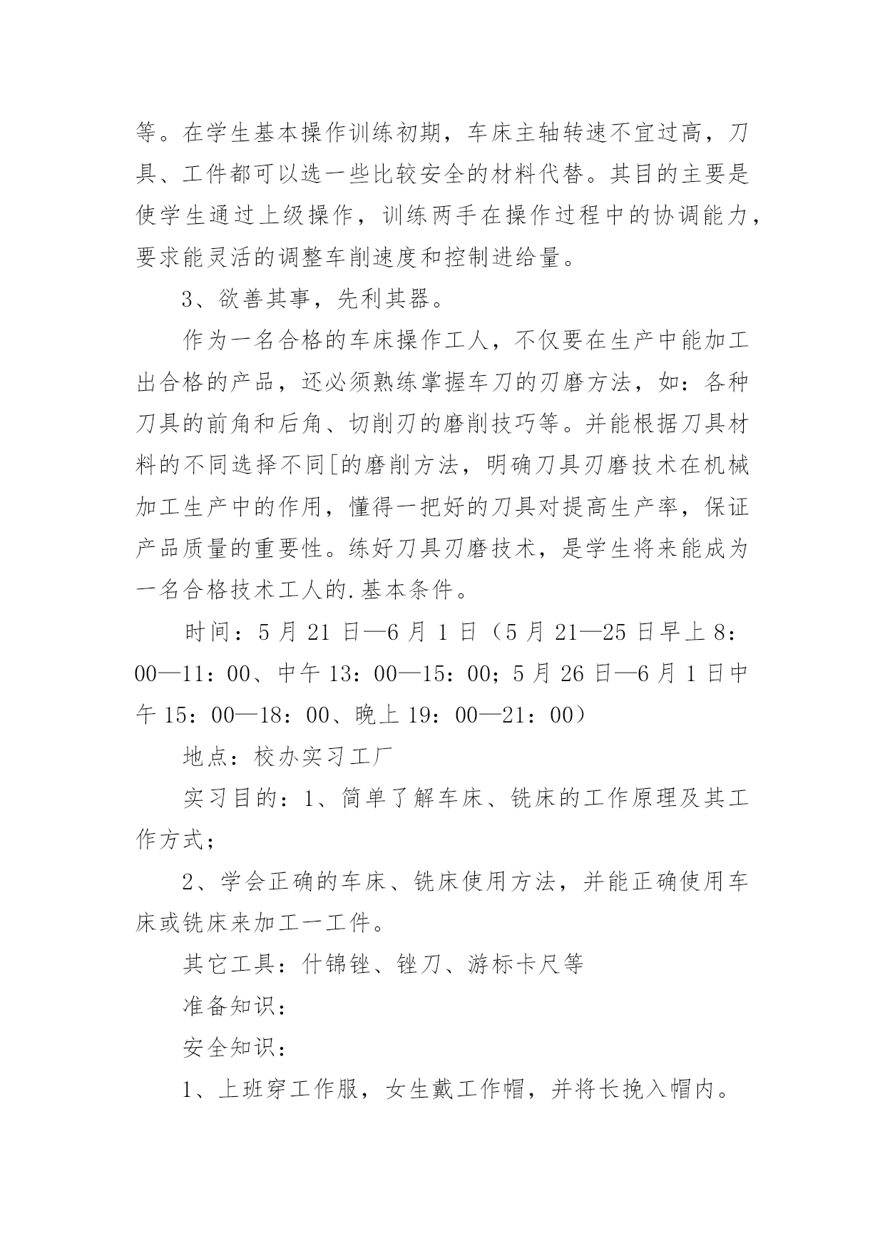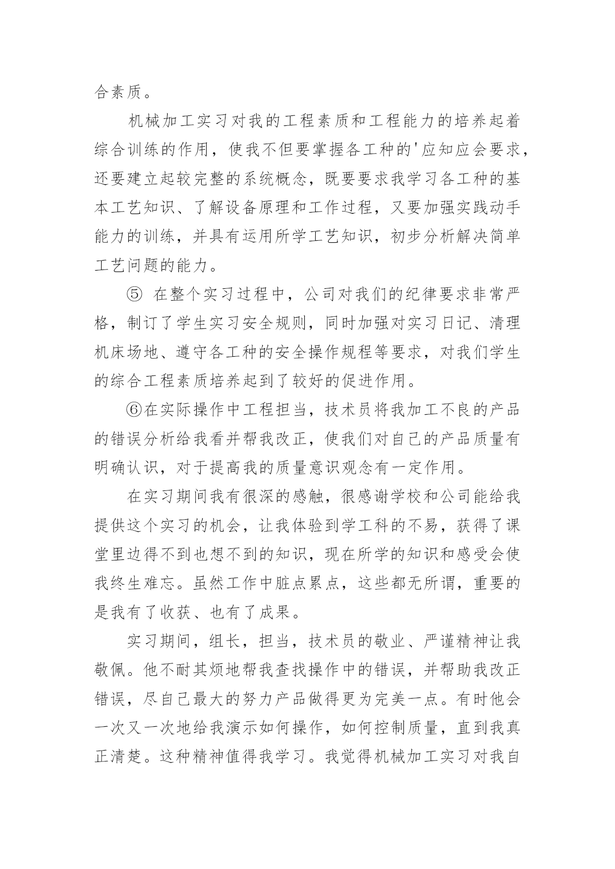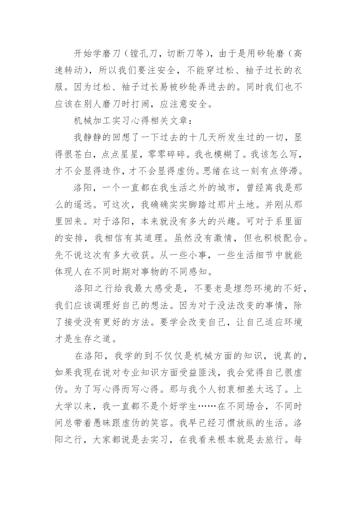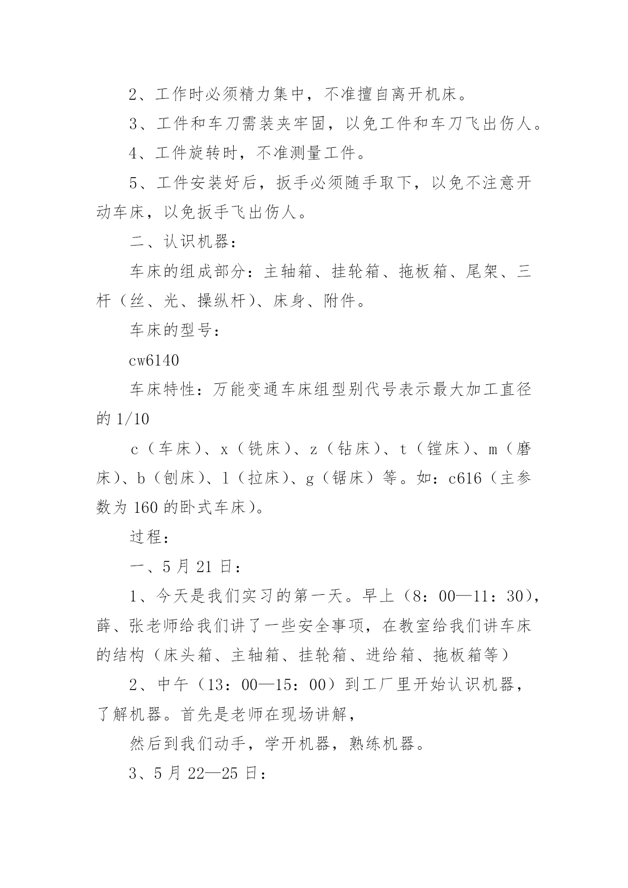 机械加工实习心得当我们受到启发,对学习和工作生活有了新的看法时,应该马上记录下来,写一篇心得体会,它可以帮助我们了解自己的这段时间的学习、工作生活状态。应该怎么写才合适呢?以下是小编整理的机械加工实习心得,欢迎大家借鉴与参考,希望对大家有所帮助。机械加工实习心得篇1要把一个没有任何专业技术基础、从来没有接触过生产的大学生,通过学校的几年学习,培养成一名合格的、熟练的技术工人,这需要一个理论和实践相结合的过程。专业基本功训练是学生学好专业技能的基础环节。要抓好基本功训练,则要从以下几个方面入手。1、注意安全安全文明生产是学生进入生产实习的第一课,要成为一名合格的技术工人,就必须树立牢固的安全文明生产意识。教学中对各种机床、砂轮机等的安全操作规程,实习中工作服的穿戴要求及文明生产规范等,要求学生不仅要认真听,还必须牢记。如:不应戴手套操作机床、女生必须戴工作帽、搞好车间卫生等。2、熟识机床。车床的基本操作包括工件的装夹,刀具的选用,通过换档改变车床主轴的转速,左右手在走刀、进给时的相互配合等。在学生基本操作训练初期,车床主轴转速不宜过高,刀具、工件都可以选一些比较安全的材料代替。其目的主要是使学生通过上级操作,训练两手在操作过程中的协调能力,要求能灵活的调整车削速度和控制进给量。3、欲善其事,先利其器。作为一名合格的车床操作工人,不仅要在生产中能加工出合格的产品,还必须熟练掌握车刀的刃磨方法,如:各种刀具的前角和后角、切削刃的磨削技巧等。并能根据刀具材料的不同选择不同[的磨削方法,明确刀具刃磨技术在机械加工生产中的作用,懂得一把好的刀具对提高生产率,保证产品质量的重要性。练好刀具刃磨技术,是学生将来能成为一名合格技术工人的.基本条件。时间:5月21日—6月1日(5月21—25日早上8:00—11:00、中午13:00—15:00;5月26日—6月1日中午15:00—18:00、晚上19:00—21:00)地点:校办实习工厂实习目的:1、简单了解车床、铣床的工作原理及其工作方式;2、学会正确的车床、铣床使用方法,并能正确使用车床或铣床来加工一工件。其它工具:什锦锉、锉刀、游标卡尺等准备知识:安全知识:1、上班穿工作服,女生戴工作帽,并将长挽入帽内。2、工作时必须精力集中,不准擅自离开机床。3、工件和车刀需装夹牢固,以免工件和车刀飞出伤人。4、工件旋转时,不准测量工件。5、工件安装好后,扳手必须随手取下,以免不注意开动车床,以免扳手飞出伤人。二、认识机器:车床的组成部分:主轴箱、挂轮箱、拖板箱、尾架、三杆(丝、光、操纵杆)、床身、附件。车床的型号:cw6140车床特性:万能变通车床组型别代号表示最大加工直径的1/10c(车床)、x(铣床)、z(钻床)、t(镗床)、m(磨床)、b(刨床)、l(拉床)、g(锯床)等。如:c616(主参数为160的卧式车床)。过程:一、5月21日:1、今天是我们实习的第一天。早上(8:00—11:30),薛、张老师给我们讲了一些安全事项,在教室给我们讲车床的结构(床头箱、主轴箱、挂轮箱、进给箱、拖板箱等)2、中午(13:00—15:00)到工厂里开始认识机器,了解机器。首先是老师在现场讲解,然后到我们动手,学开机器,熟练机器。3、5月22—25日:开始学磨刀(镗孔刀,切断刀等),由于是用砂轮磨(高速转动),所以我们要注安全,不能穿过松、袖子过长的衣服。因为过松、袖子过长易被砂轮弄进去的。同时我们也不应该在别人磨刀时打闹,应注意安全。机械加工实习心得相关文章:我静静的回想了一下过去的十几天所发生过的一切,显得很苍白,点点星星,零零碎碎。我也模糊了。我该怎么写,才不会显得造作,才不会显得虚伪。思绪在这一刻有点停滞。洛阳,一个一直都在我生活之外的城市,曾经离我是那么的遥远。可这次,我确确实实脚踏过那片土地。并刚从那里回来。对于洛阳,本来就没有多大的兴趣。可对于系里面的安排,我相信有其道理。虽然没有激情,但也积极配合。先不说这次有多大收获。从一些小事,一些生活细节中就能体现人在不同时期对事物的不同感知。洛阳之行给我最大感受是,不要老是埋怨环境的不好,我们应该调理好自己的想法。因为对于没法改变的事情,除了接受没有更好的方法。要学会改变自己,让自己适应环境才是生存之道。在洛阳,我学的到不仅仅是机械方面的知识,说真的,如果我现在说对专业知识方面受益匪浅,我会觉得自己很虚伪。为了写心得而写心得。那与我个人初衷相差太远了。上大学以来,我一直都不是个好学生……在不同场合,不同时间总带着愚昧跟虚伪的笑容。我早已经习惯放纵的生活。洛阳之行,大家都说是去实习,在我看来根本就是去旅行。每天每个人脸上总洋溢着笑容……丝毫感觉不到这是在实习。感觉不到是实习还有其它原因。在洛阳。很多简单想法都不约而同的浮现在我脑间。比如,我们该去哪里吃
