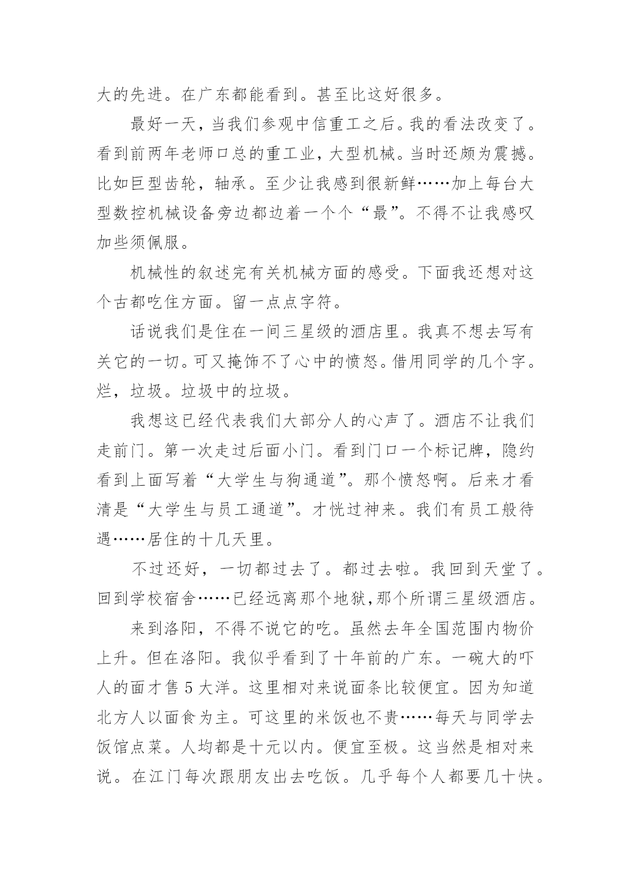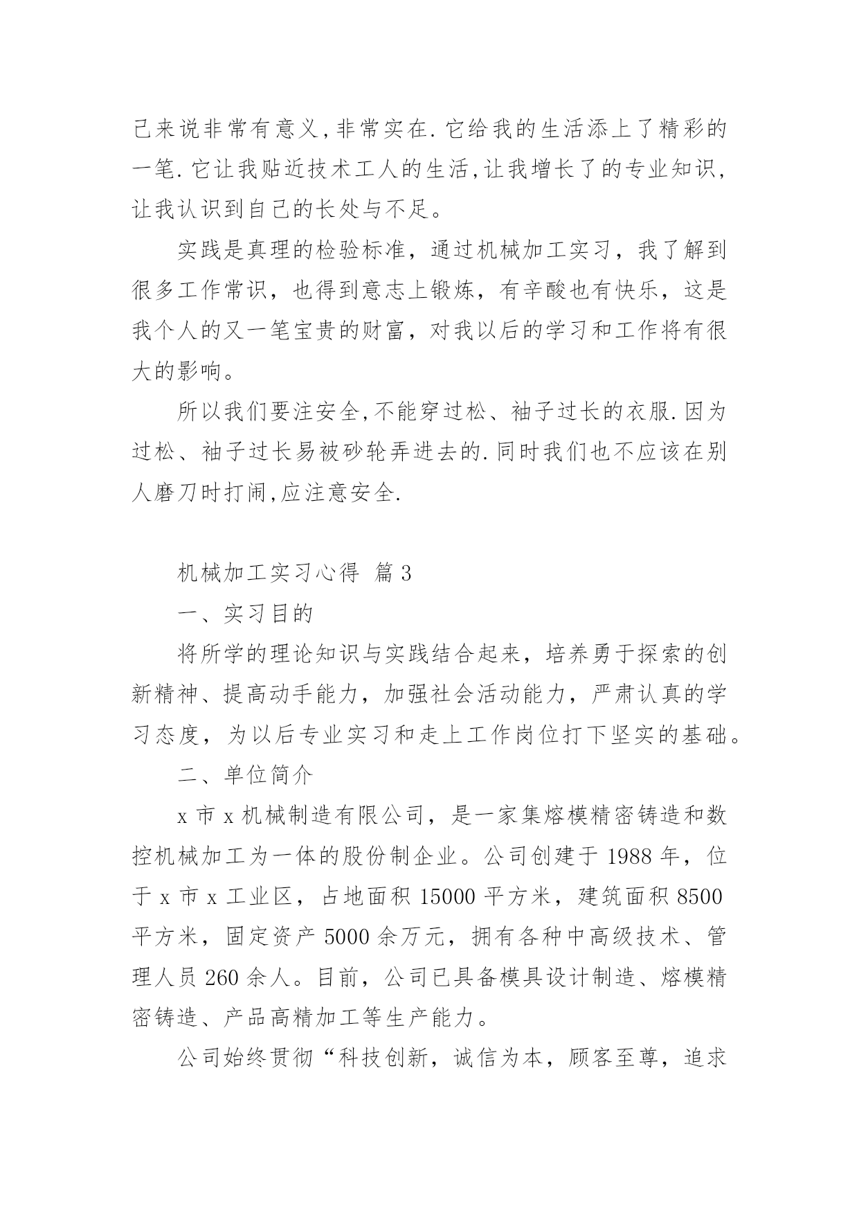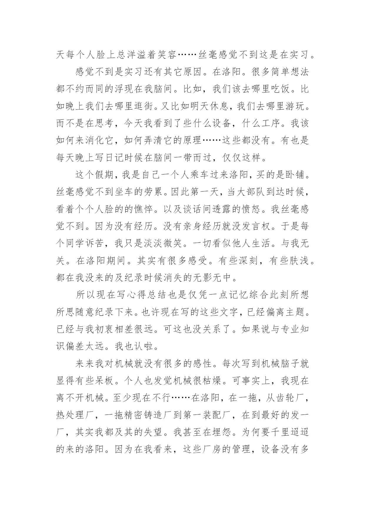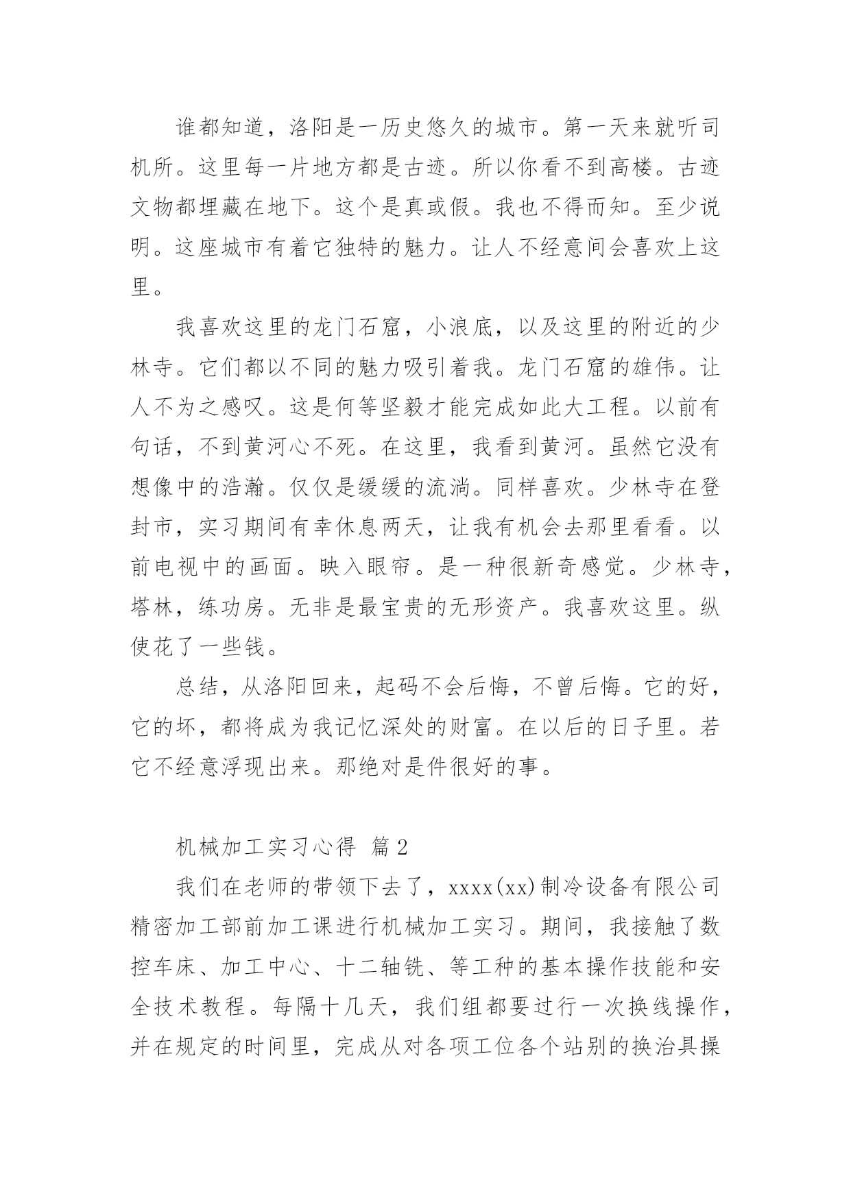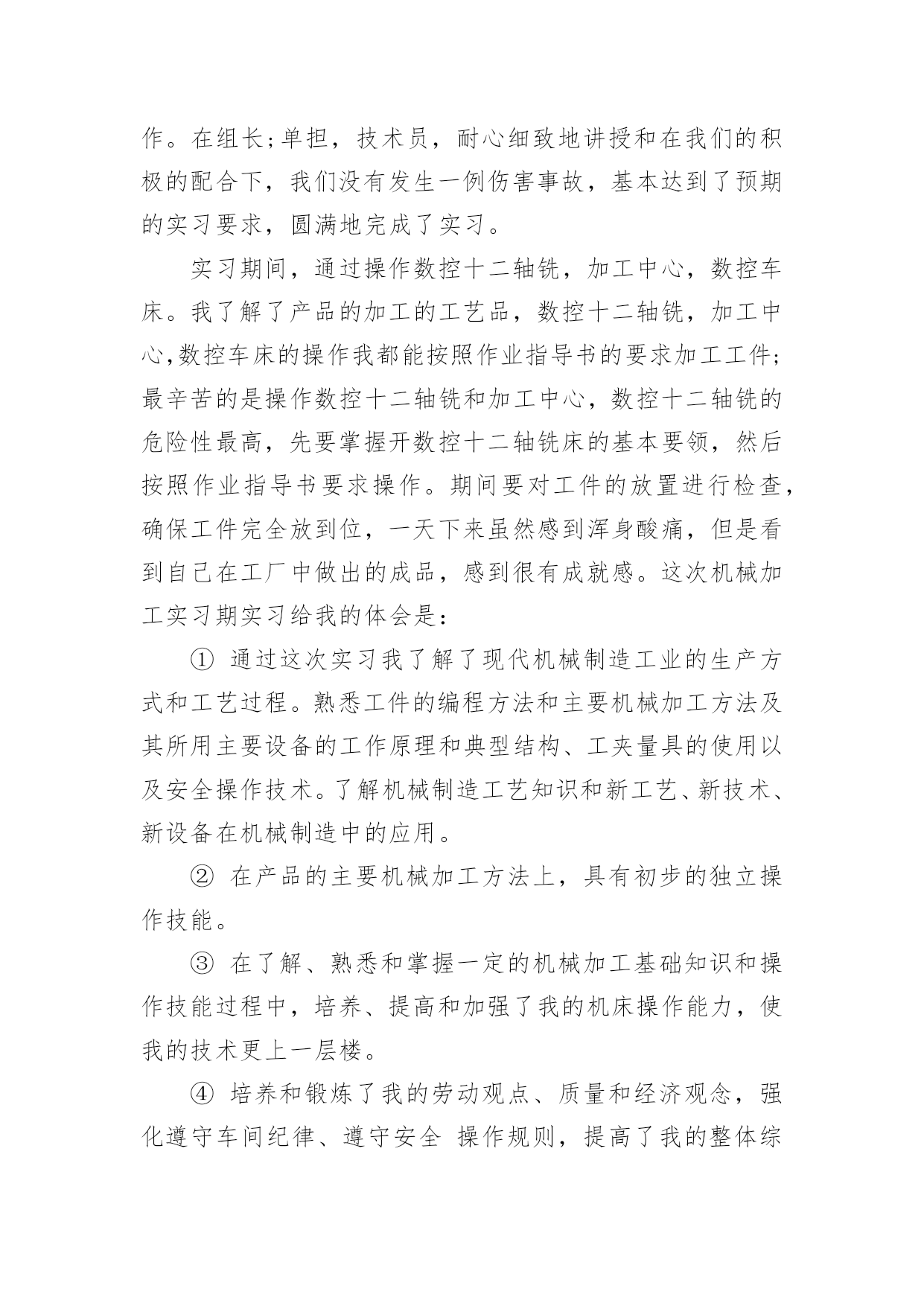 机械加工实习心得当我们受到启发,对学习和工作生活有了新的看法时,应该马上记录下来,写一篇心得体会,它可以帮助我们了解自己的这段时间的学习、工作生活状态。应该怎么写才合适呢?以下是小编整理的机械加工实习心得,欢迎大家借鉴与参考,希望对大家有所帮助。机械加工实习心得篇1要把一个没有任何专业技术基础、从来没有接触过生产的大学生,通过学校的几年学习,培养成一名合格的、熟练的技术工人,这需要一个理论和实践相结合的过程。专业基本功训练是学生学好专业技能的基础环节。要抓好基本功训练,则要从以下几个方面入手。1、注意安全安全文明生产是学生进入生产实习的第一课,要成为一名合格的技术工人,就必须树立牢固的安全文明生产意识。教学中对各种机床、砂轮机等的安全操作规程,实习中工作服的穿戴要求及文明生产规范等,要求学生不仅要认真听,还必须牢记。如:不应戴手套操作机床、女生必须戴工作帽、搞好车间卫生等。2、熟识机床。车床的基本操作包括工件的装夹,刀具的选用,通过换档改变车床主轴的转速,左右手在走刀、进给时的相互配合等。在学生基本操作训练初期,车床主轴转速不宜过高,刀具、工件都可以选一些比较安全的材料代替。其目的主要是使学生通过上级操作,训练两手在操作过程中的协调能力,要求能灵活的调整车削速度和控制进给量。3、欲善其事,先利其器。作为一名合格的车床操作工人,不仅要在生产中能加工出合格的产品,还必须熟练掌握车刀的刃磨方法,如:各种刀具的前角和后角、切削刃的磨削技巧等。并能根据刀具材料的不同选择不同[的磨削方法,明确刀具刃磨技术在机械加工生产中的作用,懂得一把好的刀具对提高生产率,保证产品质量的重要性。练好刀具刃磨技术,是学生将来能成为一名合格技术工人的.基本条件。时间:5月21日—6月1日(5月21—25日早上8:00—11:00、中午13:00—15:00;5月26日—6月1日中午15:00—18:00、晚上19:00—21:00)地点:校办实习工厂实习目的:1、简单了解车床、铣床的工作原理及其工作方式;2、学会正确的车床、铣床使用方法,并能正确使用车床或铣床来加工一工件。其它工具:什锦锉、锉刀、游标卡尺等准备知识:安全知识:1、上班穿工作服,女生戴工作帽,并将长挽入帽内。2、工作时必须精力集中,不准擅自离开机床。3、工件和车刀需装夹牢固,以免工件和车刀飞出伤人。4、工件旋转时,不准测量工件。5、工件安装好后,扳手必须随手取下,以免不注意开动车床,以免扳手飞出伤人。二、认识机器:车床的组成部分:主轴箱、挂轮箱、拖板箱、尾架、三杆(丝、光、操纵杆)、床身、附件。车床的型号:cw6140车床特性:万能变通车床组型别代号表示最大加工直径的1/10c(车床)、x(铣床)、z(钻床)、t(镗床)、m(磨床)、b(刨床)、l(拉床)、g(锯床)等。如:c616(主参数为160的卧式车床)。过程:一、5月21日:1、今天是我们实习的第一天。早上(8:00—11:30),薛、张老师给我们讲了一些安全事项,在教室给我们讲车床的结构(床头箱、主轴箱、挂轮箱、进给箱、拖板箱等)2、中午(13:00—15:00)到工厂里开始认识机器,了解机器。首先是老师在现场讲解,然后到我们动手,学开机器,熟练机器。3、5月22—25日:开始学磨刀(镗孔刀,切断刀等),由于是用砂轮磨(高速转动),所以我们要注安全,不能穿过松、袖子过长的衣服。因为过松、袖子过长易被砂轮弄进去的。同时我们也不应该在别人磨刀时打闹,应注意安全。机械加工实习心得相关文章:我静静的回想了一下过去的十几天所发生过的一切,显得很苍白,点点星星,零零碎碎。我也模糊了。我该怎么写,才不会显得造作,才不会显得虚伪。思绪在这一刻有点停滞。洛阳,一个一直都在我生活之外的城市,曾经离我是那么的遥远。可这次,我确确实实脚踏过那片土地。并刚从那里回来。对于洛阳,本来就没有多大的兴趣。可对于系里面的安排,我相信有其道理。虽然没有激情,但也积极配合。先不说这次有多大收获。从一些小事,一些生活细节中就能体现人在不同时期对事物的不同感知。洛阳之行给我最大感受是,不要老是埋怨环境的不好,我们应该调理好自己的想法。因为对于没法改变的事情,除了接受没有更好的方法。要学会改变自己,让自己适应环境才是生存之道。在洛阳,我学的到不仅仅是机械方面的知识,说真的,如果我现在说对专业知识方面受益匪浅,我会觉得自己很虚伪。为了写心得而写心得。那与我个人初衷相差太远了。上大学以来,我一直都不是个好学生……在不同场合,不同时间总带着愚昧跟虚伪的笑容。我早已经习惯放纵的生活。洛阳之行,大家都说是去实习,在我看来根本就是去旅行。每天每个人脸上总洋溢着笑容……丝毫感觉不到这是在实习。感觉不到是实习还有其它原因。在洛阳。很多简单想法都不约而同的浮现在我脑间。比如,我们该去哪里吃