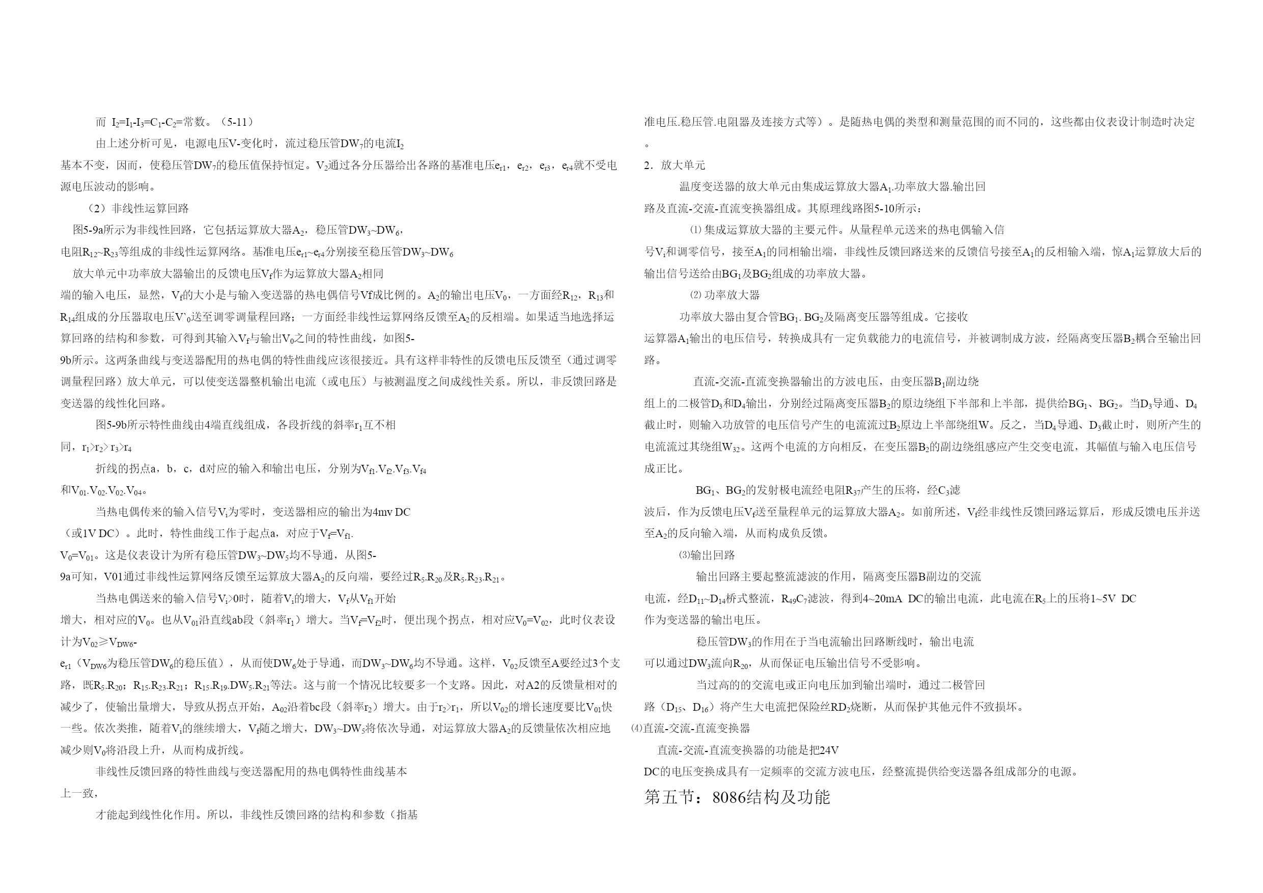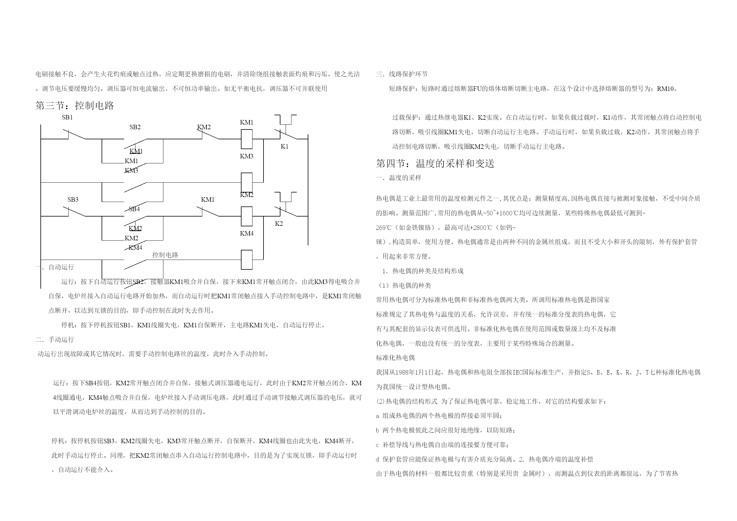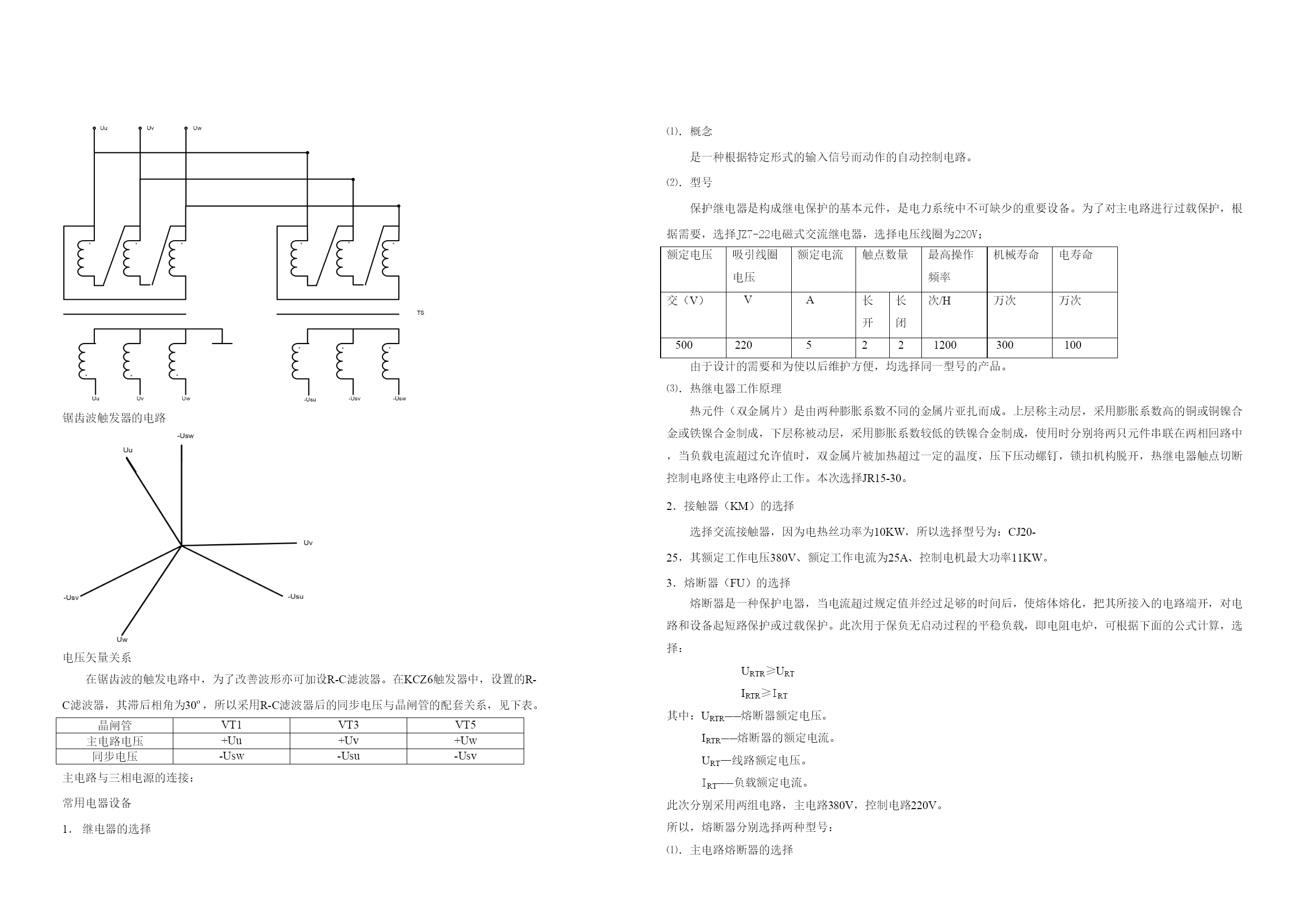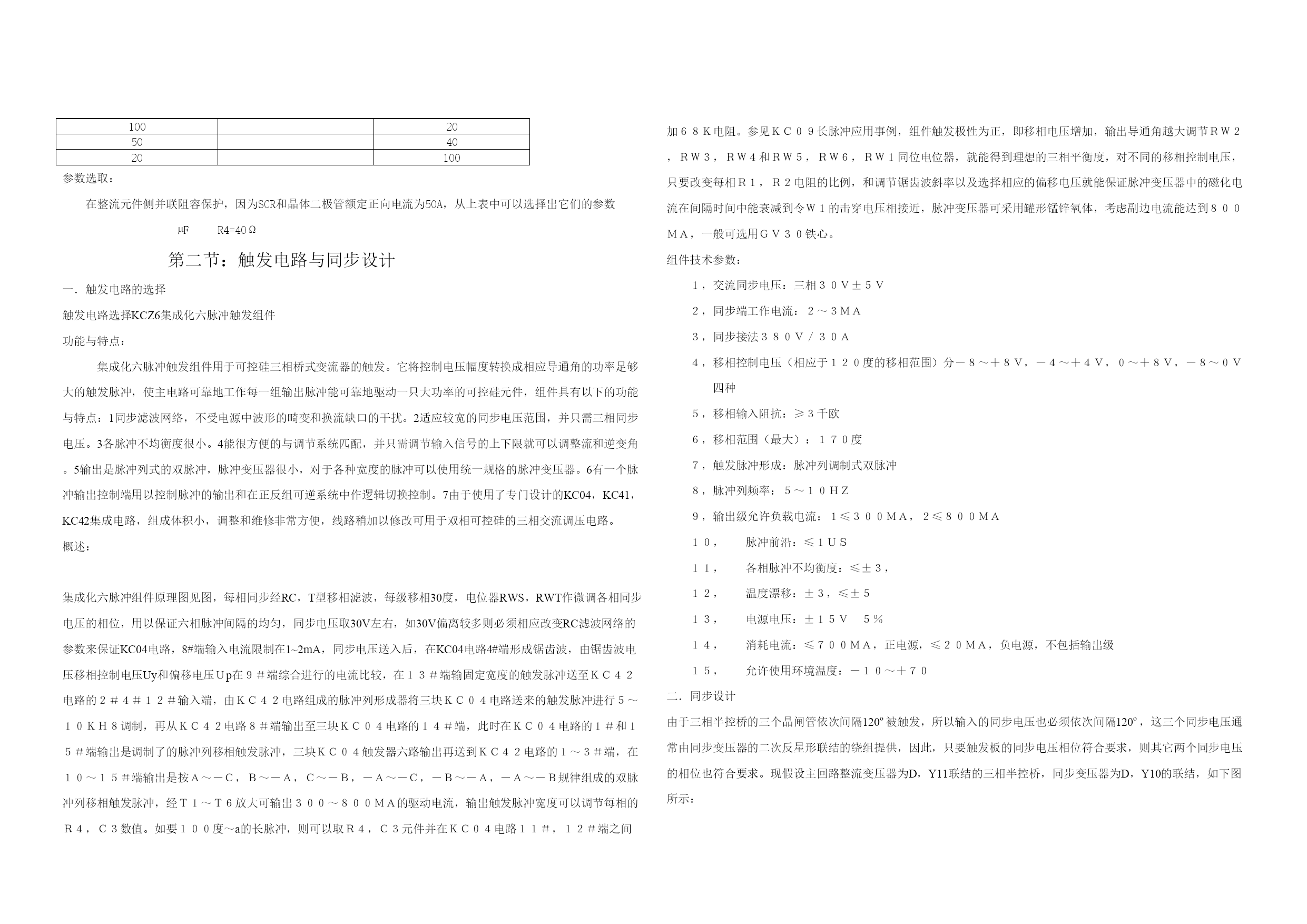 Ye=R―y+基本系统:给定值执行器D/A对象调节器检测装置变送器A/D设计概述:本设计用8086及8282等芯片组成的最小模式系统实现对电炉丝恒温的Fuzzy控制。用8259A及两个555定时器组成中断电路。8255产生报警信号并做出相关处理。使用DDZ-Ⅲ温度变送器和热电偶将被测温度转换为电压信号送入0809进行A/D转换,再送入8086进行模糊决策,最后输出数字信号,通过0832转换为模拟信号控制KCZ6的触发角,对三相半控桥的输出电压进行控制,达到控制炉温的目的。第一节:执行机构三相桥式半控整流电路:Vt1Vt3Vt5TnD2D4D6相桥式半控整流电路由三个可控硅三个二极管组成,所以称为半控,三个可控硅的阴极连接,广泛用于大容量负载,触发电压有三组,分别加在相应的可控硅上,三组触发电压应与主电路的三相电源同步,关于触发脉冲的相位,Vt1,Vt3,Vt5之间分别相差120°,每组触发电压移相范围为0°~180°。.Ud=1.17U2lcosa(U2l为变压器二次绕组的线电压有效值)二.SCR的选择:Ω,其铭牌为:Ni60Cr15Φ4.5(电热元件温度1000℃)Ni80Cr20Φ4.8(电热元件温度1100℃)Ni25Cr15Φ4.2(电热元件温度1200℃)可控硅承受的最高正反向电压=直流电压2E2××由此就可以选择3CT50型号的SCR.3CT50元件参数如下表:参数名称符号单位3CT50正向阻断峰值电压PFV伏20-1500反向阻断峰值电压PRV伏20-1500额定正向平均电流(导通角>170º)IF安50最大正向平均漏电流If毫安5最大反向平均漏电流IR毫安5最大正向平均压降VF伏最大维持电流IR毫安60控制极最大触发电压Vg伏控制极不触发电压Vgn伏控制极最大触发电流Ig毫安100控制极不触发电流Ign毫安1控制极最大允许反向电压Vgr伏5正向电压上升率Dv/dt伏/微秒20开通时间Ton微秒6关断时间Toff微秒25额定工作结温tj℃≤100结温升△T℃≤60铝散热器面积CM²厘米²900冷却方式风冷根据平均电流可以选择晶体二级管,其平均电流为45.5A,所以选择晶体二极管的型号为:3CZ56晶体二极管额定平均电流额定反向峰值电压正向平均压将反向平均漏电流整流结温升△T整流与散热器间热阻散热器最小散热面积冷却方式3CZ56IF=50A30-1000V100600CM²风冷四.元件的保护硅元件,特别是可控硅,虽然有很多优点,但是它们承受过电压、过电流的能力差,因此为了使元件能可靠的长期运行,必须采用一定的保护措施。造成过电压的主要原因是可控硅开关工作状态,电路中的感性元件(如整流变压器等)产生的反抗电流突变的电动势过大,如不加保护措施会造成整流元件击穿。常用的过电压保护有串联阻容保护,硒堆保护等,在本次设计中采用阻容保护。CR阻容保护整流元件额定正向电流(安)C4(微法)R4(欧)2001010020504020100参数选取:在整流元件侧并联阻容保护,因为SCR和晶体二极管额定正向电流为50A,从上表中可以选择出它们的参数µFR4=40Ω第二节:触发电路与同步设计触发电路的选择触发电路选择KCZ6集成化六脉冲触发组件功能与特点:集成化六脉冲触发组件用于可控硅三相桥式变流器的触发。它将控制电压幅度转换成相应导通角的功率足够大的触发脉冲,使主电路可靠地工作每一组输出脉冲能可靠地驱动一只大功率的可控硅元件,组件具有以下的功能与特点:1同步滤波网络,不受电源中波形的畸变和换流缺口的干扰。2适应较宽的同步电压范围,并只需三相同步电压。3各脉冲不均衡度很小。4能很方便的与调节系统匹配,并只需调节输入信号的上下限就可以调整流和逆变角。5输出是脉冲列式的双脉冲,脉冲变压器很小,对于各种宽度的脉冲可以使用统一规格的脉冲变压器。6有一个脉冲输出控制端用以控制脉冲的输出和在正反组可逆系统中作逻辑切换控制。7由于使用了专门设计的KC04,KC41,KC42集成电路,组成体积小,调整和维修非常方便,线路稍加以修改可用于双相可控硅的三相交流调压电路。概述:集成化六脉冲组件原理图见图,每相同步经RC,T型移相滤波,每级移相30度,电位器RWS,RWT作微调各相同步电压的相位,用以保证六相脉冲间隔的均匀,同步电压取30V左右,如30V偏离较多则必须相应改变RC滤波网络的参数来保证KC04电路,8#端输入电流限制在1~2mA,同步电压送入后,在KC04电路4#端形成锯齿波,由锯齿波电压移相控制电压Uy和偏移电压Up在9#端综合进行的电流比较,在13#端输固定宽度的触发脉冲送至KC42电路的2#4#12#输入端,由