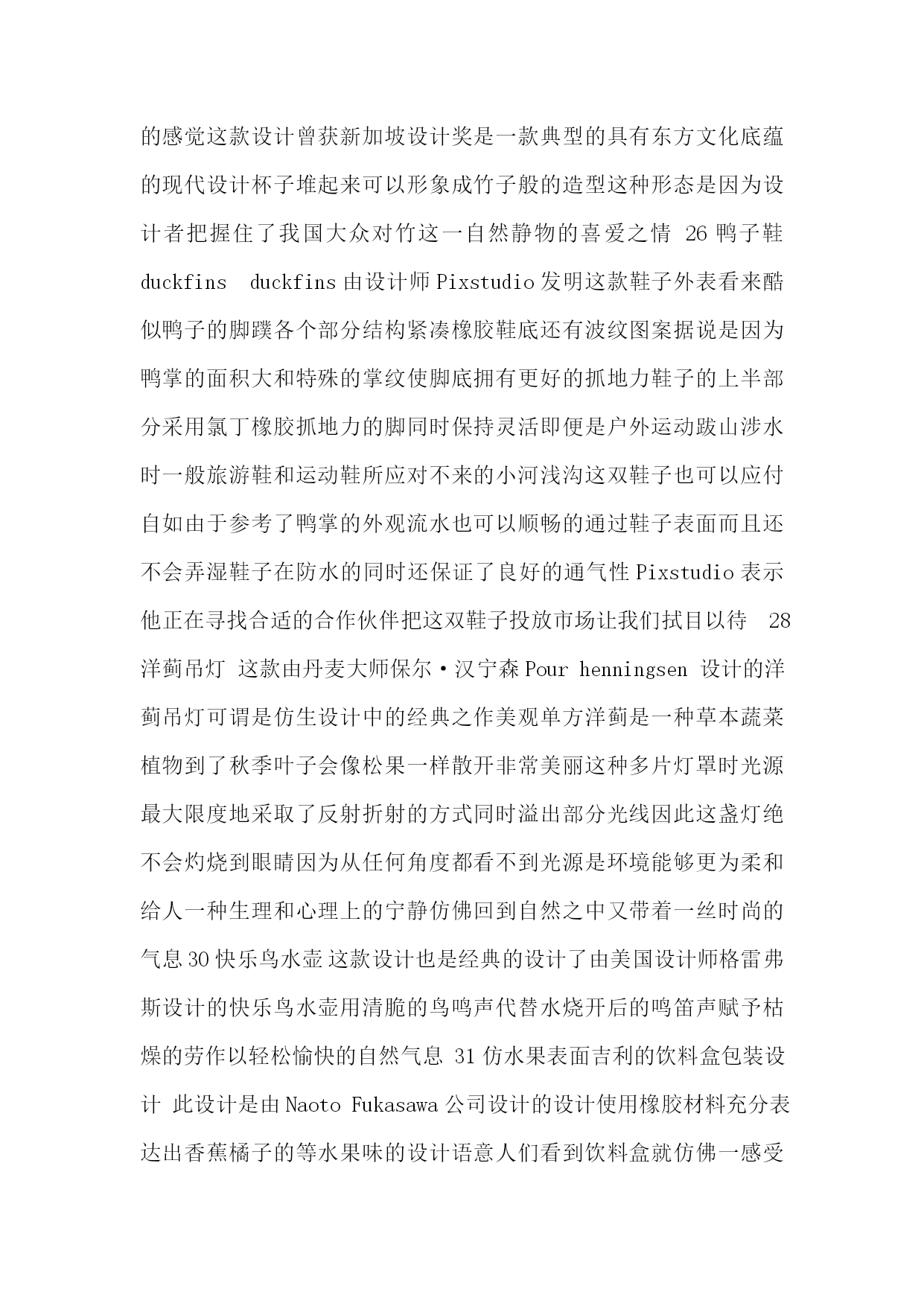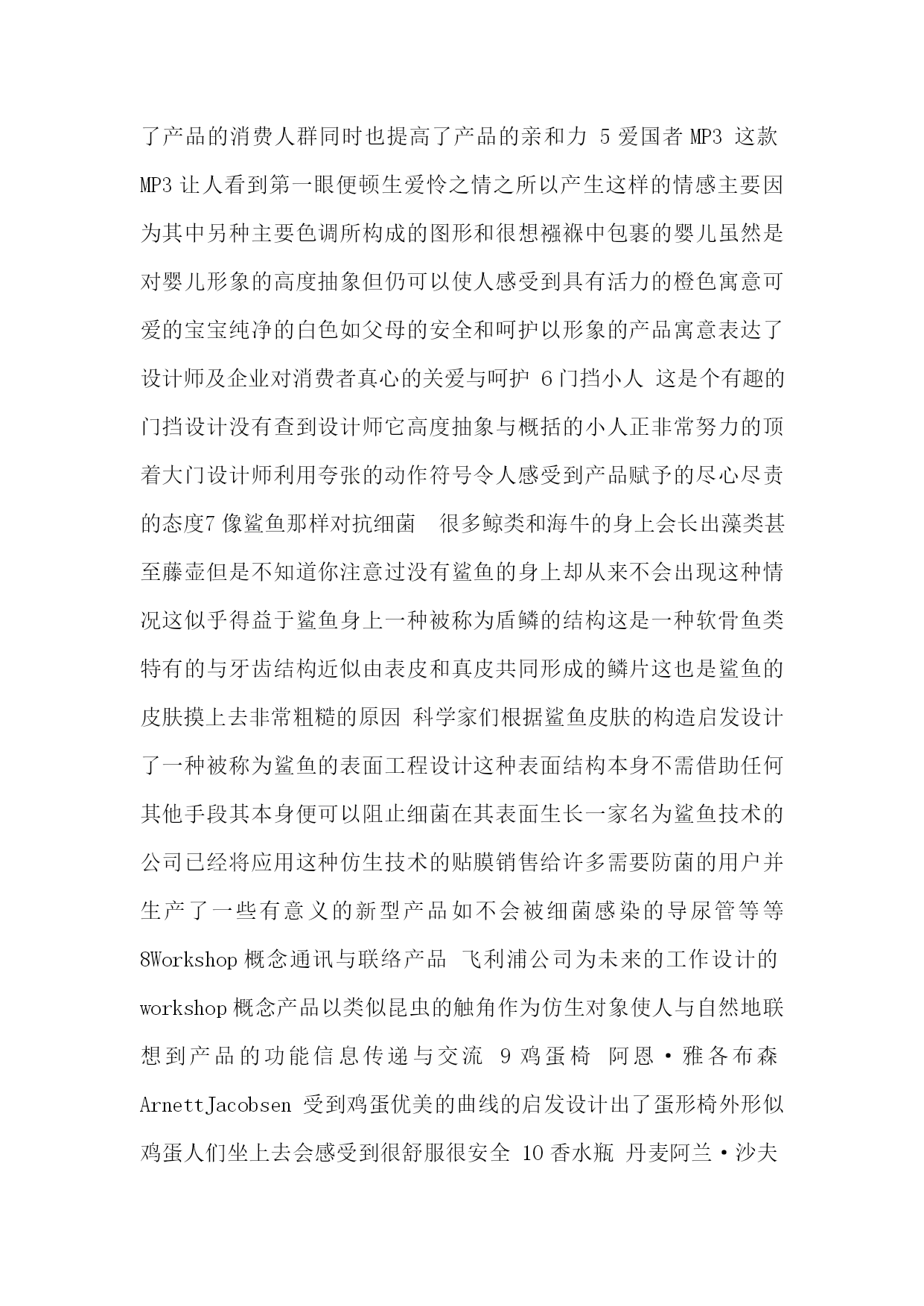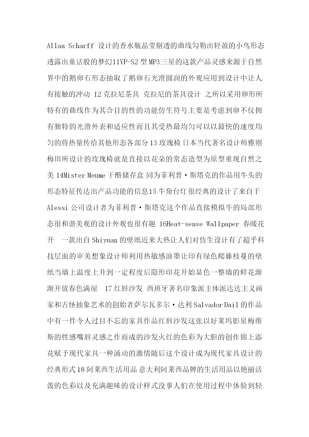 一仿生产品兰博基尼昆虫仿生概念车是罗马尼亚汽车设计师LulianBumbu完成他交通设计硕士课程的个人设想作品灵感来自大自然的昆虫世界通过学习各种不同类型昆虫的外骨骼或装甲设计出力求适用于这些类型的有机形式并将其转化为独特风格的兰博基尼品牌2甲壳虫引发的食品和能源站的新创意有很多人质疑撒哈拉森林计划的可行性它是一个系统的意愿美好的项目旨在将这块世界上最不适合居住的区域转变为一片繁茂而高产的绿洲藉此为全非洲人民制造足够的能源听起来不可置信但是这项项目已经通过了计划阶段并且已经在局部干旱地区执行落实而且已经取得了不小的成绩追本溯源这项伟大的项目中的一个核心组成成分是从诺米比亚的小小甲壳虫取暖并获得食物的生活方式中得来的灵感白天这种甲壳虫的黑色外壳就会吸收并发射出热量晚上它的体温会急剧下降变得比周边物体更加低一些这种温度的差异会使得水汽凝结在甲壳虫的硬壳上形成小水滴每天早上这种甲壳虫都会饮用此露水3安娜吉尔启瓶器意大利著名后现代主意设计师压力山大德罗·门蒂尼Alessandromendini的作品的设计用人体的头身体臂膀之间的关节对应产品的结构利用转轴等活动机构来实现产品外形结构的变化从而实现产品的使用功能这种结构即可以适合不同的功能要求同时又令产品与仿生对象的姿态更加神似充满趣味4PhilishanveReflexAction剃须刀飞利浦公司在1996年剃须刀设计其产品形态以男性下颚的结构特征为设计原点同时表面材质也模仿了肌肤的质感产品不仅以其特有的形态暗示了产品的消费人群同时也提高了产品的亲和力5爱国者MP3这款MP3让人看到第一眼便顿生爱怜之情之所以产生这样的情感主要因为其中另种主要色调所构成的图形和很想襁褓中包裹的婴儿虽然是对婴儿形象的高度抽象但仍可以使人感受到具有活力的橙色寓意可爱的宝宝纯净的白色如父母的安全和呵护以形象的产品寓意表达了设计师及企业对消费者真心的关爱与呵护6门挡小人这是个有趣的门挡设计没有查到设计师它高度抽象与概括的小人正非常努力的顶着大门设计师利用夸张的动作符号令人感受到产品赋予的尽心尽责的态度7像鲨鱼那样对抗细菌很多鲸类和海牛的身上会长出藻类甚至藤壶但是不知道你注意过没有鲨鱼的身上却从来不会出现这种情况这似乎得益于鲨鱼身上一种被称为盾鳞的结构这是一种软骨鱼类特有的与牙齿结构近似由表皮和真皮共同形成的鳞片这也是鲨鱼的皮肤摸上去非常粗糙的原因科学家们根据鲨鱼皮肤的构造启发设计了一种被称为鲨鱼的表面工程设计这种表面结构本身不需借助任何其他手段其本身便可以阻止细菌在其表面生长一家名为鲨鱼技术的公司已经将应用这种仿生技术的贴膜销售给许多需要防菌的用户并生产了一些有意义的新型产品如不会被细菌感染的导尿管等等8Workshop概念通讯与联络产品飞利浦公司为未来的工作设计的workshop概念产品以类似昆虫的触角作为仿生对象使人与自然地联想到产品的功能信息传递与交流9鸡蛋椅阿恩·雅各布森ArnettJacobsen受到鸡蛋优美的曲线的启发设计出了蛋形椅外形似鸡蛋人们坐上去会感受到很舒服很安全10香水瓶丹麦阿兰·沙夫AllanScharff设计的香水瓶晶莹剔透的曲线勾勒出轻盈的小鸟形态透露出童话般的梦幻11YP-S2型MP3三星的这款产品灵感来源于自然界中的鹅卵石形态抽取了鹅卵石光滑圆润的外观应用到设计中让人有接触的冲动12克拉尼茶具克拉尼的茶具设计之所以采用卵形所特有的曲线作为其合目的性的功能仿生符号主要是考虑到卵不仅拥有独特的光滑外表和适应性而且其受热最均匀可以以最快的速度均匀的将热量传给其他形态各部分13玫瑰椅日本当代著名设计师雅则梅田所设计的玫瑰椅就是直接以花朵的常态造型为原型重现自然之美14MisterMeume干酪储存盒同为菲利普·斯塔克的作品用牛头的形态特征传达出产品功能的信息15牛角台灯很经典的设计了来自于Alessi公司设计者为菲利普·斯塔克这个作品直接模拟牛的局部形态很和谐美观的设计外观也很有趣16Heat-senseWallpaper春暖花开一款出自Shiyuan的壁纸近来大热让人们对仿生设计有了超乎科技层面的审美想象设计师利用热敏感油墨让印有绿色爬藤枝蔓的壁纸当墙上温度上升到一定程度后隐形印花开始显色一整墙的鲜花渐渐开放春色满屋17红唇沙发西班牙著名印象派主体派达达主义画家和古怪抽象艺术的创始者萨尔瓦多尔·达利SalvadorDail的作品中有一件令人过目不忘的家具作品红唇沙发这张以好莱坞影星梅维斯的性感嘴唇灵感之作而成的沙发火红的色彩为大胆的创作锦上添花赋予现代家具一种涌动的激情随后这个设计成为现代家具设计的经典形式18阿莱西生活用品意大利阿莱西品牌的生活用品以艳丽活泼的色彩以及充满趣味的设计样式没事人们在使用过程中体验到轻松愉悦的生活情趣满足了人们的情感要求这种产品自然历史悠久更具长久的生命力