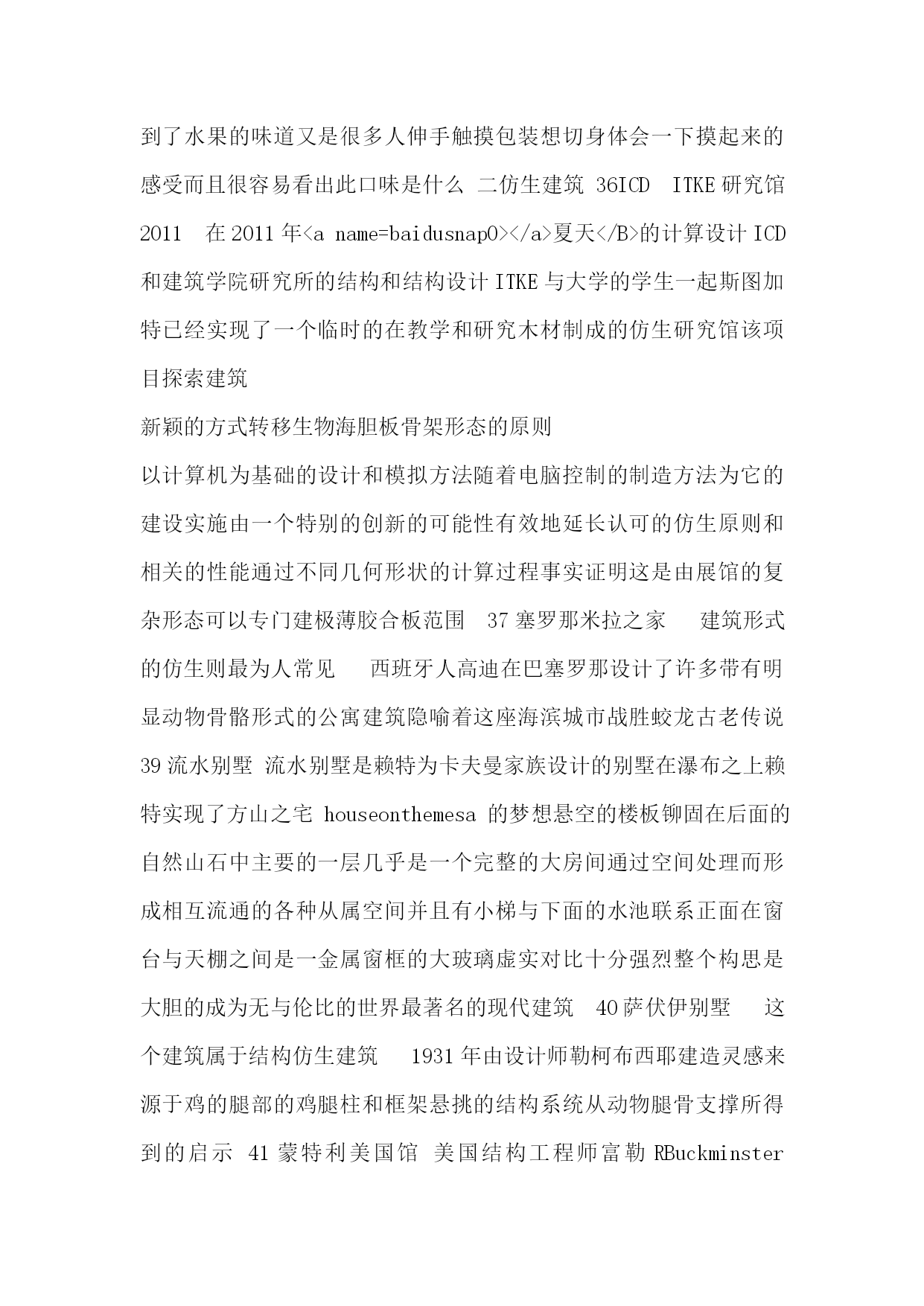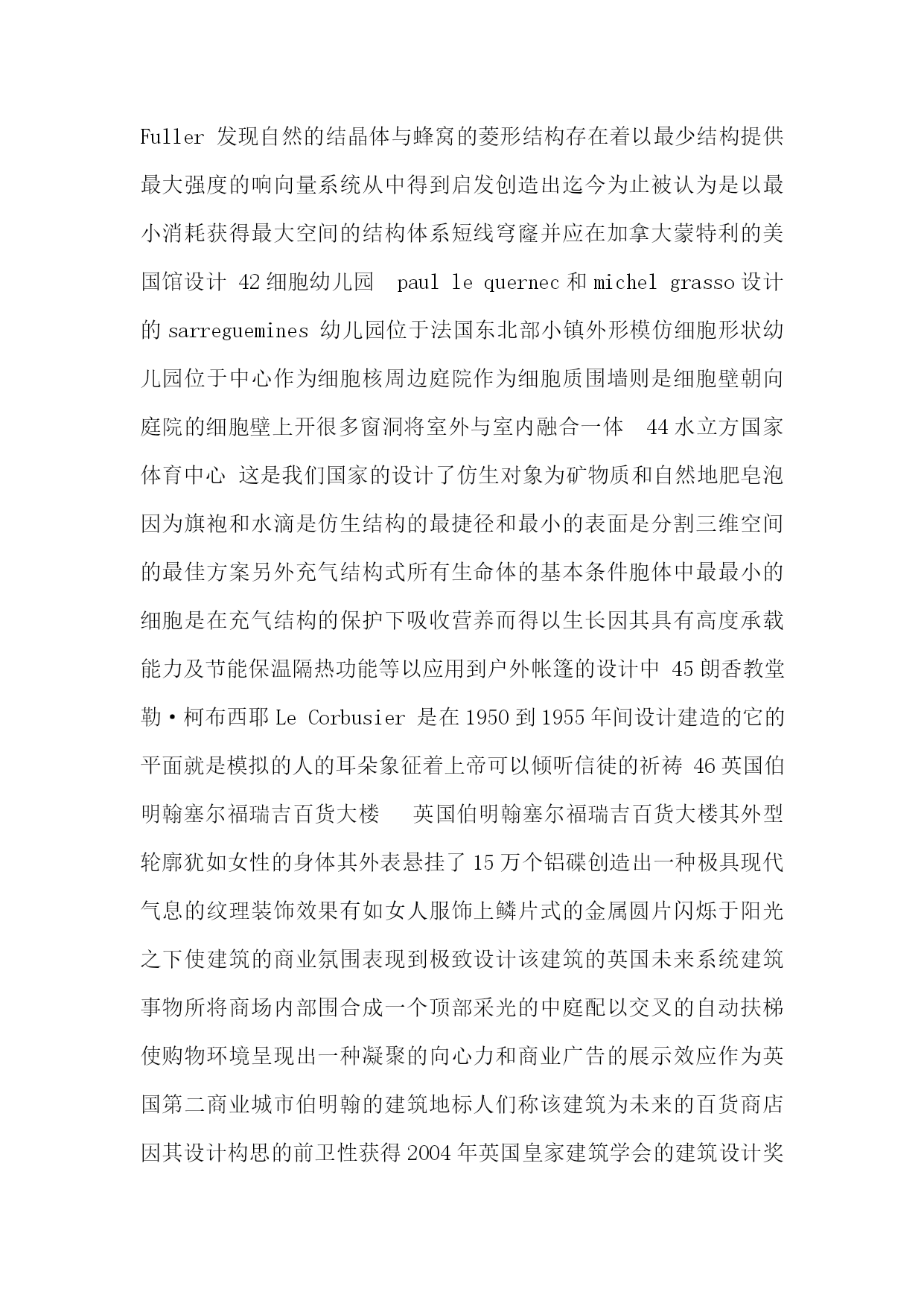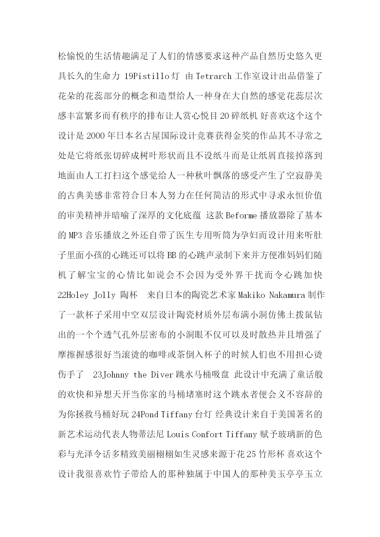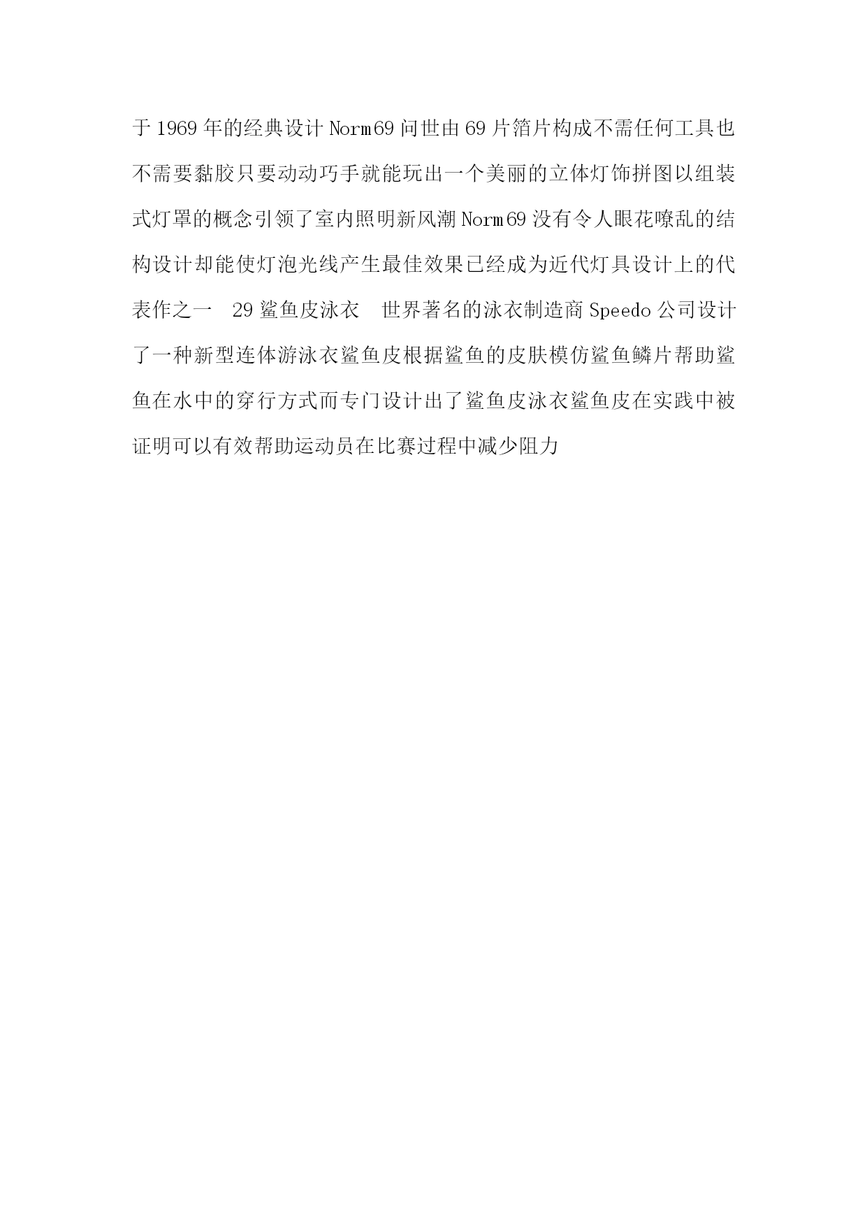 一仿生产品兰博基尼昆虫仿生概念车是罗马尼亚汽车设计师LulianBumbu完成他交通设计硕士课程的个人设想作品灵感来自大自然的昆虫世界通过学习各种不同类型昆虫的外骨骼或装甲设计出力求适用于这些类型的有机形式并将其转化为独特风格的兰博基尼品牌2甲壳虫引发的食品和能源站的新创意有很多人质疑撒哈拉森林计划的可行性它是一个系统的意愿美好的项目旨在将这块世界上最不适合居住的区域转变为一片繁茂而高产的绿洲藉此为全非洲人民制造足够的能源听起来不可置信但是这项项目已经通过了计划阶段并且已经在局部干旱地区执行落实而且已经取得了不小的成绩追本溯源这项伟大的项目中的一个核心组成成分是从诺米比亚的小小甲壳虫取暖并获得食物的生活方式中得来的灵感白天这种甲壳虫的黑色外壳就会吸收并发射出热量晚上它的体温会急剧下降变得比周边物体更加低一些这种温度的差异会使得水汽凝结在甲壳虫的硬壳上形成小水滴每天早上这种甲壳虫都会饮用此露水3安娜吉尔启瓶器意大利著名后现代主意设计师压力山大德罗·门蒂尼Alessandromendini的作品的设计用人体的头身体臂膀之间的关节对应产品的结构利用转轴等活动机构来实现产品外形结构的变化从而实现产品的使用功能这种结构即可以适合不同的功能要求同时又令产品与仿生对象的姿态更加神似充满趣味4PhilishanveReflexAction剃须刀飞利浦公司在1996年剃须刀设计其产品形态以男性下颚的结构特征为设计原点同时表面材质也模仿了肌肤的质感产品不仅以其特有的形态暗示了产品的消费人群同时也提高了产品的亲和力5爱国者MP3这款MP3让人看到第一眼便顿生爱怜之情之所以产生这样的情感主要因为其中另种主要色调所构成的图形和很想襁褓中包裹的婴儿虽然是对婴儿形象的高度抽象但仍可以使人感受到具有活力的橙色寓意可爱的宝宝纯净的白色如父母的安全和呵护以形象的产品寓意表达了设计师及企业对消费者真心的关爱与呵护6门挡小人这是个有趣的门挡设计没有查到设计师它高度抽象与概括的小人正非常努力的顶着大门设计师利用夸张的动作符号令人感受到产品赋予的尽心尽责的态度7像鲨鱼那样对抗细菌很多鲸类和海牛的身上会长出藻类甚至藤壶但是不知道你注意过没有鲨鱼的身上却从来不会出现这种情况这似乎得益于鲨鱼身上一种被称为盾鳞的结构这是一种软骨鱼类特有的与牙齿结构近似由表皮和真皮共同形成的鳞片这也是鲨鱼的皮肤摸上去非常粗糙的原因科学家们根据鲨鱼皮肤的构造启发设计了一种被称为鲨鱼的表面工程设计这种表面结构本身不需借助任何其他手段其本身便可以阻止细菌在其表面生长一家名为鲨鱼技术的公司已经将应用这种仿生技术的贴膜销售给许多需要防菌的用户并生产了一些有意义的新型产品如不会被细菌感染的导尿管等等8Workshop概念通讯与联络产品飞利浦公司为未来的工作设计的workshop概念产品以类似昆虫的触角作为仿生对象使人与自然地联想到产品的功能信息传递与交流9鸡蛋椅阿恩·雅各布森ArnettJacobsen受到鸡蛋优美的曲线的启发设计出了蛋形椅外形似鸡蛋人们坐上去会感受到很舒服很安全10香水瓶丹麦阿兰·沙夫AllanScharff设计的香水瓶晶莹剔透的曲线勾勒出轻盈的小鸟形态透露出童话般的梦幻11YP-S2型MP3三星的这款产品灵感来源于自然界中的鹅卵石形态抽取了鹅卵石光滑圆润的外观应用到设计中让人有接触的冲动12克拉尼茶具克拉尼的茶具设计之所以采用卵形所特有的曲线作为其合目的性的功能仿生符号主要是考虑到卵不仅拥有独特的光滑外表和适应性而且其受热最均匀可以以最快的速度均匀的将热量传给其他形态各部分13玫瑰椅日本当代著名设计师雅则梅田所设计的玫瑰椅就是直接以花朵的常态造型为原型重现自然之美14MisterMeume干酪储存盒同为菲利普·斯塔克的作品用牛头的形态特征传达出产品功能的信息15牛角台灯很经典的设计了来自于Alessi公司设计者为菲利普·斯塔克这个作品直接模拟牛的局部形态很和谐美观的设计外观也很有趣16Heat-senseWallpaper春暖花开一款出自Shiyuan的壁纸近来大热让人们对仿生设计有了超乎科技层面的审美想象设计师利用热敏感油墨让印有绿色爬藤枝蔓的壁纸当墙上温度上升到一定程度后隐形印花开始显色一整墙的鲜花渐渐开放春色满屋17红唇沙发西班牙著名印象派主体派达达主义画家和古怪抽象艺术的创始者萨尔瓦多尔·达利SalvadorDail的作品中有一件令人过目不忘的家具作品红唇沙发这张以好莱坞影星梅维斯的性感嘴唇灵感之作而成的沙发火红的色彩为大胆的创作锦上添花赋予现代家具一种涌动的激情随后这个设计成为现代家具设计的经典形式18阿莱西生活用品意大利阿莱西品牌的生活用品以艳丽活泼的色彩以及充满趣味的设计样式没事人们在使用过程中体验到轻松愉悦的生活情趣满足了人们的情感要求这种产品自然历史悠久更具长久的生命力