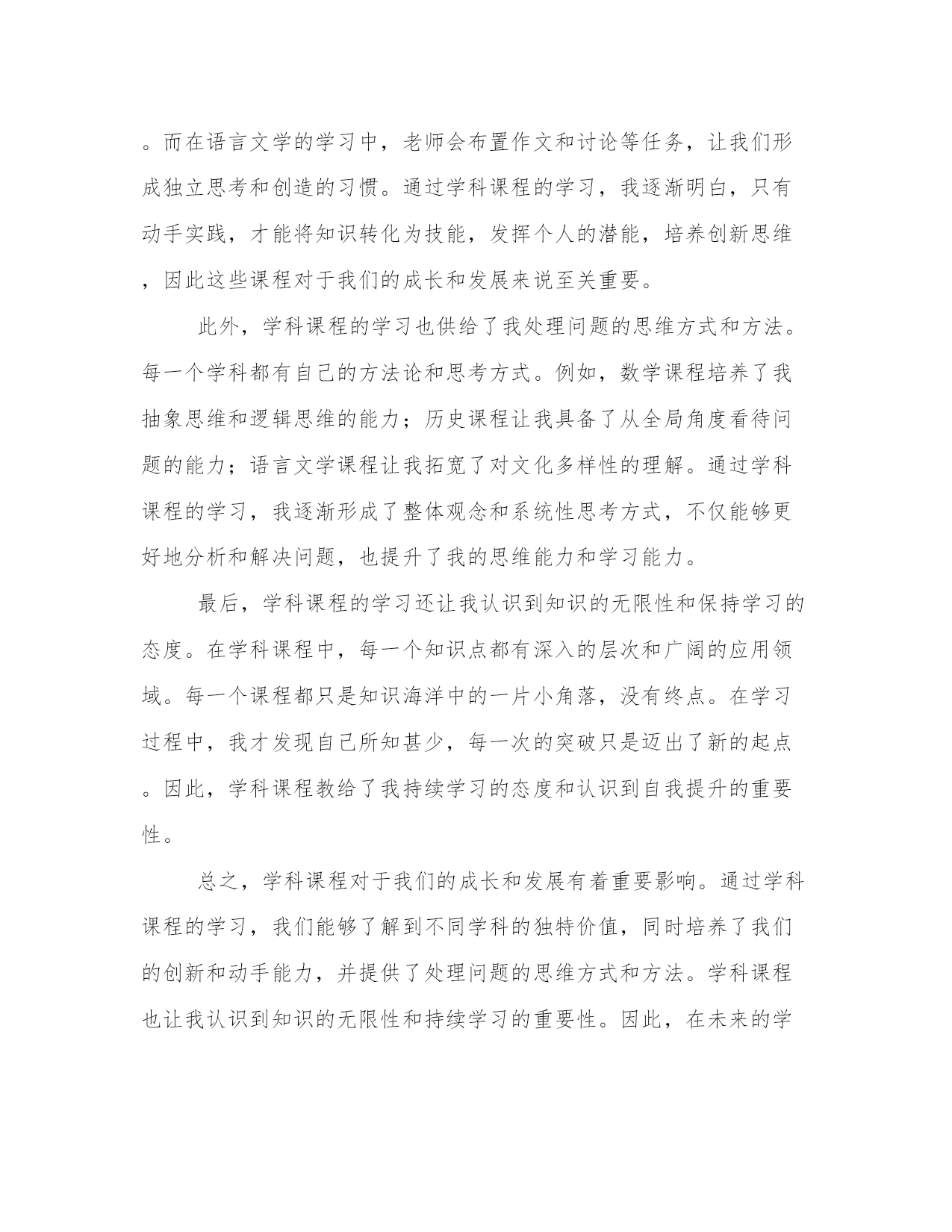 学科课程心得体会(模板8篇)我们在一些事情上受到启发后,应该马上记录下来,写一篇心得体会,这样我们可以养成良好的总结方法。优质的心得体会该怎么样去写呢?以下是小编帮大家整理的心得体会范文,欢迎大家借鉴与参考,希望对大家有所帮助。学科课程心得体会篇一随着社会的不断发展和进步,学科课程在教育体系中扮演着至关重要的角色。各个学科的课程给我们提供了广阔的知识辐射面,也使我们对这个世界的了解更加全面。在我多年的学习中,我逐渐领悟到学科课程的重要性,并从中获得了许多心得体会。首先,学科课程让我了解到不同学科的独特价值。在学校的日常学习中,我接触到了数学、物理、化学、语言文学、历史等各个学科的知识。他们不仅提供了专业的知识体系,也涉及到了不同领域之间的联系。比如,在学习数学的过程中,我掌握了解决问题和分析问题的基本能力;而在学习语言文学方面,我培养了良好的语言表达能力和文学鉴赏能力。这些学科的课程不仅使我富有了各方面的知识,也使我成为一个全面发展的人。其次,在学科课程的学习中,我认识到学科课程对培养学生的创新和动手能力的重要性。比如,在物理学科的学习中,老师会引导我们通过实验等方式来观察和探索现象,从而培养我们的实际动手能力。而在语言文学的学习中,老师会布置作文和讨论等任务,让我们形成独立思考和创造的习惯。通过学科课程的学习,我逐渐明白,只有动手实践,才能将知识转化为技能,发挥个人的潜能,培养创新思维,因此这些课程对于我们的成长和发展来说至关重要。此外,学科课程的学习也供给了我处理问题的思维方式和方法。每一个学科都有自己的方法论和思考方式。例如,数学课程培养了我抽象思维和逻辑思维的能力;历史课程让我具备了从全局角度看待问题的能力;语言文学课程让我拓宽了对文化多样性的理解。通过学科课程的学习,我逐渐形成了整体观念和系统性思考方式,不仅能够更好地分析和解决问题,也提升了我的思维能力和学习能力。最后,学科课程的学习还让我认识到知识的无限性和保持学习的态度。在学科课程中,每一个知识点都有深入的层次和广阔的应用领域。每一个课程都只是知识海洋中的一片小角落,没有终点。在学习过程中,我才发现自己所知甚少,每一次的突破只是迈出了新的起点。因此,学科课程教给了我持续学习的态度和认识到自我提升的重要性。总之,学科课程对于我们的成长和发展有着重要影响。通过学科课程的学习,我们能够了解到不同学科的独特价值,同时培养了我们的创新和动手能力,并提供了处理问题的思维方式和方法。学科课程也让我认识到知识的无限性和持续学习的重要性。因此,在未来的学习和生活中,我将继续珍惜学科课程所带给我的丰富知识和宝贵经验,努力学习,不断提升自我。学科课程心得体会篇二2月11日和12日,在工作室柳青霞老师的组织下,我有幸观看了20xx年全国教科版小学科学新教材远程培训的直播课程。专家们精彩的论述,深刻的见解,让我受益匪浅。更让我明白,一节好的科学课,新在理念、巧在设计、赢在实践、成在后续。上一节好的科学课,教师要做到两个关注。一是关注学生,要从学生的`实际出发,关注学生的情感需求和认知需求,关注学生已有的知识基础和生活经验,这是一节成功课堂的必要基础。二是关注科学的本质,注重科学思维方法的渗透,让学生在观察、操作、推理、验证的过程中经历科学化的学习过程,使学生真正体验到科学的乐趣,并能乐学、爱学科学。宝剑锋从磨砺出,梅花香自苦寒来。今后,我将更加严格要求自己,潜心钻研教材,积极参与研讨,争取成为一名优秀的小学科学教师。学科课程心得体会篇三学科导论课程是大学教育的重要组成部分,意在帮助新生对所学学科有一个全面、系统的了解,为其后续学习打下基础。在这门课程中我学到了许多知识,同时也获得了一些重要的心得和体会。在这篇文章中,我将分享我对学科导论课程的理解和感悟,希望对其他学生有所启迪。首先,学科导论课程帮助我了解了各个学科的基本知识和基本概念。在课程中,我们学习了多个不同学科的特点及其与其他学科的关系。通过老师的讲解,我对各个学科的定义和范围有了更清晰的认识。这为我后续的学习提供了一个扎实的基础,使我能够更加深入地了解各个学科的重要概念和理论,确保我不会迷失在知识的海洋中。其次,学科导论课程还帮助我了解了各个学科的分析方法和实践应用。在课堂上,老师通过案例分析和实验展示,向我们介绍了各个学科的独特分析方法和实践技巧。这些方法和技巧不仅拓宽了我的眼界,也为我未来的学习和分析提供了有用的工具。通过了解不同学科的分析方法,我能够更好地理解和分析各个学科的学术论文和分析成果,提高我对学科知识的深度和广度的理解。此外,学科导论课程还培养了我对学术规范和学术道德的重视。在课堂上,老师强调了学术诚信的重要性,并介绍了学术论文的撰写规范和学术发布的标准。这让我认识到,一名优秀的
