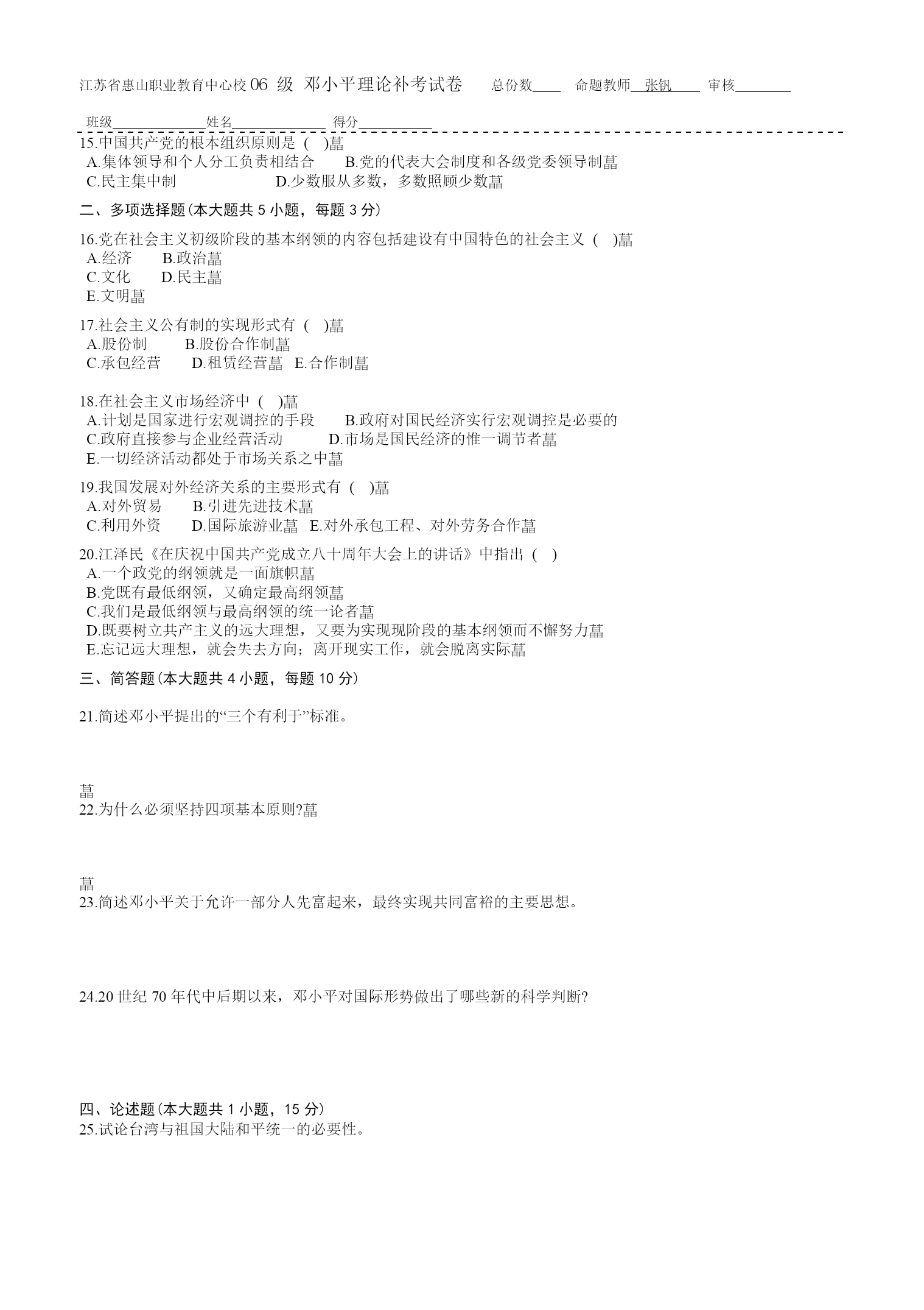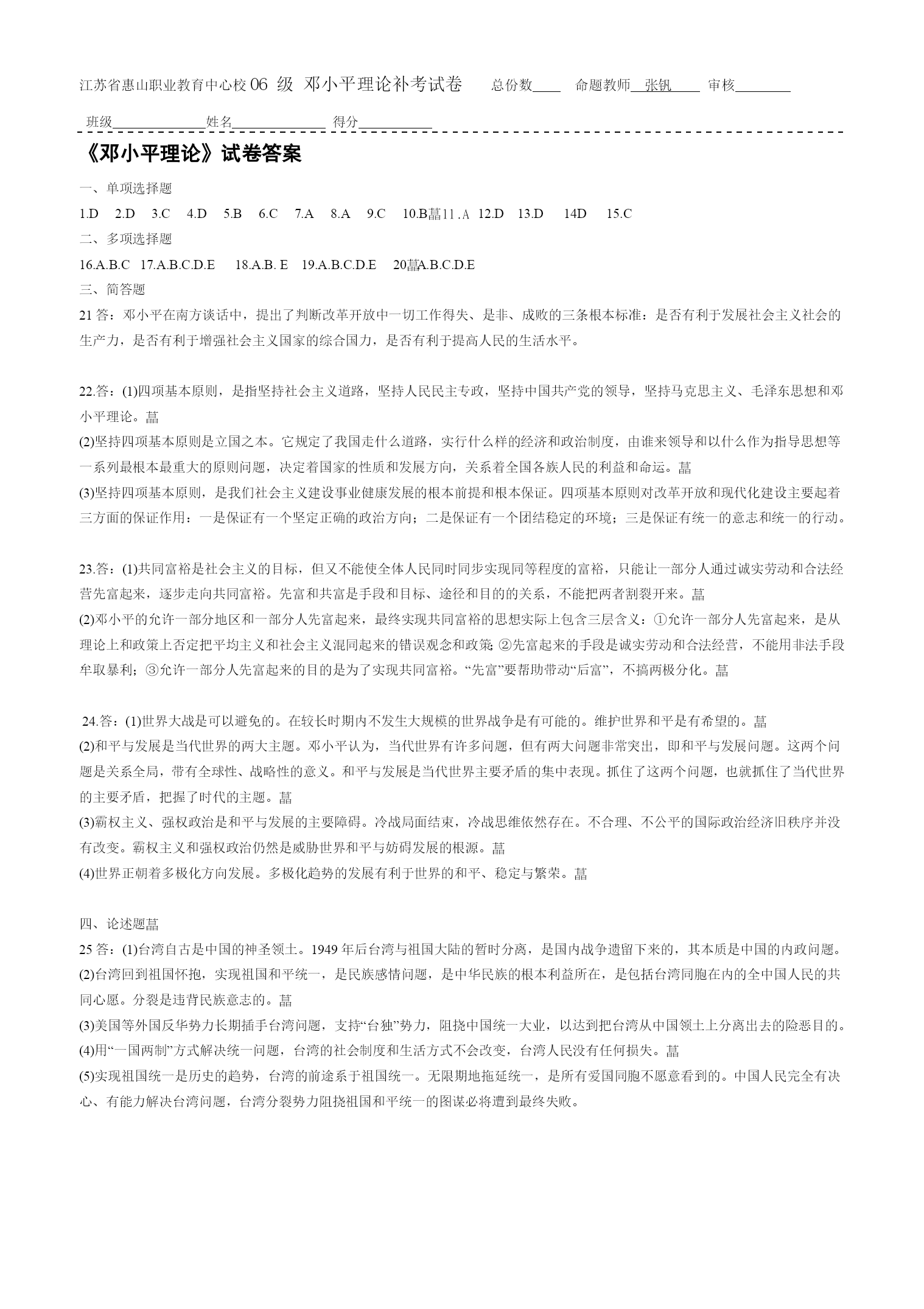 江苏省惠山职业教育中心校06级邓小平理论补考试卷总份数命题教师张钒审核班级姓名得分课程《邓小平理论》一、单项选择题:(本大题共15小题,每题2分)1.马克思主义同中国实际相结合第二次历史性飞跃的理论成果是()A.社会主义市场经济理论B.社会主义本质理论C.社会主义初级阶段理论D.邓小平理论2.建设有中国特色社会主义首要的基本理论问题是()A.正确处理改革、发展同稳定的关系B.坚持以经济建设为中心C.解放思想、实事求是D.什么是社会主义,怎样建设社会主义3.检验真理的惟一标准是()A.马克思主义B.“三个有利于”C.实践D.生产力4.邓小平指出:“贫穷不是社会主义,社会主义要消灭贫穷。”这个论断()A.概括了社会主义建设的目标B.指出了社会主义的根本任务C.明确了社会主义的发展方向D.体现了社会主义本质的要求5.邓小平在南方谈话中说,抓住时机,发展自己,关键是发展()A.教育B.经济C.科技D.民主6.党在社会主义初级阶段的基本路线的“两个基本点”是()A.发展社会主义民主,加强社会主义法制B.一手抓物质文明,一手抓精神文明C.坚持四项基本原则,坚持改革开放D.自力更生,艰苦创业7.“三步走”发展战略指出,第一步人民生活()A.解决温饱问题B.彻底摆脱贫困C.实现小康D.比较富裕8.关于科学技术的极端重要性,邓小平有一著名论断,这就是()A.科学技术是第一生产力B.科技工作要面向经济建设C.中国在高科技领域要占有一席之地D.中国的农业最终要靠科技解决问题9.在社会主义国民经济中起主导作用的是()A.公有制经济B.股份制经济C.国有经济D.集体经济10.建立社会主义市场经济体制主要是要使市场()A.调节整个社会的生产和流通B.在国家宏观调控下对资源配置起基础性作用C.在流通领域发挥作用D.自发地调节社会总量平衡11.社会主义社会实现按劳分配原则的前提条件是()A.社会主义公有制B.无产阶级掌握政权C.生产力有一定的发展D.劳动存在着重大差别12.我国实行中国共产党领导的多党合作和政治协商制度,民主党派是()A.执政党B.反对党C.在野党D.参政党13.党的十五大提出建设有中国特色社会主义文化的基本目标是()A.继承发扬民族优秀文化和革命文化传统,繁荣文学和艺术B.积极吸收世界文化优秀成果,使中国文艺走出国门,走向世界C.洋为中用,古为今用D.以马克思主义为指导,以培养“四有”公民为目标,发展“三个面向”,民族、科学、大众的社会主义文化14.我国独立自主的和平外交政策,应坚持把()A.和平友好关系放在首位B.扩大我国的势力和影响放在首位C.避免战争放在首位D.国家主权和国家利益放在首位15.中国共产党的根本组织原则是()A.集体领导和个人分工负责相结合B.党的代表大会制度和各级党委领导制C.民主集中制D.少数服从多数,多数照顾少数二、多项选择题(本大题共5小题,每题3分)16.党在社会主义初级阶段的基本纲领的内容包括建设有中国特色的社会主义()A.经济B.政治C.文化D.民主E.文明17.社会主义公有制的实现形式有()A.股份制B.股份合作制C.承包经营D.租赁经营E.合作制18.在社会主义市场经济中()A.计划是国家进行宏观调控的手段B.政府对国民经济实行宏观调控是必要的C.政府直接参与企业经营活动D.市场是国民经济的惟一调节者E.一切经济活动都处于市场关系之中19.我国发展对外经济关系的主要形式有()A.对外贸易B.引进先进技术C.利用外资D.国际旅游业E.对外承包工程、对外劳务合作20.江泽民《在庆祝中国共产党成立八十周年大会上的讲话》中指出()A.一个政党的纲领就是一面旗帜B.党既有最低纲领,又确定最高纲领C.我们是最低纲领与最高纲领的统一论者D.既要树立共产主义的远大理想,又要为实现现阶段的基本纲领而不懈努力E.忘记远大理想,就会失去方向;离开现实工作,就会脱离实际三、简答题(本大题共4小题,每题10分)21.简述邓小平提出的“三个有利于”标准。22.为什么必须坚持四项基本原则?23.简述邓小平关于允许一部分人先富起来,最终实现共同富裕的主要思想。24.20世纪70年代中后期以来,邓小平对国际形势做出了哪些新的科学判断?四、论述题(本大题共1小题,15分)25.试论台湾与祖国大陆和平统一的必要性。《邓小平理论》试卷答案一、单项选择题1.D2.D3.C4.D5.B6.C7.A8.A9.C10.B11.A12.D13.D14D15.C二、多项选择题16.A.B.C17.A.B.C.D.E18.A.B.E19.A.B