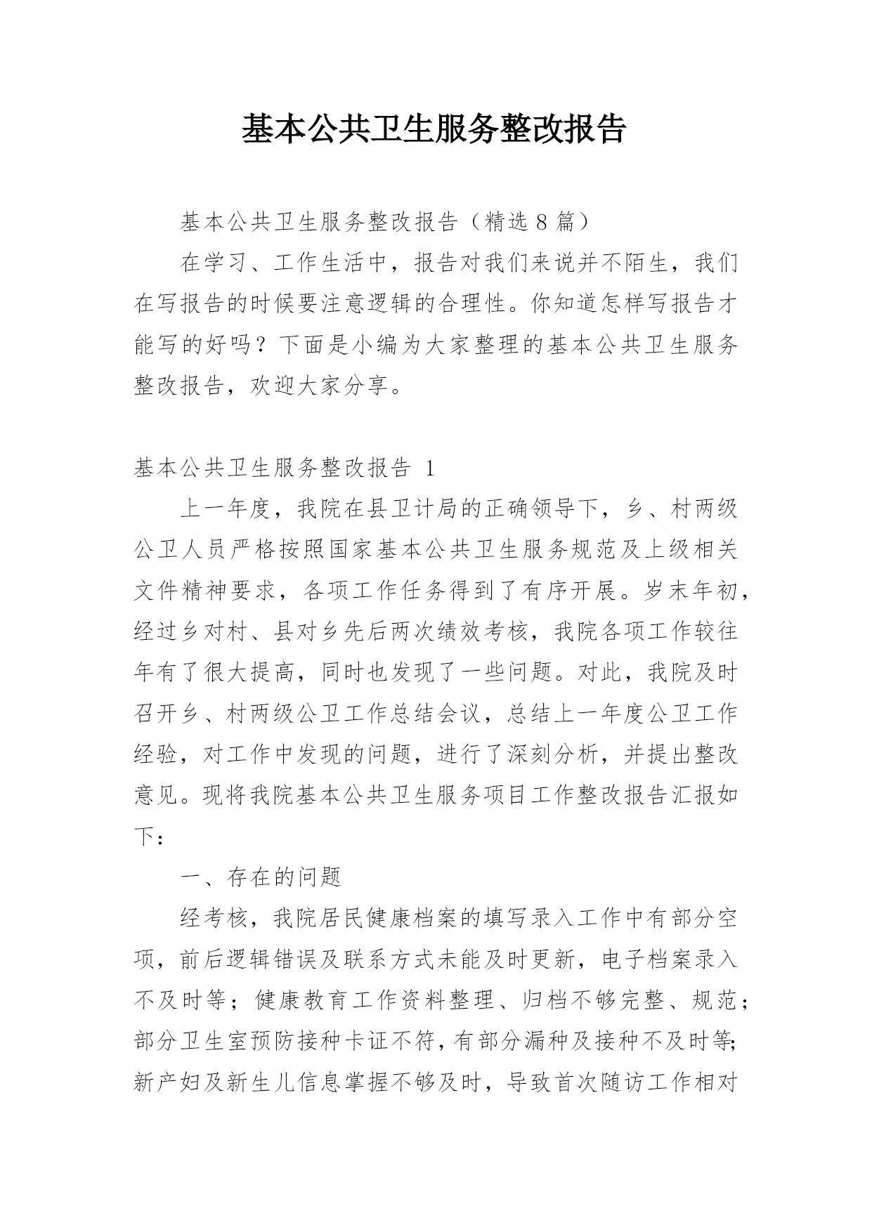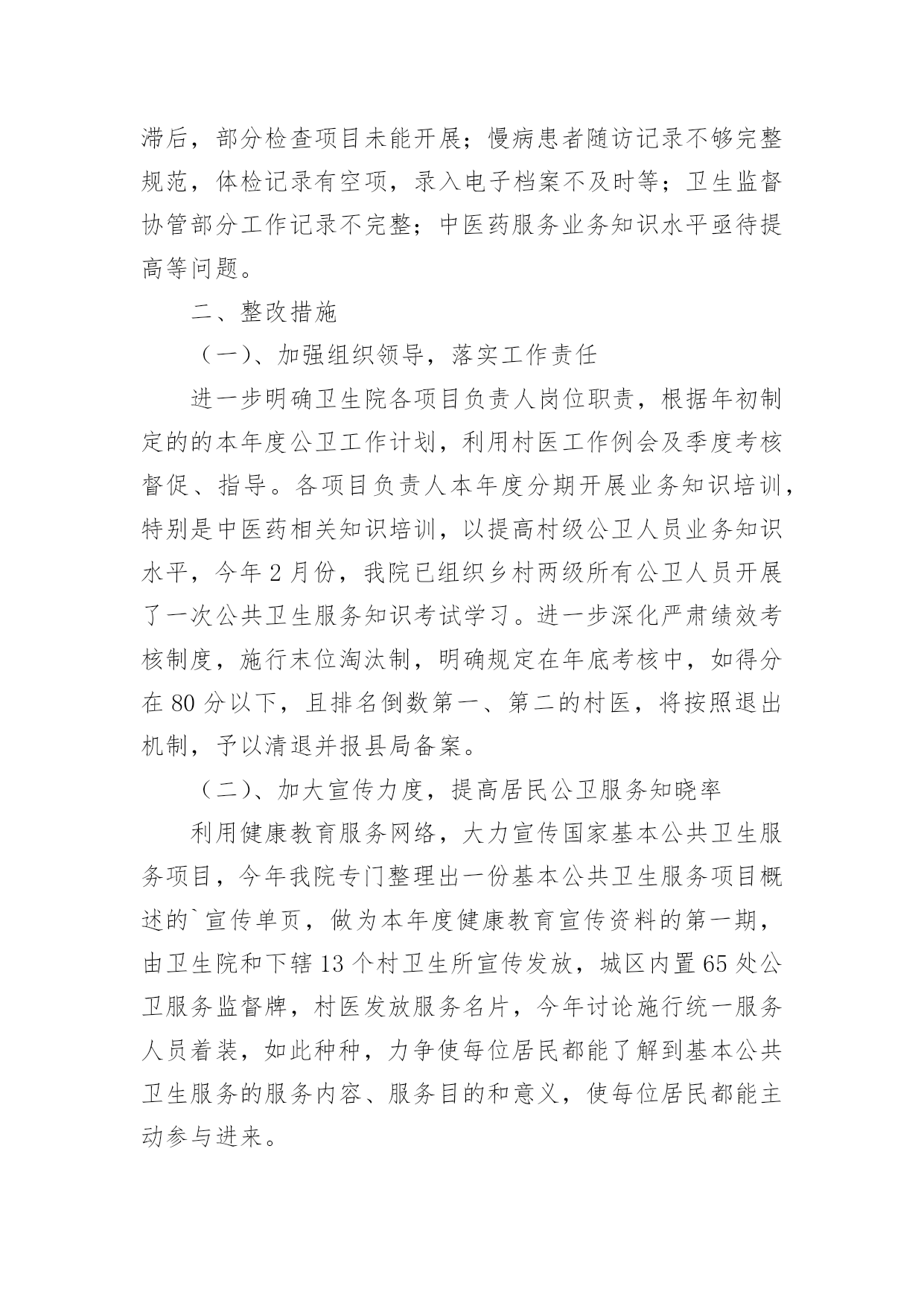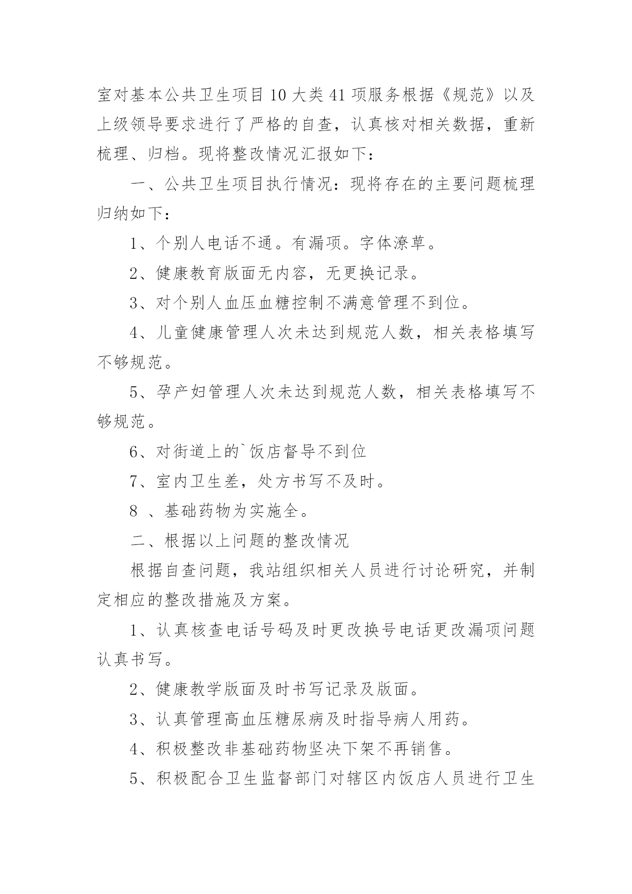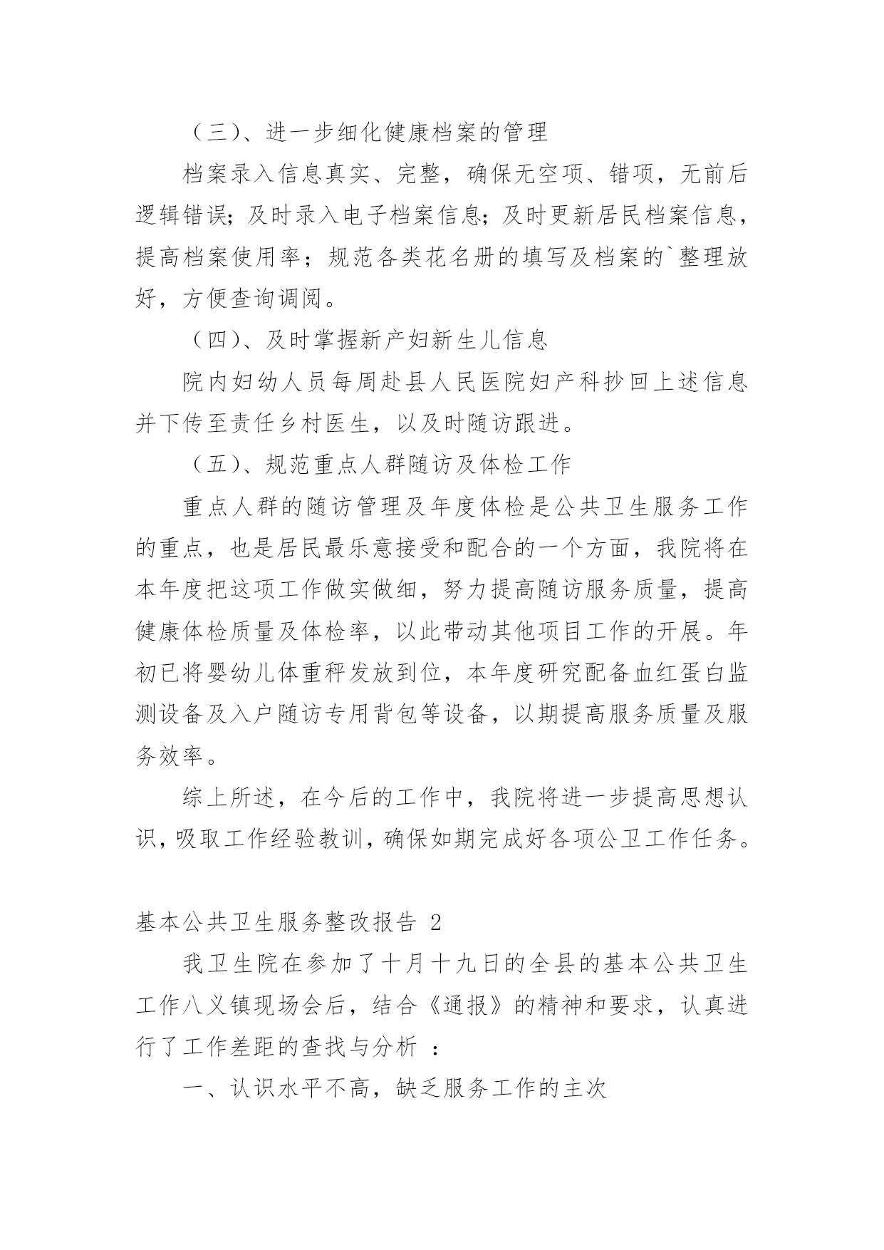 基本公共卫生服务整改报告基本公共卫生服务整改报告(精选8篇)在学习、工作生活中,报告对我们来说并不陌生,我们在写报告的时候要注意逻辑的合理性。你知道怎样写报告才能写的好吗?下面是小编为大家整理的基本公共卫生服务整改报告,欢迎大家分享。基本公共卫生服务整改报告1上一年度,我院在县卫计局的正确领导下,乡、村两级公卫人员严格按照国家基本公共卫生服务规范及上级相关文件精神要求,各项工作任务得到了有序开展。岁末年初,经过乡对村、县对乡先后两次绩效考核,我院各项工作较往年有了很大提高,同时也发现了一些问题。对此,我院及时召开乡、村两级公卫工作总结会议,总结上一年度公卫工作经验,对工作中发现的问题,进行了深刻分析,并提出整改意见。现将我院基本公共卫生服务项目工作整改报告汇报如下:一、存在的问题经考核,我院居民健康档案的填写录入工作中有部分空项,前后逻辑错误及联系方式未能及时更新,电子档案录入不及时等;健康教育工作资料整理、归档不够完整、规范;部分卫生室预防接种卡证不符,有部分漏种及接种不及时等;新产妇及新生儿信息掌握不够及时,导致首次随访工作相对滞后,部分检查项目未能开展;慢病患者随访记录不够完整规范,体检记录有空项,录入电子档案不及时等;卫生监督协管部分工作记录不完整;中医药服务业务知识水平亟待提高等问题。二、整改措施(一)、加强组织领导,落实工作责任进一步明确卫生院各项目负责人岗位职责,根据年初制定的的本年度公卫工作计划,利用村医工作例会及季度考核督促、指导。各项目负责人本年度分期开展业务知识培训,特别是中医药相关知识培训,以提高村级公卫人员业务知识水平,今年2月份,我院已组织乡村两级所有公卫人员开展了一次公共卫生服务知识考试学习。进一步深化严肃绩效考核制度,施行末位淘汰制,明确规定在年底考核中,如得分在80分以下,且排名倒数第一、第二的村医,将按照退出机制,予以清退并报县局备案。(二)、加大宣传力度,提高居民公卫服务知晓率利用健康教育服务网络,大力宣传国家基本公共卫生服务项目,今年我院专门整理出一份基本公共卫生服务项目概述的`宣传单页,做为本年度健康教育宣传资料的第一期,由卫生院和下辖13个村卫生所宣传发放,城区内置65处公卫服务监督牌,村医发放服务名片,今年讨论施行统一服务人员着装,如此种种,力争使每位居民都能了解到基本公共卫生服务的服务内容、服务目的和意义,使每位居民都能主动参与进来。(三)、进一步细化健康档案的管理档案录入信息真实、完整,确保无空项、错项,无前后逻辑错误;及时录入电子档案信息;及时更新居民档案信息,提高档案使用率;规范各类花名册的填写及档案的`整理放好,方便查询调阅。(四)、及时掌握新产妇新生儿信息院内妇幼人员每周赴县人民医院妇产科抄回上述信息并下传至责任乡村医生,以及时随访跟进。(五)、规范重点人群随访及体检工作重点人群的随访管理及年度体检是公共卫生服务工作的重点,也是居民最乐意接受和配合的一个方面,我院将在本年度把这项工作做实做细,努力提高随访服务质量,提高健康体检质量及体检率,以此带动其他项目工作的开展。年初已将婴幼儿体重秤发放到位,本年度研究配备血红蛋白监测设备及入户随访专用背包等设备,以期提高服务质量及服务效率。综上所述,在今后的工作中,我院将进一步提高思想认识,吸取工作经验教训,确保如期完成好各项公卫工作任务。基本公共卫生服务整改报告2我卫生院在参加了十月十九日的全县的基本公共卫生工作八义镇现场会后,结合《通报》的精神和要求,认真进行了工作差距的查找与分析:一、认识水平不高,缺乏服务工作的主次基本公共卫生服务工作关系广大人民群众的切身利益,提高对基本公共卫生服务工作的认识,端正服务态度,保证相关人员具备相应的资质和条件,是保证基本公共卫生服务工作质量的前提。二、没有充分调动工作人员的积极性基本公共卫生服务工作未落到实处,未做到“干与不干,干多干少,干好干坏”不一样。三、卫生院公共卫生服务人员及服务水平客观上的不足我卫生院从事基本公共卫生工作人员现有4人,其中1人为卫生院聘任,从事公共卫生服务工作都是兼职,加之公共卫生服务人员工作水平、认识水平的相对差异,造成工作沟通的不充分。四、卫生所的从业人员对卫生服务的主次不明确没有从医疗卫生服务的工作重心出发,认识基本公共卫生服务的重要性。没有从原先的`治疗服务向医疗服务的转变。我院下辖的卫生所的乡村医生的年龄普遍较大,50岁以上从事乡医服务的占50%,乡村医生的学习和电脑的使用不到位,出现工作不扎实。建档人数与分类统计表数据有不同,包括索引表、分类登记表信息不完善,体检表缺项、空项等等。基本公共卫生服务整改报告3根据上级要求,为进一步规范落实国家基本公共卫生服务项目,适应当前基本医疗需求,深化医疗体制的改革,我室对基本公共卫生项目10大类41项服务根据《规