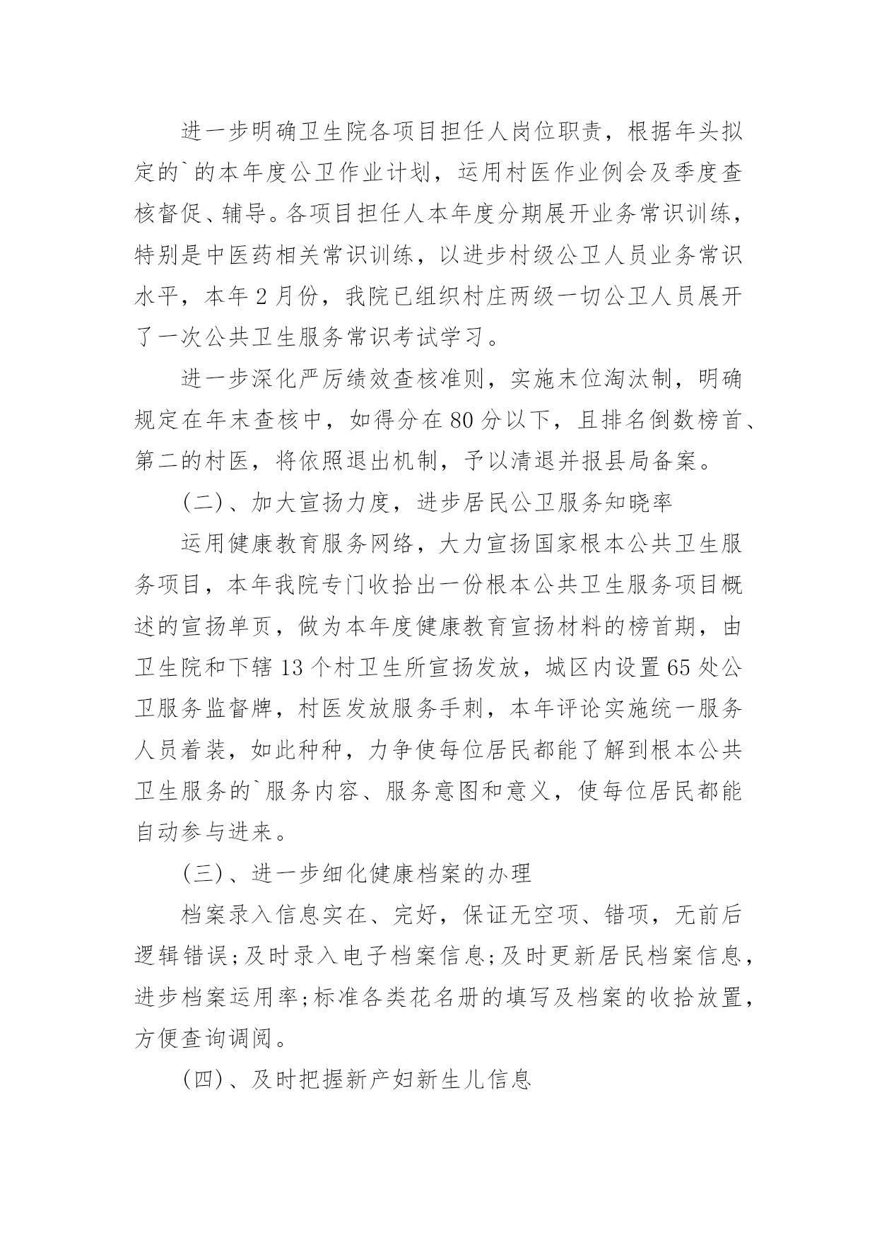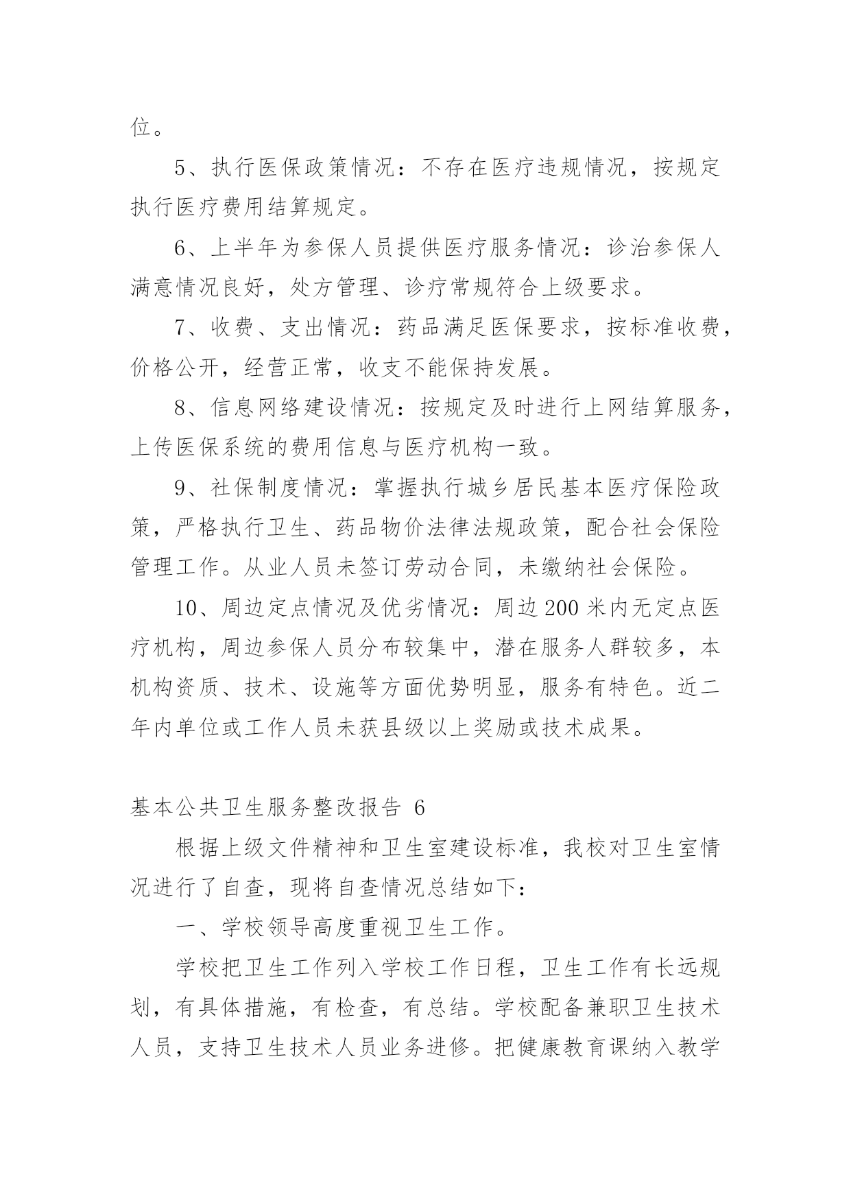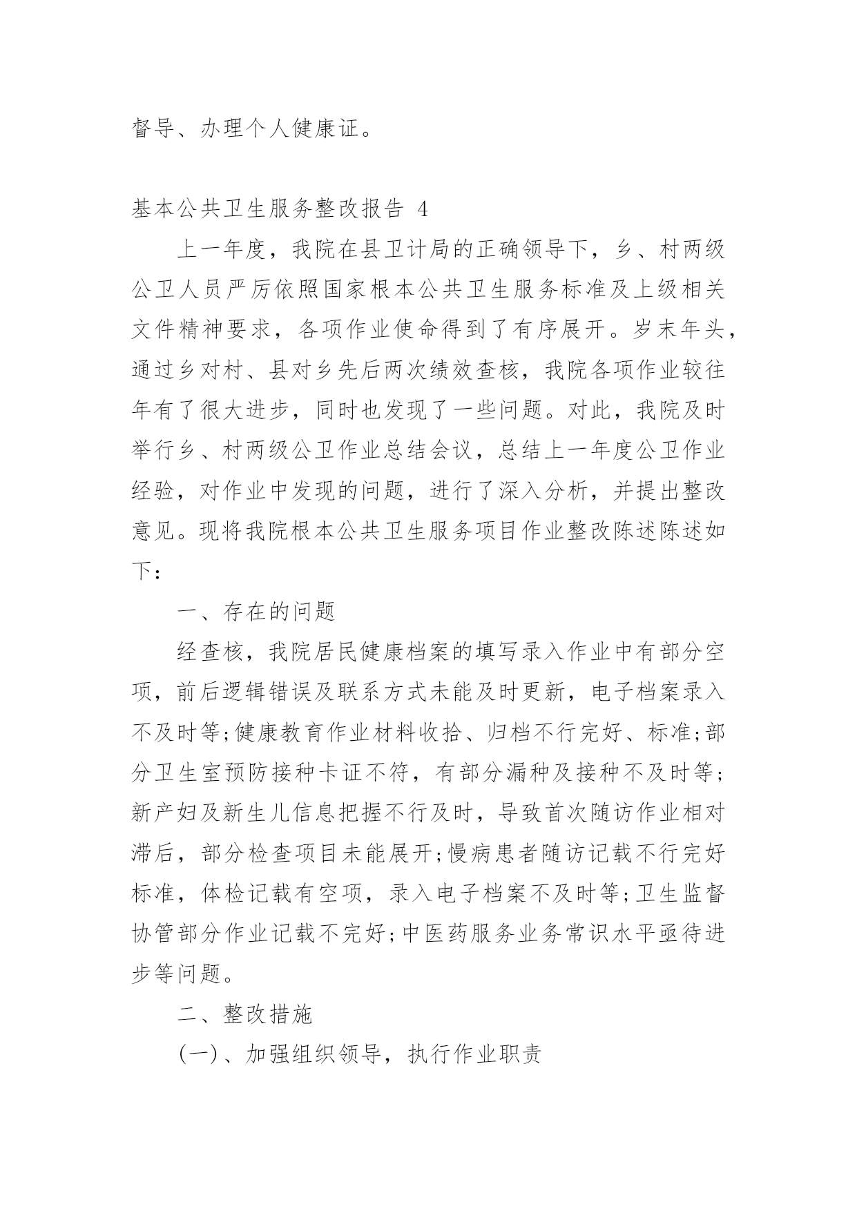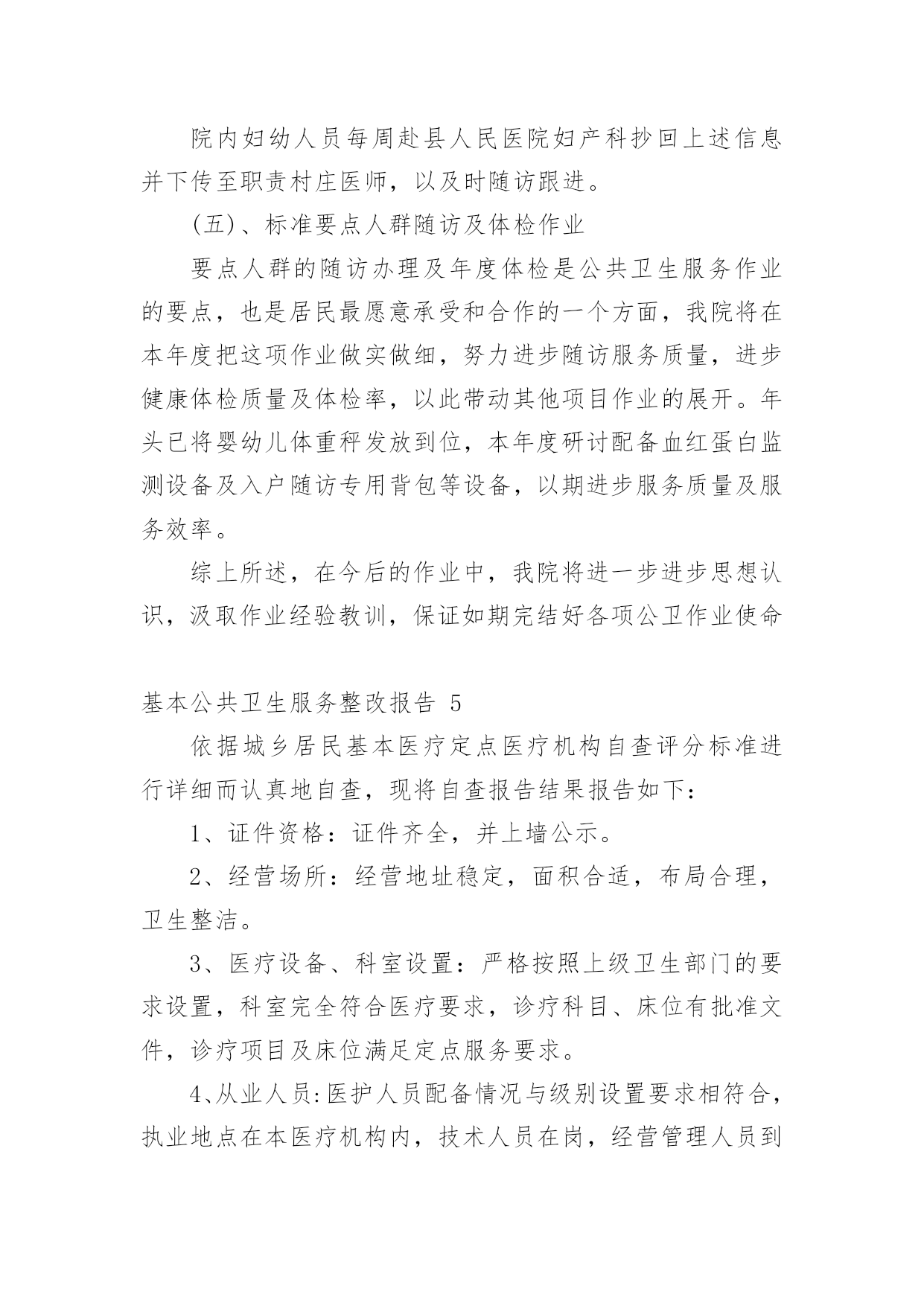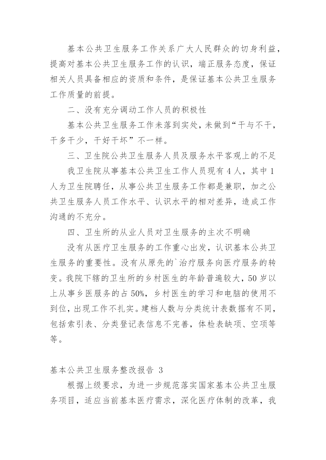 基本公共卫生服务整改报告基本公共卫生服务整改报告(精选8篇)在学习、工作生活中,报告对我们来说并不陌生,我们在写报告的时候要注意逻辑的合理性。你知道怎样写报告才能写的好吗?下面是小编为大家整理的基本公共卫生服务整改报告,欢迎大家分享。基本公共卫生服务整改报告1上一年度,我院在县卫计局的正确领导下,乡、村两级公卫人员严格按照国家基本公共卫生服务规范及上级相关文件精神要求,各项工作任务得到了有序开展。岁末年初,经过乡对村、县对乡先后两次绩效考核,我院各项工作较往年有了很大提高,同时也发现了一些问题。对此,我院及时召开乡、村两级公卫工作总结会议,总结上一年度公卫工作经验,对工作中发现的问题,进行了深刻分析,并提出整改意见。现将我院基本公共卫生服务项目工作整改报告汇报如下:一、存在的问题经考核,我院居民健康档案的填写录入工作中有部分空项,前后逻辑错误及联系方式未能及时更新,电子档案录入不及时等;健康教育工作资料整理、归档不够完整、规范;部分卫生室预防接种卡证不符,有部分漏种及接种不及时等;新产妇及新生儿信息掌握不够及时,导致首次随访工作相对滞后,部分检查项目未能开展;慢病患者随访记录不够完整规范,体检记录有空项,录入电子档案不及时等;卫生监督协管部分工作记录不完整;中医药服务业务知识水平亟待提高等问题。二、整改措施(一)、加强组织领导,落实工作责任进一步明确卫生院各项目负责人岗位职责,根据年初制定的的本年度公卫工作计划,利用村医工作例会及季度考核督促、指导。各项目负责人本年度分期开展业务知识培训,特别是中医药相关知识培训,以提高村级公卫人员业务知识水平,今年2月份,我院已组织乡村两级所有公卫人员开展了一次公共卫生服务知识考试学习。进一步深化严肃绩效考核制度,施行末位淘汰制,明确规定在年底考核中,如得分在80分以下,且排名倒数第一、第二的村医,将按照退出机制,予以清退并报县局备案。(二)、加大宣传力度,提高居民公卫服务知晓率利用健康教育服务网络,大力宣传国家基本公共卫生服务项目,今年我院专门整理出一份基本公共卫生服务项目概述的`宣传单页,做为本年度健康教育宣传资料的第一期,由卫生院和下辖13个村卫生所宣传发放,城区内置65处公卫服务监督牌,村医发放服务名片,今年讨论施行统一服务人员着装,如此种种,力争使每位居民都能了解到基本公共卫生服务的服务内容、服务目的和意义,使每位居民都能主动参与进来。(三)、进一步细化健康档案的管理档案录入信息真实、完整,确保无空项、错项,无前后逻辑错误;及时录入电子档案信息;及时更新居民档案信息,提高档案使用率;规范各类花名册的填写及档案的`整理放好,方便查询调阅。(四)、及时掌握新产妇新生儿信息院内妇幼人员每周赴县人民医院妇产科抄回上述信息并下传至责任乡村医生,以及时随访跟进。(五)、规范重点人群随访及体检工作重点人群的随访管理及年度体检是公共卫生服务工作的重点,也是居民最乐意接受和配合的一个方面,我院将在本年度把这项工作做实做细,努力提高随访服务质量,提高健康体检质量及体检率,以此带动其他项目工作的开展。年初已将婴幼儿体重秤发放到位,本年度研究配备血红蛋白监测设备及入户随访专用背包等设备,以期提高服务质量及服务效率。综上所述,在今后的工作中,我院将进一步提高思想认识,吸取工作经验教训,确保如期完成好各项公卫工作任务。基本公共卫生服务整改报告2我卫生院在参加了十月十九日的全县的基本公共卫生工作八义镇现场会后,结合《通报》的精神和要求,认真进行了工作差距的查找与分析:一、认识水平不高,缺乏服务工作的主次基本公共卫生服务工作关系广大人民群众的切身利益,提高对基本公共卫生服务工作的认识,端正服务态度,保证相关人员具备相应的资质和条件,是保证基本公共卫生服务工作质量的前提。二、没有充分调动工作人员的积极性基本公共卫生服务工作未落到实处,未做到“干与不干,干多干少,干好干坏”不一样。三、卫生院公共卫生服务人员及服务水平客观上的不足我卫生院从事基本公共卫生工作人员现有4人,其中1人为卫生院聘任,从事公共卫生服务工作都是兼职,加之公共卫生服务人员工作水平、认识水平的相对差异,造成工作沟通的不充分。四、卫生所的从业人员对卫生服务的主次不明确没有从医疗卫生服务的工作重心出发,认识基本公共卫生服务的重要性。没有从原先的`治疗服务向医疗服务的转变。我院下辖的卫生所的乡村医生的年龄普遍较大,50岁以上从事乡医服务的占50%,乡村医生的学习和电脑的使用不到位,出现工作不扎实。建档人数与分类统计表数据有不同,包括索引表、分类登记表信息不完善,体检表缺项、空项等等。基本公共卫生服务整改报告3根据上级要求,为进一步规范落实国家基本公共卫生服务项目,适应当前基本医疗需求,深化医疗体制的改革,我室对基本公共卫生项目10大类41项服务根据《规