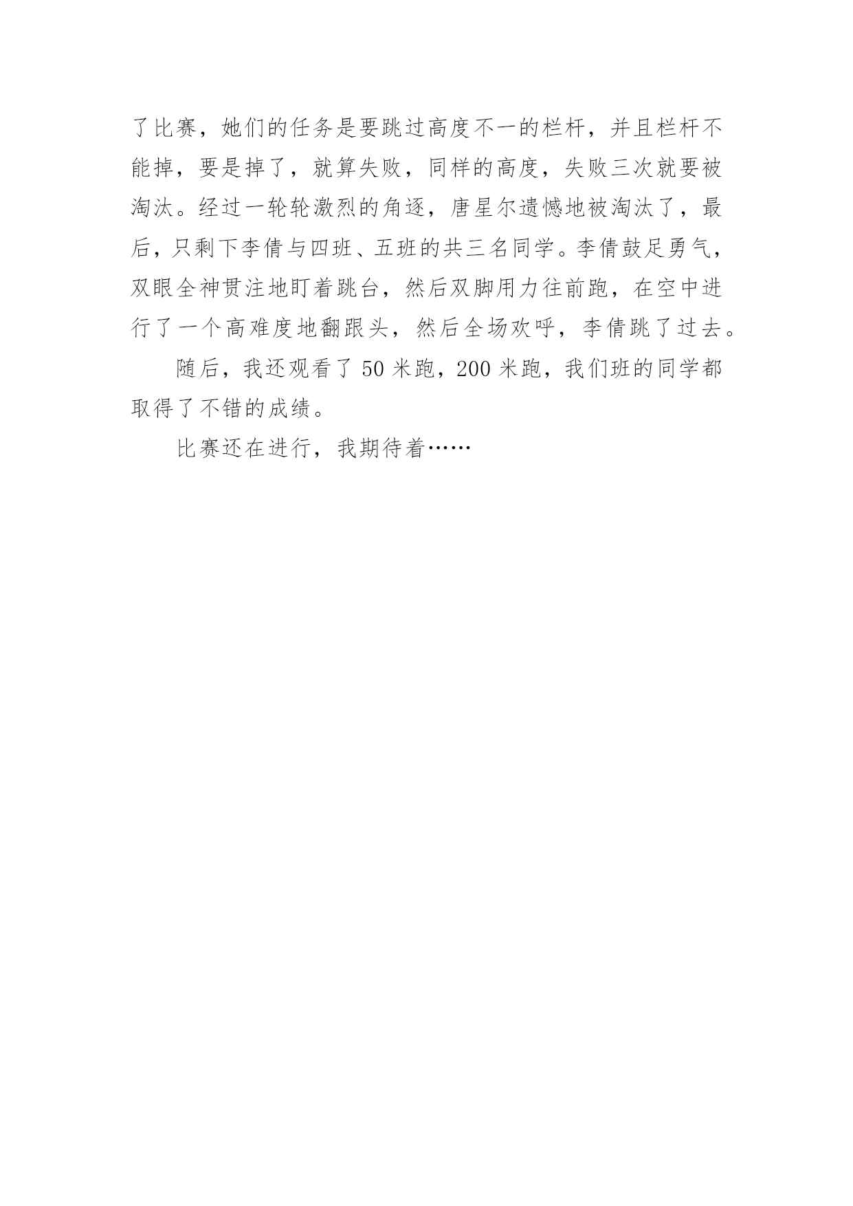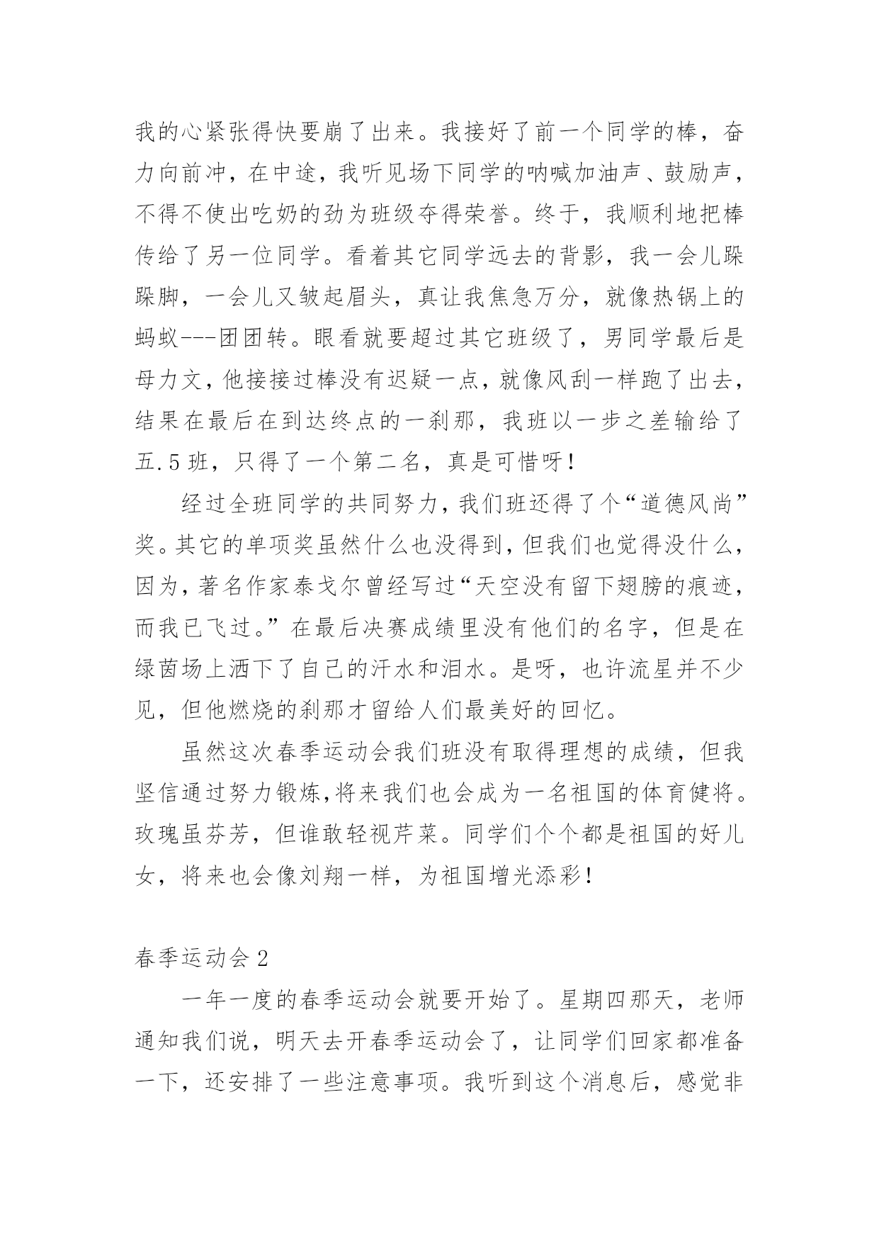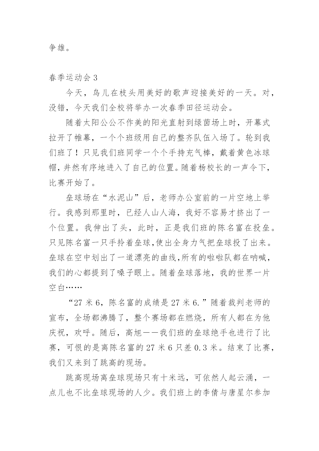 小学作文:春季运动会学校运动会在城市和乡村各级各类学校中普遍开展,并日益成为学校的传统活动和学校教育生活中一项重要内容。小编与读者分享关于春季运动会的作文,欢迎大家参考借鉴。春季运动会1四月二日,我们终于等来了盼望已久的春季运动会。一大早,我们迎着朝阳兴高采烈的来到了学校,青草姐姐伸出嫩绿的双手,似乎在祝愿我们夺得好成绩。今天的实验一小,花儿更加妖娆。一阵音乐过后,我们来到指定场地就坐。过了一会儿,钱校长满怀激情的宣布到:“现在,春季运动会正式开始……”话音刚落,我们就把自己手上的气球放飞了,有的是kitty猫,有的是米老鼠,还有的是飞机,有的是粉色的,有的是绿色的,还有的是蓝色的。真是颜色各异,千姿百态呀!自己的气球带着自己的理想越飞越高,直到看不见为止。我参加的项目是长绳、接力赛跑和三人四足跑,其中,我记忆最深的就是接力赛跑了。牟俊霖跑第一棒,只见她好像断了缰绳的俊马,冲了出去,跑在了第一名,可是,眼看就要交接棒的时时候,牟俊霖可能因为心理上太紧张了,便摔了一胶,唉,我为牟俊霖叹气,别班的同学已经追上我们班了。于是,邹沛霖迅速从地上抓起交接棒,向离弦的箭一样向前冲去。就要到我了,我的心紧张得快要崩了出来。我接好了前一个同学的棒,奋力向前冲,在中途,我听见场下同学的呐喊加油声、鼓励声,不得不使出吃奶的劲为班级夺得荣誉。终于,我顺利地把棒传给了另一位同学。看着其它同学远去的背影,我一会儿跺跺脚,一会儿又皱起眉头,真让我焦急万分,就像热锅上的蚂蚁---团团转。眼看就要超过其它班级了,男同学最后是母力文,他接接过棒没有迟疑一点,就像风刮一样跑了出去,结果在最后在到达终点的一刹那,我班以一步之差输给了五.5班,只得了一个第二名,真是可惜呀!经过全班同学的共同努力,我们班还得了个“道德风尚”奖。其它的单项奖虽然什么也没得到,但我们也觉得没什么,因为,著名作家泰戈尔曾经写过“天空没有留下翅膀的痕迹,而我已飞过。”在最后决赛成绩里没有他们的名字,但是在绿茵场上洒下了自己的汗水和泪水。是呀,也许流星并不少见,但他燃烧的刹那才留给人们最美好的回忆。虽然这次春季运动会我们班没有取得理想的成绩,但我坚信通过努力锻炼,将来我们也会成为一名祖国的体育健将。玫瑰虽芬芳,但谁敢轻视芹菜。同学们个个都是祖国的好儿女,将来也会像刘翔一样,为祖国增光添彩!春季运动会2一年一度的春季运动会就要开始了。星期四那天,老师通知我们说,明天去开春季运动会了,让同学们回家都准备一下,还安排了一些注意事项。我听到这个消息后,感觉非常高兴,甚至连那天晚上的觉也没有睡好,期盼着第二天的运动会。虽然我没有被选上做运动员的资格,但当拉拉队也不错啊!能为我们班的运动员呐喊助威,也非常高兴。当晚,妈妈帮我准备了一些必要的物品外,还多准备了一些食物,吃饱了好有力气给本班运动员助威。星期五一大早,我就来到了集合地点,看到同学们的脸上都洋溢着微笑,运动员更是精神抖擞。集合完毕,我们坐着大巴车,一路欢声笑语。看着窗外春天美丽的风景,心里在想,我要是也能当上运动员多好啊!去为班级争光。车在飞速前进,不知不觉就到了目的地。我和同学们排着队来到划分给我们的观众区域,耐心的.等待运动会的开幕。听到大喇叭里传出运动会开幕的声音时,运动场里都安静先来了,随着运动员进行曲的响起,一排排的运动员开始进场了,首先向我们走来的是一年级的同学们,紧接着是二、三、四、五、六年级的同学们,他们在老师的带领下,迈着整齐的步伐,向观众席上挥手致意,等到我们班的运动员走到我们的跟前时,我们都给他们呐喊致意。运动员都进场完毕后,比赛就开始了,运动员们都亮出了矫健的身体,个个英姿飒爽,龙腾虎跃,比赛异常激烈,有跑步的,有跳高的,有跳远的,都使出了看家的本领。广播员不停地解说着。比赛就这样继续激烈地进行着,看台上的啦啦队也不停地呼喊着加油。比赛结束了,我们班虽然得了整体季军,但我们还是很高兴,也不气馁,我们要继续努力,争取来年再在运动场上争雄。春季运动会3今天,鸟儿在枝头用美好的歌声迎接美好的一天。对,没错,今天我们全校将举办一次春季田径运动会。随着太阳公公不作美的阳光直射到绿茵场上时,开幕式拉开了帷幕,一个个班级用自己的整齐队伍入场了。轮到我们班了!只见我们班同学一个个手持充气棒,戴着黄色冰球帽,井然有序地进入了自己的位置。随着杨校长的一声令下,比赛开始了。垒球场在“水泥山”后,老师办公室前的一片空地上举行。我感到那里时,已经人山人海,我好不容易才挤出了一个位置。我伸出了头,此时,正是我们班的陈名富在投垒。只见陈名富一只手拎着垒球,使出全身力气把垒球投了出来。垒球在空中划出了一道漂亮的曲线,所有的啦啦队都在呐喊,我们的心都提到了嗓子眼上。随着垒球落地,我的世界一片空白……“27米6,陈名富的成绩是27米6.”随着裁判老师的宣