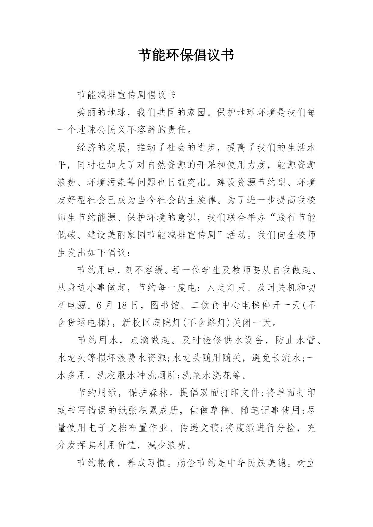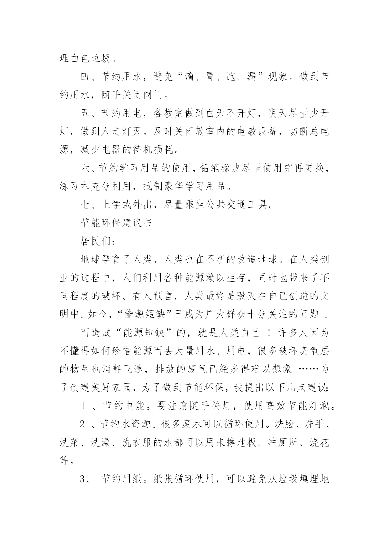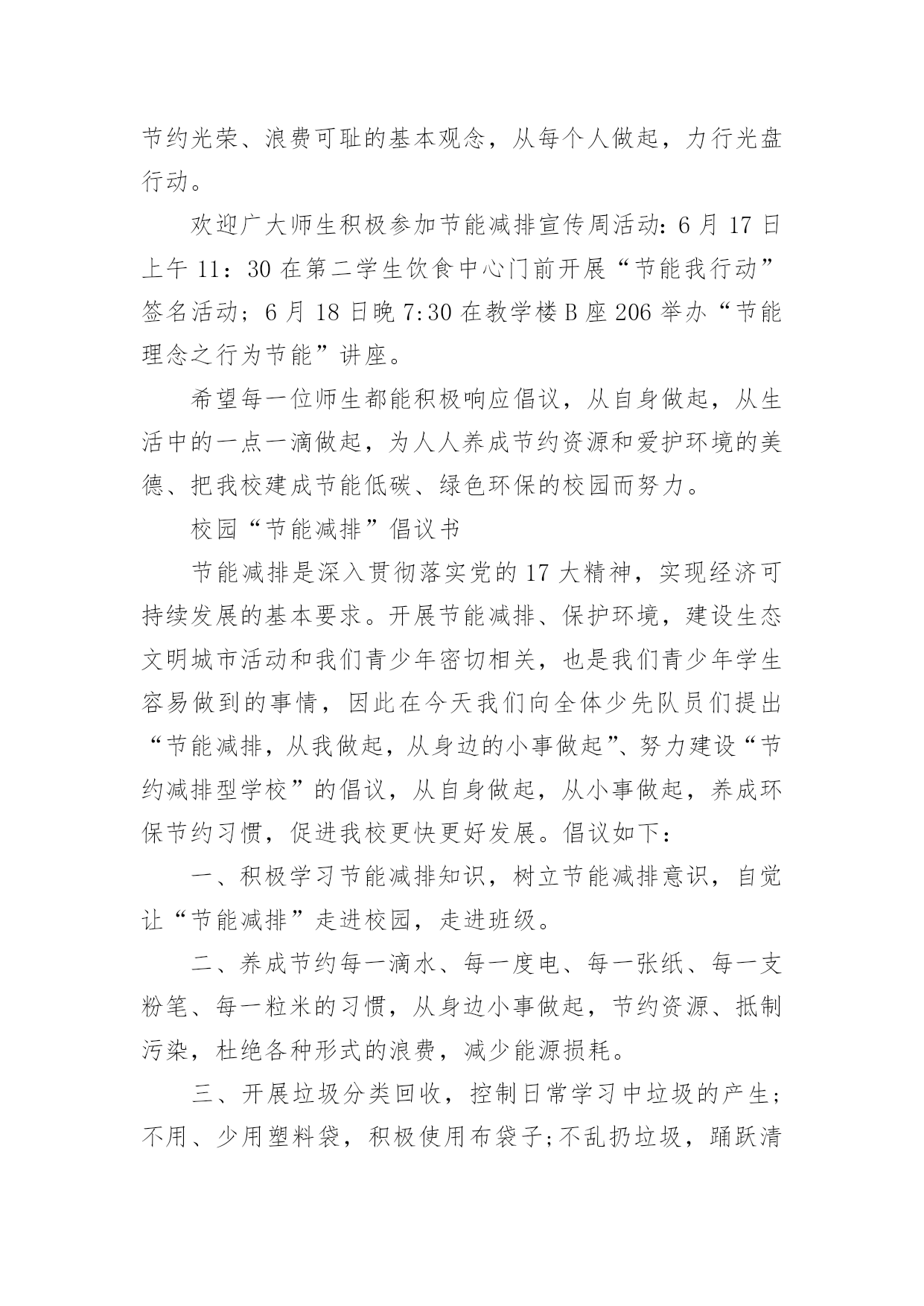 节能环保倡议书节能减排宣传周倡议书美丽的地球,我们共同的家园。保护地球环境是我们每一个地球公民义不容辞的责任。经济的发展,推动了社会的进步,提高了我们的生活水平,同时也加大了对自然资源的开采和使用力度,能源资源浪费、环境污染等问题也日益突出。建设资源节约型、环境友好型社会已成为当今社会的主旋律。为了进一步提高我校师生节约能源、保护环境的意识,我们联合举办“践行节能低碳、建设美丽家园节能减排宣传周”活动。我们向全校师生发出如下倡议:节约用电,刻不容缓。每一位学生及教师要从自我做起、从身边小事做起,节约每一度电:人走灯灭、及时关机和切断电源。6月18日,图书馆、二饮食中心电梯停开一天(不含货运电梯),新校区庭院灯(不含路灯)关闭一天。节约用水,点滴做起。及时检修供水设备,防止水管、水龙头等损坏浪费水资源;水龙头随用随关,避免长流水;一水多用,洗衣服水冲洗厕所;洗菜水浇花等。节约用纸,保护森林。提倡双面打印文件;将单面打印或书写错误的纸张积累成册,供做草稿、随笔记事使用;尽量使用电子文档布置作业、传递文稿;将废纸进行分捡,充分发挥其利用价值,减少浪费。节约粮食,养成习惯。勤俭节约是中华民族美德。树立节约光荣、浪费可耻的基本观念,从每个人做起,力行光盘行动。欢迎广大师生积极参加节能减排宣传周活动:6月17日上午11:30在第二学生饮食中心门前开展“节能我行动”签名活动;6月18日晚7:30在教学楼B座206举办“节能理念之行为节能”讲座。希望每一位师生都能积极响应倡议,从自身做起,从生活中的一点一滴做起,为人人养成节约资源和爱护环境的美德、把我校建成节能低碳、绿色环保的校园而努力。校园“节能减排”倡议书节能减排是深入贯彻落实党的17大精神,实现经济可持续发展的基本要求。开展节能减排、保护环境,建设生态文明城市活动和我们青少年密切相关,也是我们青少年学生容易做到的事情,因此在今天我们向全体少先队员们提出“节能减排,从我做起,从身边的小事做起”、努力建设“节约减排型学校”的倡议,从自身做起,从小事做起,养成环保节约习惯,促进我校更快更好发展。倡议如下:一、积极学习节能减排知识,树立节能减排意识,自觉让“节能减排”走进校园,走进班级。二、养成节约每一滴水、每一度电、每一张纸、每一支粉笔、每一粒米的习惯,从身边小事做起,节约资源、抵制污染,杜绝各种形式的浪费,减少能源损耗。三、开展垃圾分类回收,控制日常学习中垃圾的产生;不用、少用塑料袋,积极使用布袋子;不乱扔垃圾,踊跃清理白色垃圾。四、节约用水,避免“滴、冒、跑、漏”现象。做到节约用水,随手关闭阀门。五、节约用电,各教室做到白天不开灯,阴天尽量少开灯,做到人走灯灭。及时关闭教室内的电教设备,切断总电源,减少电器的待机损耗。六、节约学习用品的使用,铅笔橡皮尽量使用完再更换,练习本充分利用,抵制豪华学习用品。七、上学或外出,尽量乘坐公共交通工具。节能环保建议书居民们:地球孕育了人类,人类也在不断的改造地球。在人类创业的过程中,人们利用各种能源赖以生存,同时也带来了不同程度的破坏。有人预言,人类最终是毁灭在自己创造的文明中。如今,“能源短缺”已成为广大群众十分关注的问题.而造成“能源短缺”的,就是人类自己!许多人因为不懂得如何珍惜能源而去大量用水、用电,很多破坏臭氧层的物品也消耗飞速,排放的废气已经多得难以想象……为了创建美好家园,为了做到节能环保,我提出以下几点建议:1、节约电能。要注意随手关灯,使用高效节能灯泡。2、节约水资源。很多废水可以循环使用。洗脸、洗手、洗菜、洗澡、洗衣服的水都可以用来擦地板、冲厕所、浇花等。3、节约用纸。纸张循环使用,可以避免从垃圾填埋地释放出沼气,还能少砍伐树木。4、减少废气排放。出去尽量乘公车或出租车,也可以骑自车,要尽量少乘坐私家车。好了,就说这么多,让我们一起为了我们共同的家园而行动起来吧!