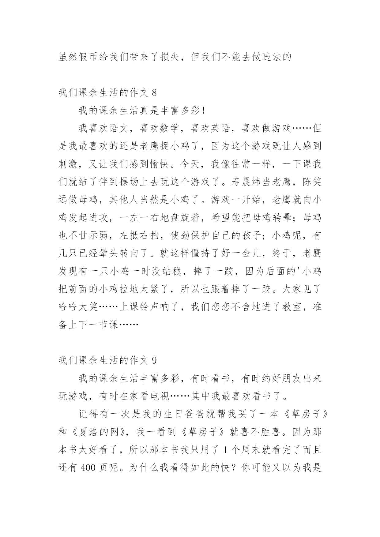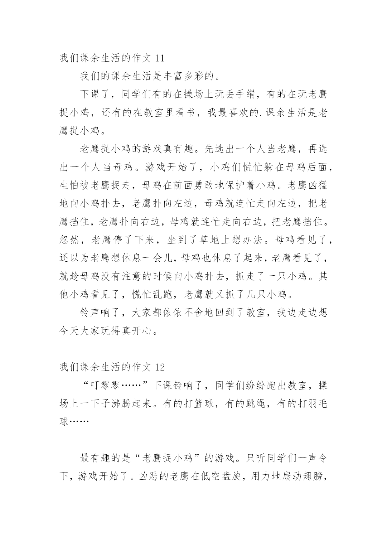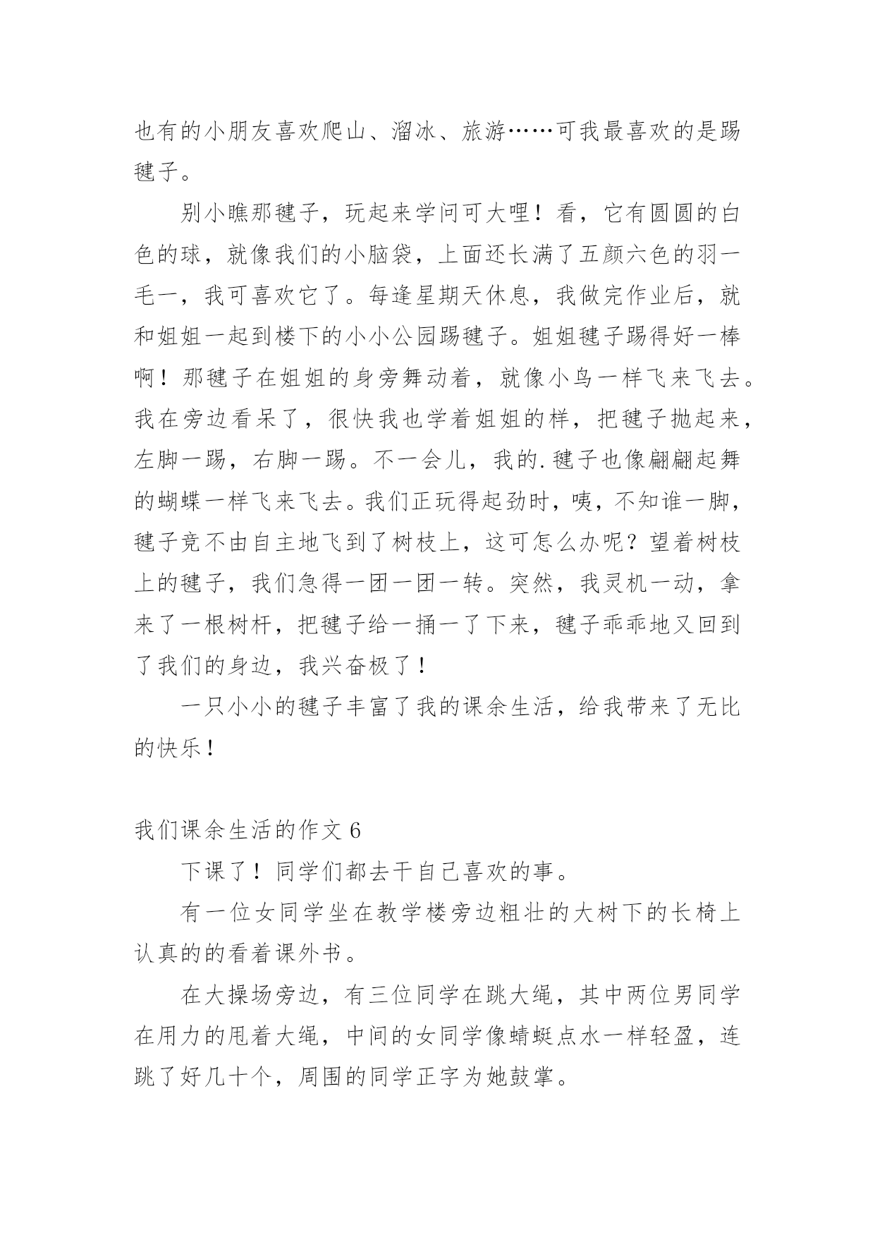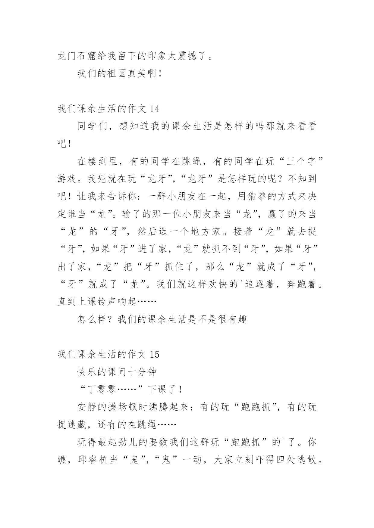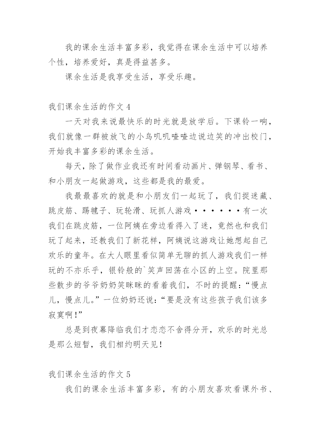 我们课余生活的作文我们课余生活的作文15篇(精)在日常学习、工作抑或是生活中,说到作文,大家肯定都不陌生吧,作文是人们把记忆中所存储的有关知识、经验和思想用书面形式表达出来的记叙方式。你所见过的作文是什么样的呢?以下是小编精心整理的我们课余生活的作文,欢迎大家分享。我们课余生活的作文1同学们的课外生活真是丰富多彩!周日,小刚和小明约好了一起打篮球,他们到了篮球馆,不相上下的比了起来,一会儿小刚领先,一会儿小明领先,他们真是技术高超啊!小飞热得实在不行了,他来到了游泳馆,瞧,他游的.多专业呀!一会儿仰泳,一会儿蛙泳,就像一条小鱼在水里自由自在的游来游去。小勇在楼下捡了一片枫叶,他用棉签蘸上胶水,涂在纸上,然后小心翼翼地把枫叶贴在上面,过几天后,标本就完成了。小红和小志在图书馆相遇了,他们俩个人选了同一本书,于是他们就一起合看起来,完全沉浸在书的海洋里。我们课余生活的作文2星期六的下午,我去看电影了。看的是下午一点钟的之魔剑公主。主人公是:小蓝、凌美琪、凌美雪和贝贝。主要是讲:凌到美琪、凌美雪和贝贝这三个魔法世界是爱奇那的'忠实粉丝,可是却把波卡波卡魔法王国公主凯美莉看成了爱奇那。但是美琪、美雪和贝贝并不知道她波卡波卡魔法王国公主凯美莉,也不知道她会魔法。只有小蓝发现了他会魔法。可小蓝没有告诉,凌美琪、凌美雪和贝贝她会魔法。可是后来,因为在菜市场见了一面,就知道了,她是波卡波卡魔法王国的公主凯美莉。最后,王国有危险时,所有人都到了王国里。公主打败了他的坏蛋叔叔。这是我看过最好看的电影。我们课余生活的作文3上网是我每天课余必做的功课。我在课余之间投身网络的虚幻的世界里,我又感到乐趣。在上网中,我可以获得更多的新知识,又结识更多的新朋友,与他们交流思想,交流信息,交流学习心得体会。我在网络中,不断地汲取丰富的营养,充实自己。我常去的是小学生网,小学生联盟网,中小学生。在那里,我结识许多老师和朋友,与他们交流学习心得体会。他们给了我许多帮助,使我提高了学习的成绩。至于健身也是我的课余生活中不必少的.一项。我每天都会抽出时间去参加自己爱好的体育活动。比如打球、跳舞、游泳……我都喜欢参加。我的课余生活丰富多彩,我觉得在课余生活中可以培养个性,培养爱好,真是得益甚多。课余生活是我享受生活,享受乐趣。我们课余生活的作文4一天对我来说最快乐的时光就是放学后。下课铃一响,我们就像一群被放飞的小鸟叽叽喳喳边说边笑的冲出校门,开始我丰富多彩的课余生活。每天,除了做作业我还有时间看动画片、弹钢琴、看书、和小朋友一起做游戏,这些都是我的最爱。我最最喜欢的就是和小朋友们一起玩了,我们捉迷藏、跳皮筋、踢毽子、玩轮滑、玩抓人游戏······有一次我们在跳皮筋,一位阿姨在旁边看得入了迷,竟然也和我们玩了起来,还教我们了新花样,阿姨说这游戏让她想起自己欢乐的童年。在大人眼里看似简单无聊的抓人游戏我们一样玩的不亦乐乎,银铃般的`笑声回荡在小区的上空。院里那些散步的爷爷奶奶笑眯眯的看着我们,不时的提醒:“慢点儿,慢点儿。”一位奶奶还说:“要是没有这些孩子我们该多寂寞啊!”总是到夜幕降临我们才恋恋不舍得分开,欢乐的时光总是那么短暂,我们相约明天见!我们课余生活的作文5我们的课余生活丰富多彩,有的小朋友喜欢看课外书、也有的小朋友喜欢爬山、溜冰、旅游……可我最喜欢的是踢毽子。别小瞧那毽子,玩起来学问可大哩!看,它有圆圆的白色的球,就像我们的小脑袋,上面还长满了五颜六色的羽一毛一,我可喜欢它了。每逢星期天休息,我做完作业后,就和姐姐一起到楼下的小小公园踢毽子。姐姐毽子踢得好一棒啊!那毽子在姐姐的身旁舞动着,就像小鸟一样飞来飞去。我在旁边看呆了,很快我也学着姐姐的样,把毽子抛起来,左脚一踢,右脚一踢。不一会儿,我的.毽子也像翩翩起舞的蝴蝶一样飞来飞去。我们正玩得起劲时,咦,不知谁一脚,毽子竞不由自主地飞到了树枝上,这可怎么办呢?望着树枝上的毽子,我们急得一团一团一转。突然,我灵机一动,拿来了一根树杆,把毽子给一捅一了下来,毽子乖乖地又回到了我们的身边,我兴奋极了!一只小小的毽子丰富了我的课余生活,给我带来了无比的快乐!我们课余生活的作文6下课了!同学们都去干自己喜欢的事。有一位女同学坐在教学楼旁边粗壮的大树下的长椅上认真的的看着课外书。在大操场旁边,有三位同学在跳大绳,其中两位男同学在用力的甩着大绳,中间的女同学像蜻蜓点水一样轻盈,连跳了好几十个,周围的同学正字为她鼓掌。在像绿伞一样的大树下,有三个同学再踢毽子,五颜六色的毽子像一只只小鸟在同学们的脚上飞来飞去。在大操场旁边有两个小同学在长椅上聊天,他们在上课老师提出的问题呢。看!他们聊得多认真呀!在绿油油的小树林里有两个勤学好问的.好学生拿着花和书,他们是兴趣小组的学生,找老师问一个植物学的问题,他们边走边不停的讨论着什么问
